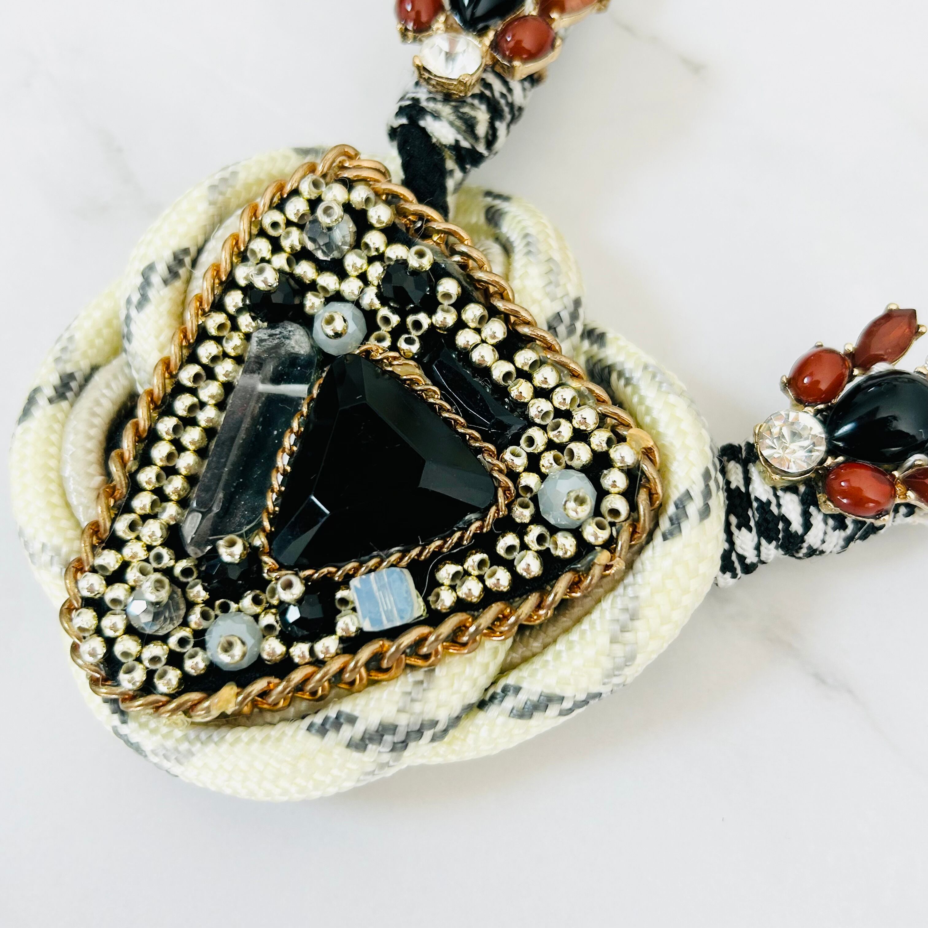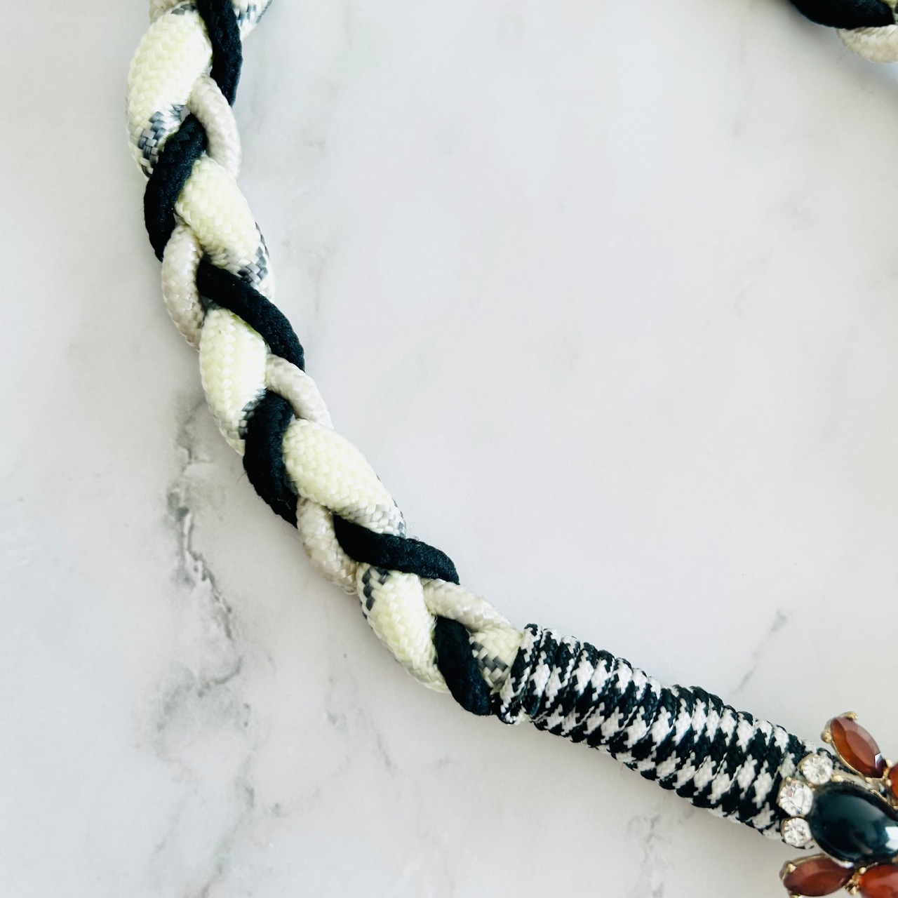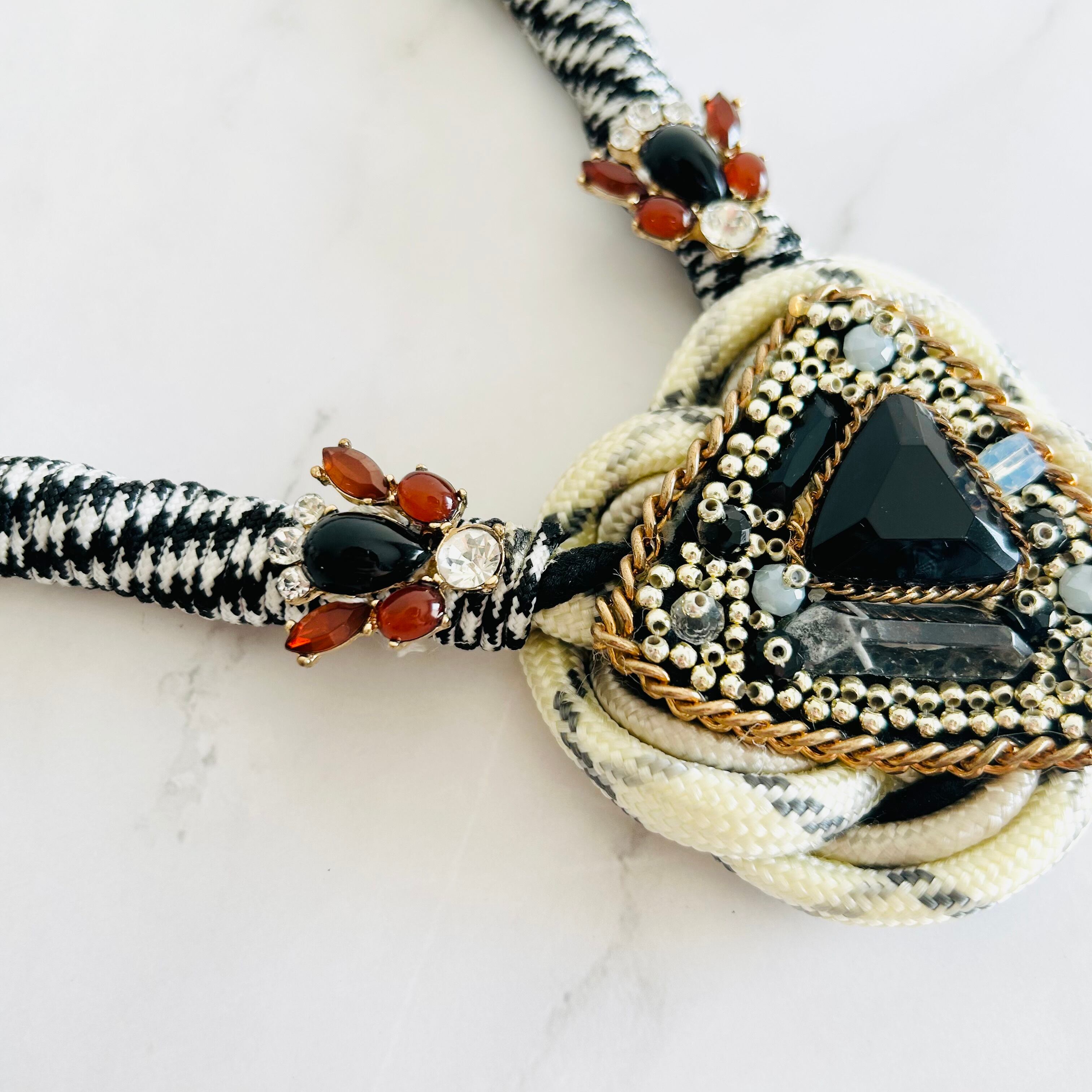モノトーンカラーのコードを編みこみ、ユニークなモチーフをプラスした目を惹くデザインです。
