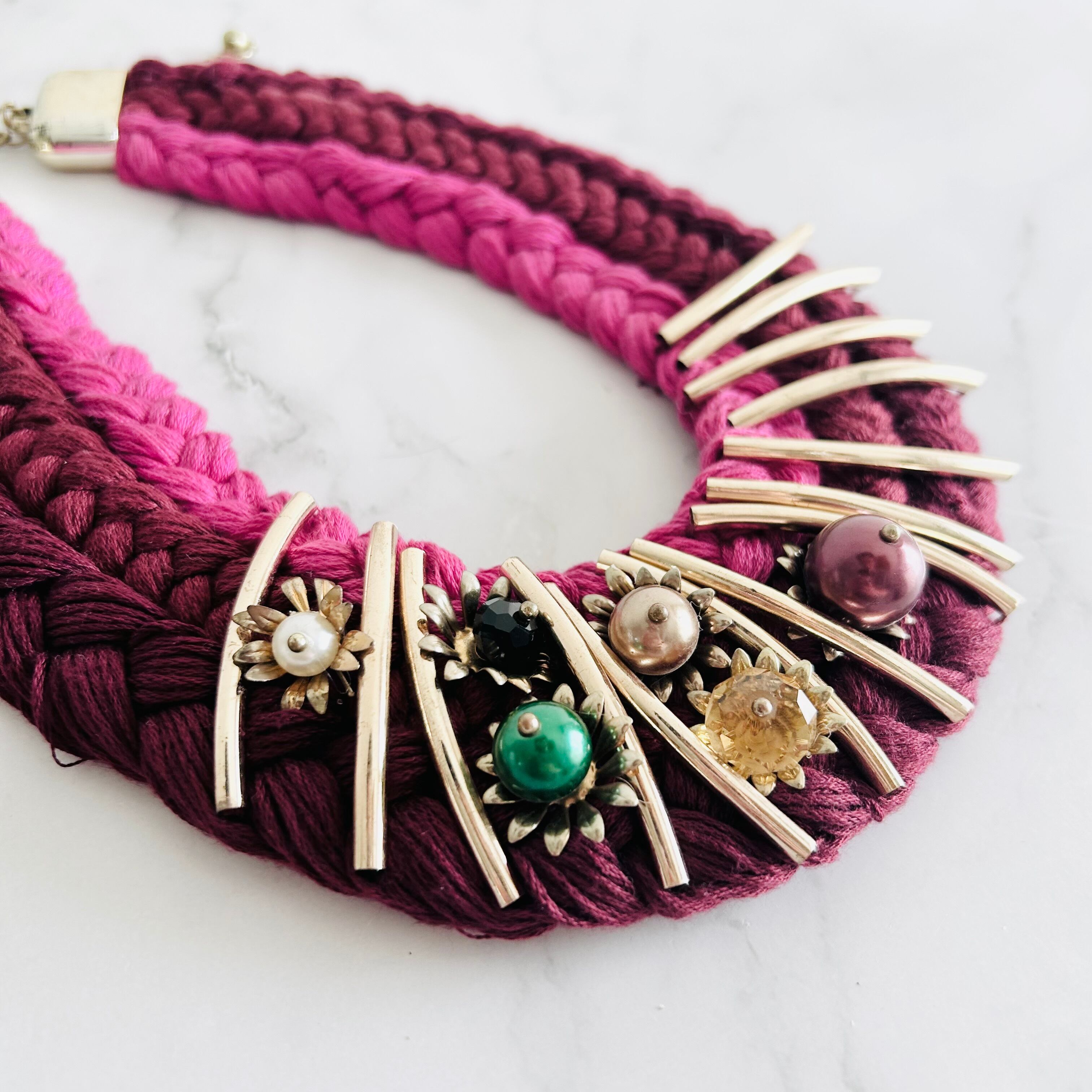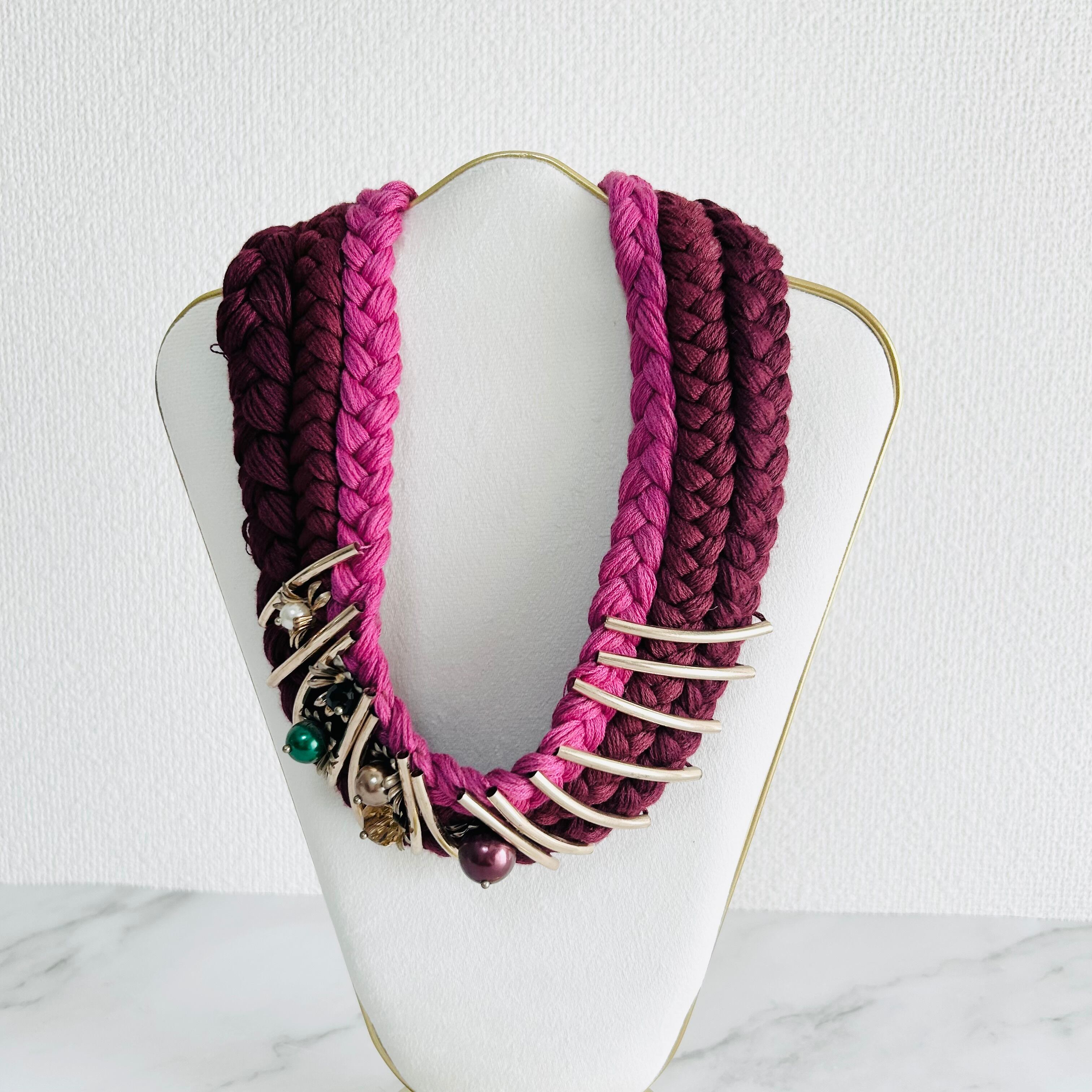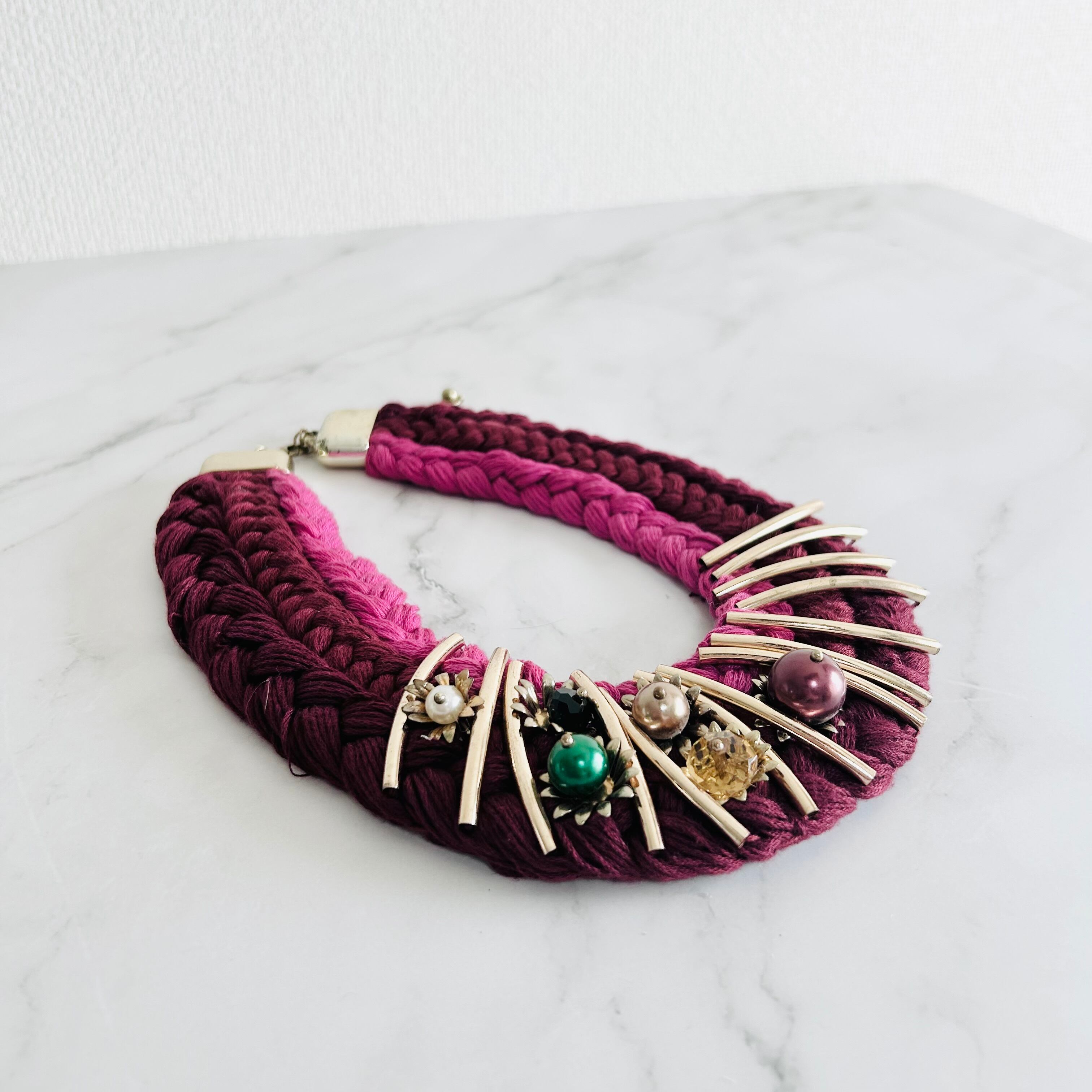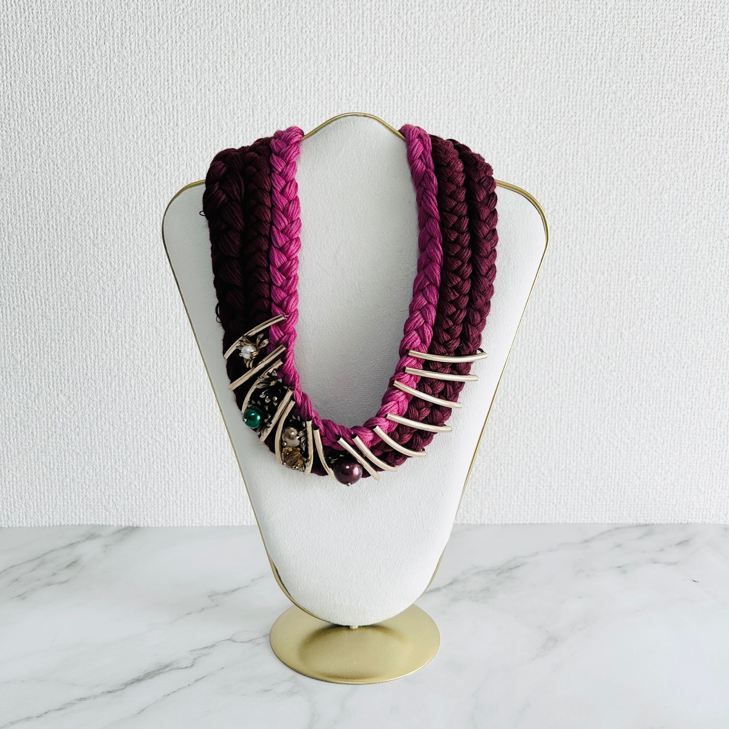 ワインレッド、ピンク+マルチカラー✖️アンティークゴールドカラーのネックレスです。