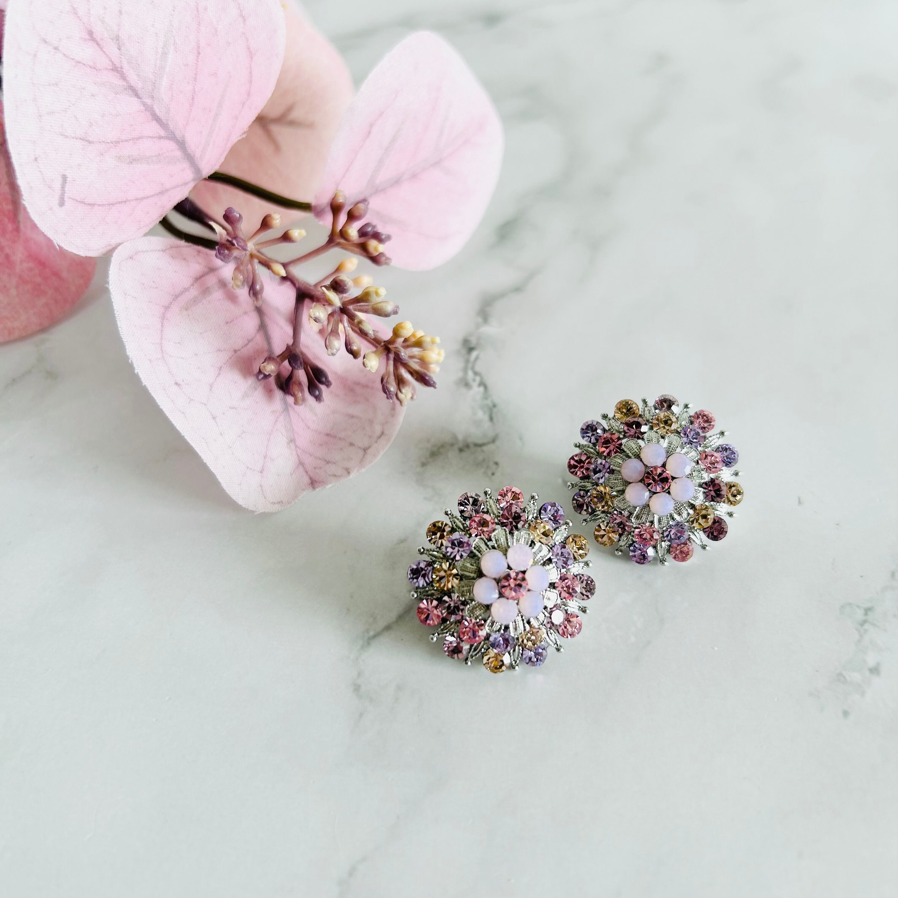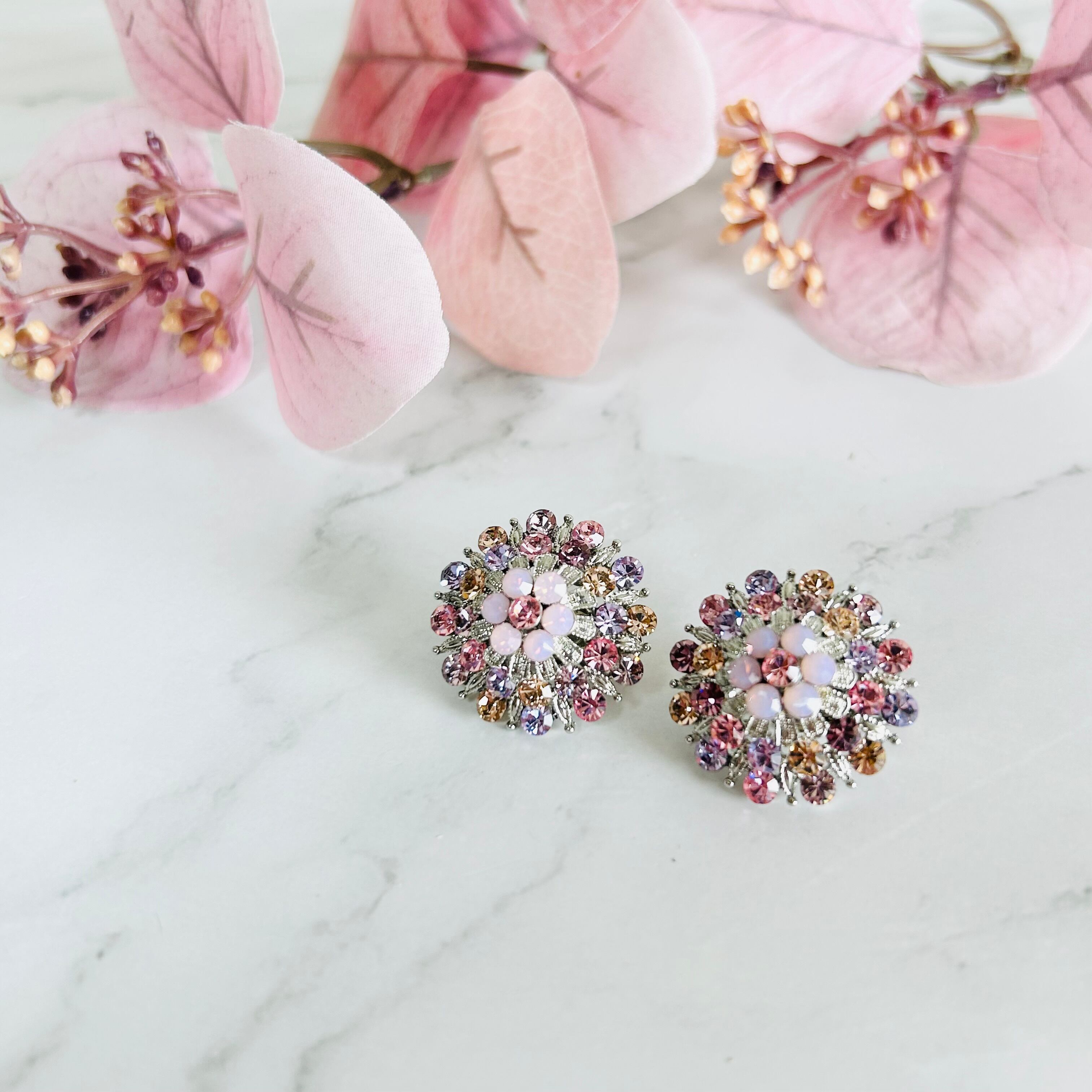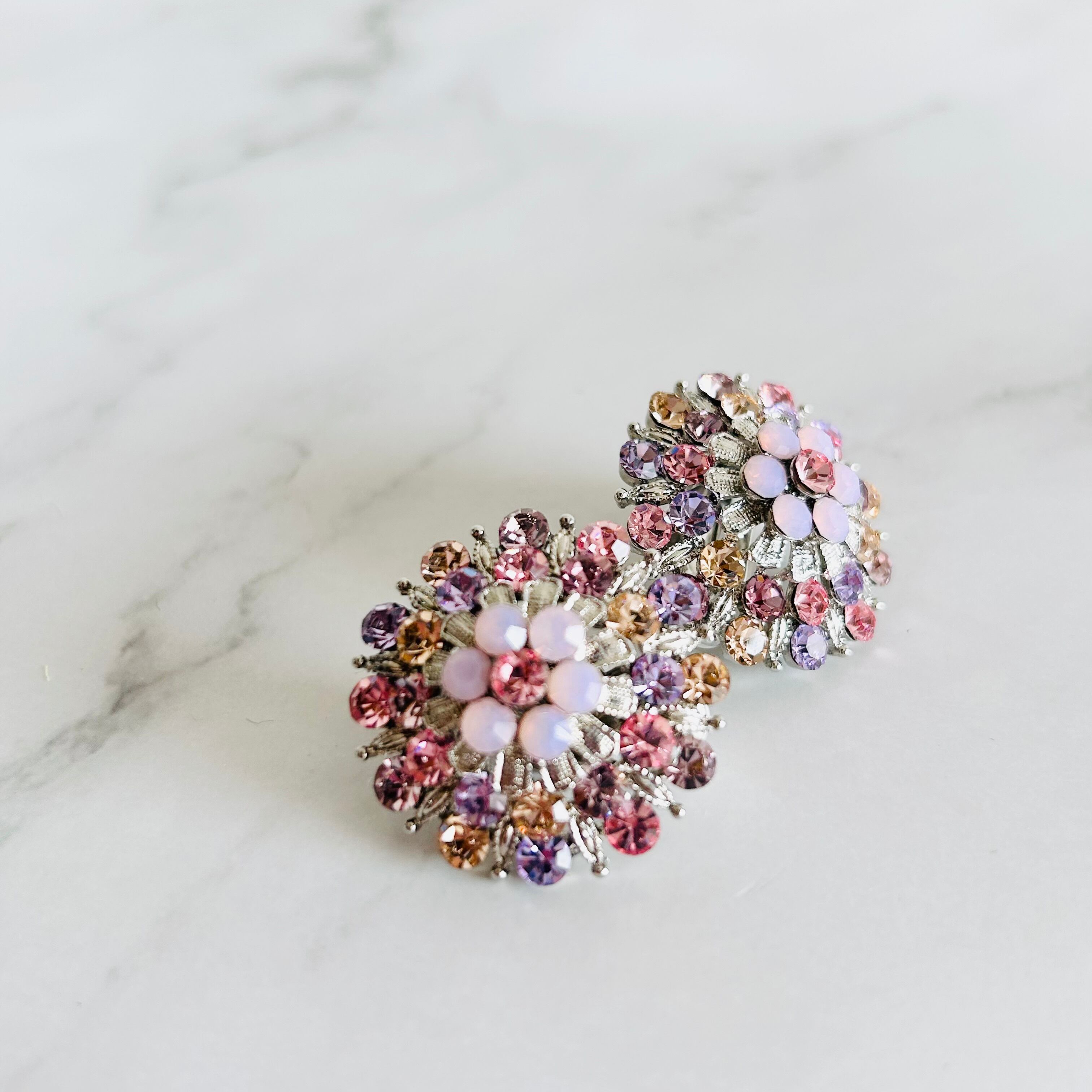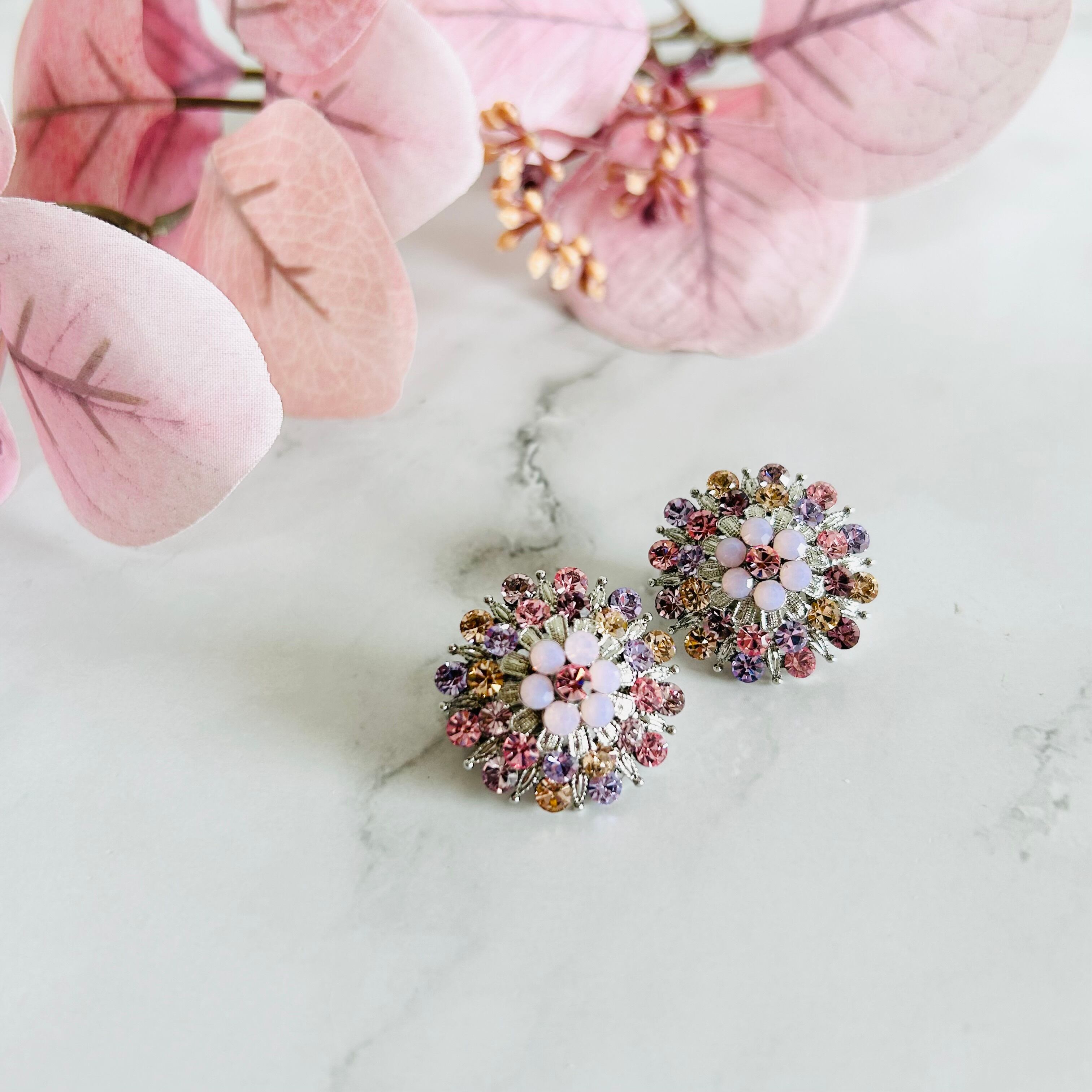 ピンク、サーモンピンク、ラズベリー系などさまざまなピンク系カラーのラインストーンをシルバーパーツと組み合わせ、繊細なフラワーモチーフに仕上げました✨