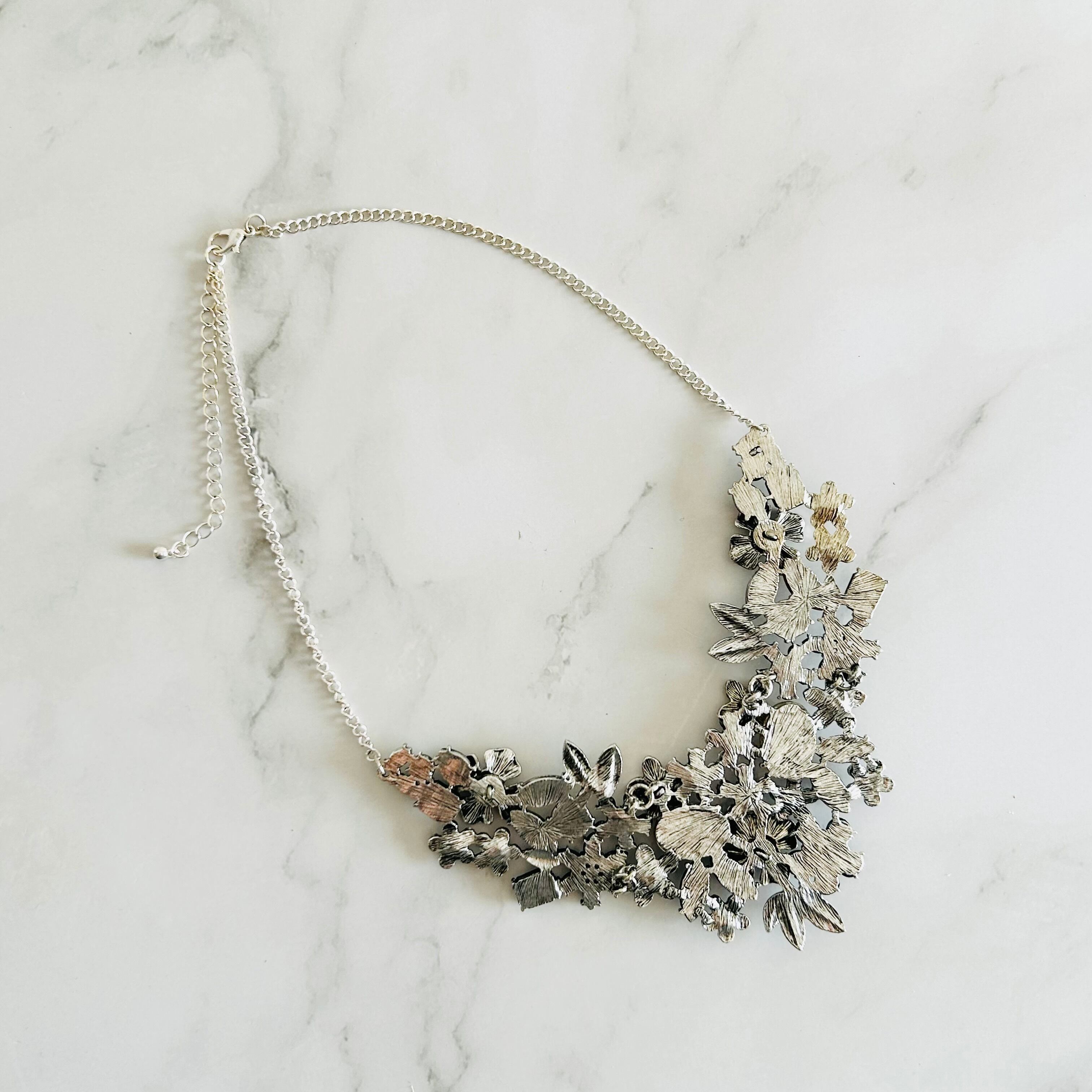 立体的なシルバーのフラワーモチーフにラインストーンやカラーパーツをあしらい華やかなデザインに仕上げました✨