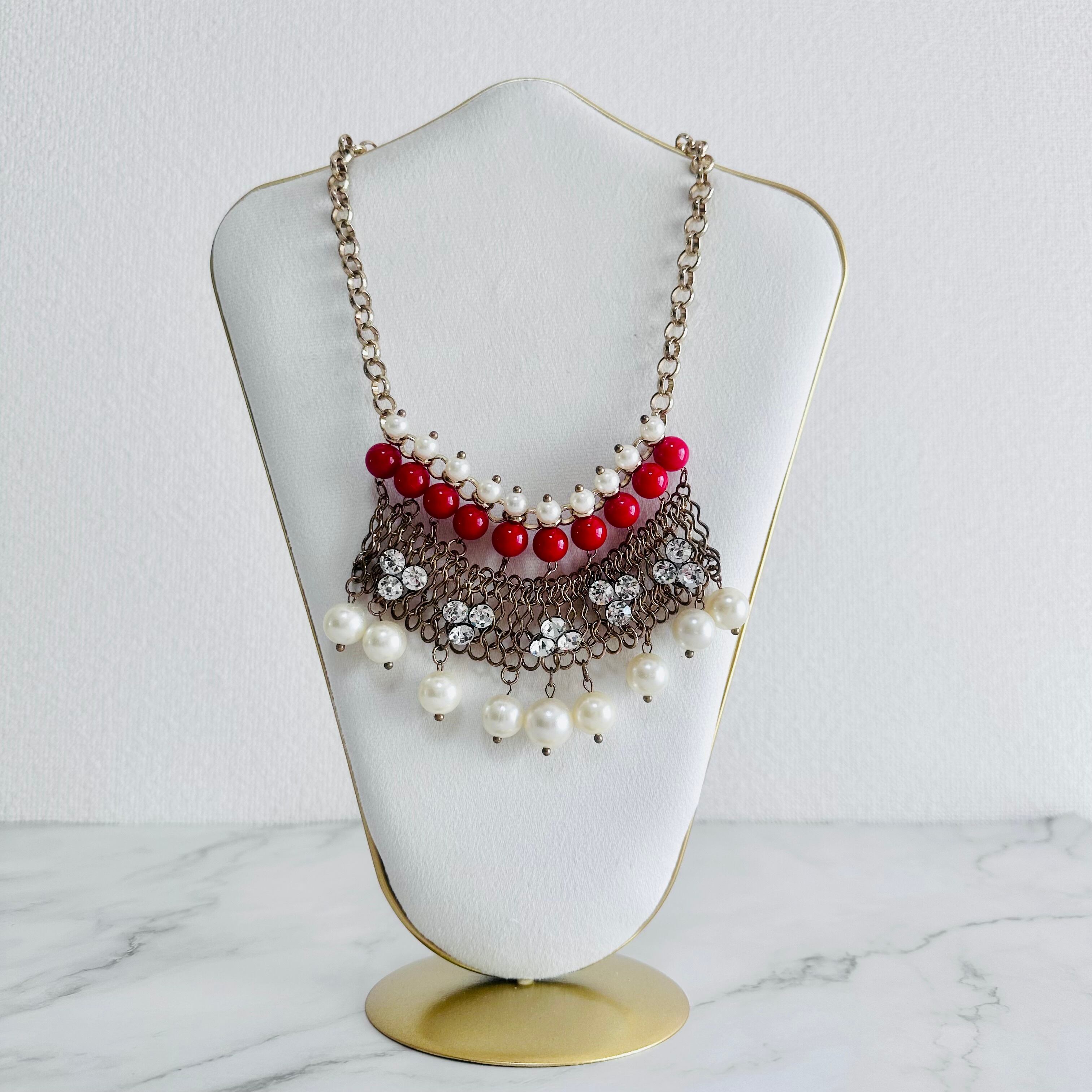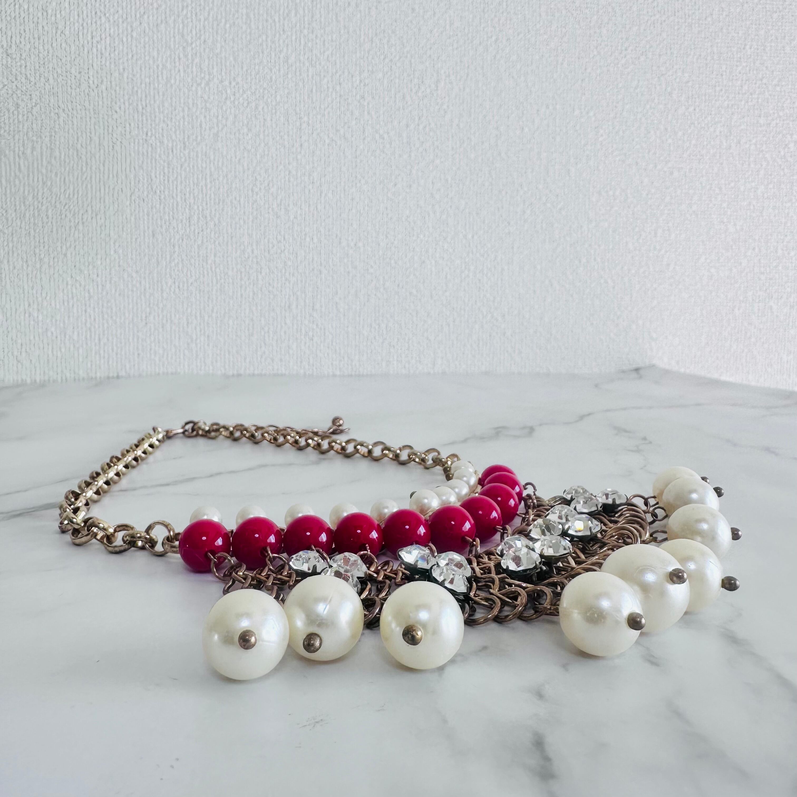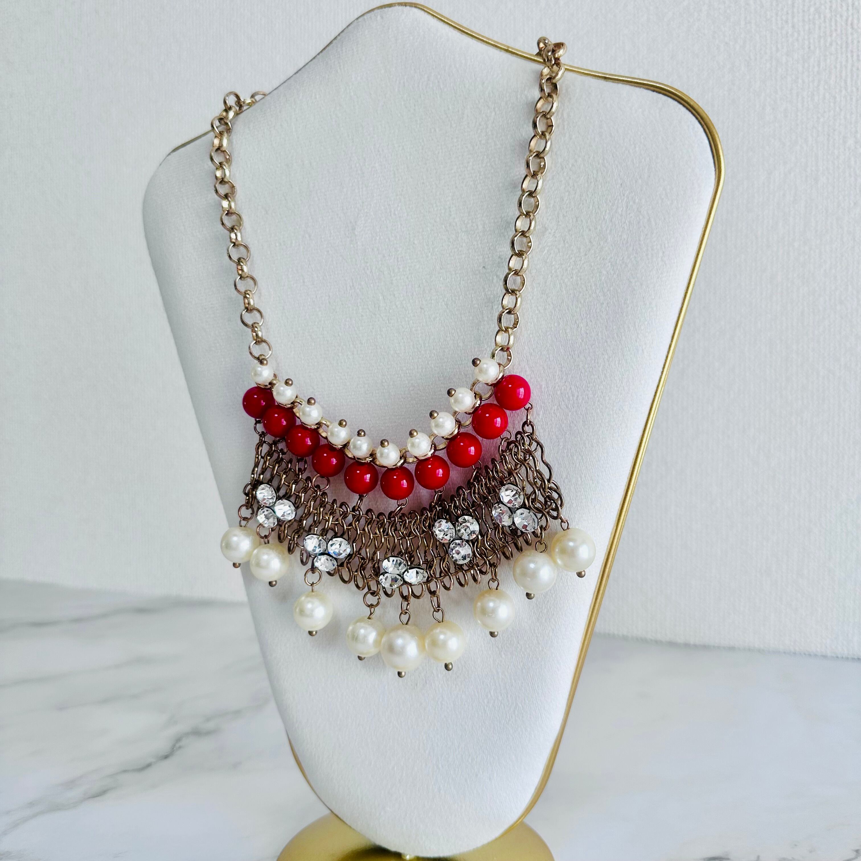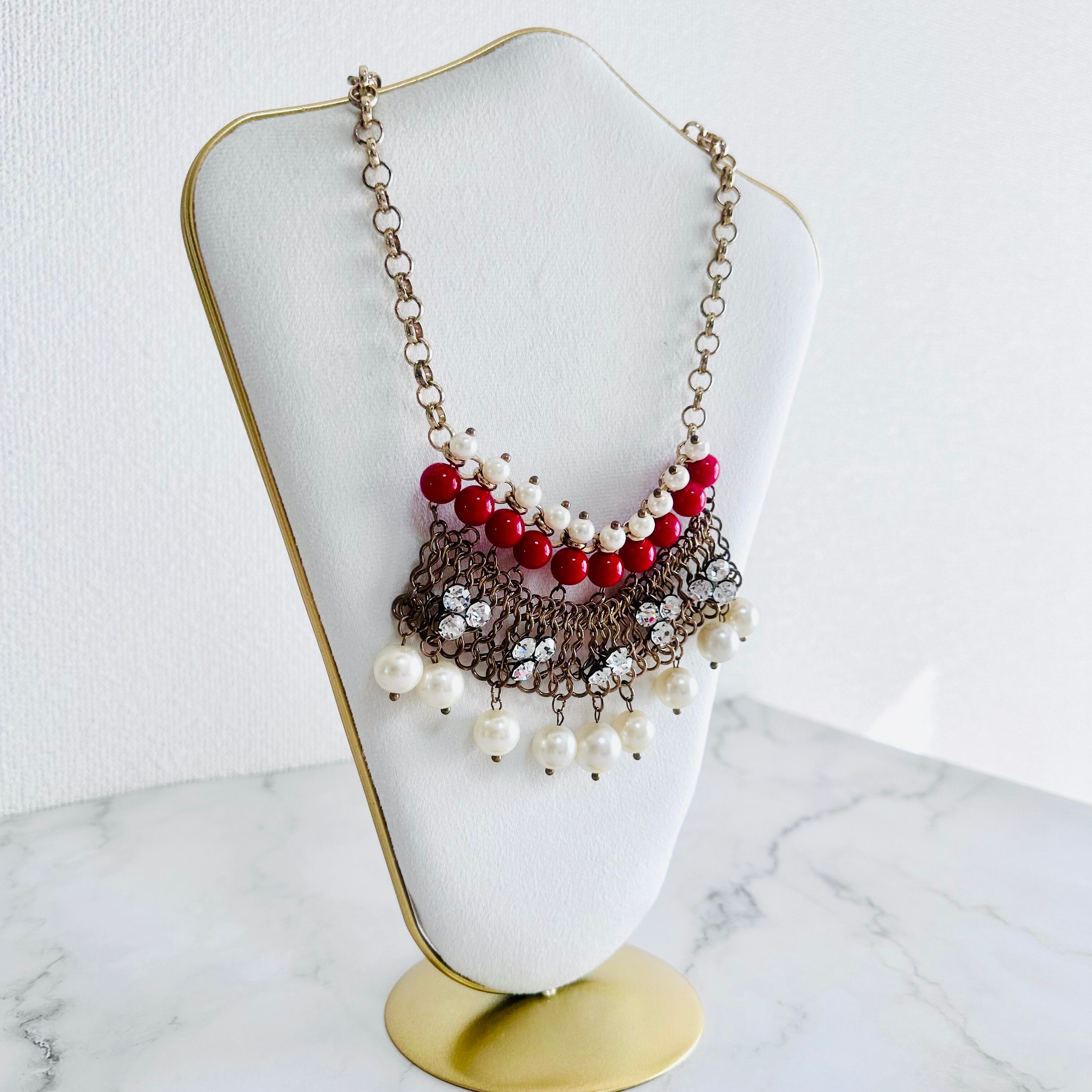 レッド、パール、クリスタル✖️アンティークゴールドカラーのネックレスです。