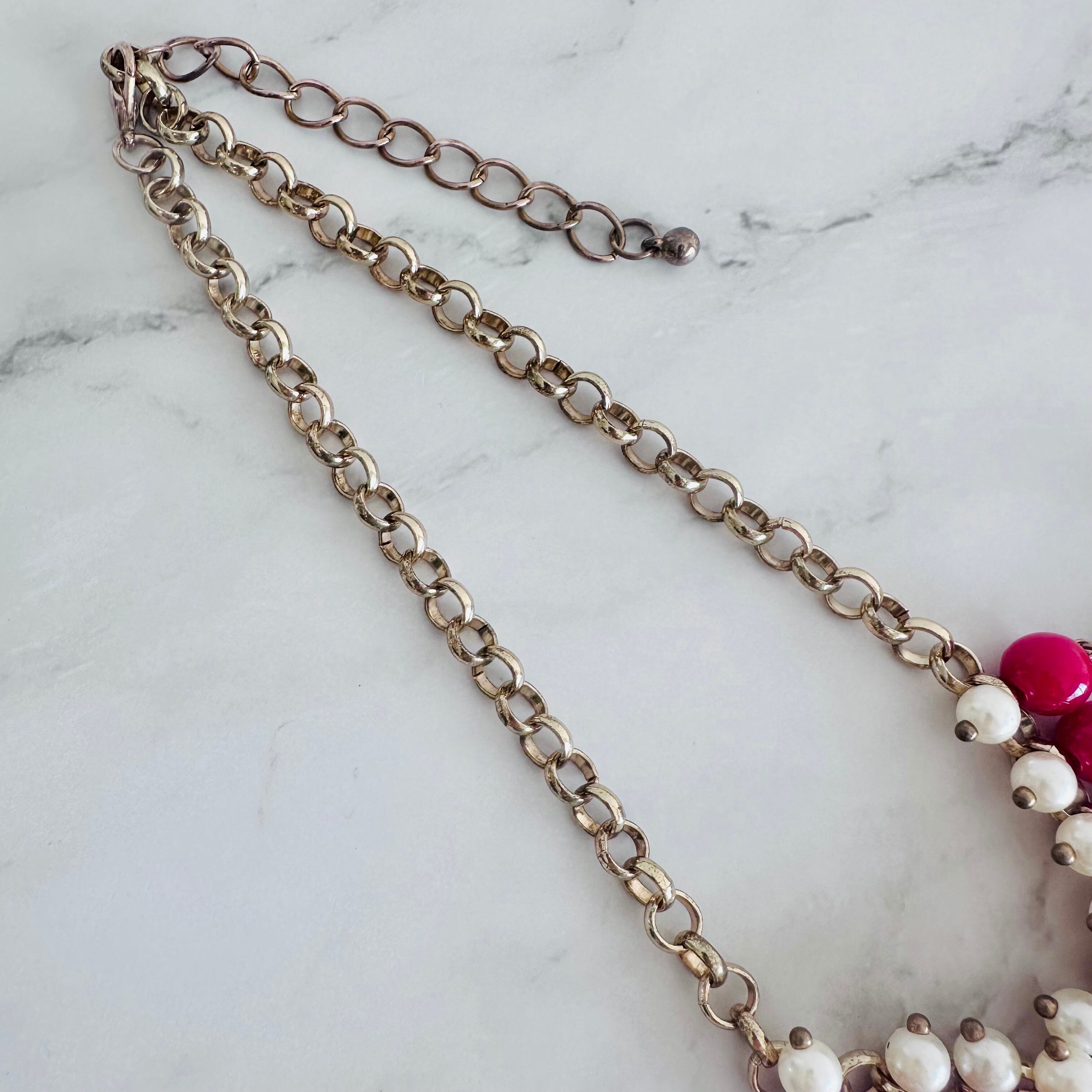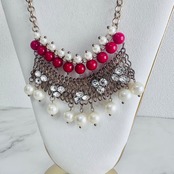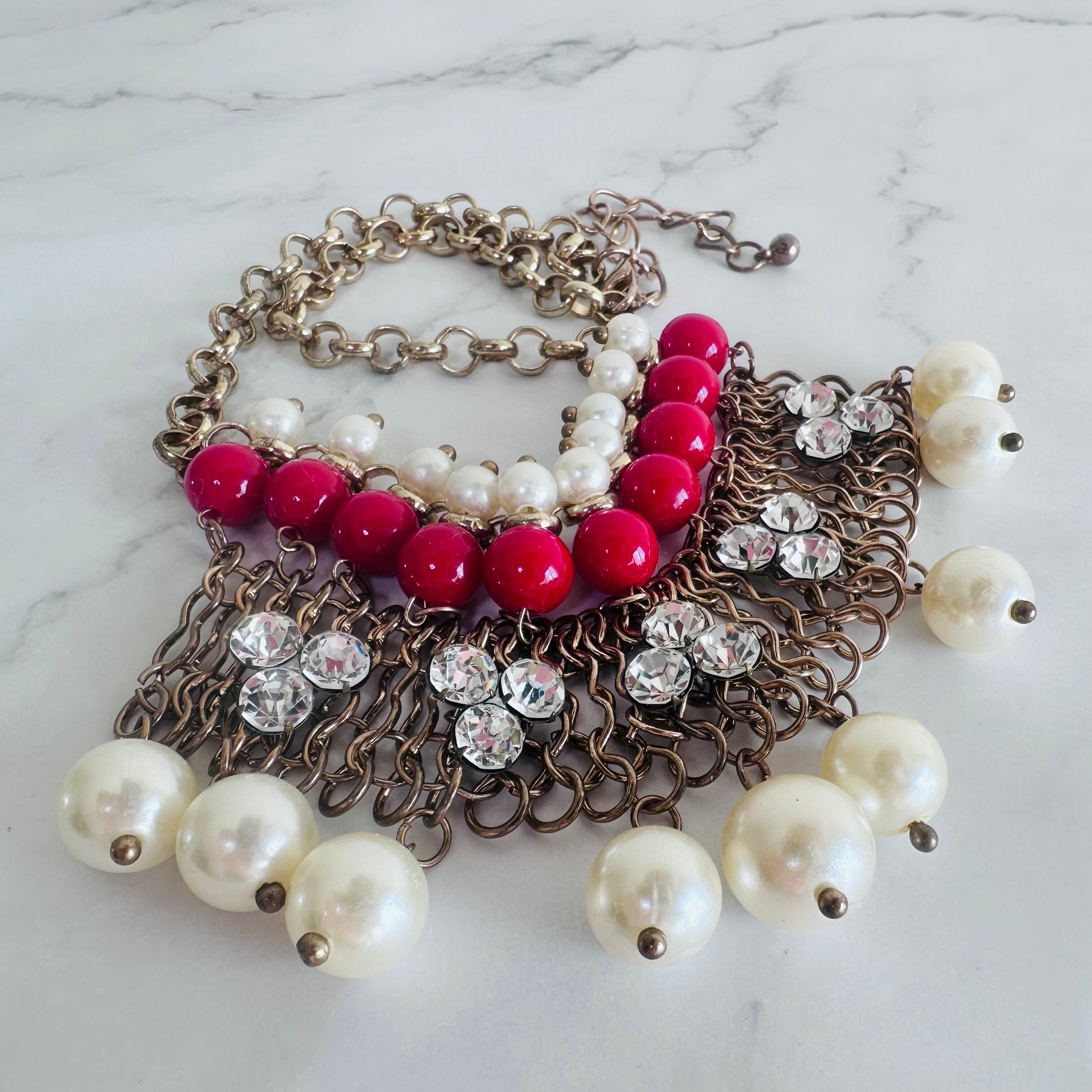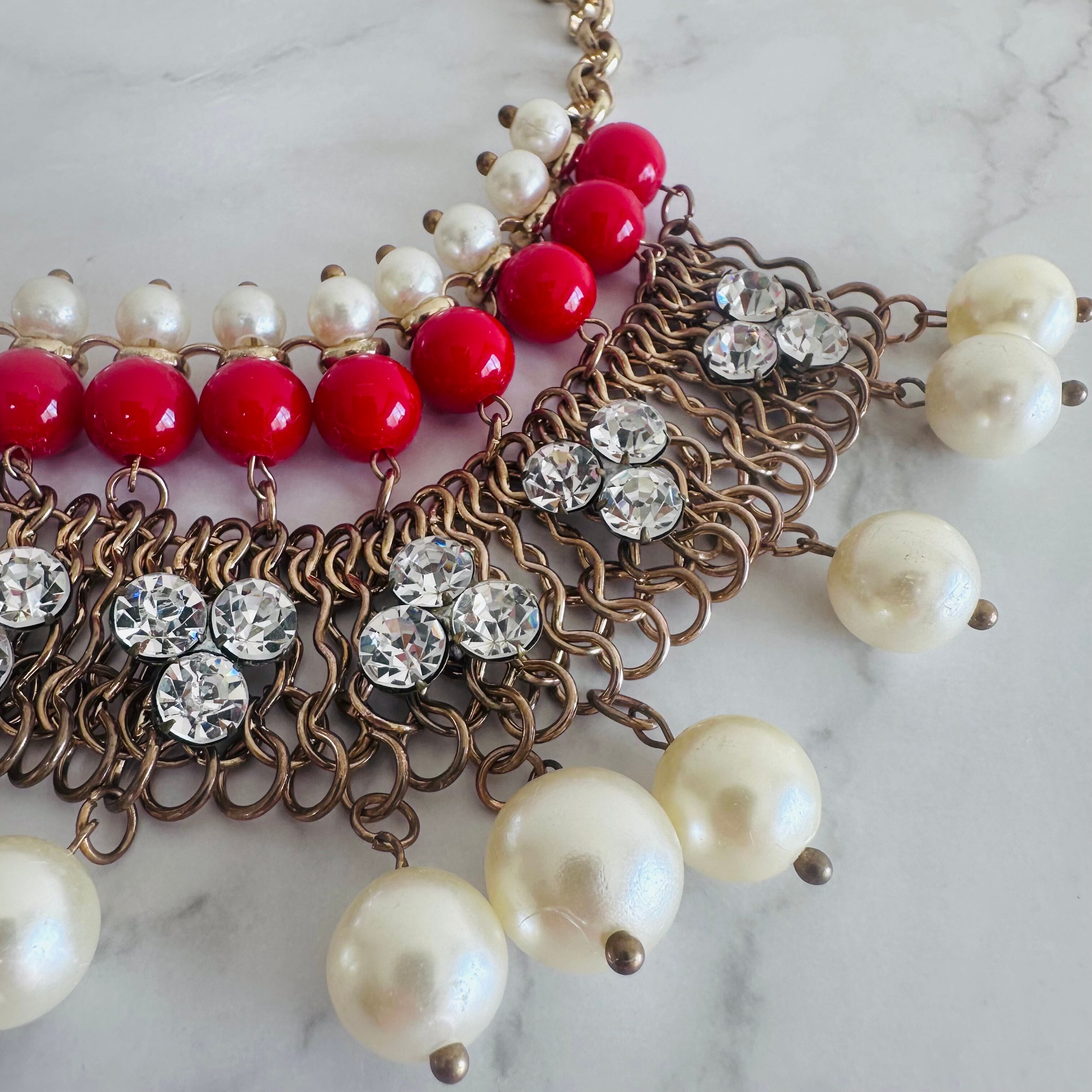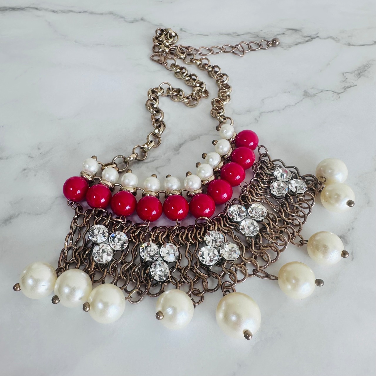 レッド、パール、クリスタル✖️アンティークゴールドカラーのネックレスです。