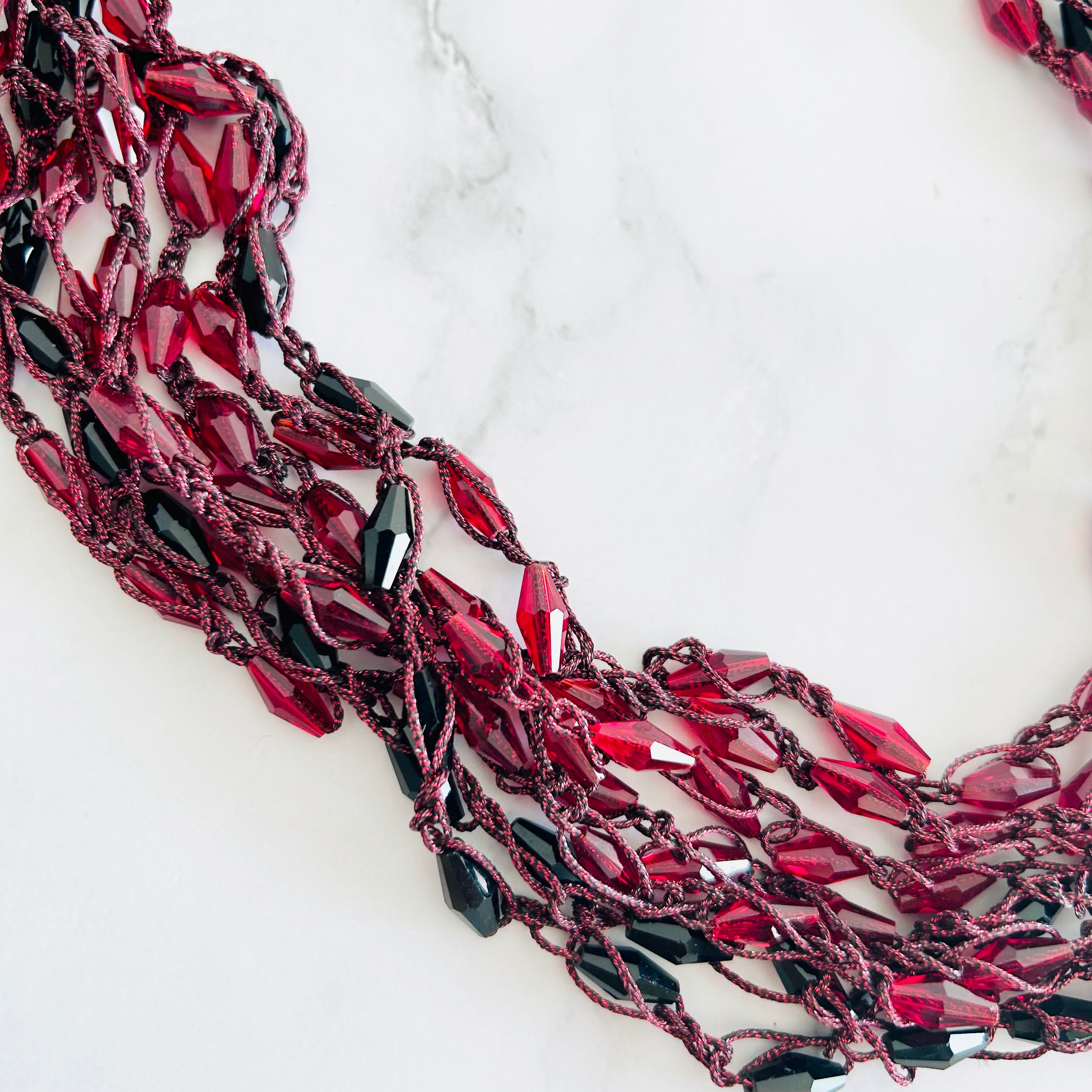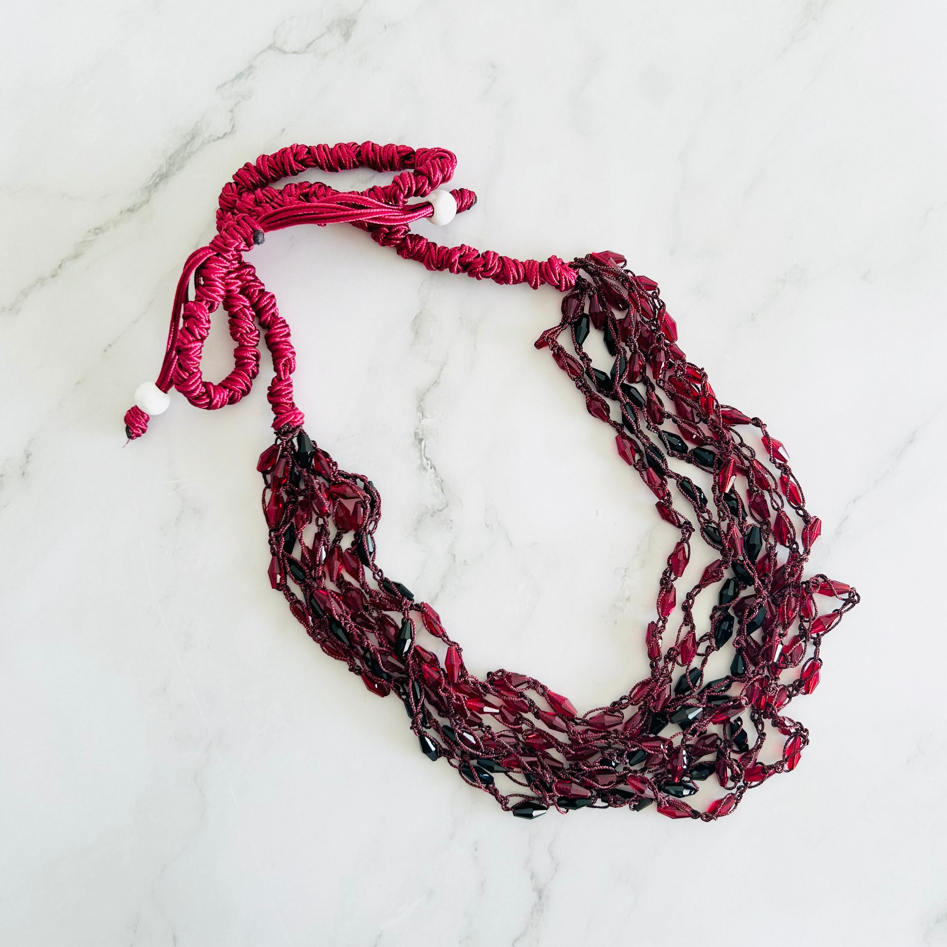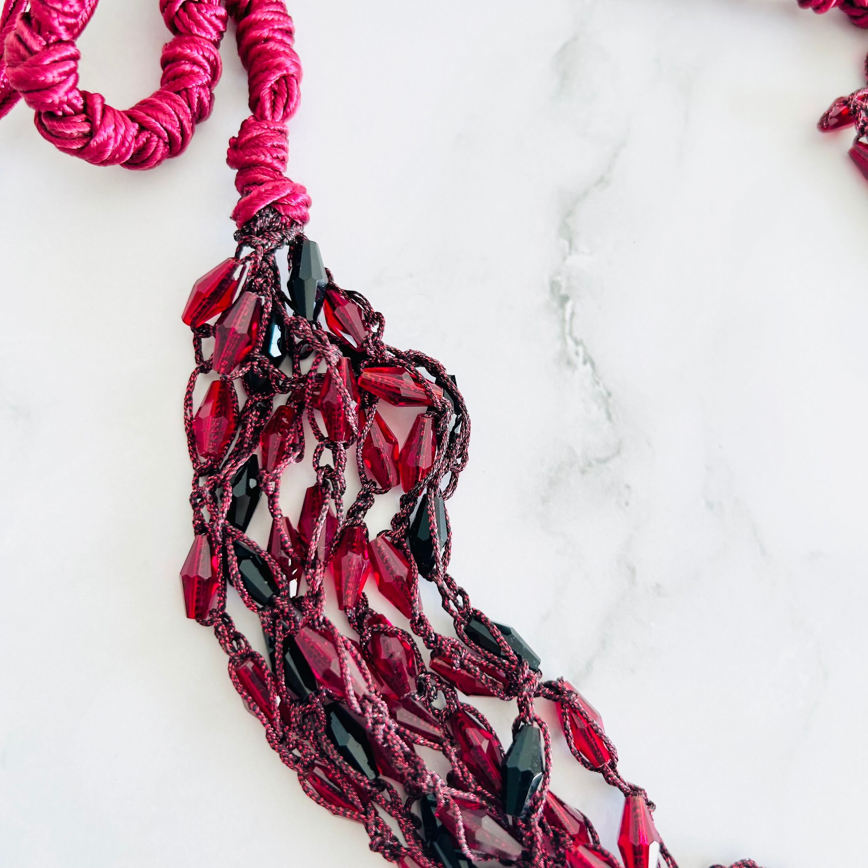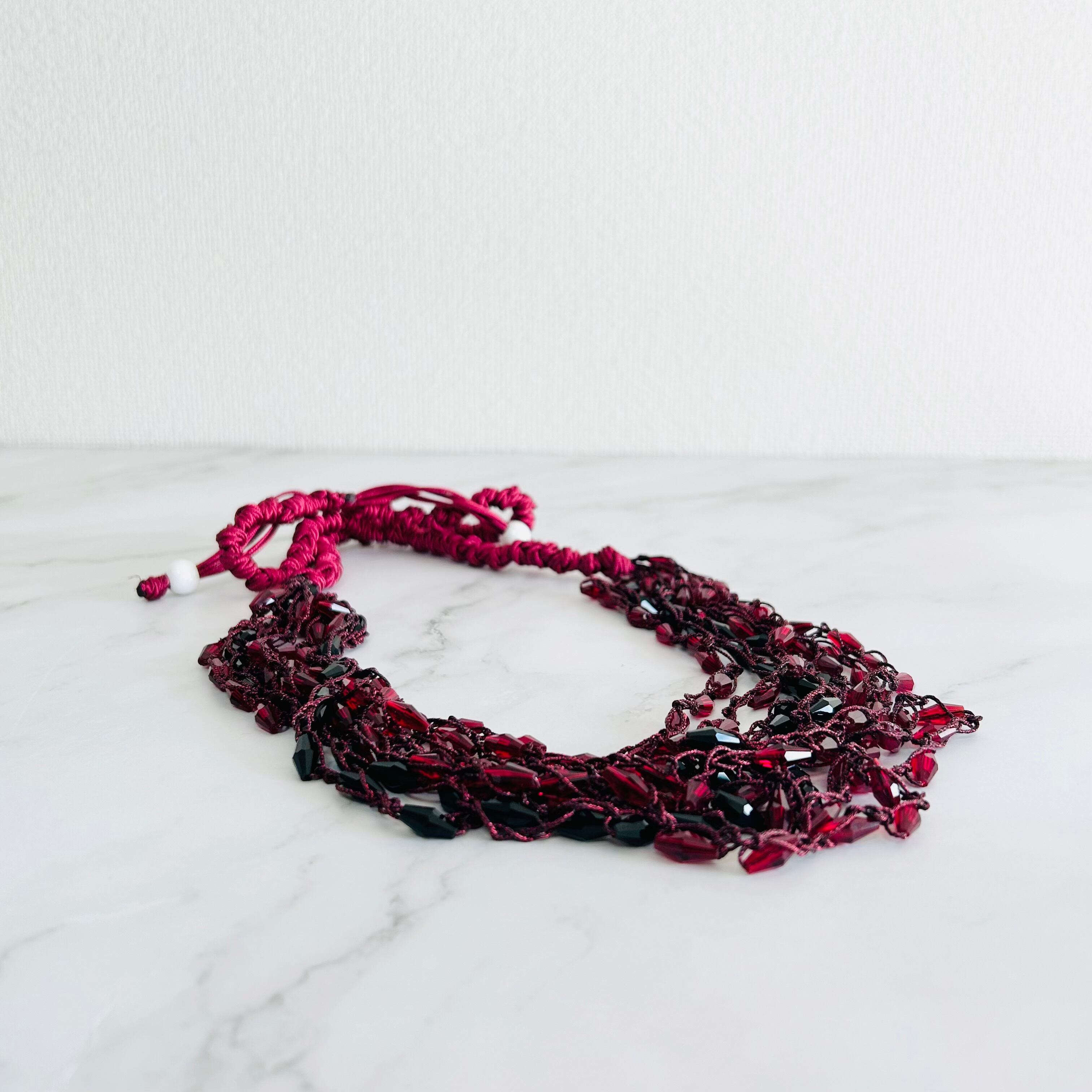 ひとつひとつ結び上げたコードに透明感のあるレッドとブラックのクリスタルパーツを通した手の凝ったデザインです。