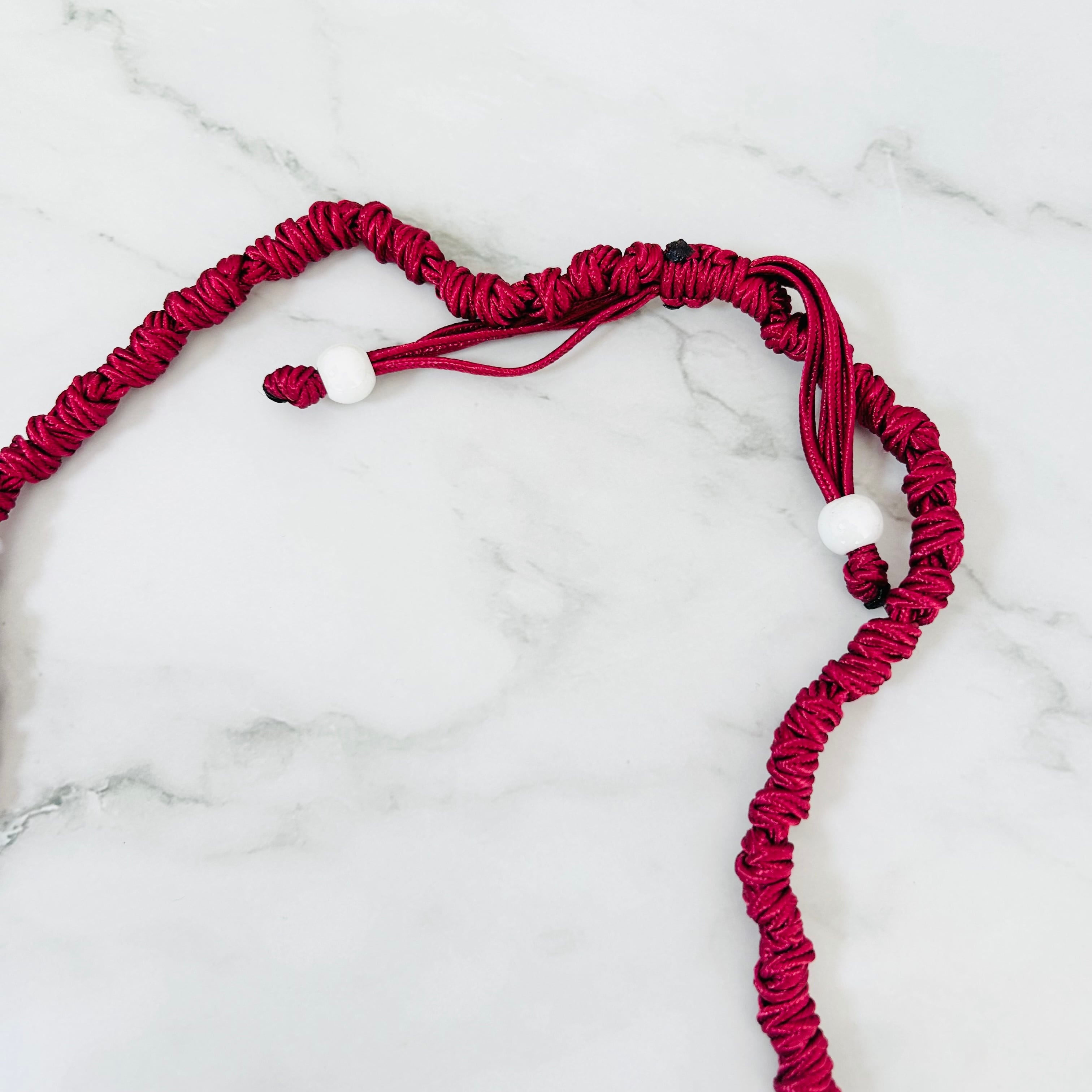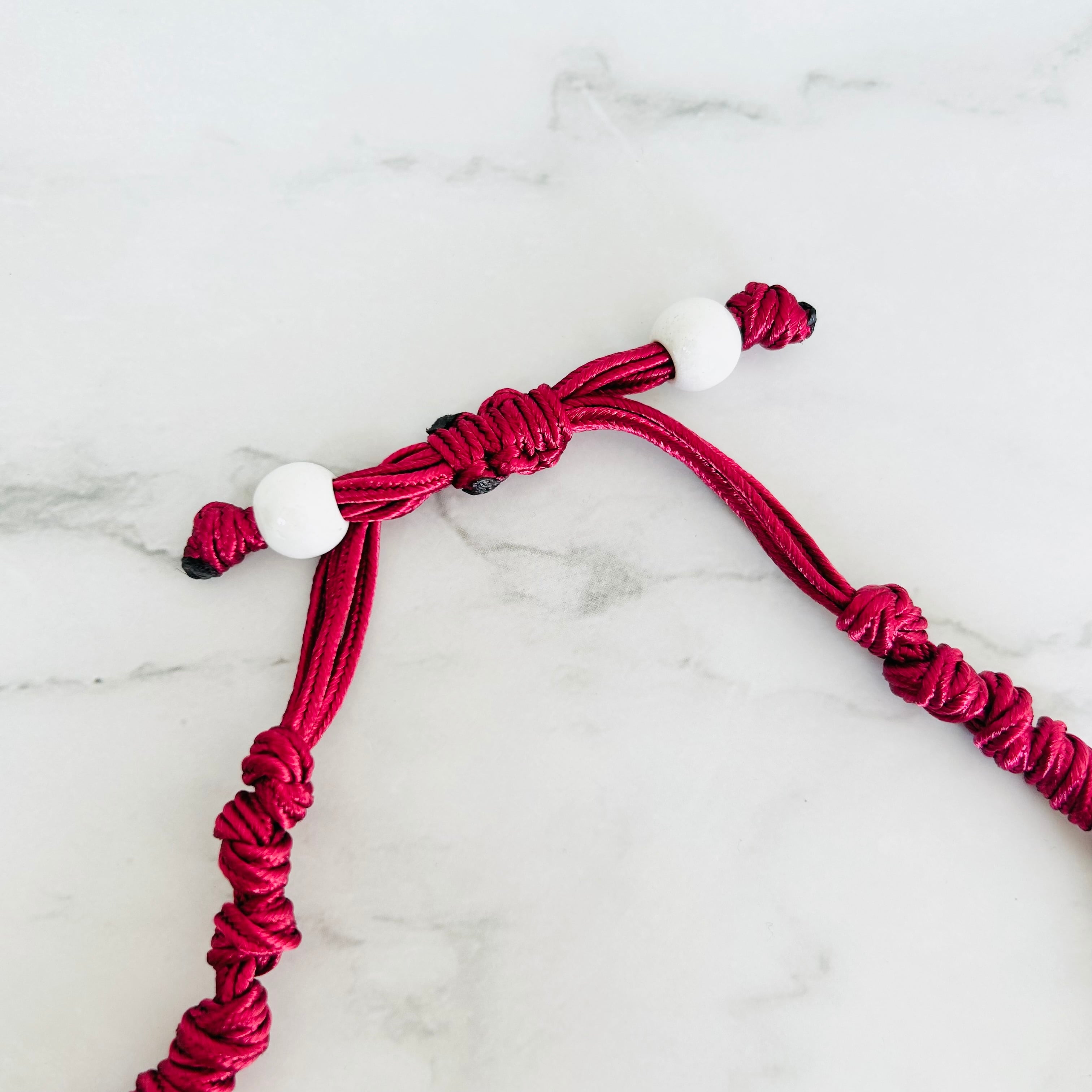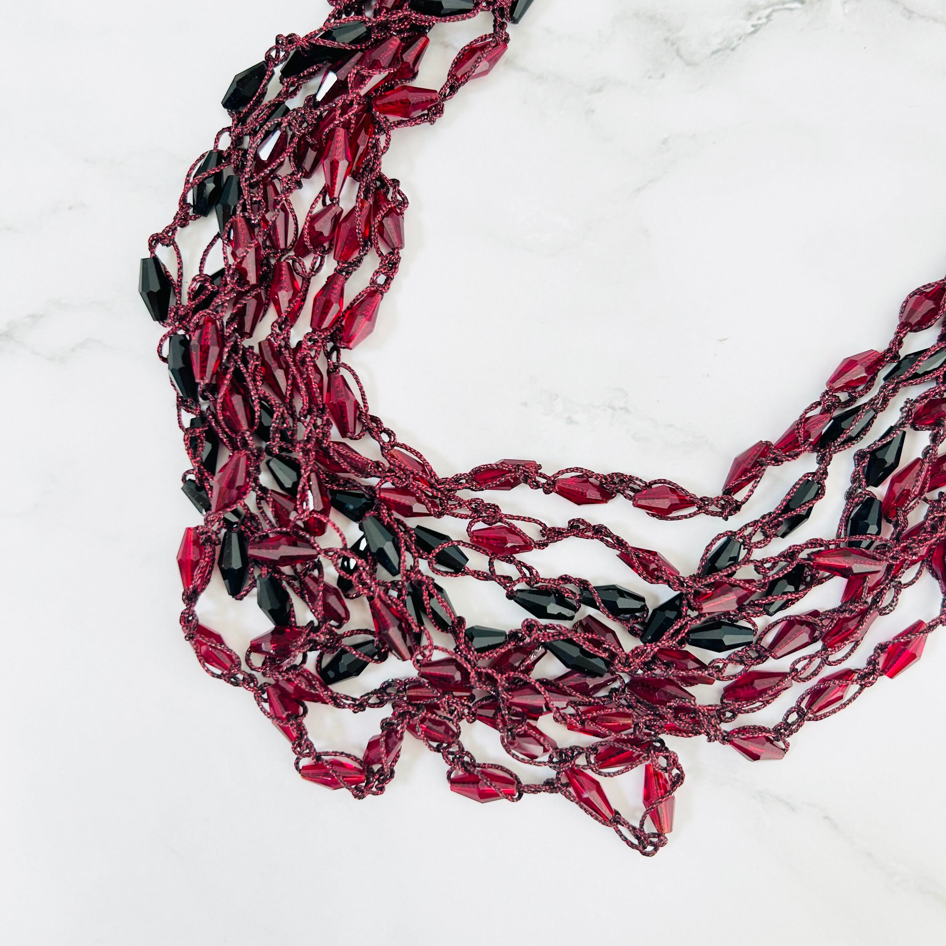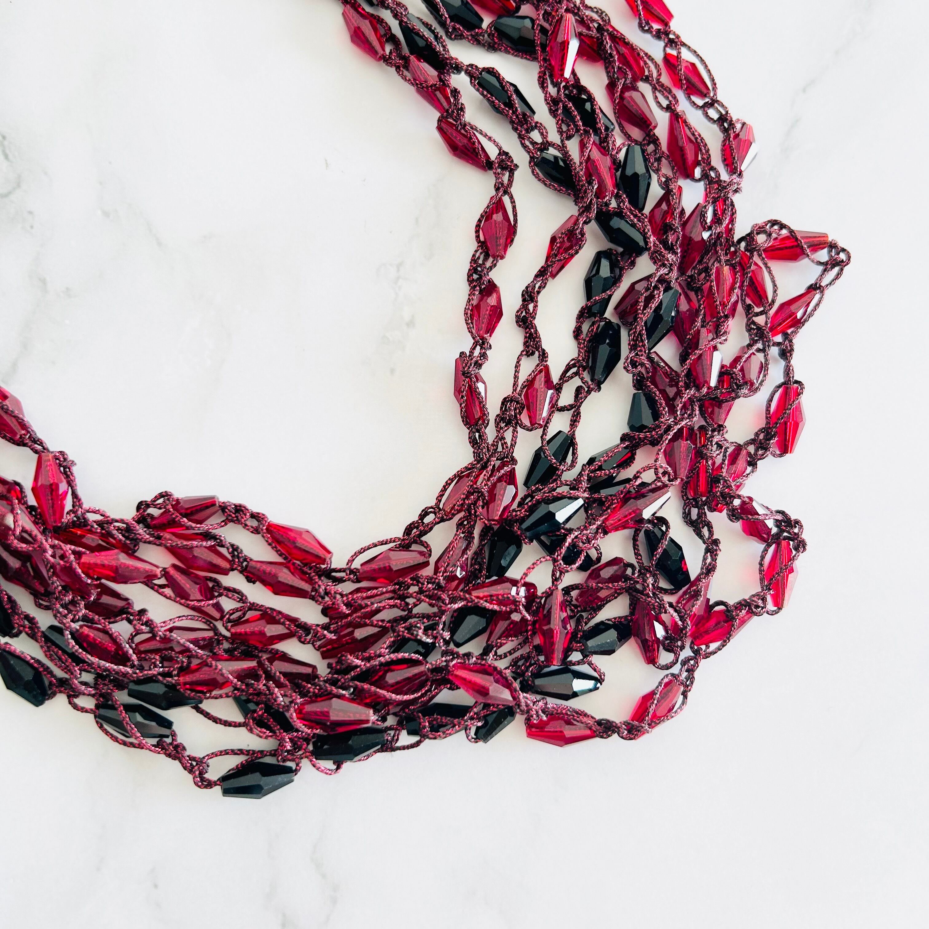 ひとつひとつ結び上げたコードに透明感のあるレッドとブラックのクリスタルパーツを通した手の凝ったデザインです。