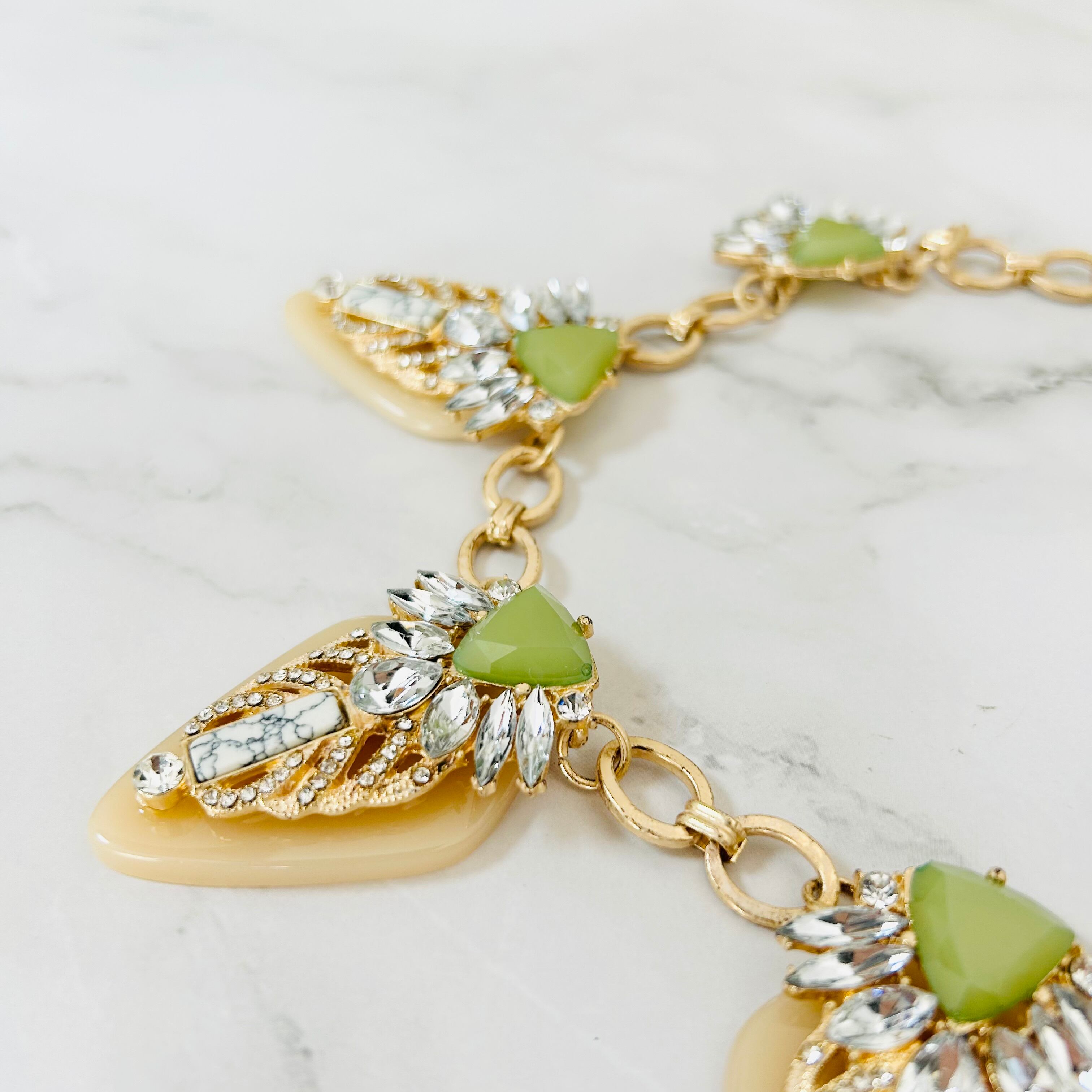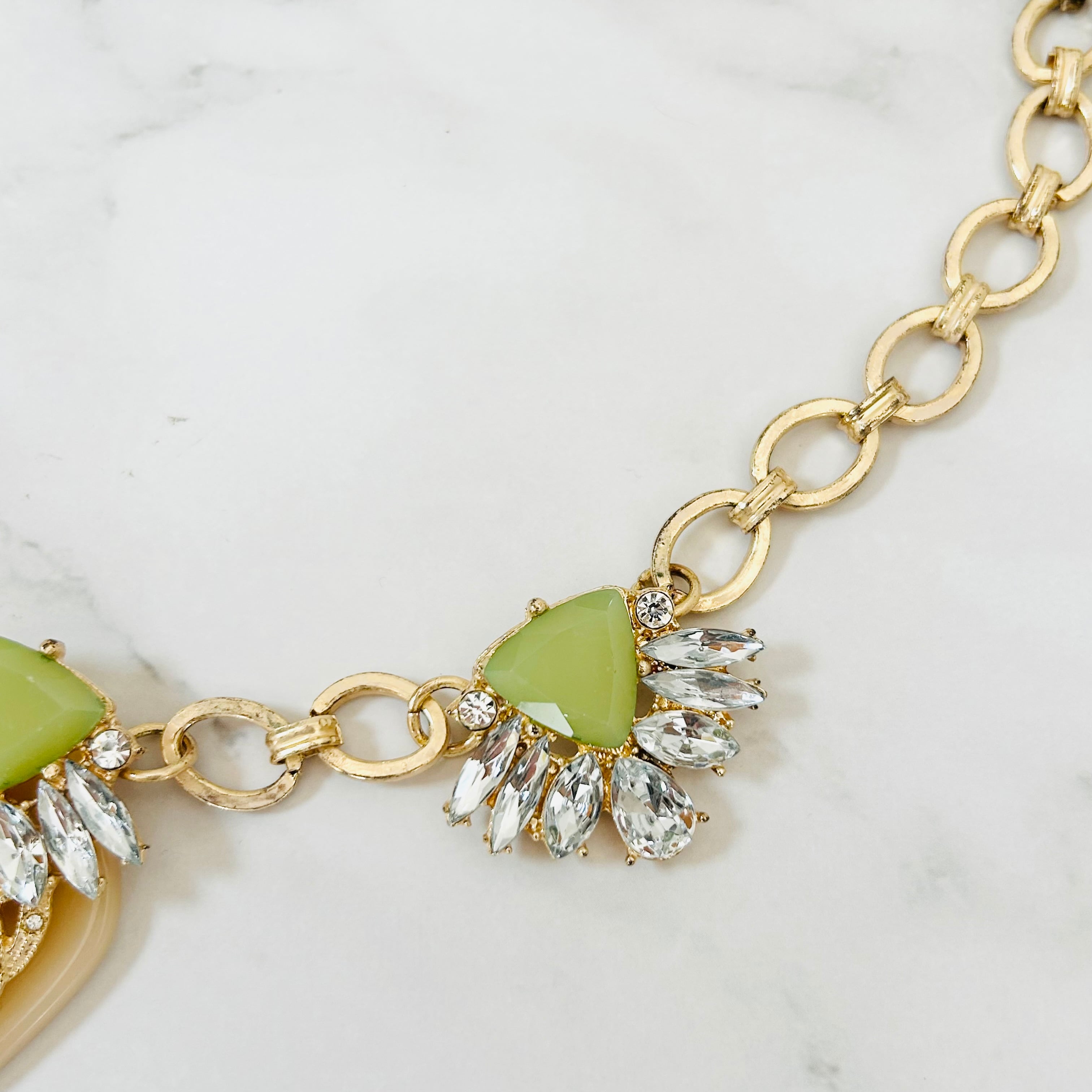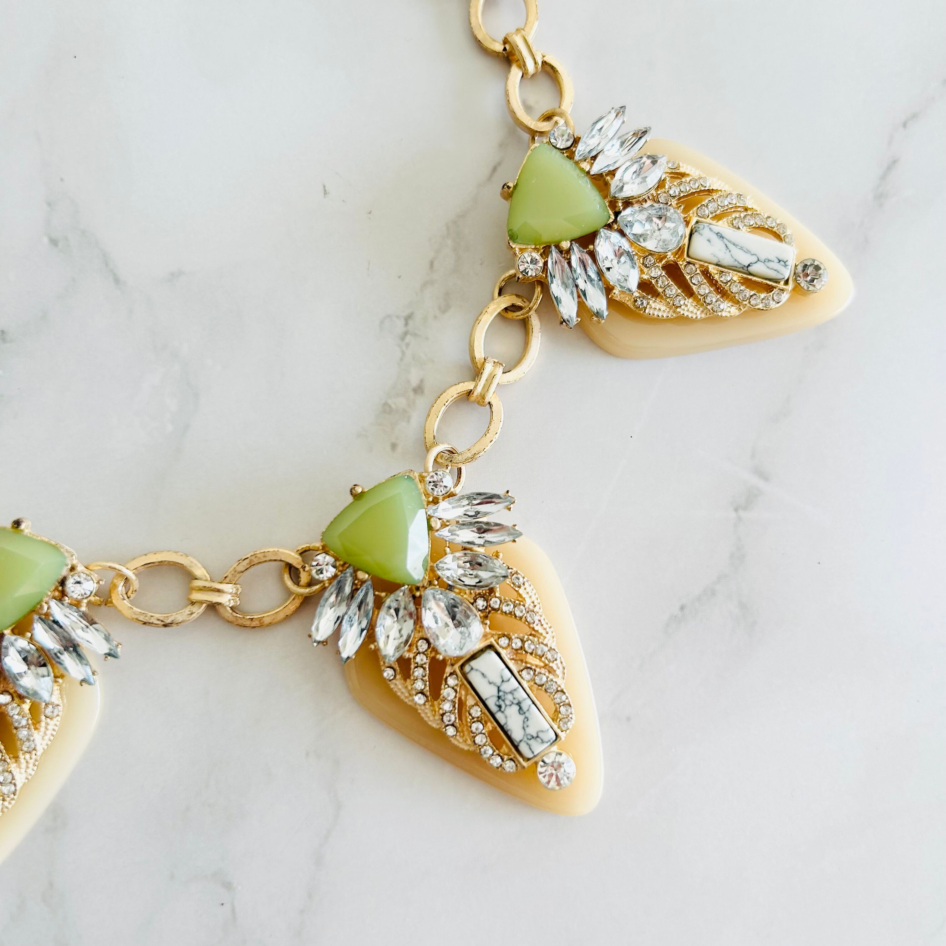 ライトグリーン、ベージュ、クリスタル✖️マットゴールドカラーのネックレスです。