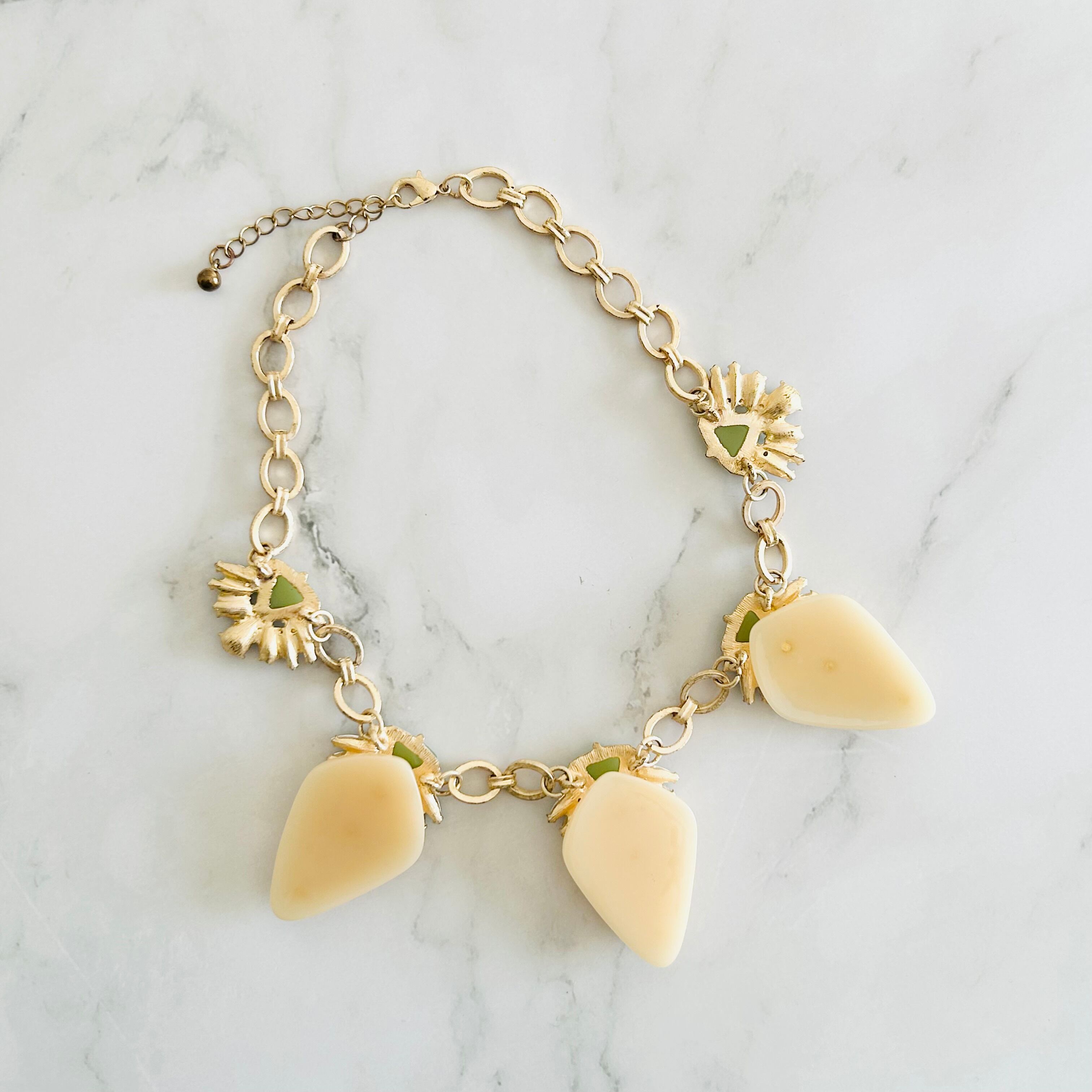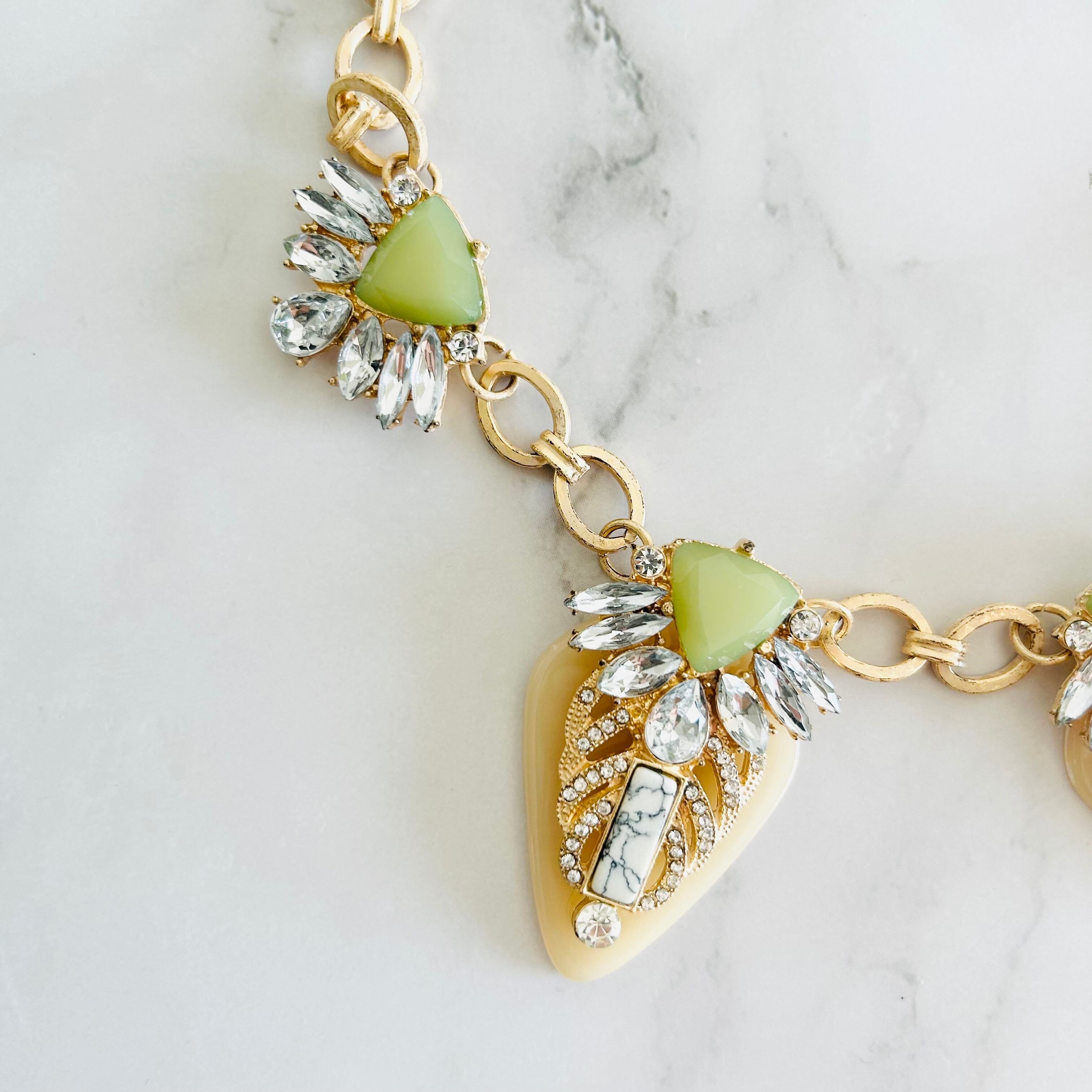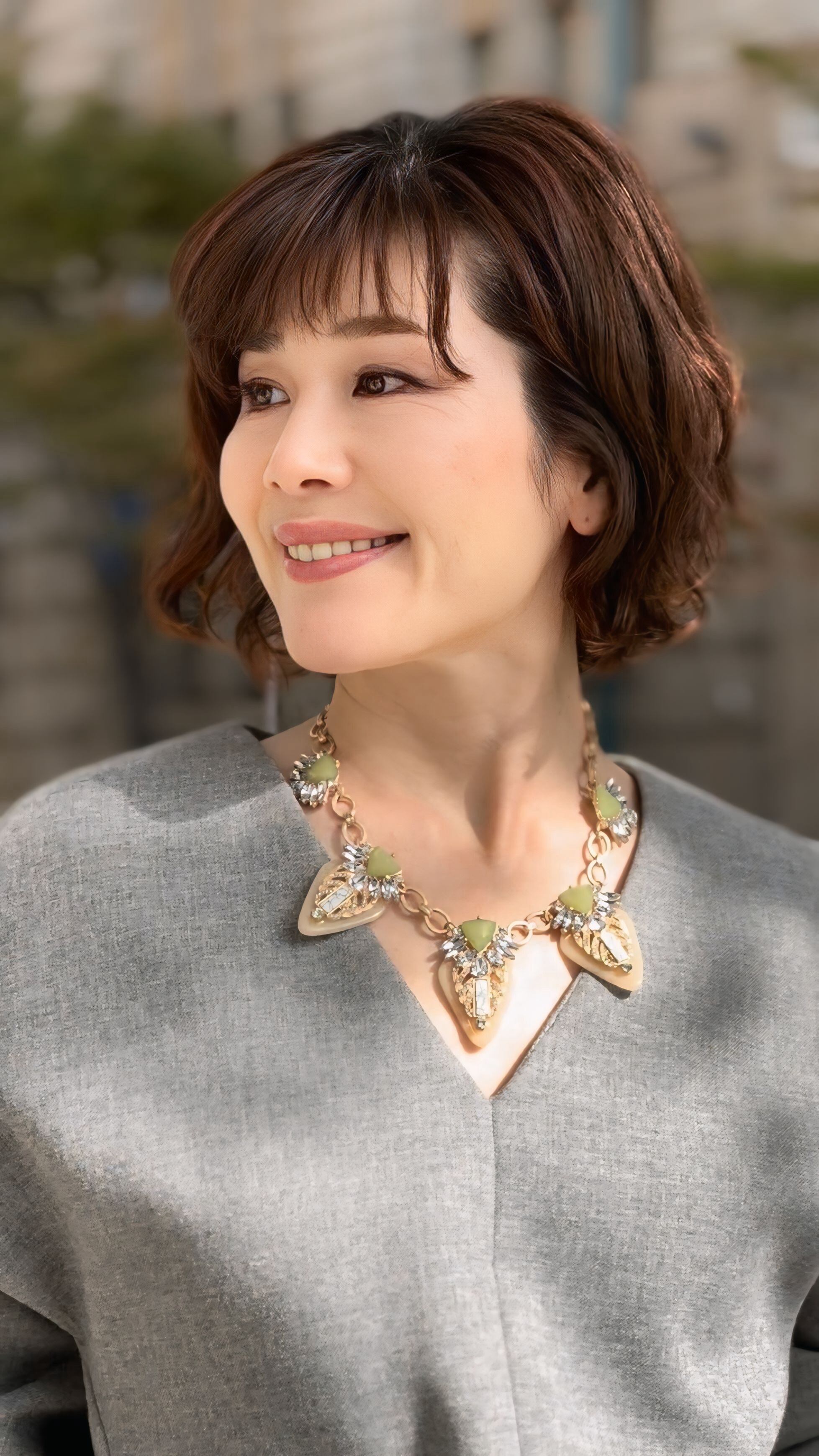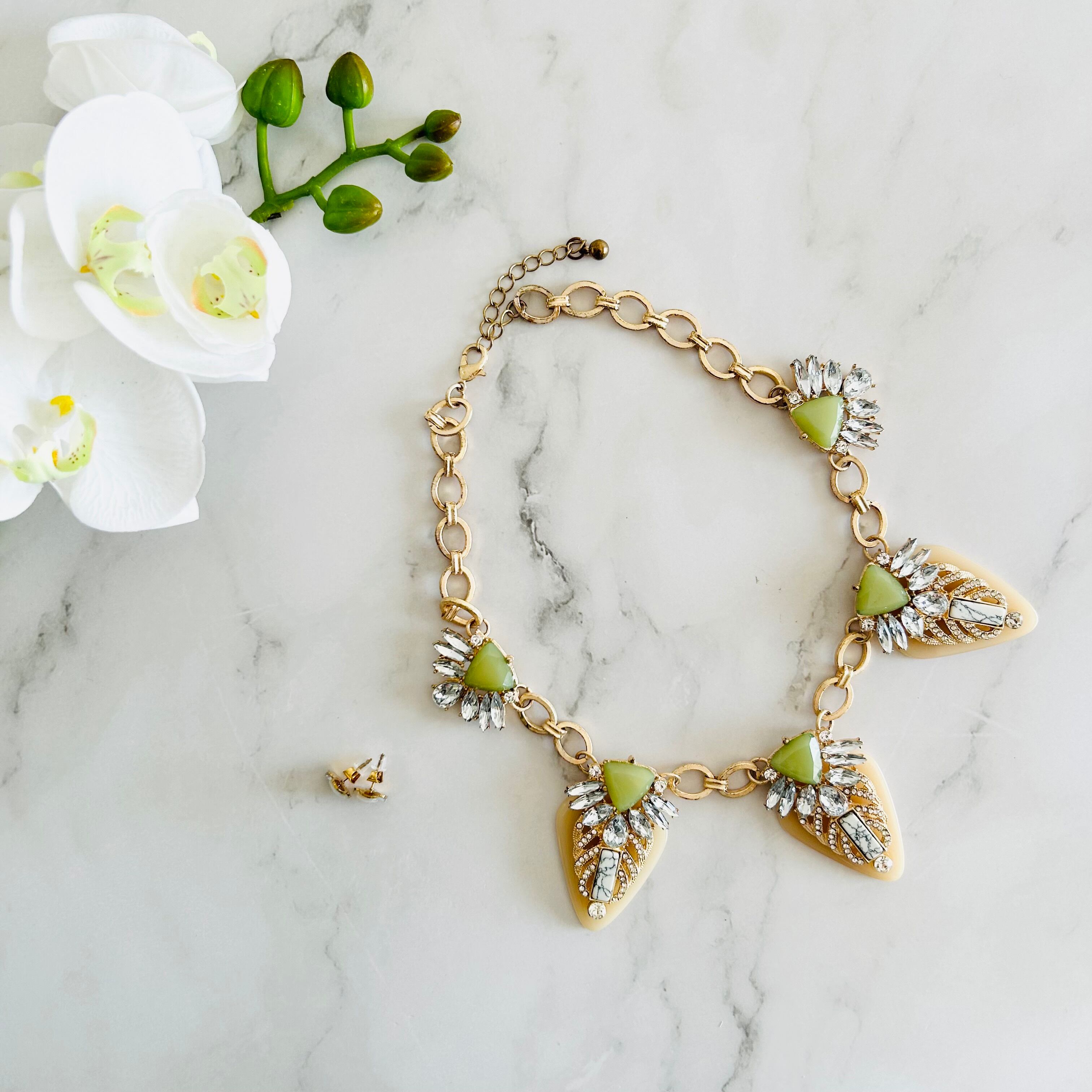 ライトグリーン、ベージュ、クリスタル✖️マットゴールドカラーのネックレスです。