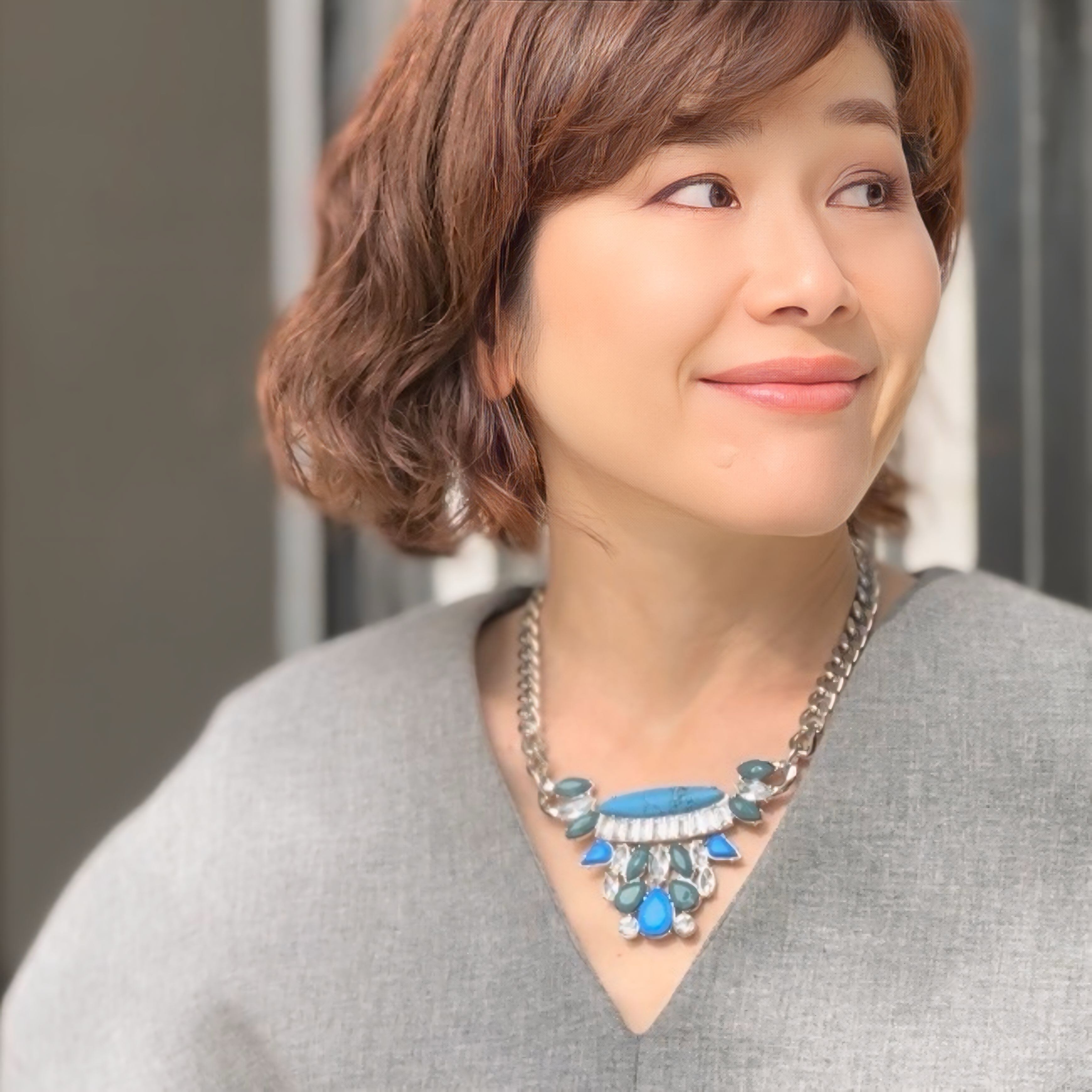 大理石調のブルーのストーンをアクセントに、アクリル素材のビジューパーツをプラスしてクールなチャンキーチェーンと合わせました。
