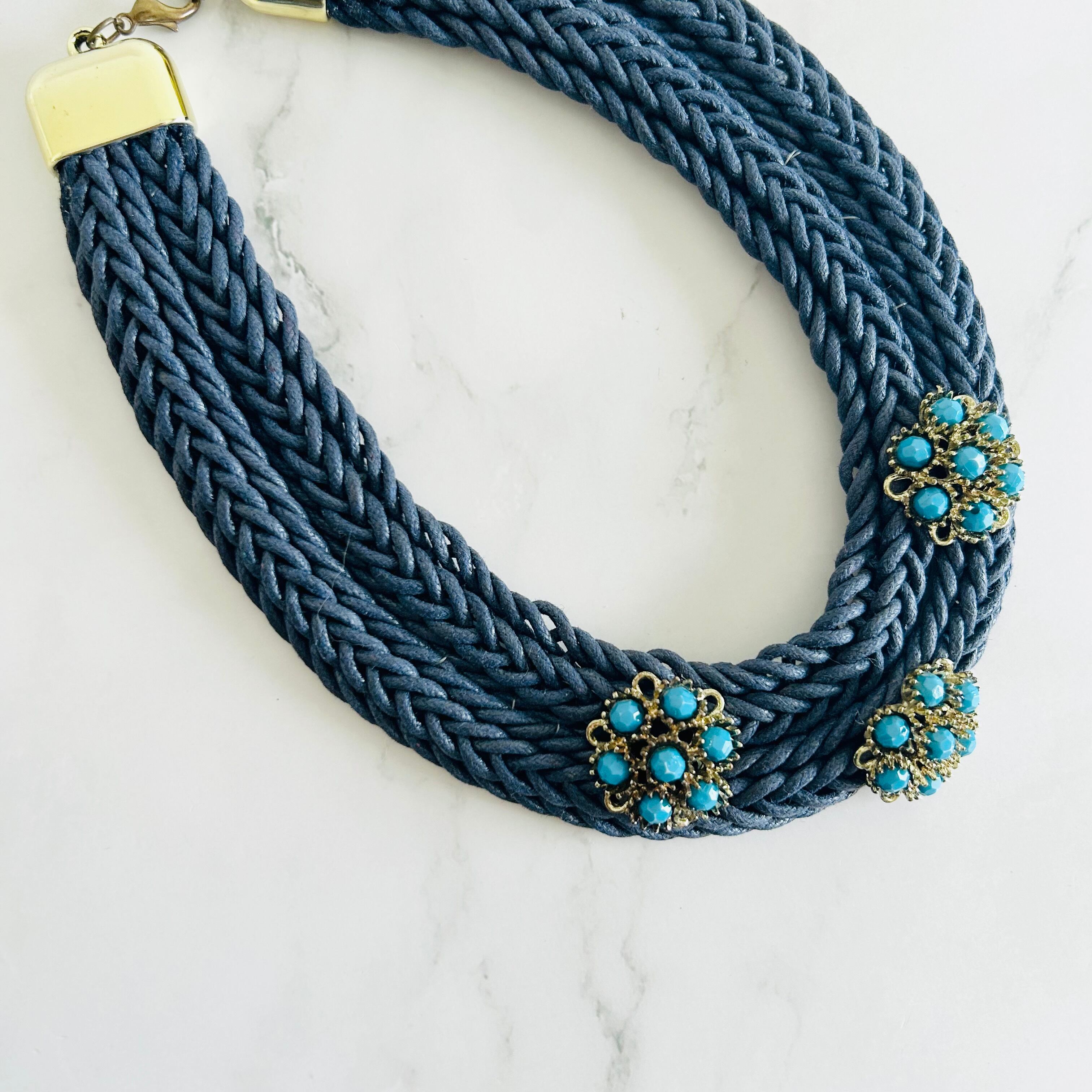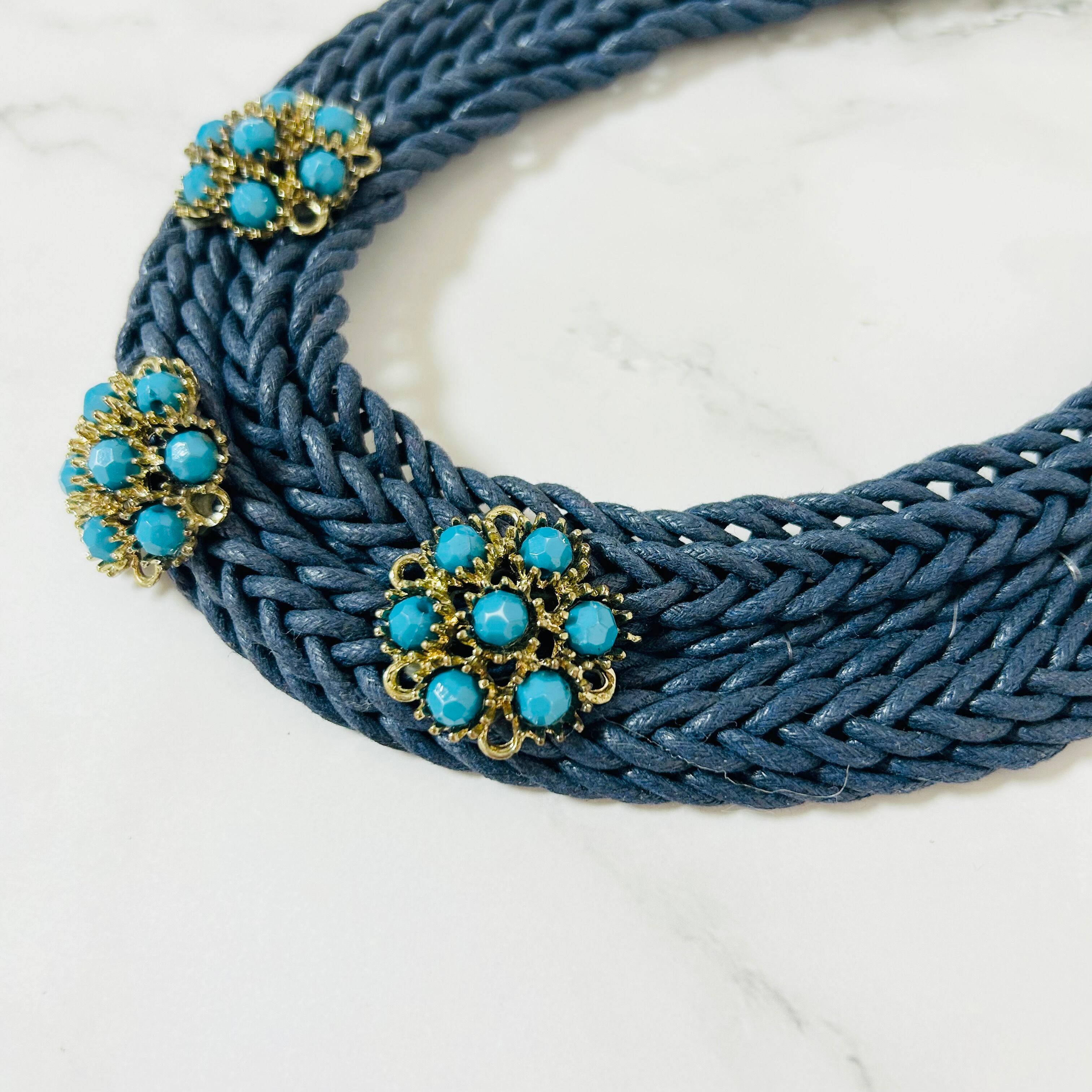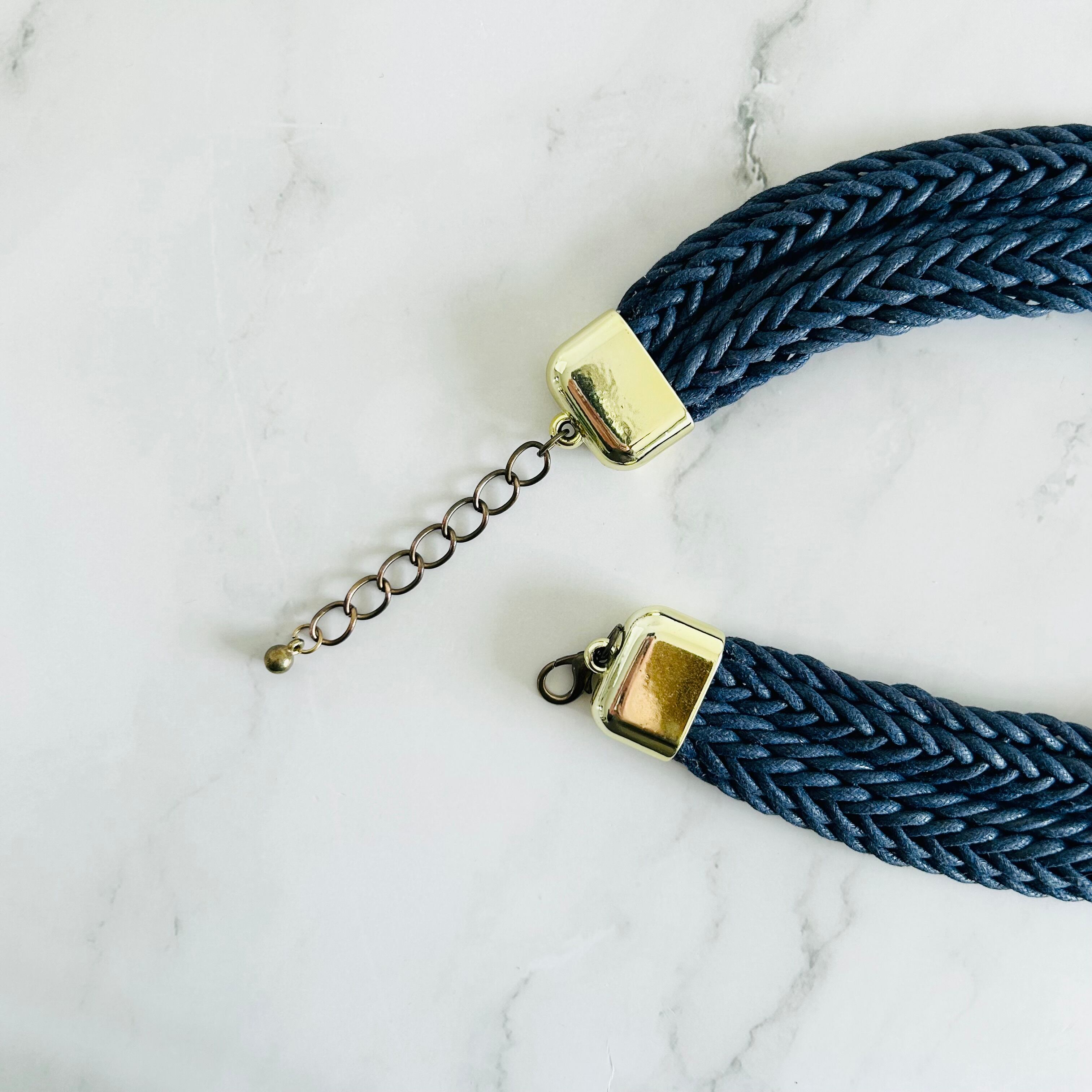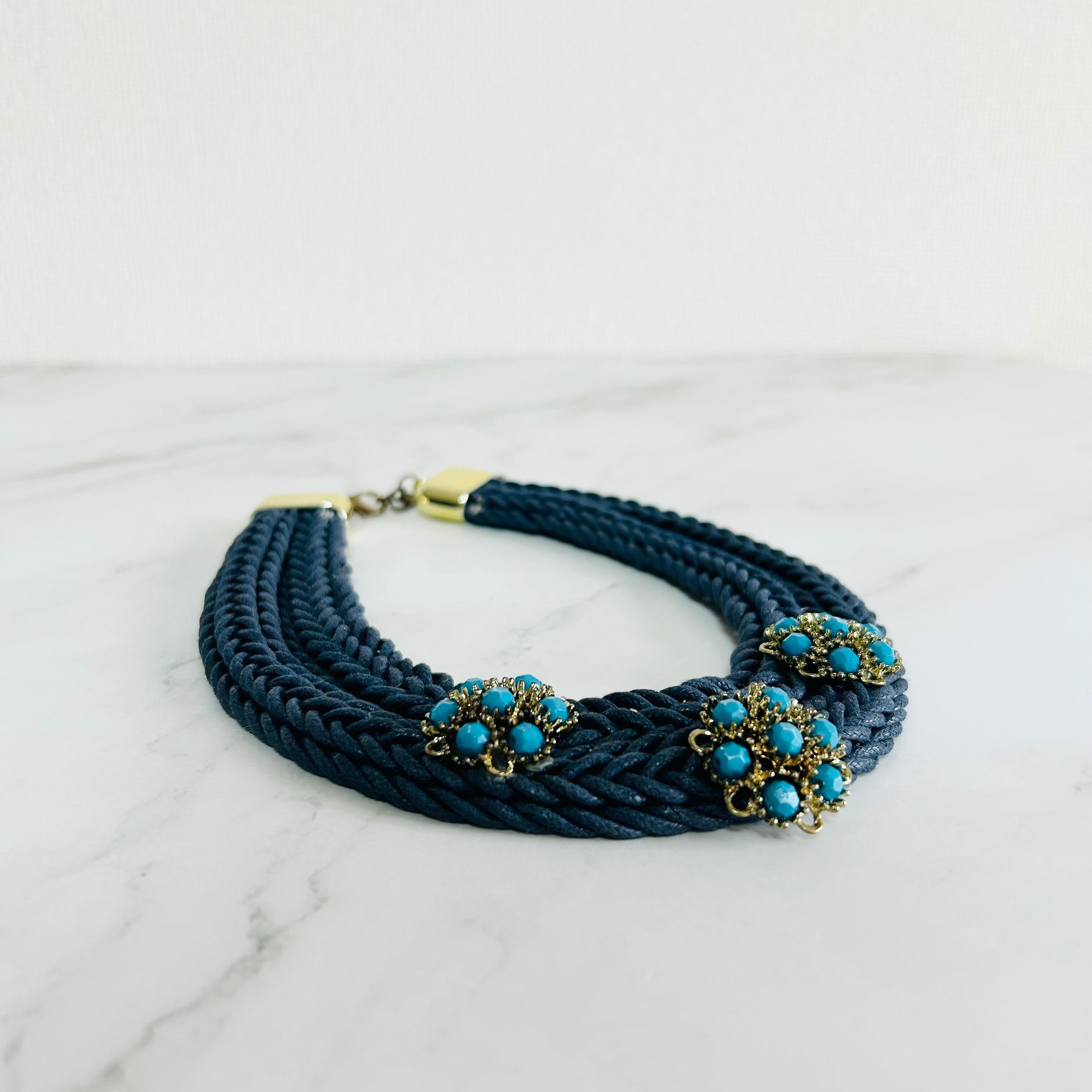 編み上げたレザー調のコードを組み合わせ、アンティーク調のブルーモチーフをアクセントとしてプラスしたデザインです。