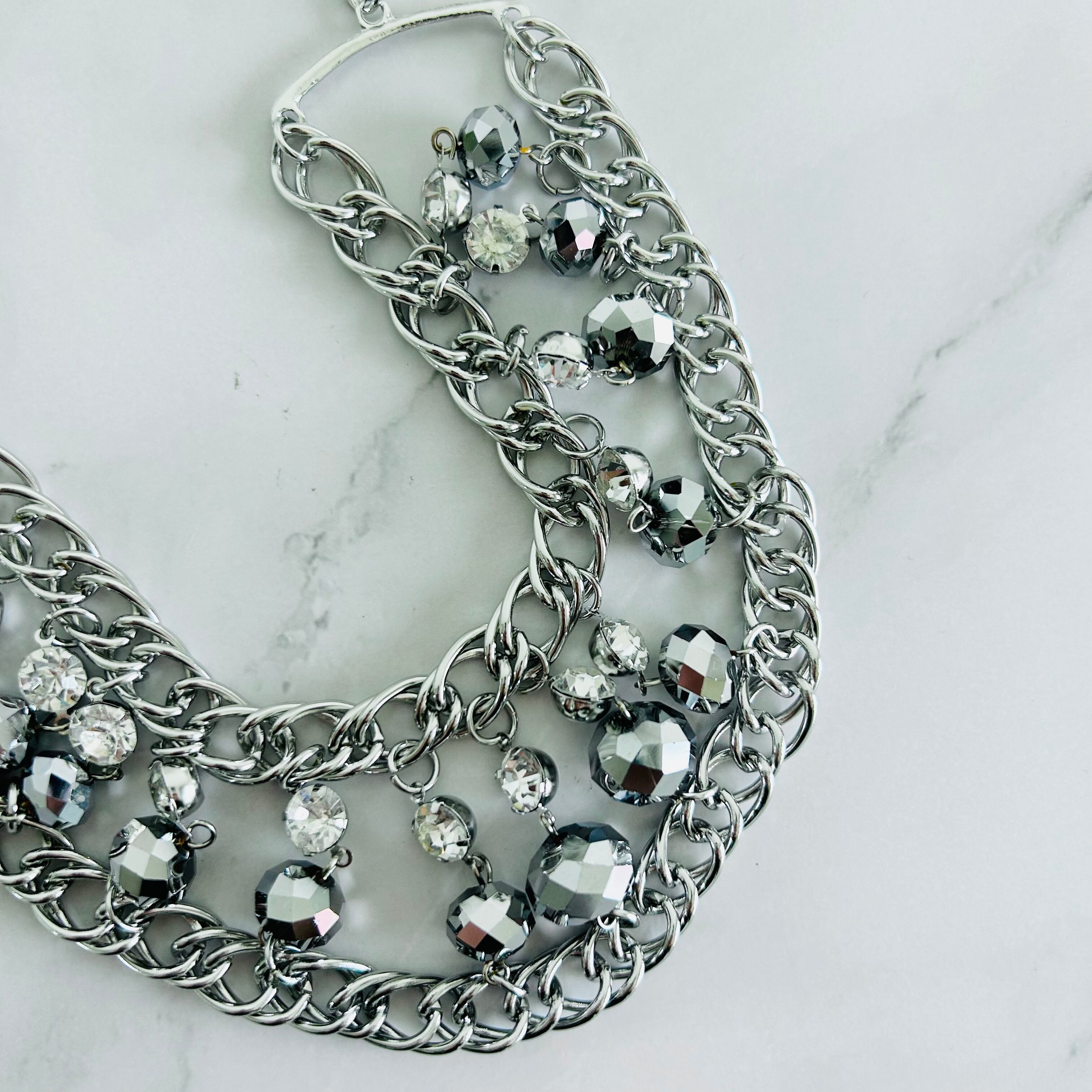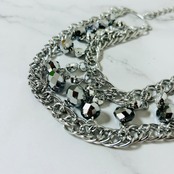 キラッとした輝きを放つクリスタルビジューとメタルカラーのクリスタルパーツをシルバーチェーンと組み合わせたシャイニーなデザインです。