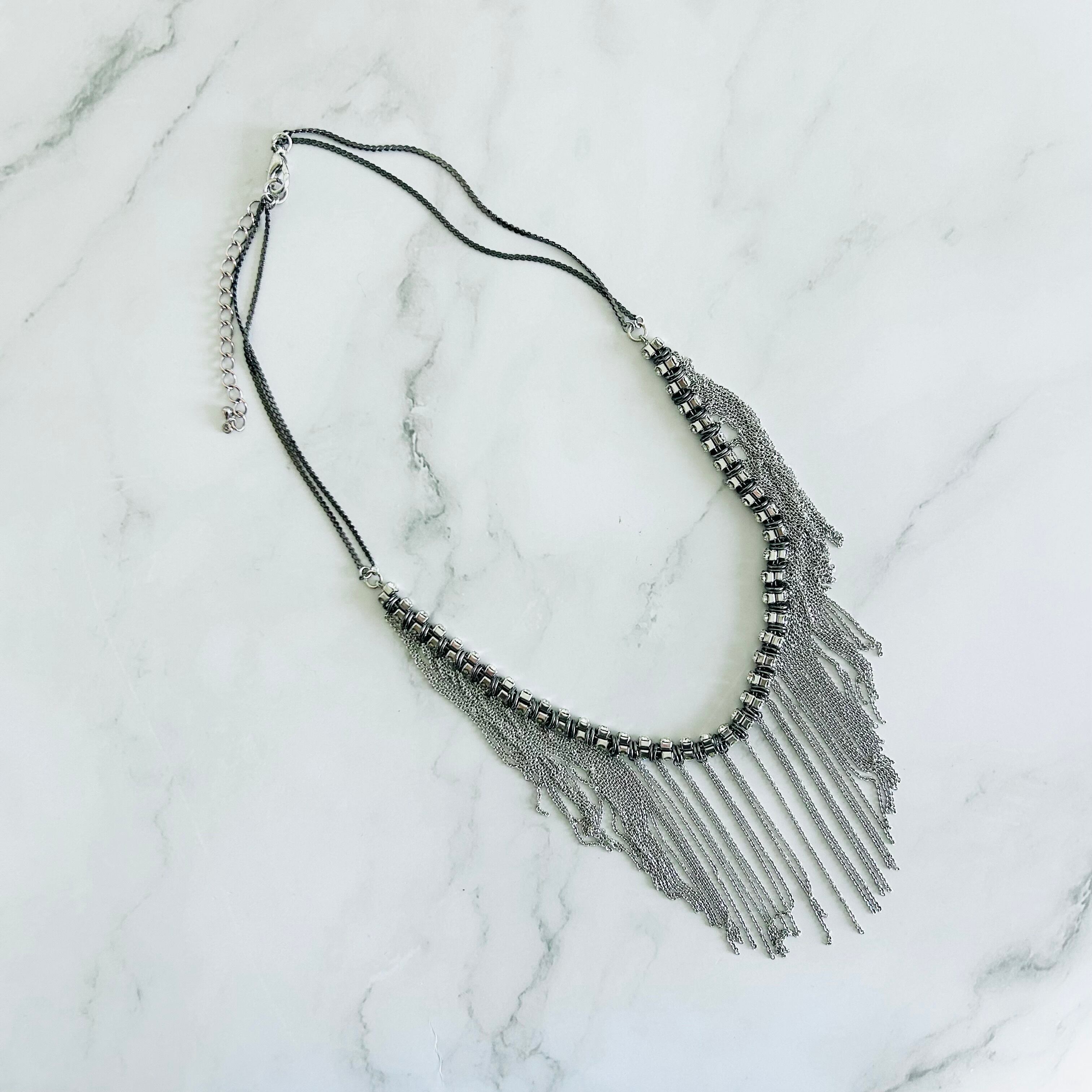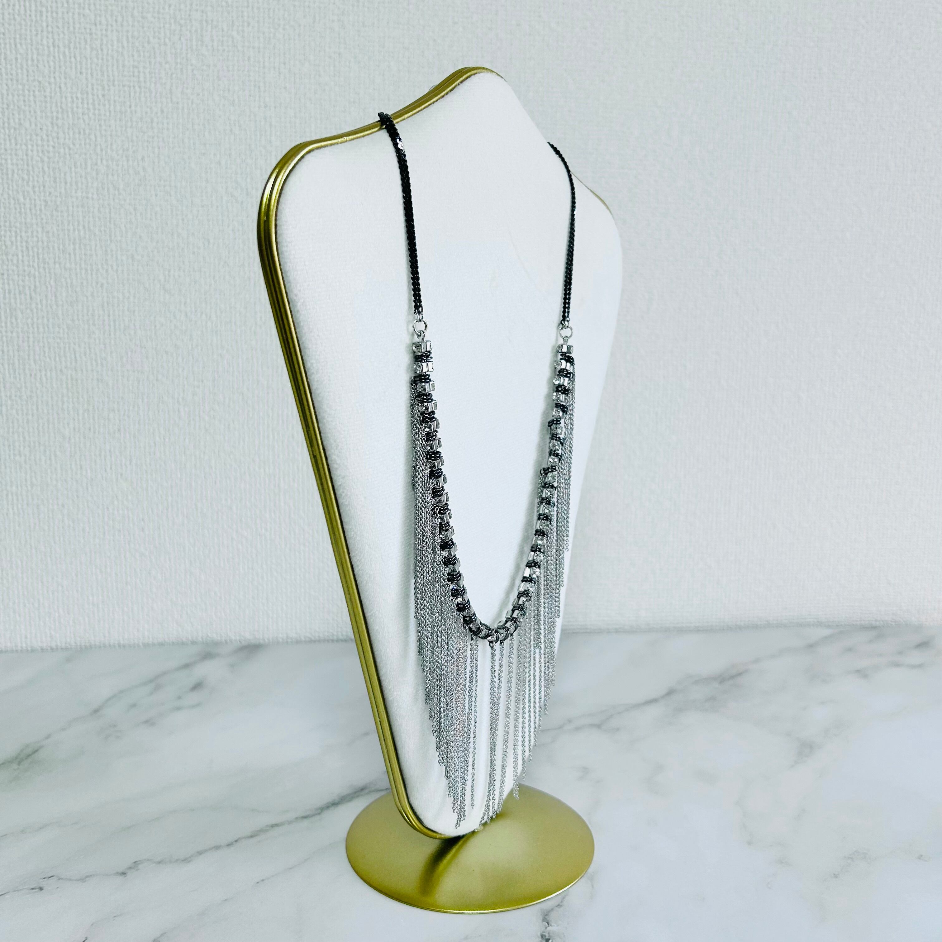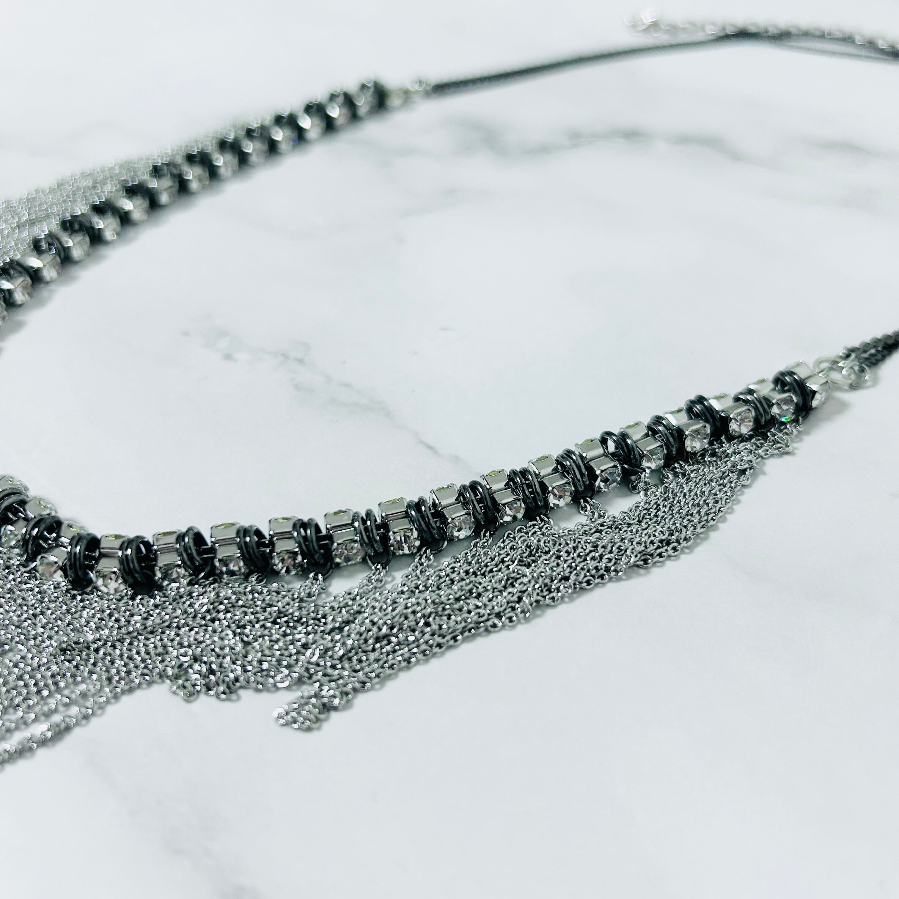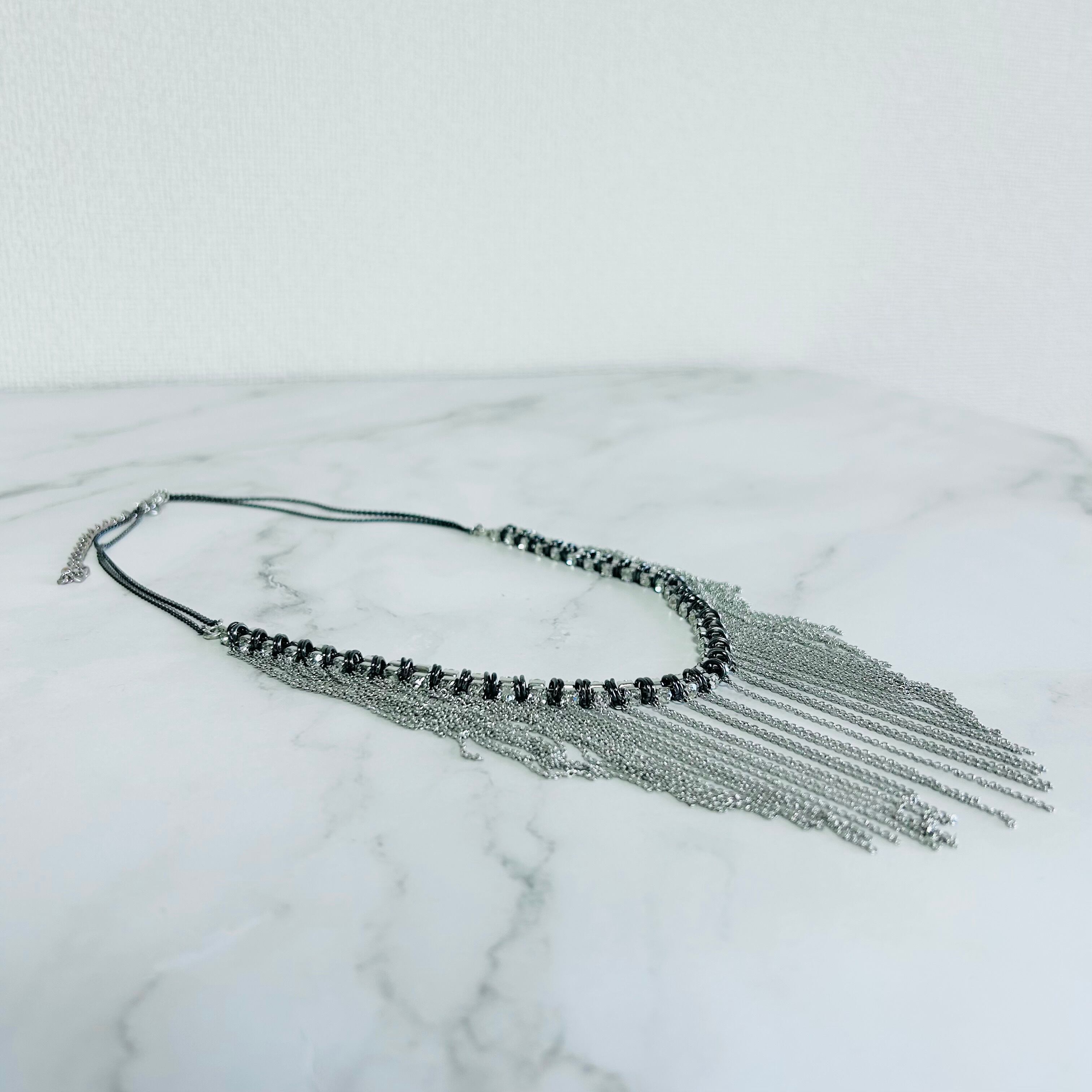 フリンジ状にカットした華奢なシルバーチェーン&クリスタルビジューをあしらったデザインです。