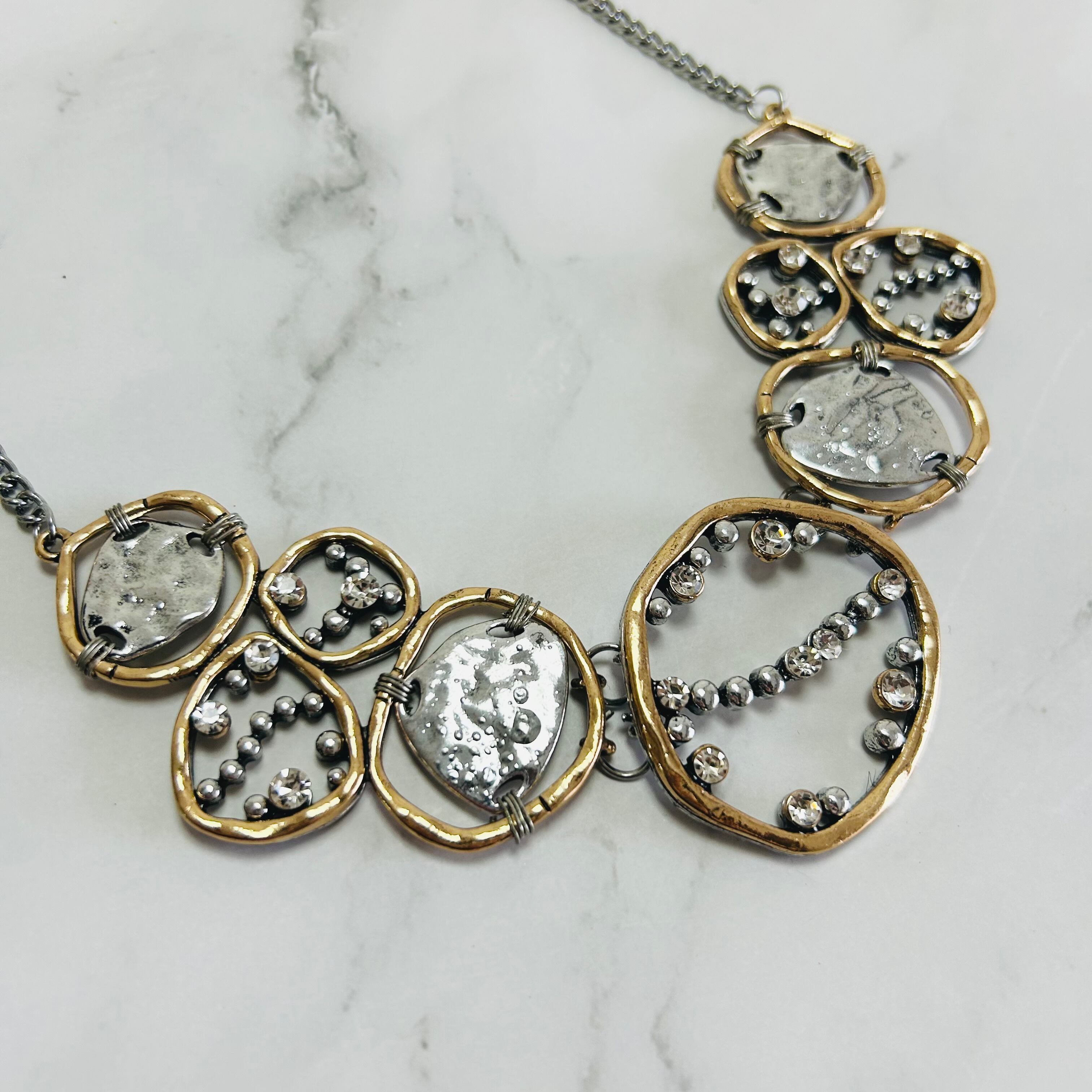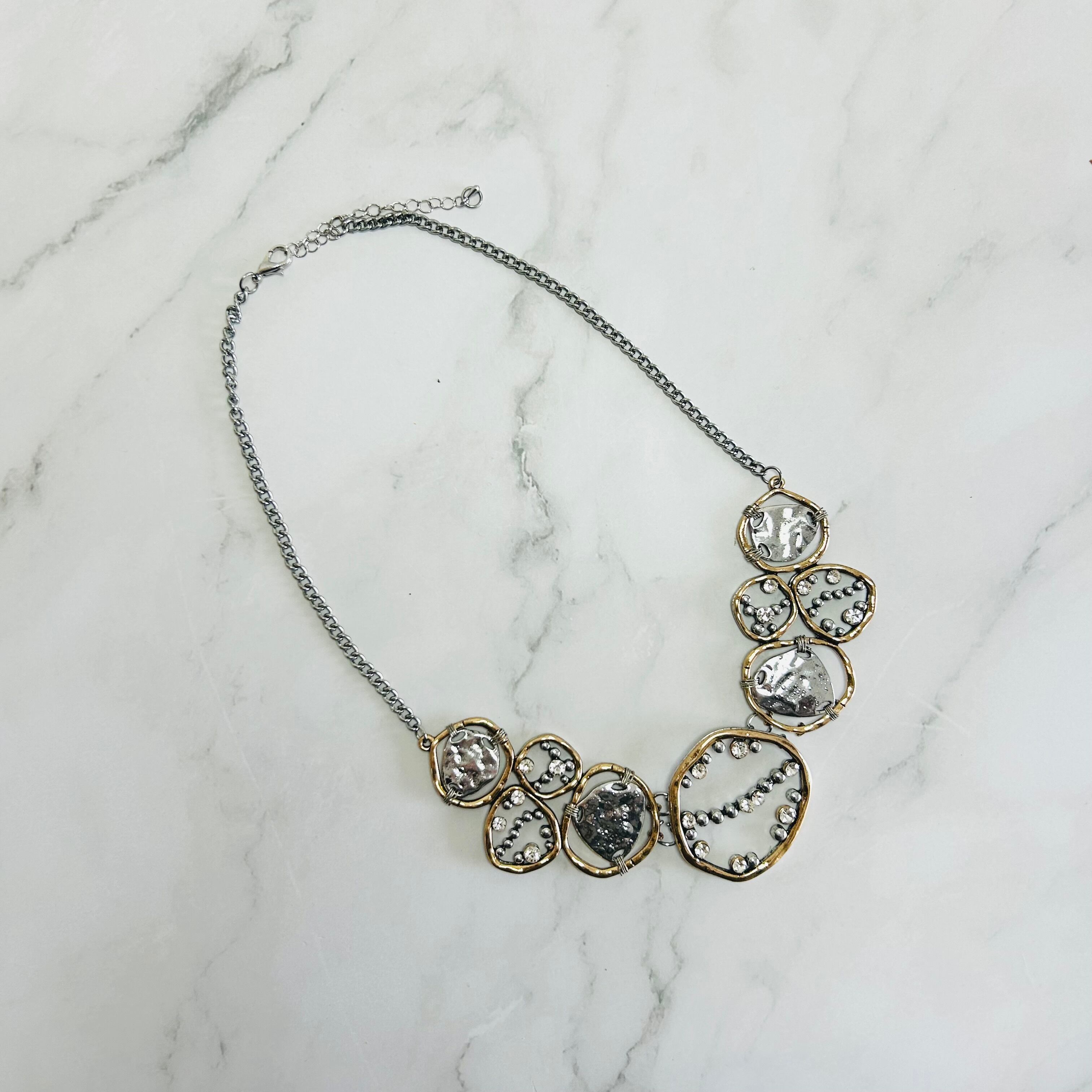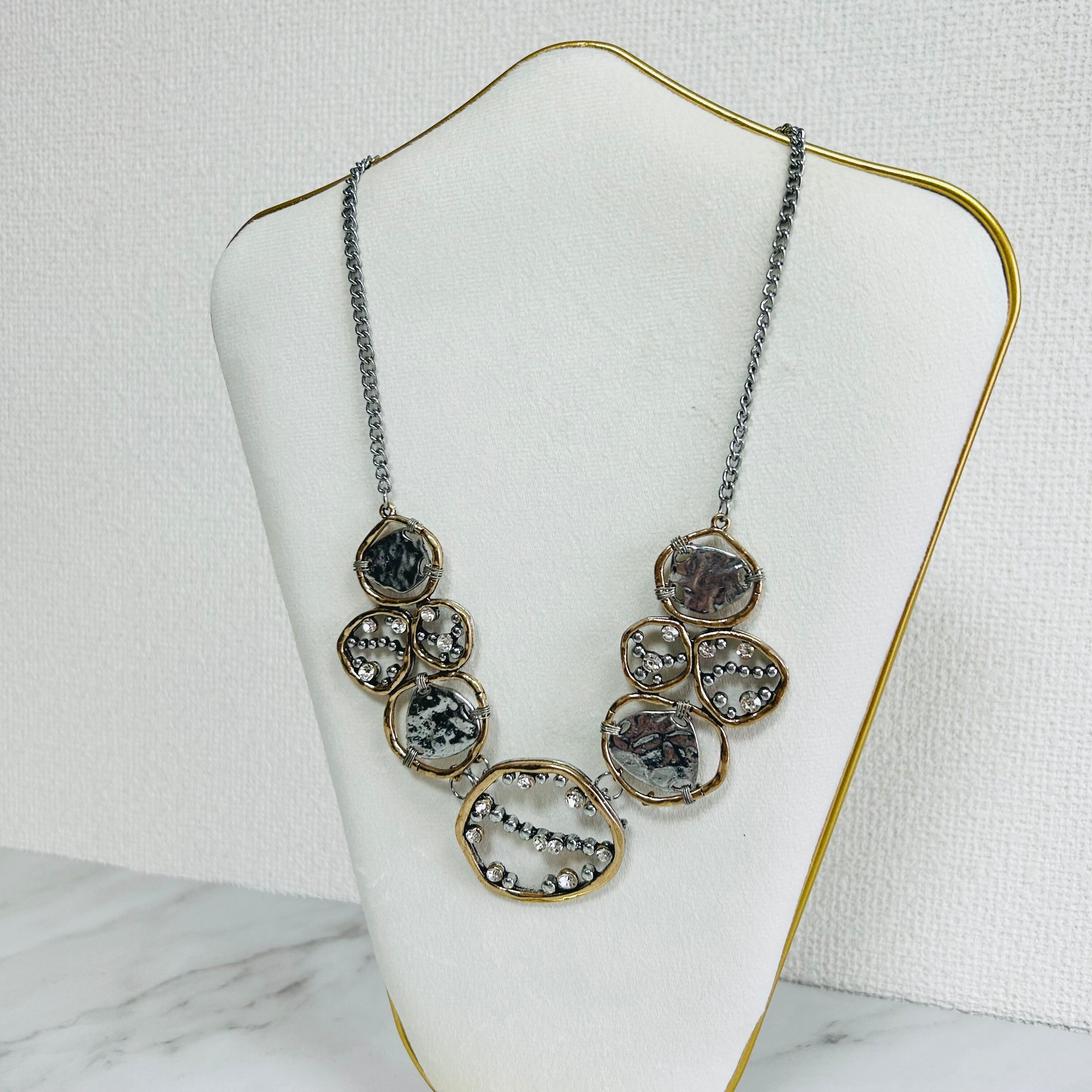 クリスタル、ゴールド、シルバーカラーのネックレスです。