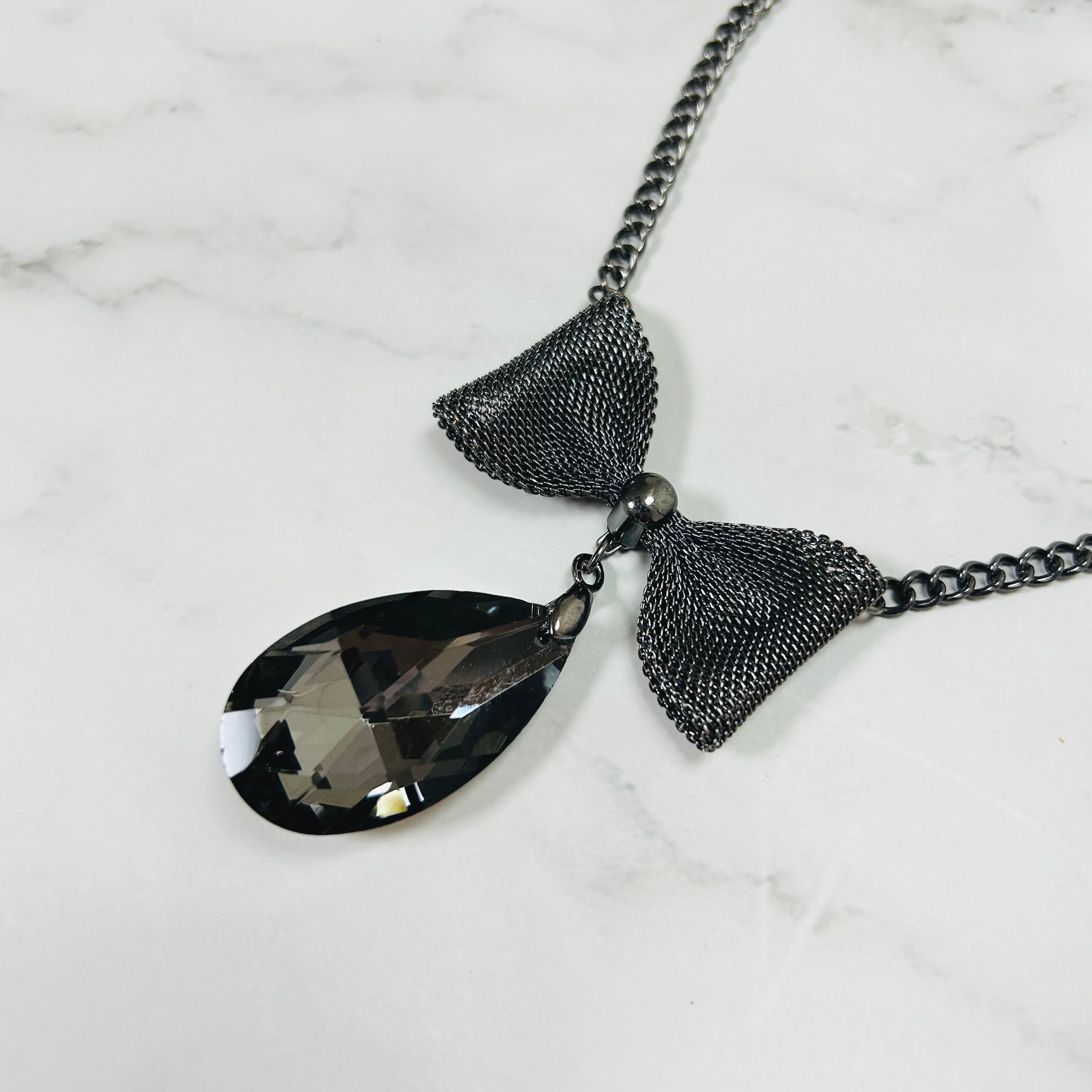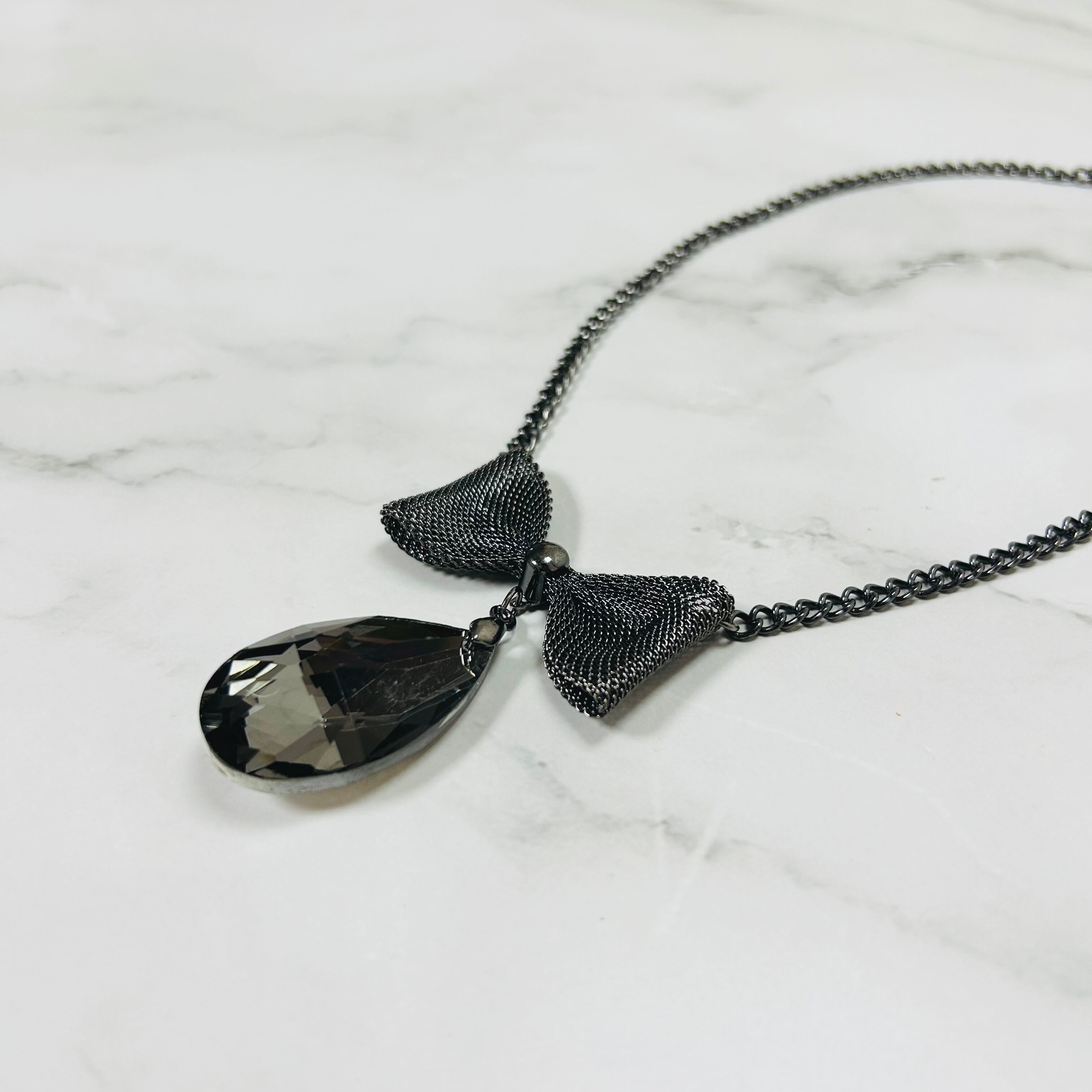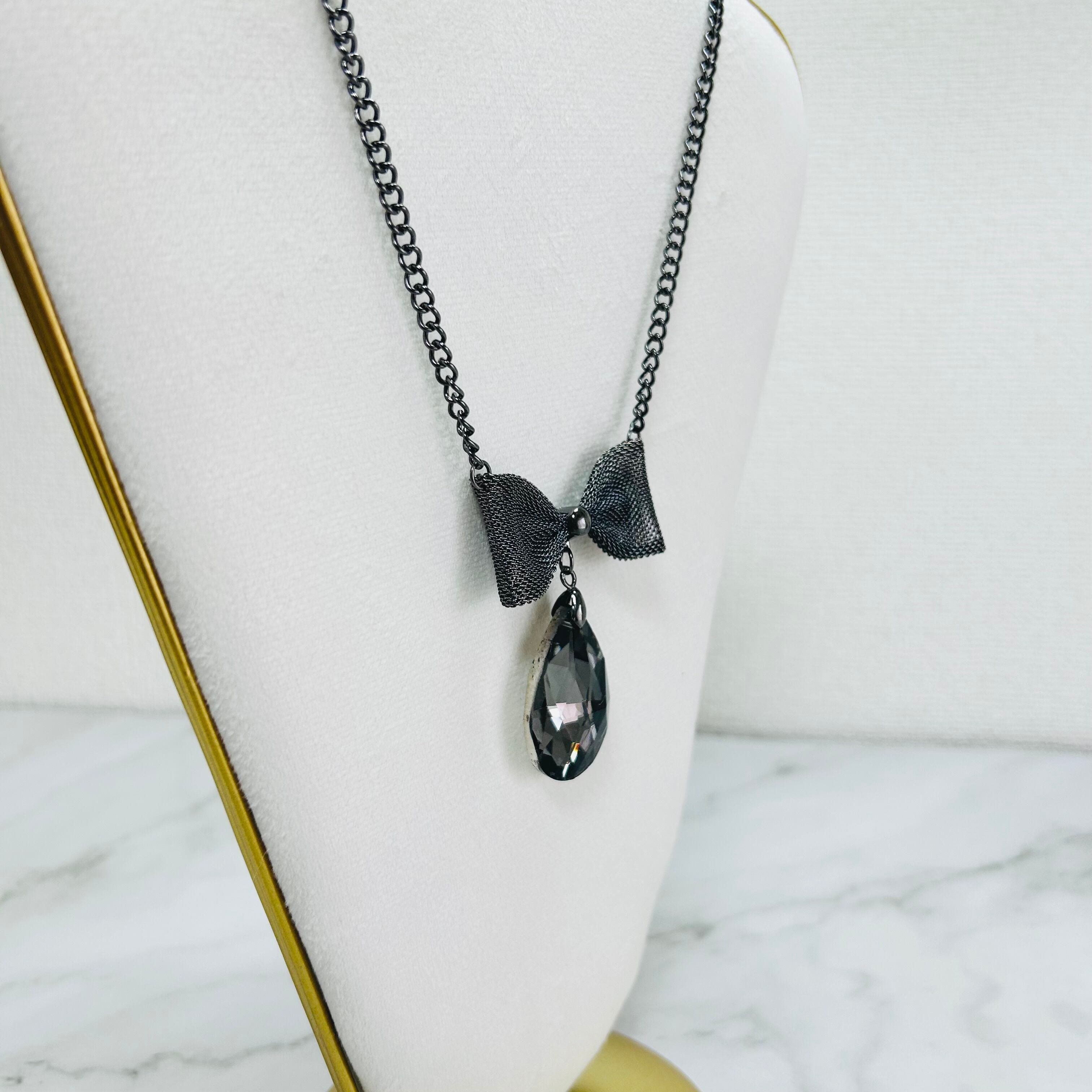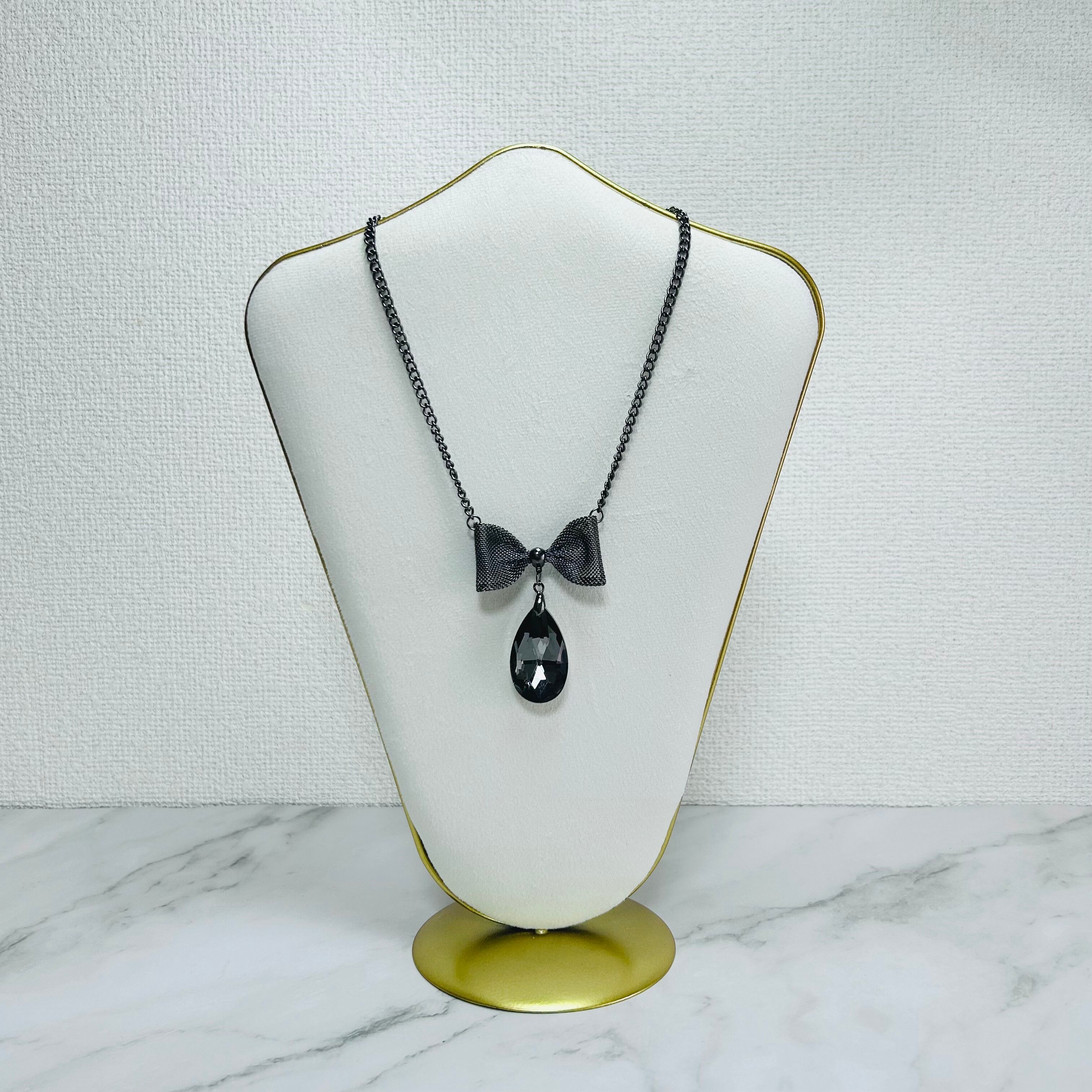 透明感と深みのあるグレーのラインストーンに、リボンのモチーフをプラスしたキュートなデザインです。