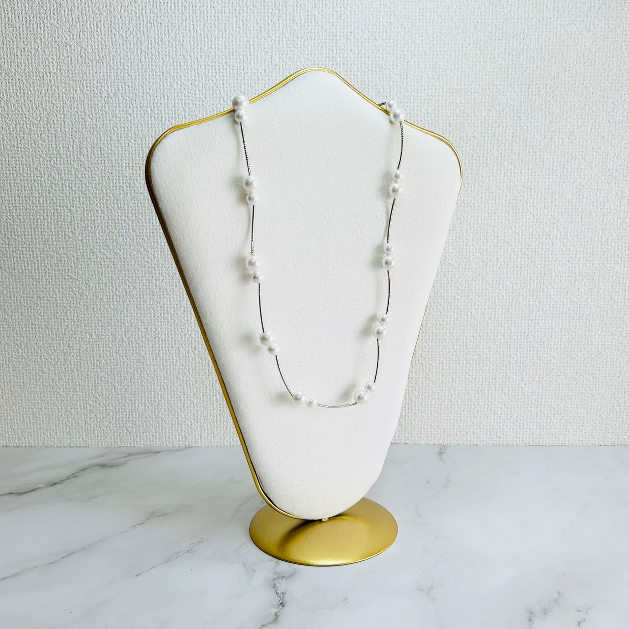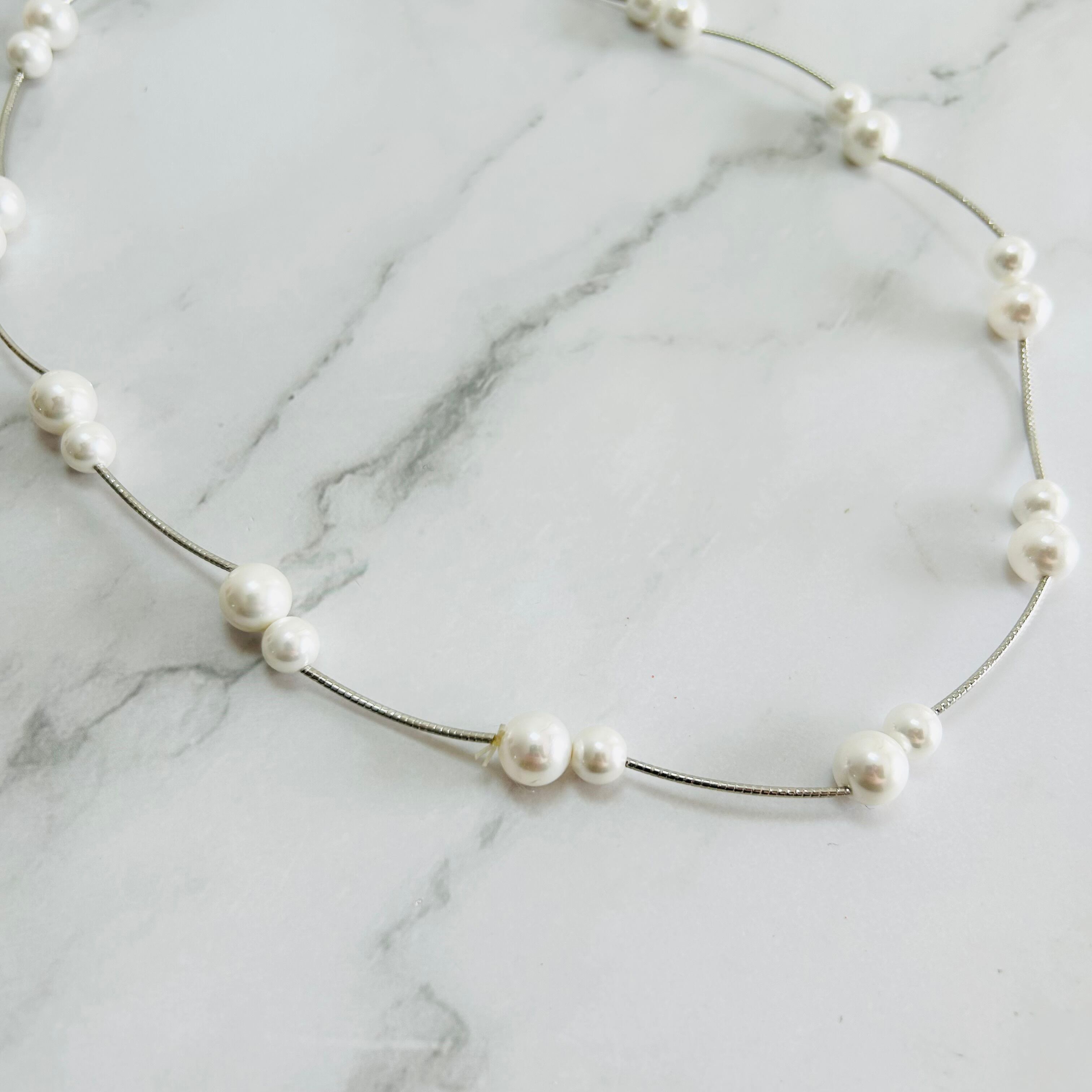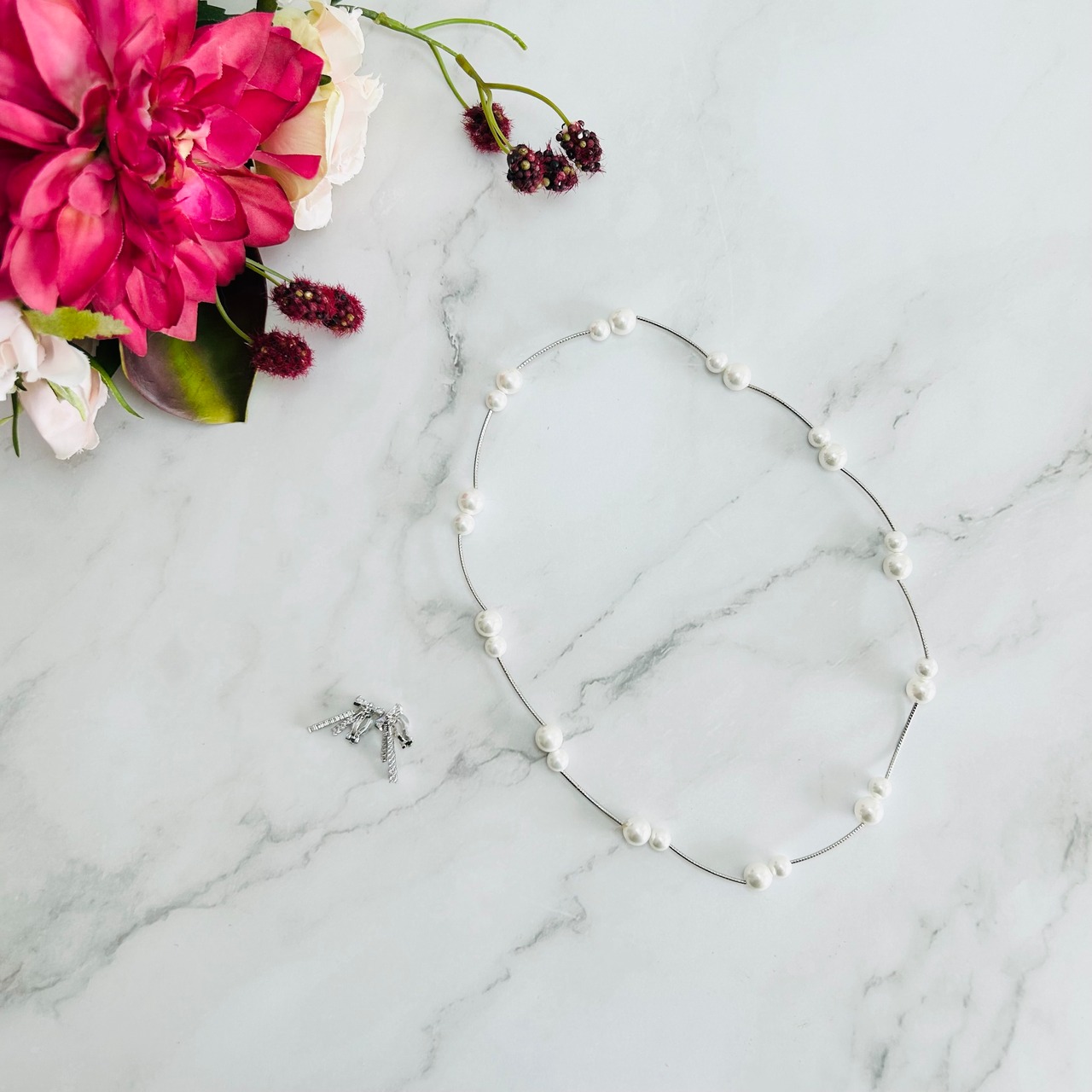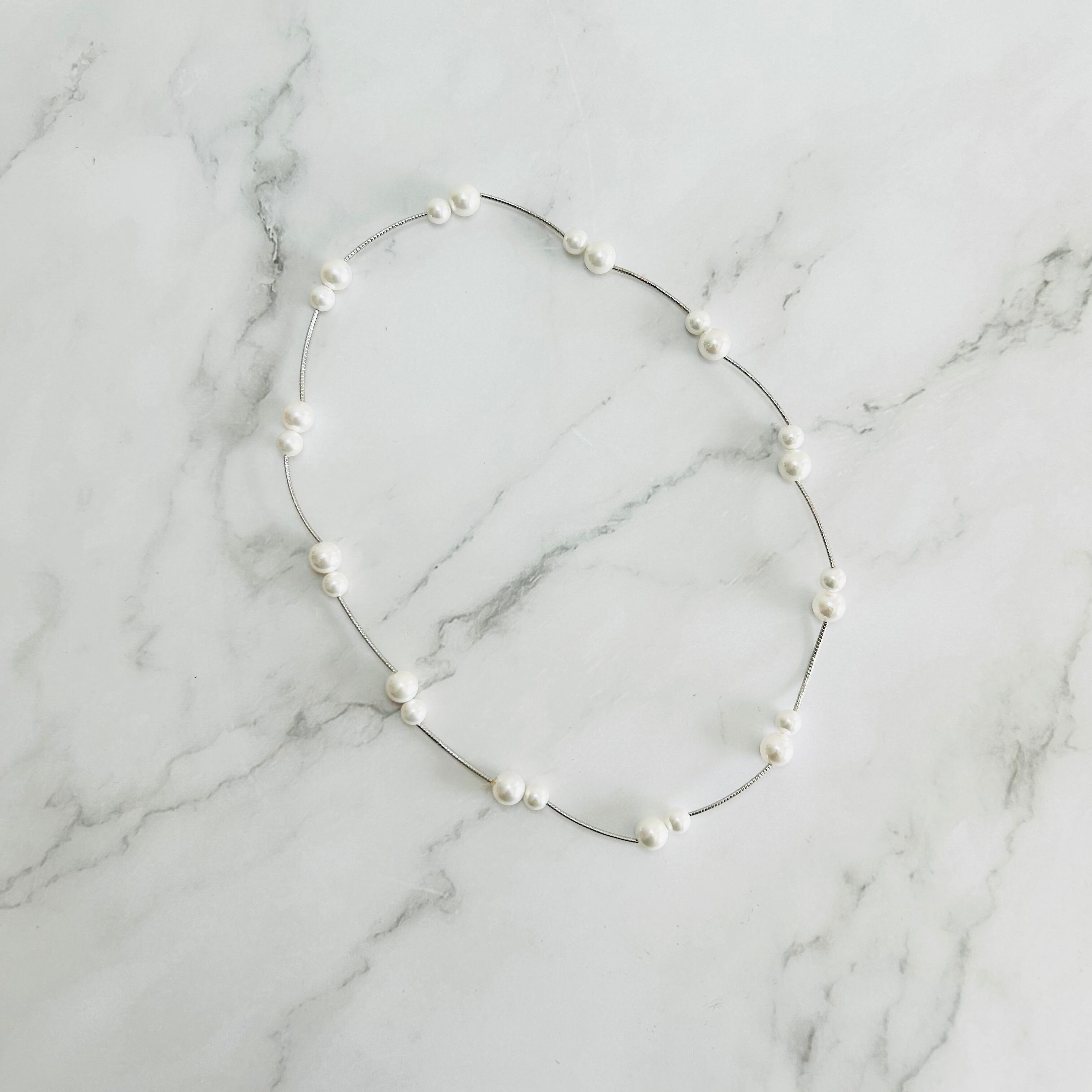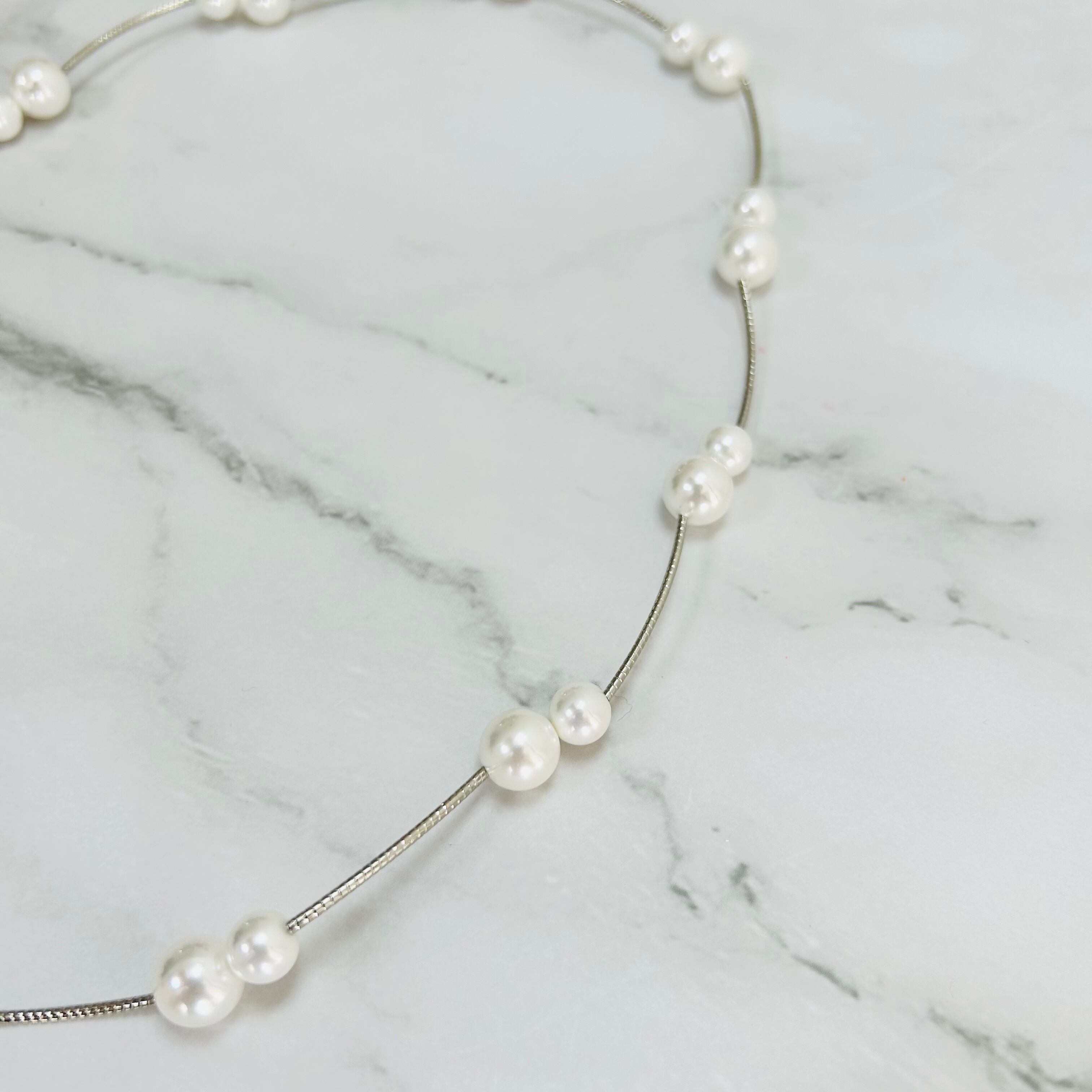 伸縮性のあるシリコン素材にシルバーパーツと大小のパールを取り付けた軽やかでシンプルなデザインです。