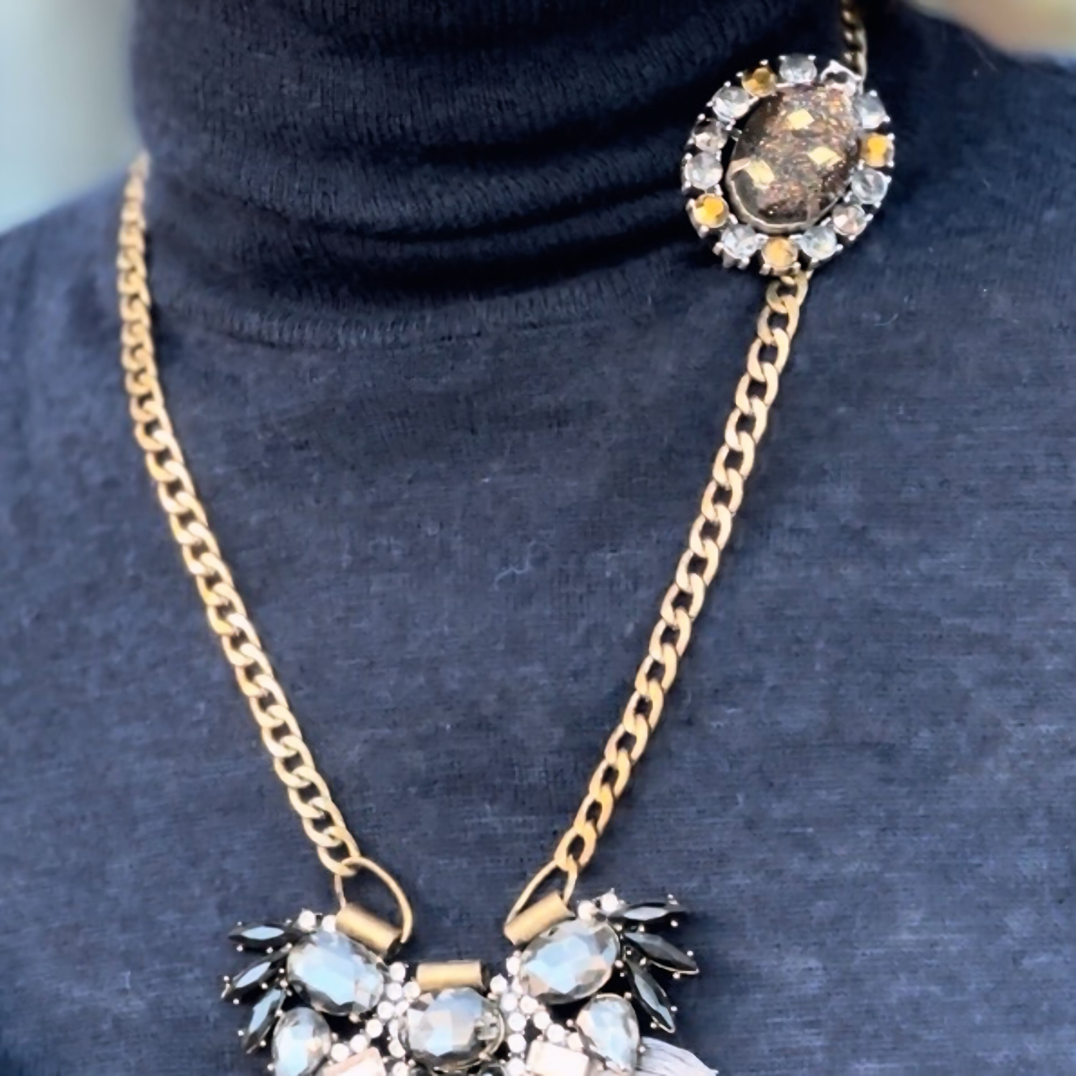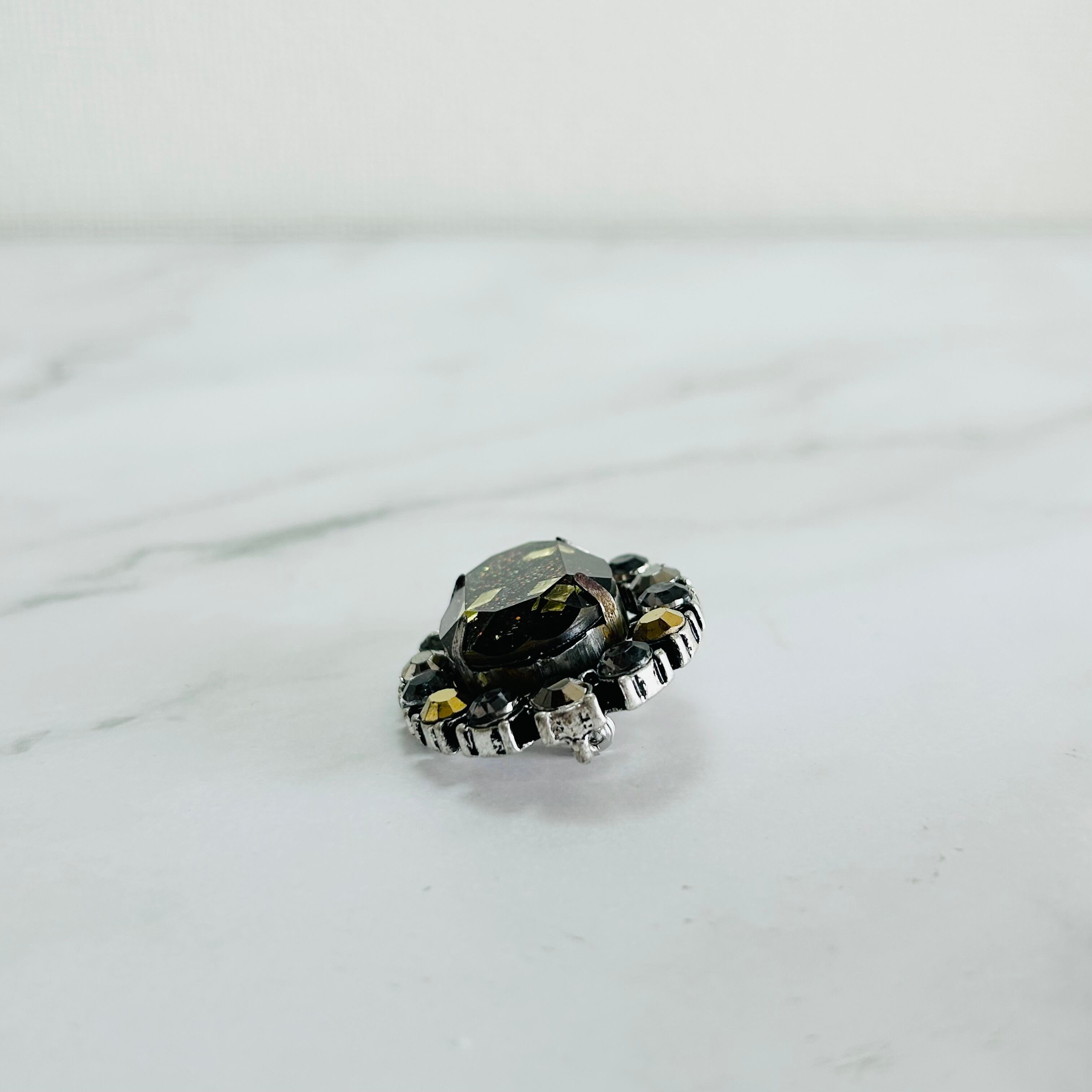 大胆に煌めくユニークなアクリルパーツを使用し、メタリック調のビジューをプラスしたおしゃれなモチーフをアンティークシルバーと組み合わせたデザインです。