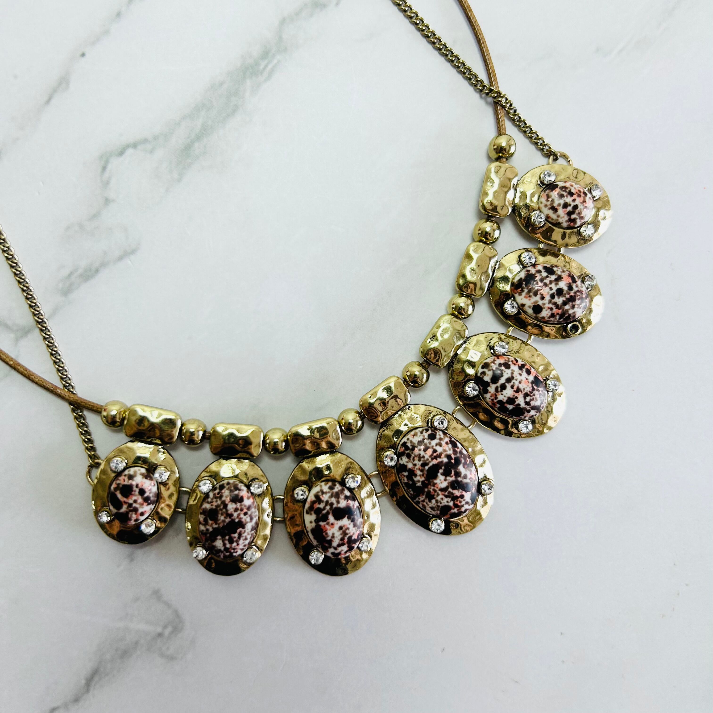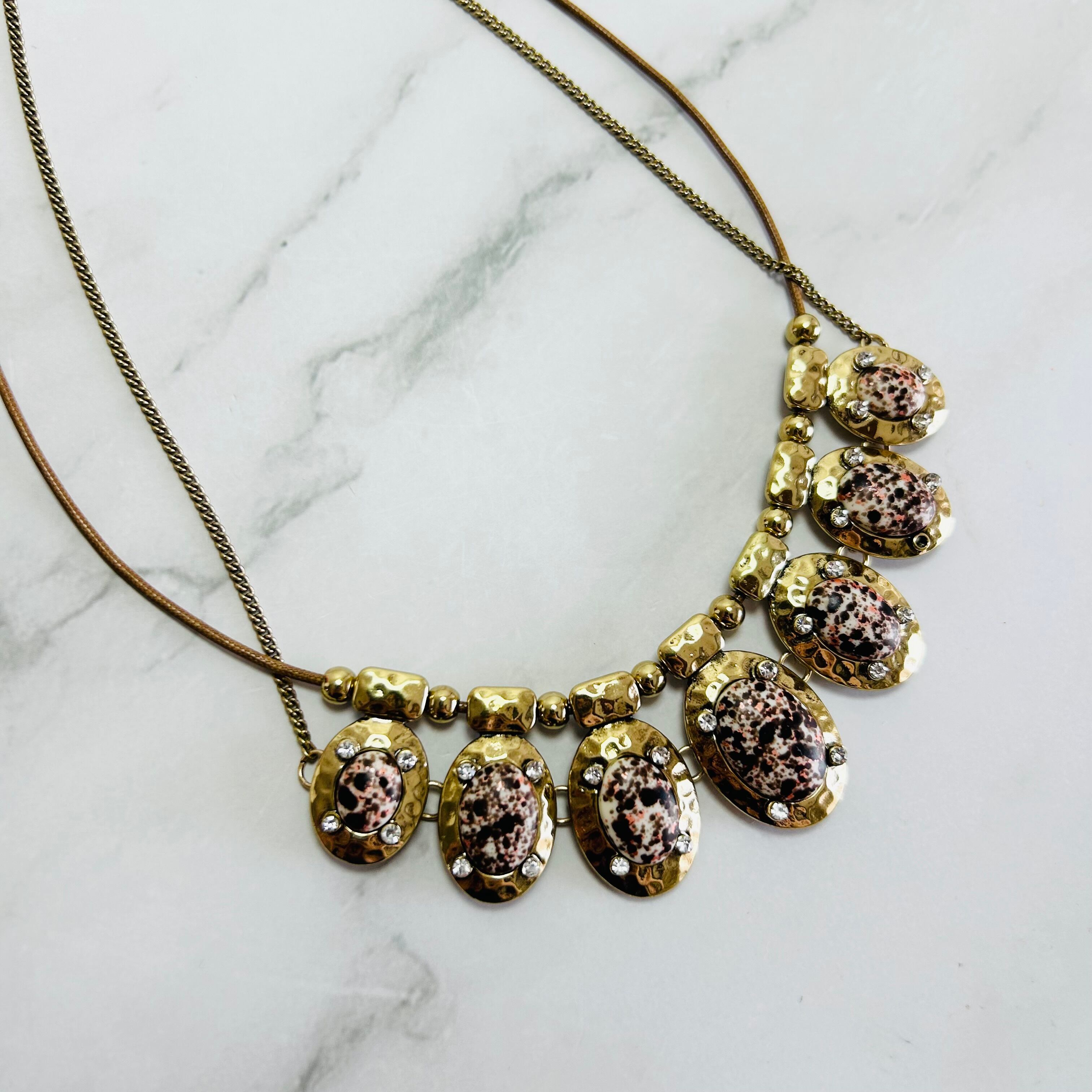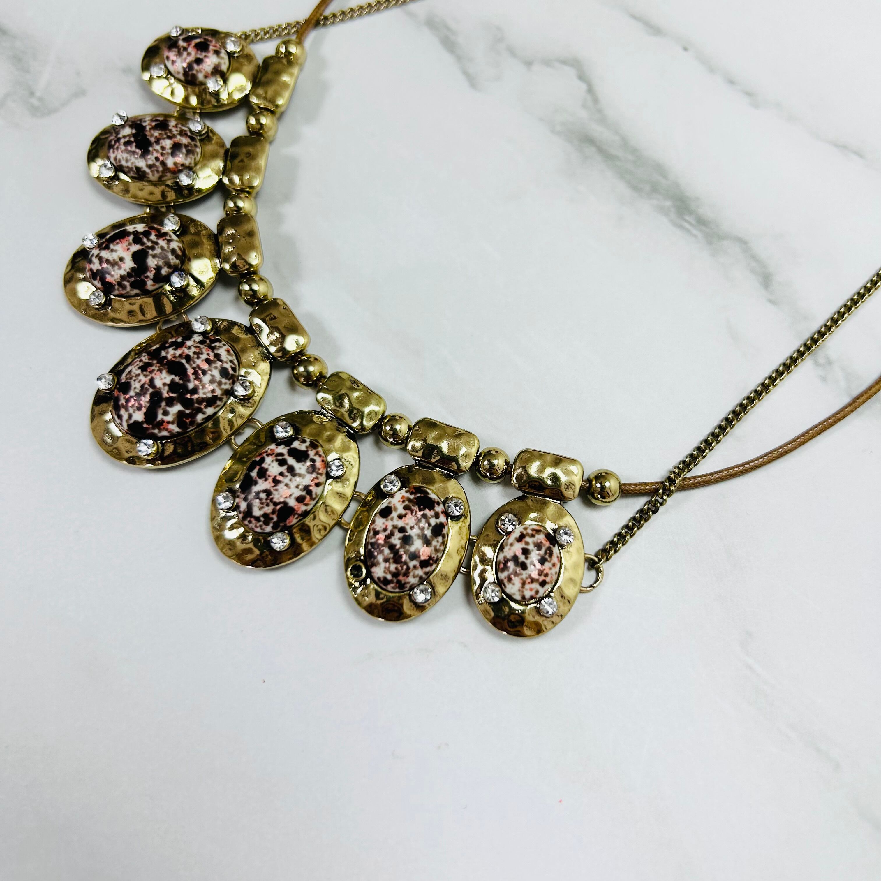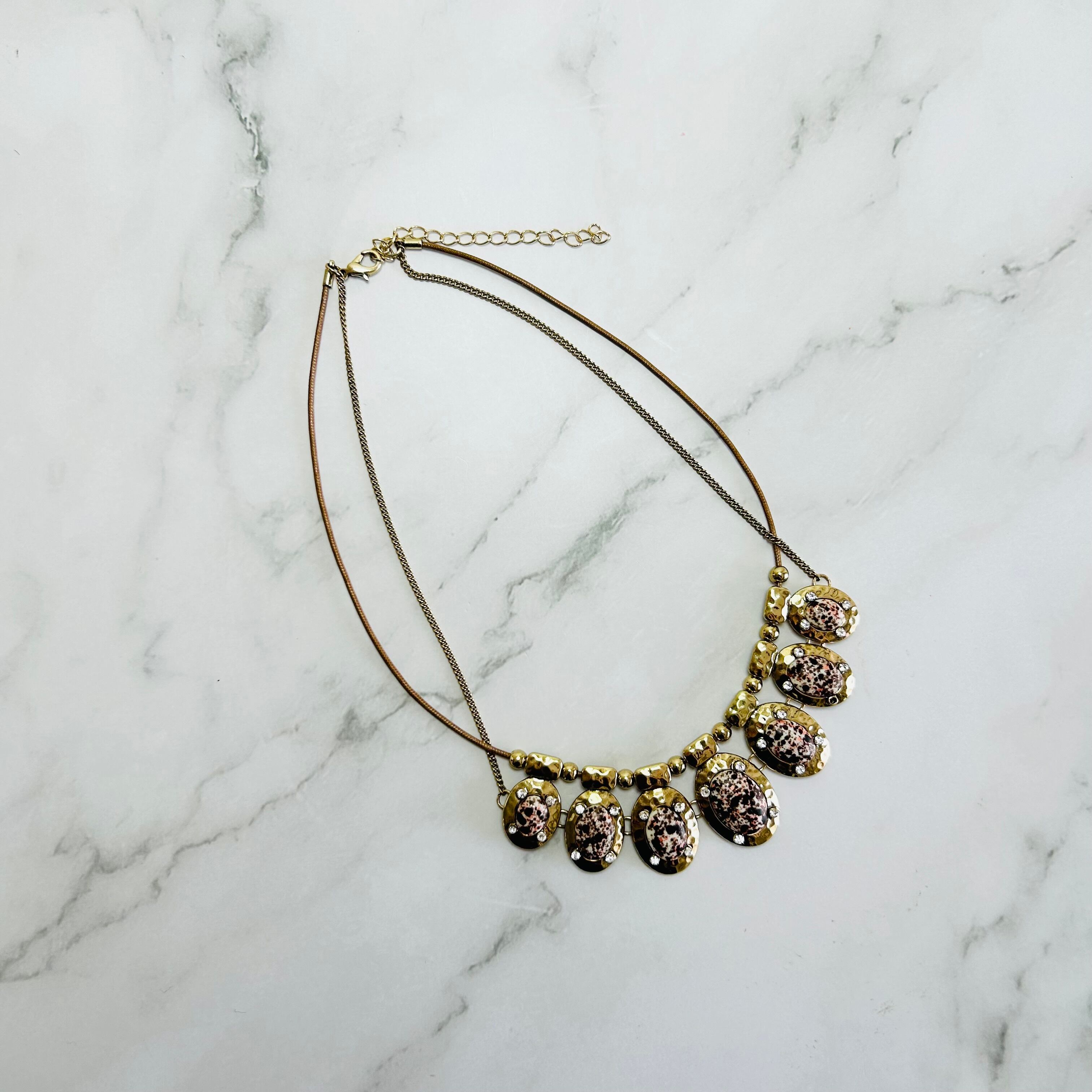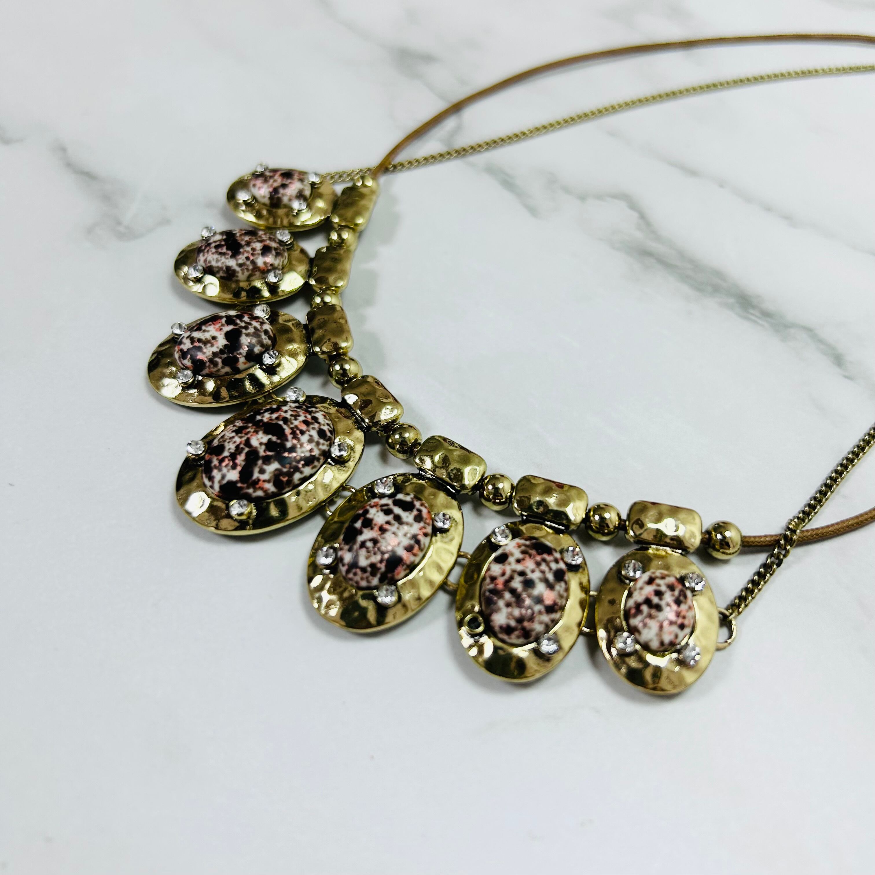 楕円形のゴールドトップにまだらな模様が美しいパーツを飾り、クリスタルビジューをあしらいチェーンとコードに組み合わせたデザインです。