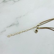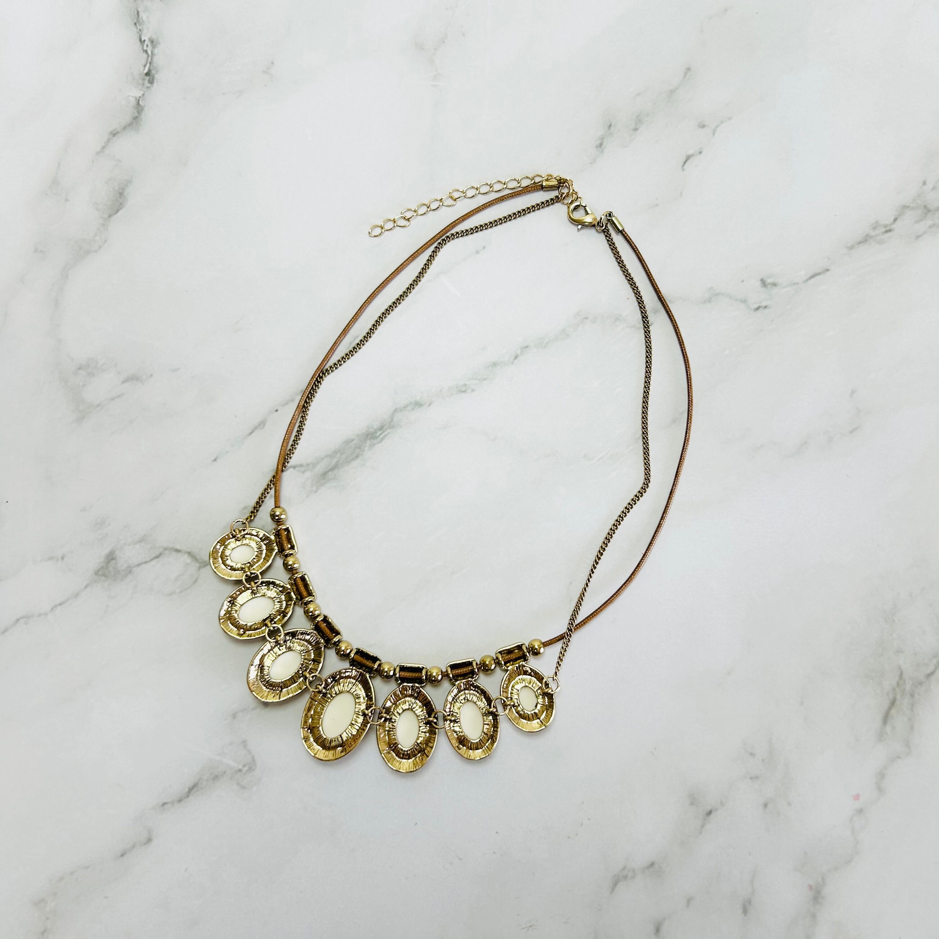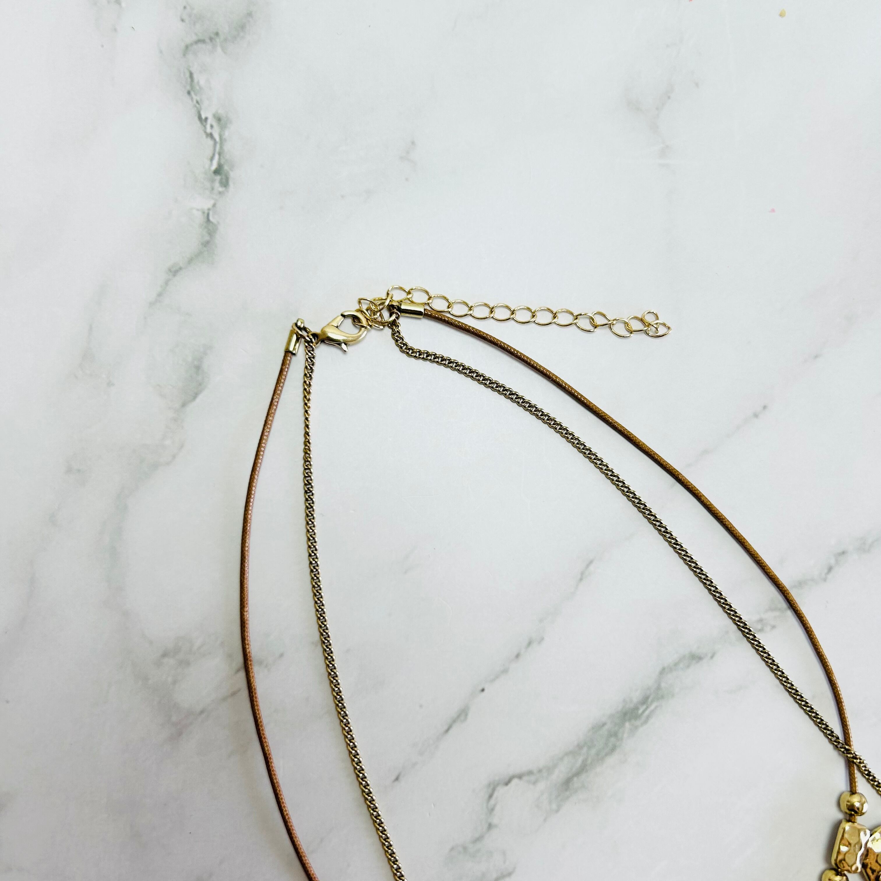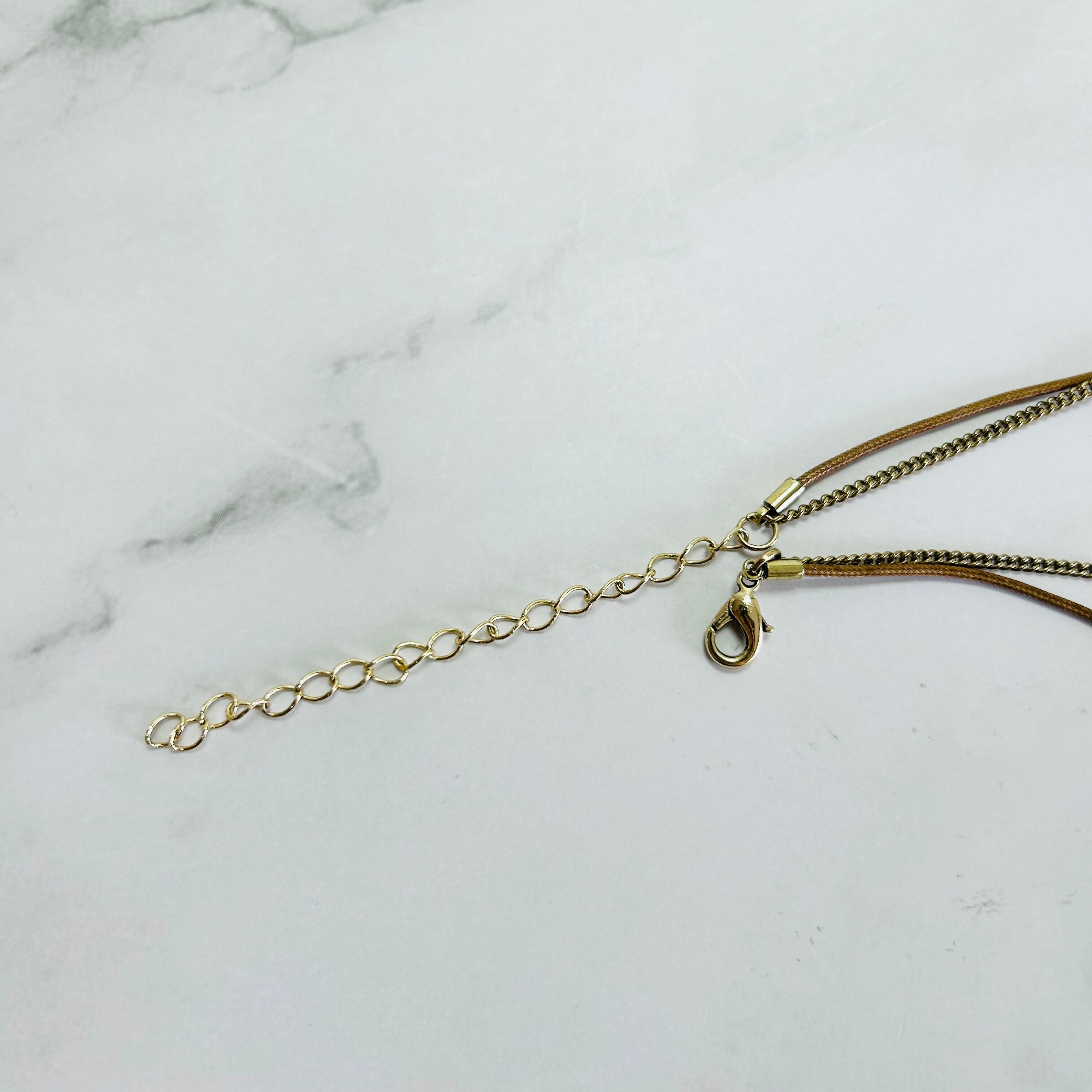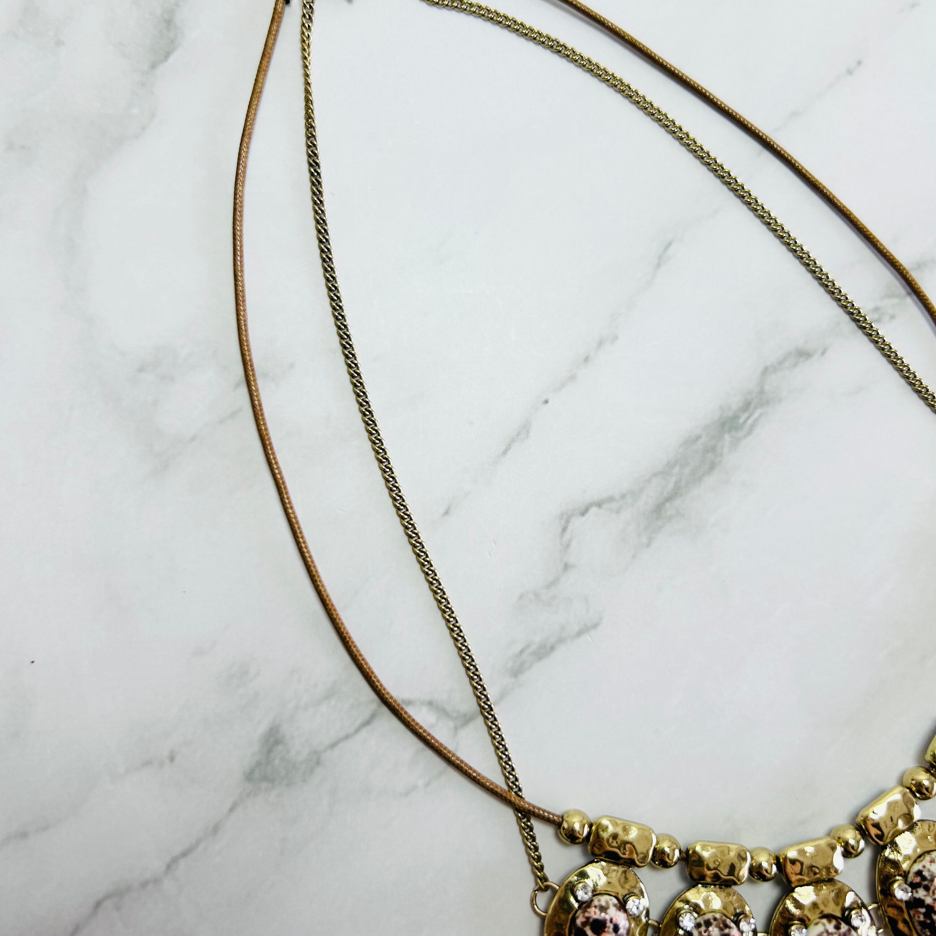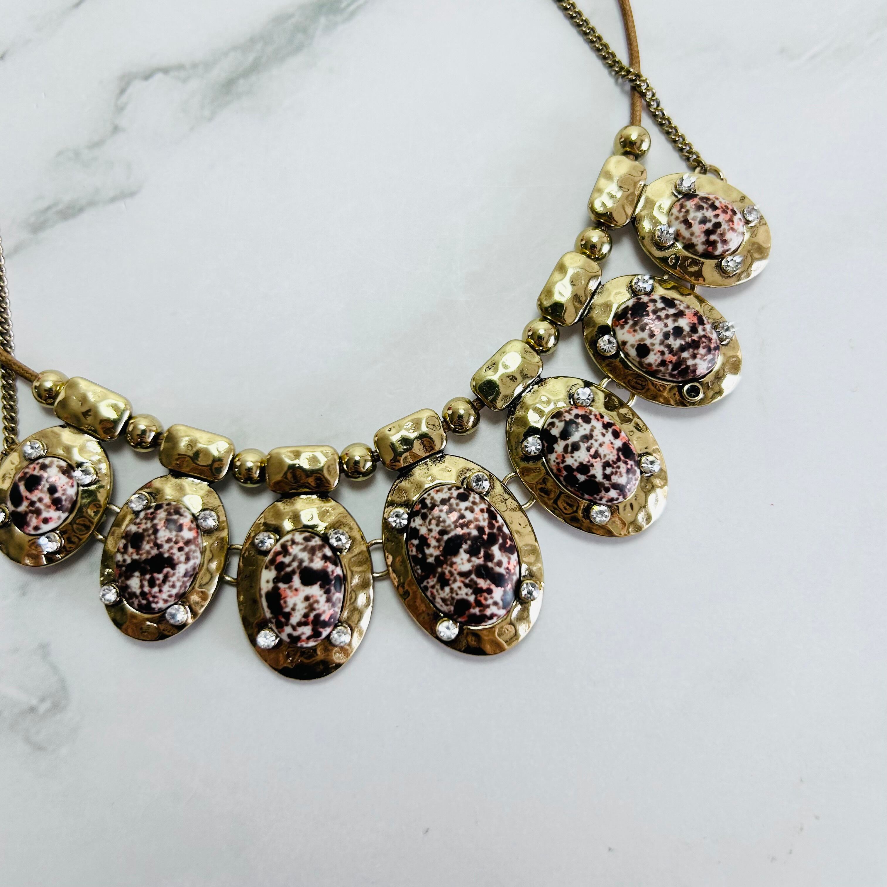楕円形のゴールドトップにまだらな模様が美しいパーツを飾り、クリスタルビジューをあしらいチェーンとコードに組み合わせたデザインです。