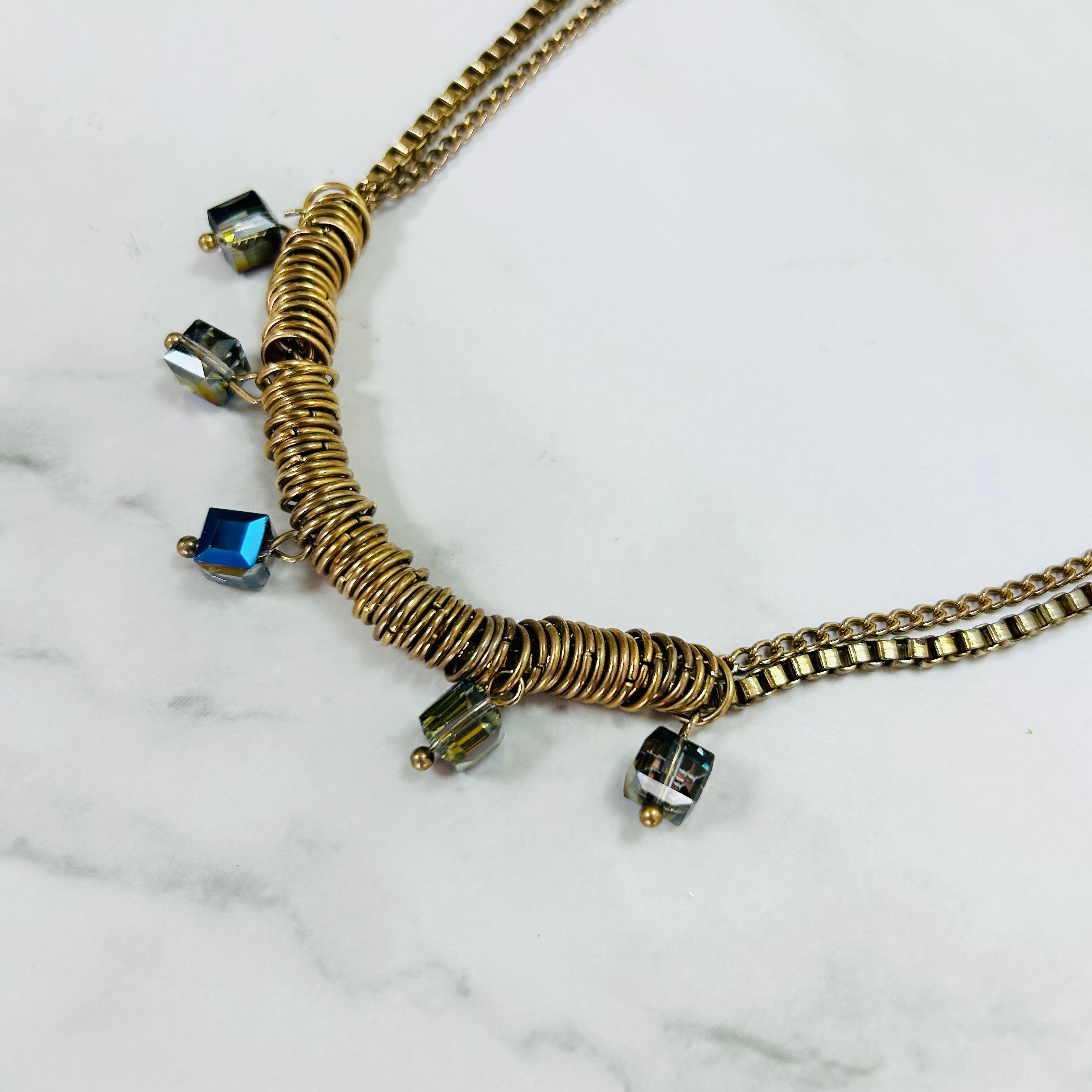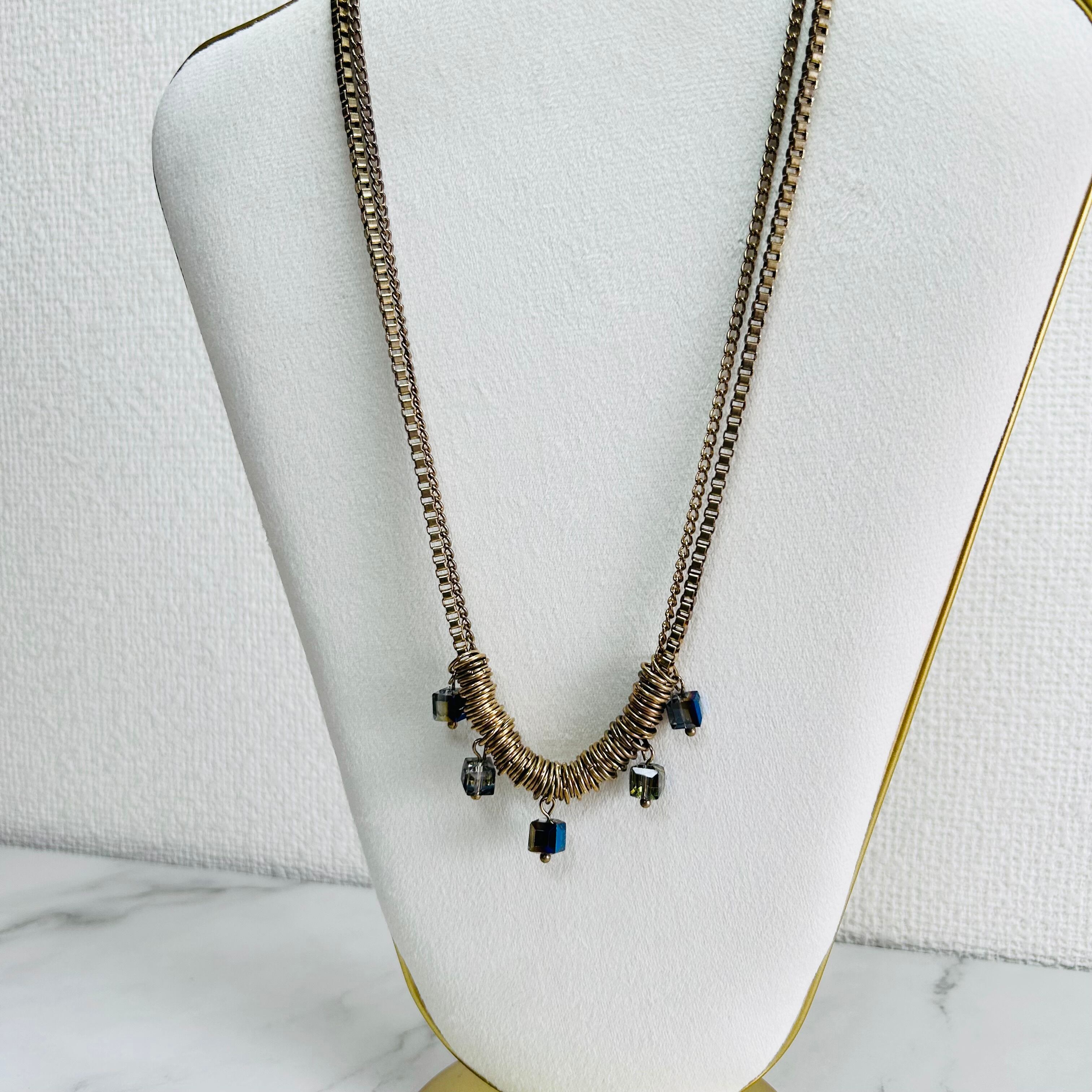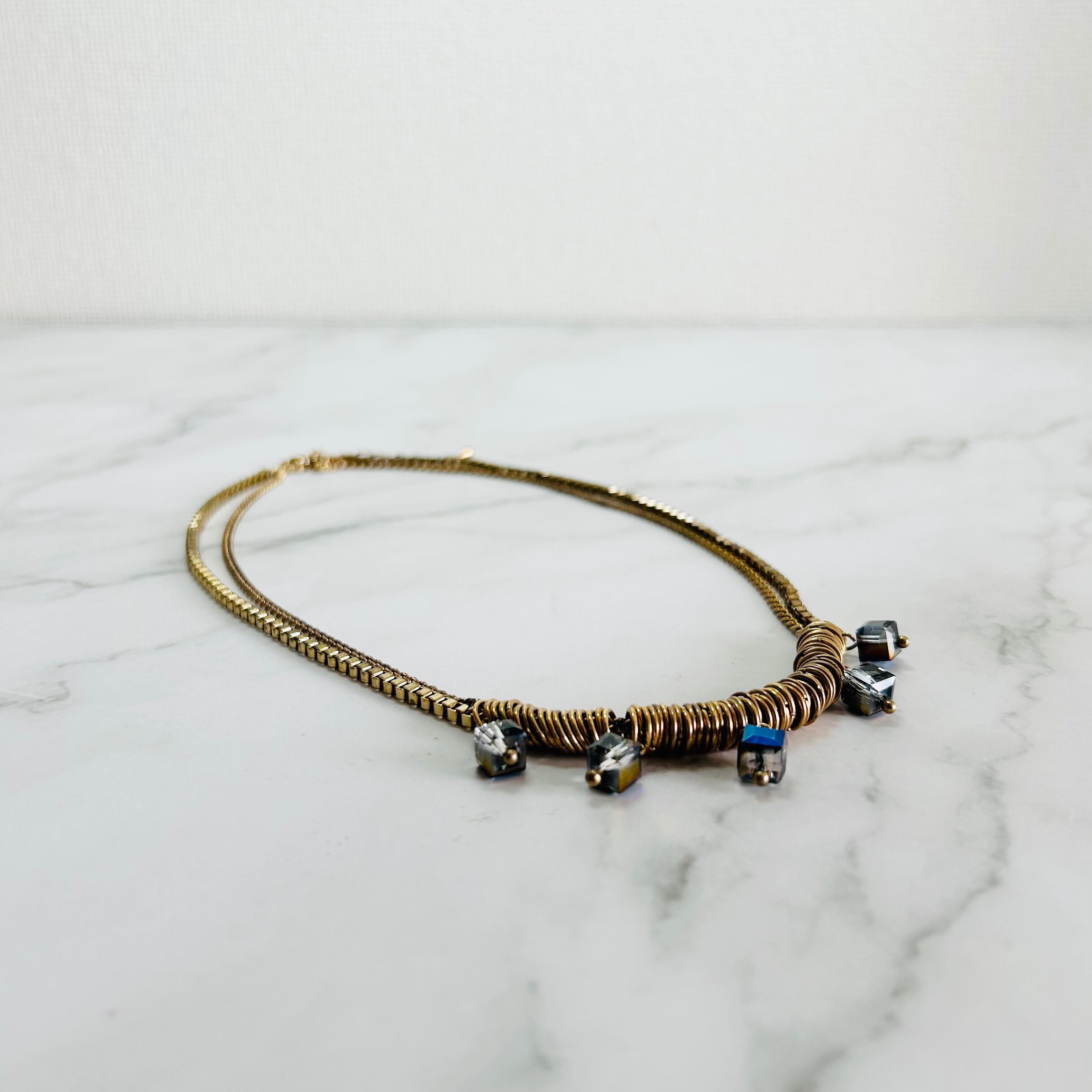 さまざまな色味のオーロラ調に輝くキューブ型のクリスタルパーツをゴールドの2連チェーンにプラスしたデザインです。