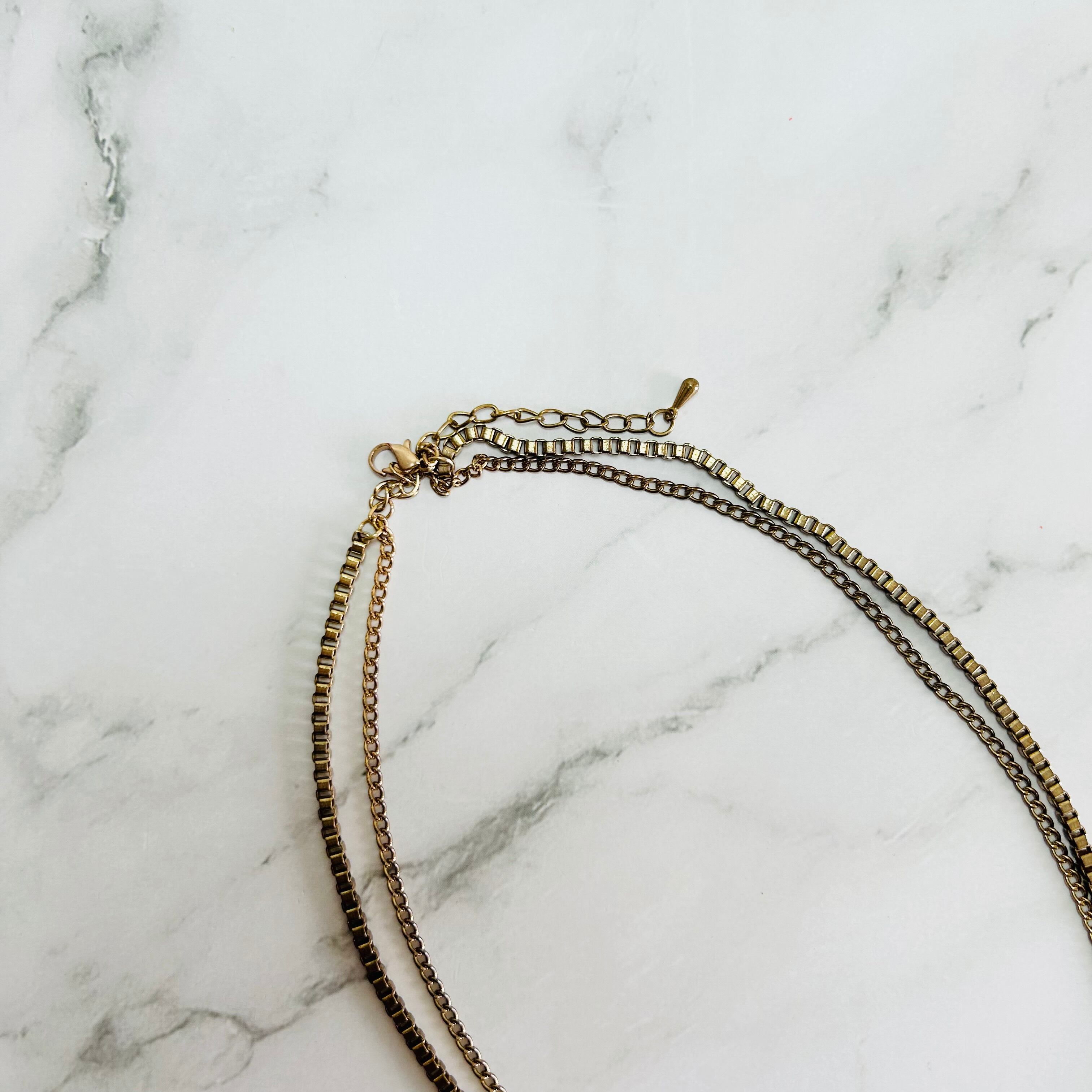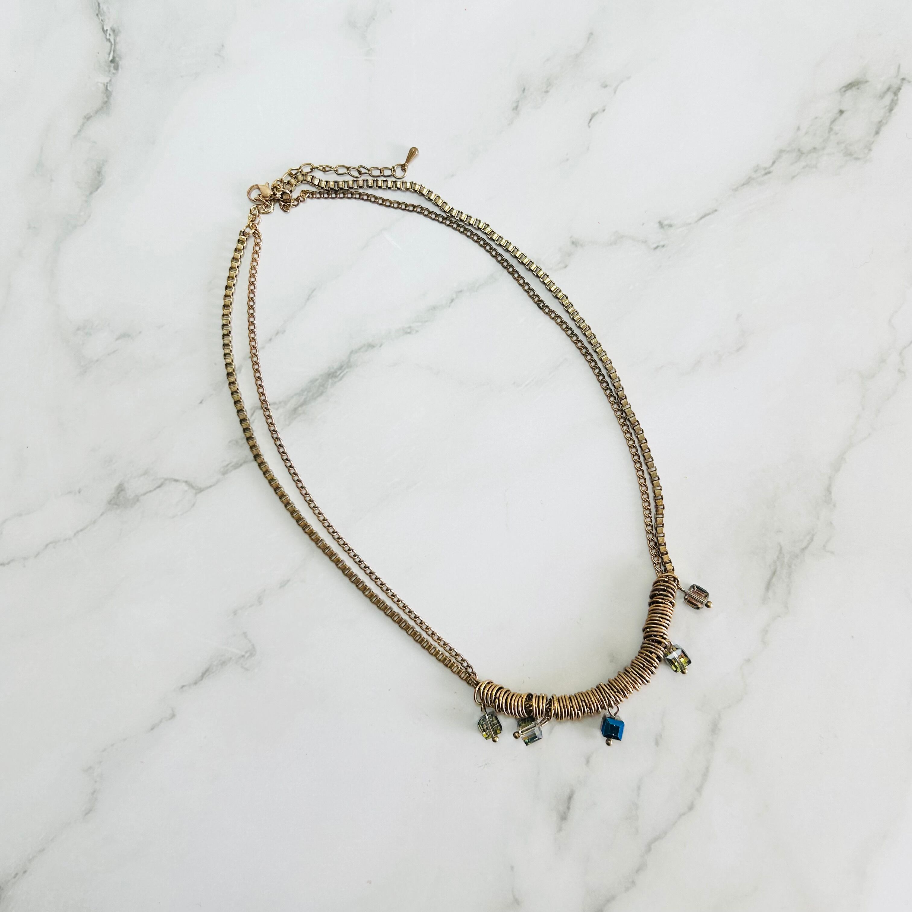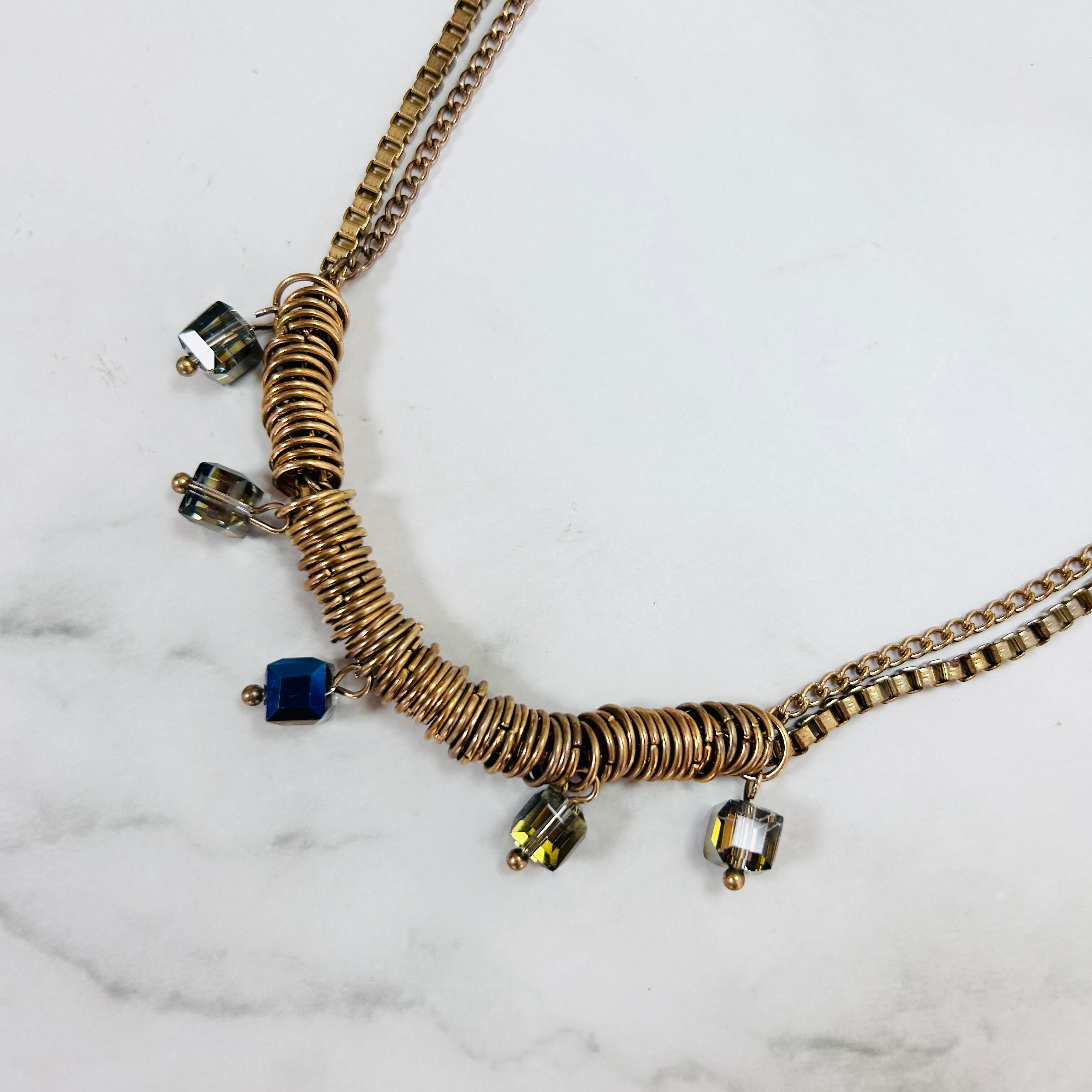 さまざまな色味のオーロラ調に輝くキューブ型のクリスタルパーツをゴールドの2連チェーンにプラスしたデザインです。
