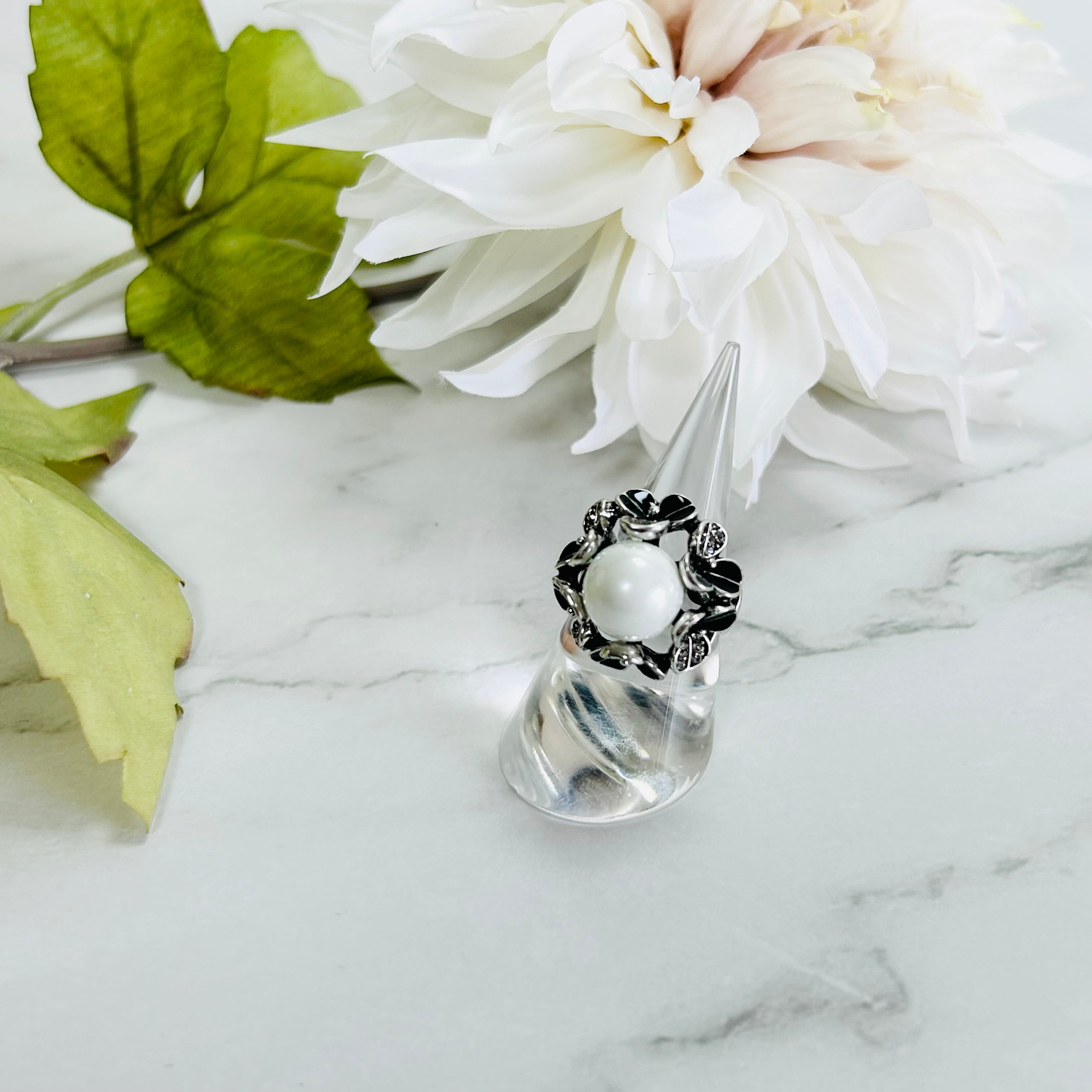 ふっくらと存在感のあるパールに燻したシルバーのフラワーモチーフが連なるリングです。
