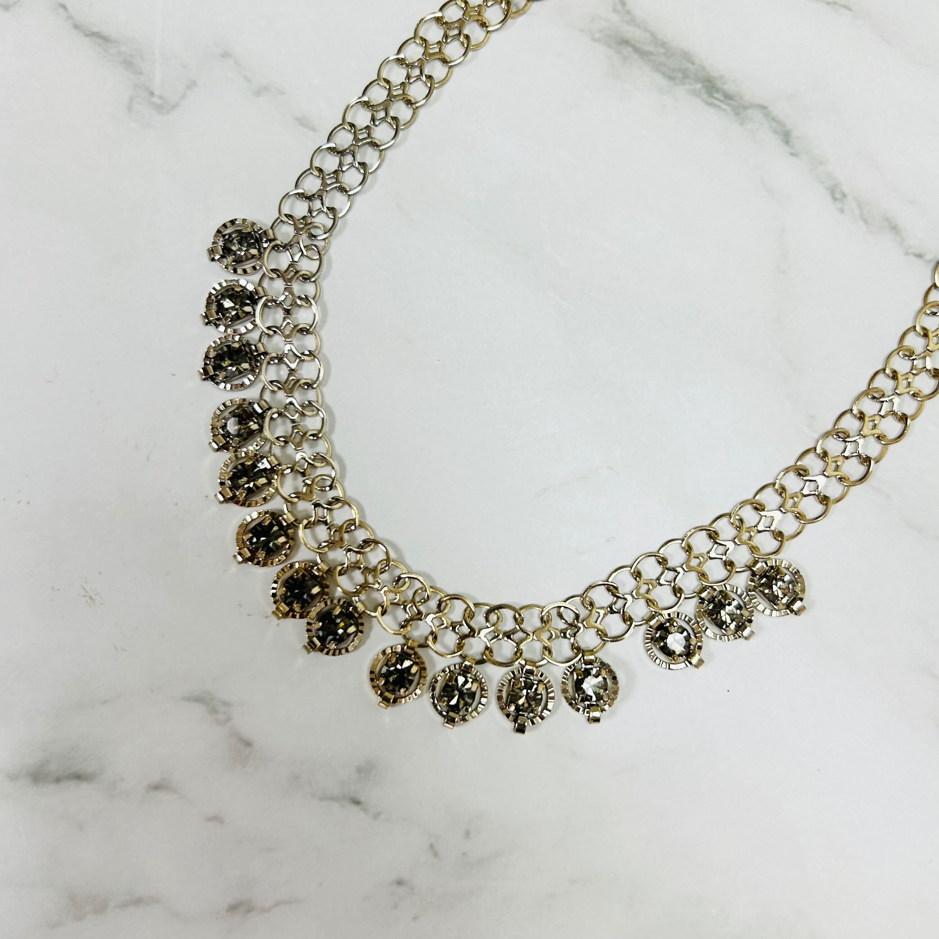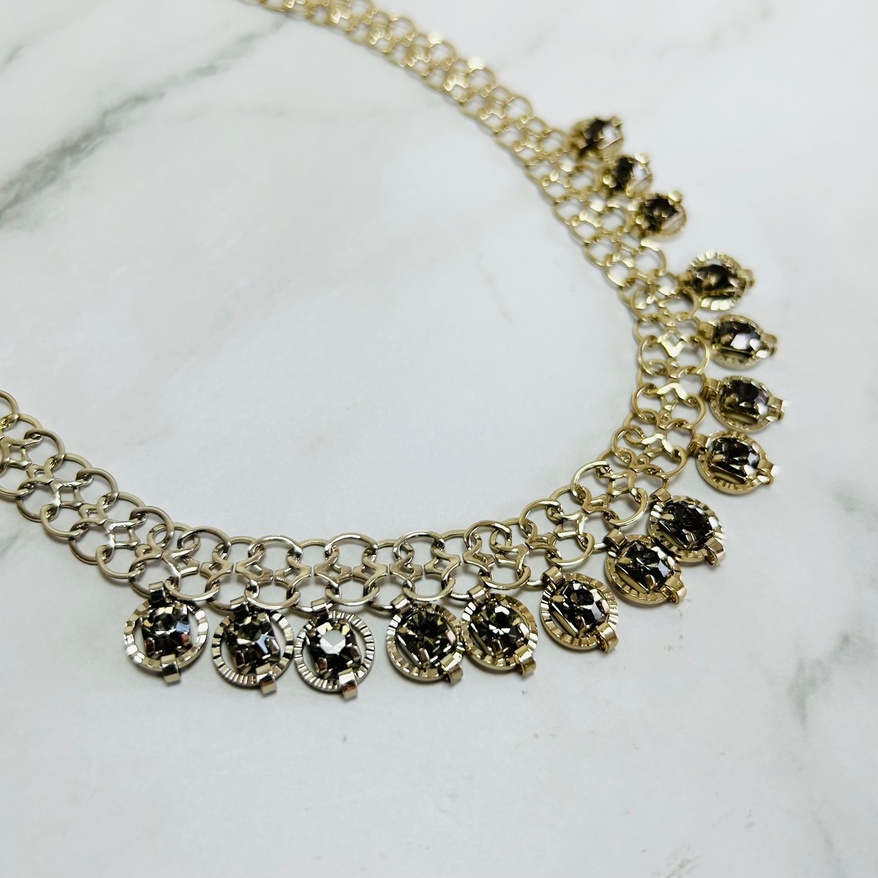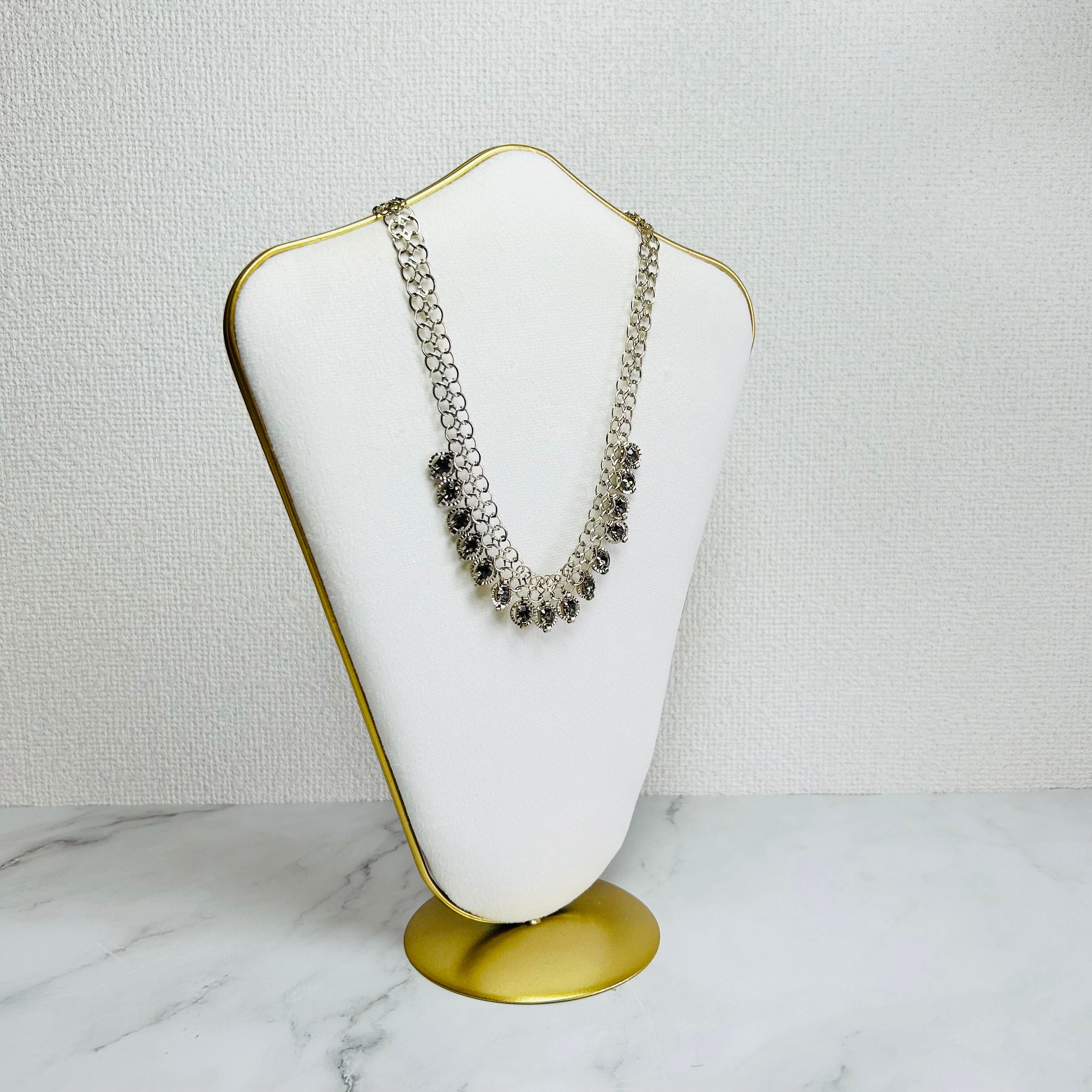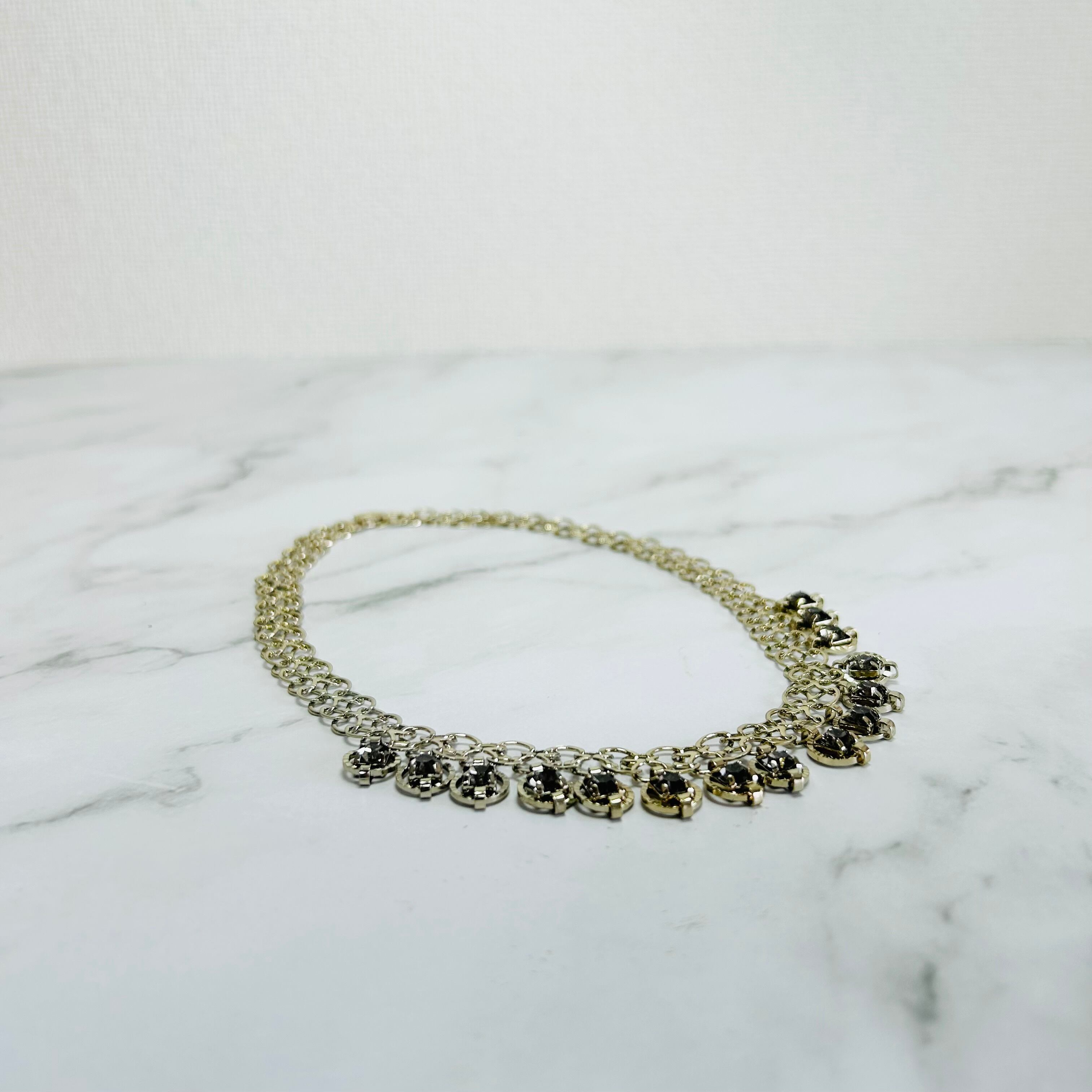 上品なブラウン系のクリスタルビジューを透かしデザインのチェーンにプラスしたエレガントなデザインです。