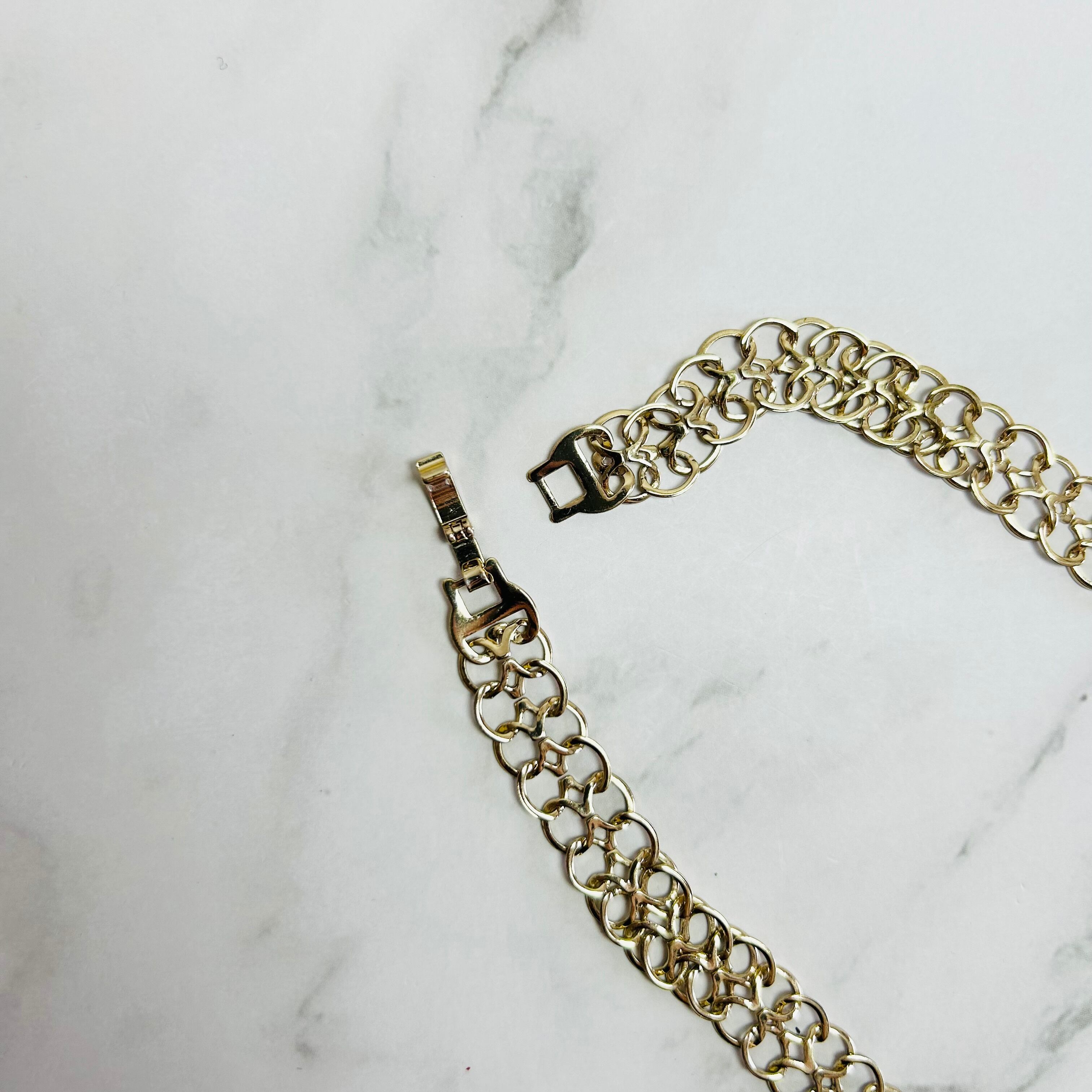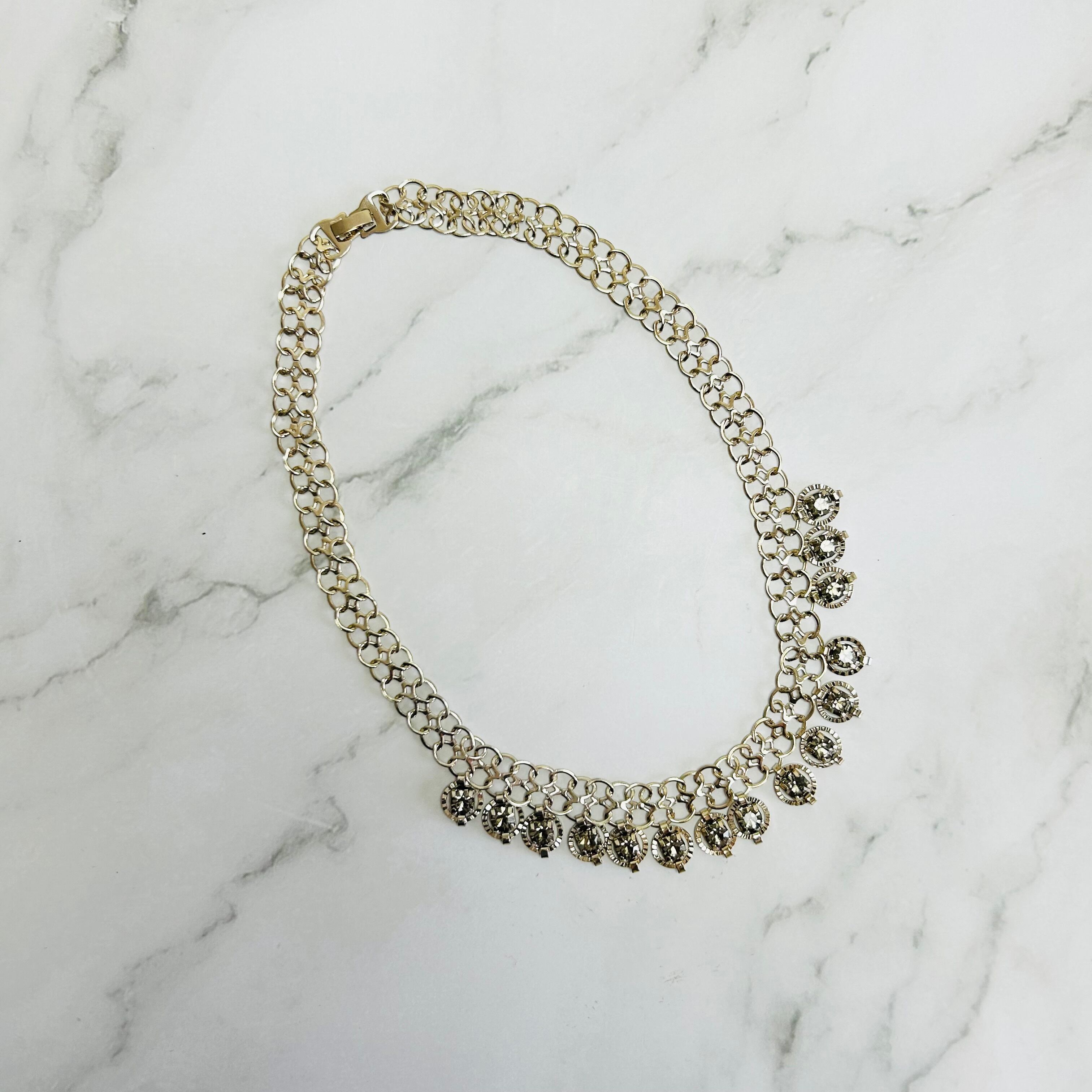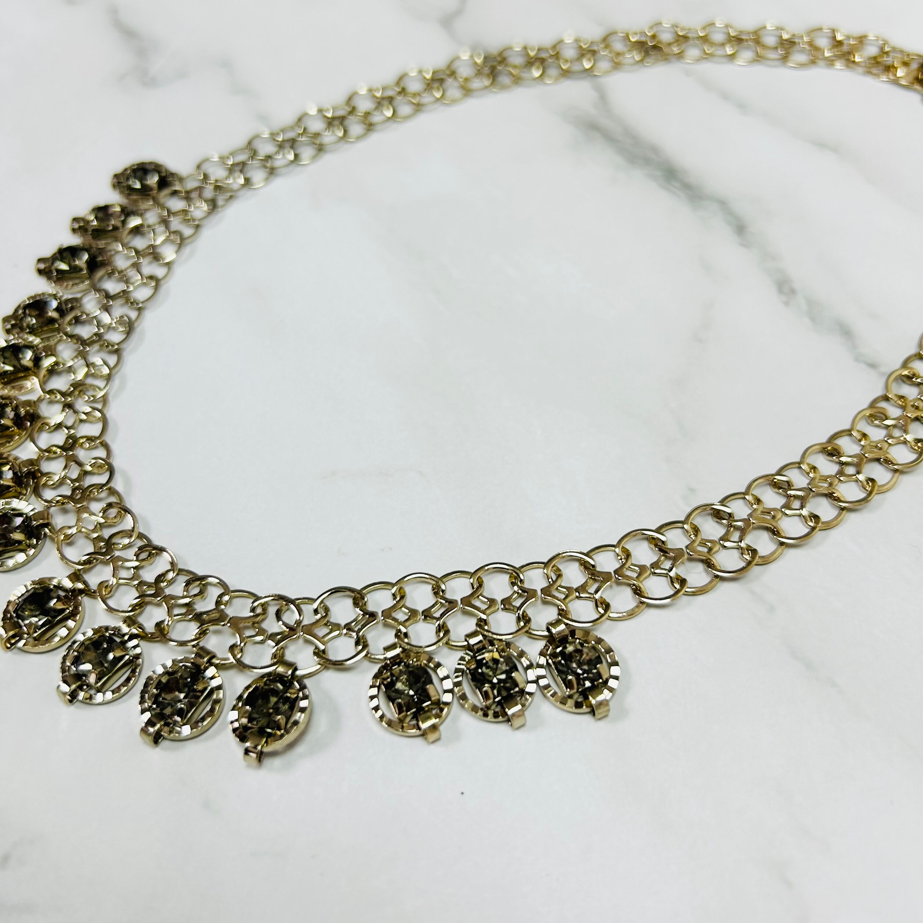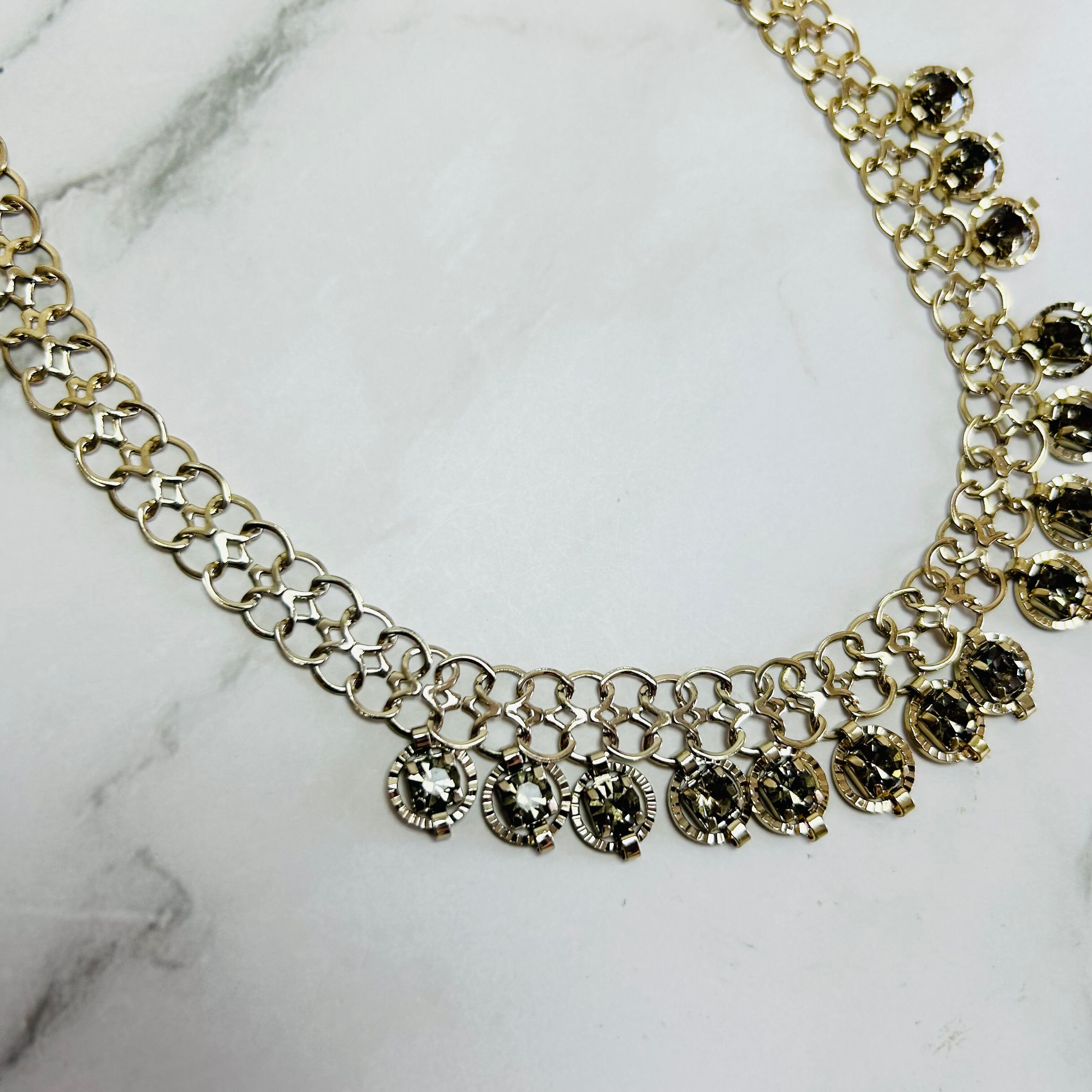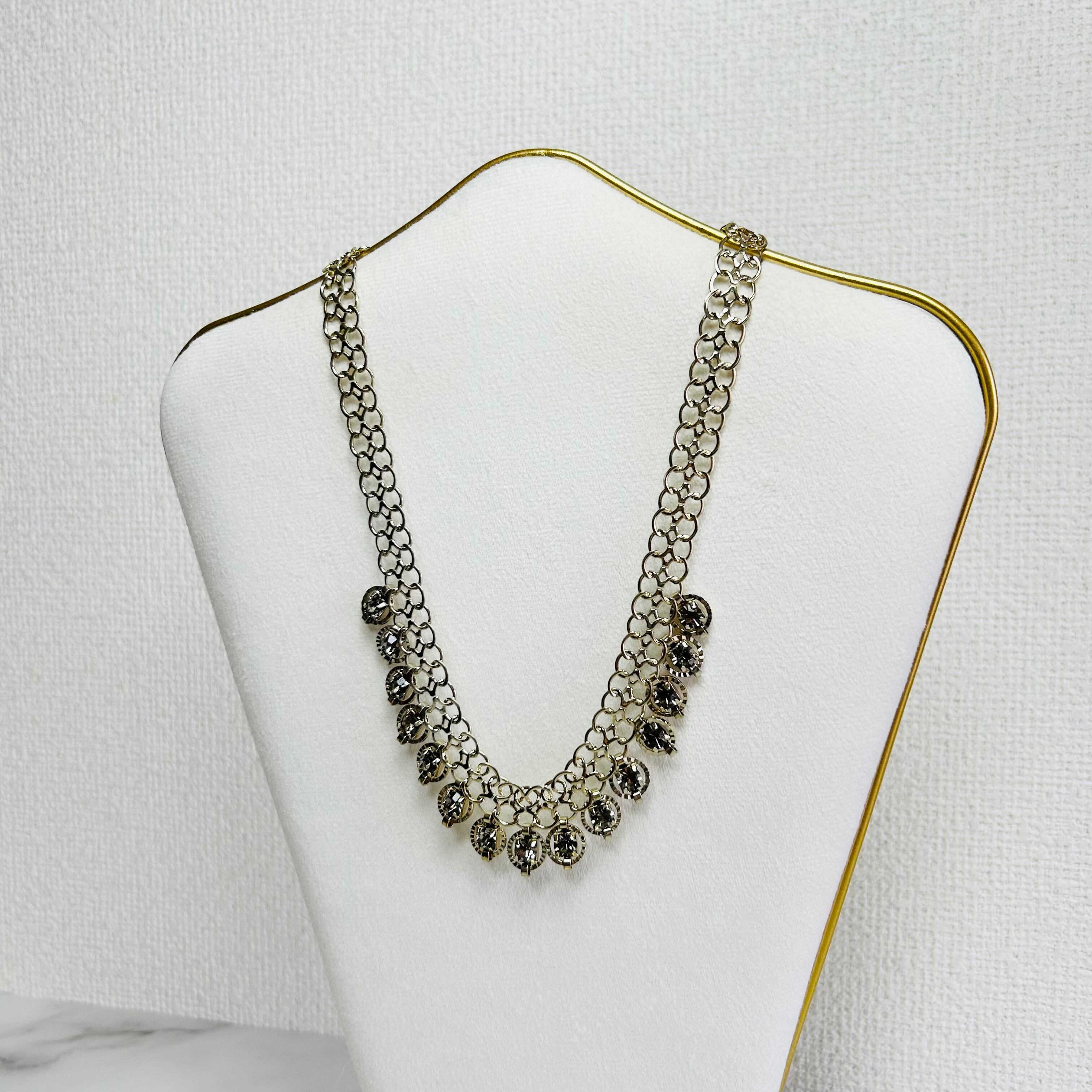 上品なブラウン系のクリスタルビジューを透かしデザインのチェーンにプラスしたエレガントなデザインです。