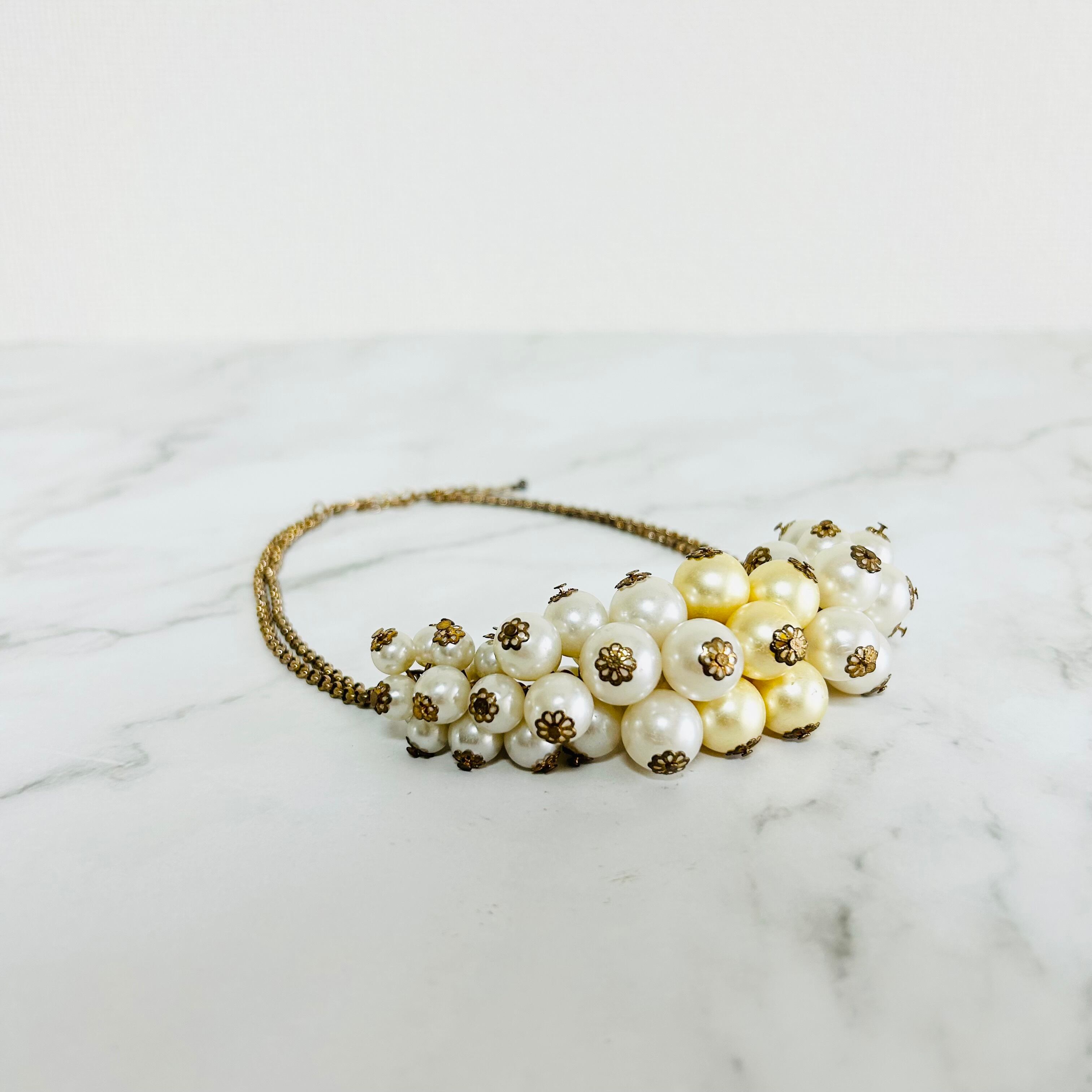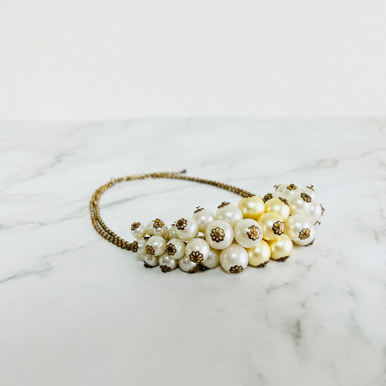 大小さまざまなサイズのアクセサリーパールをボリューミーに組み合わせ華やかなデザインです。