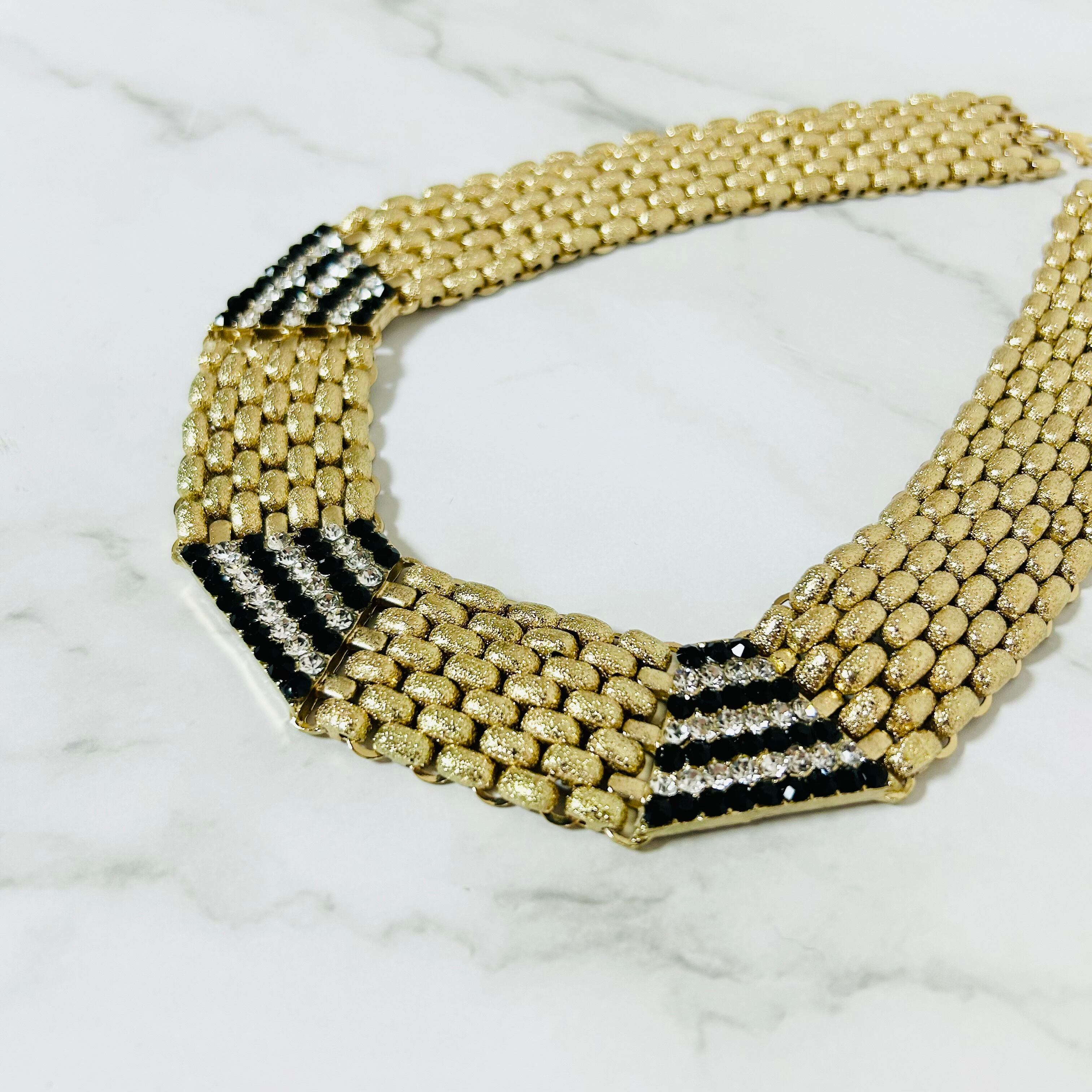 質感のあるはなやかなゴールドチェーンに美しい輝きを放つブラックとクリアカラーのクリスタルビジューをアクセントとしたゴージャスなデザインです。