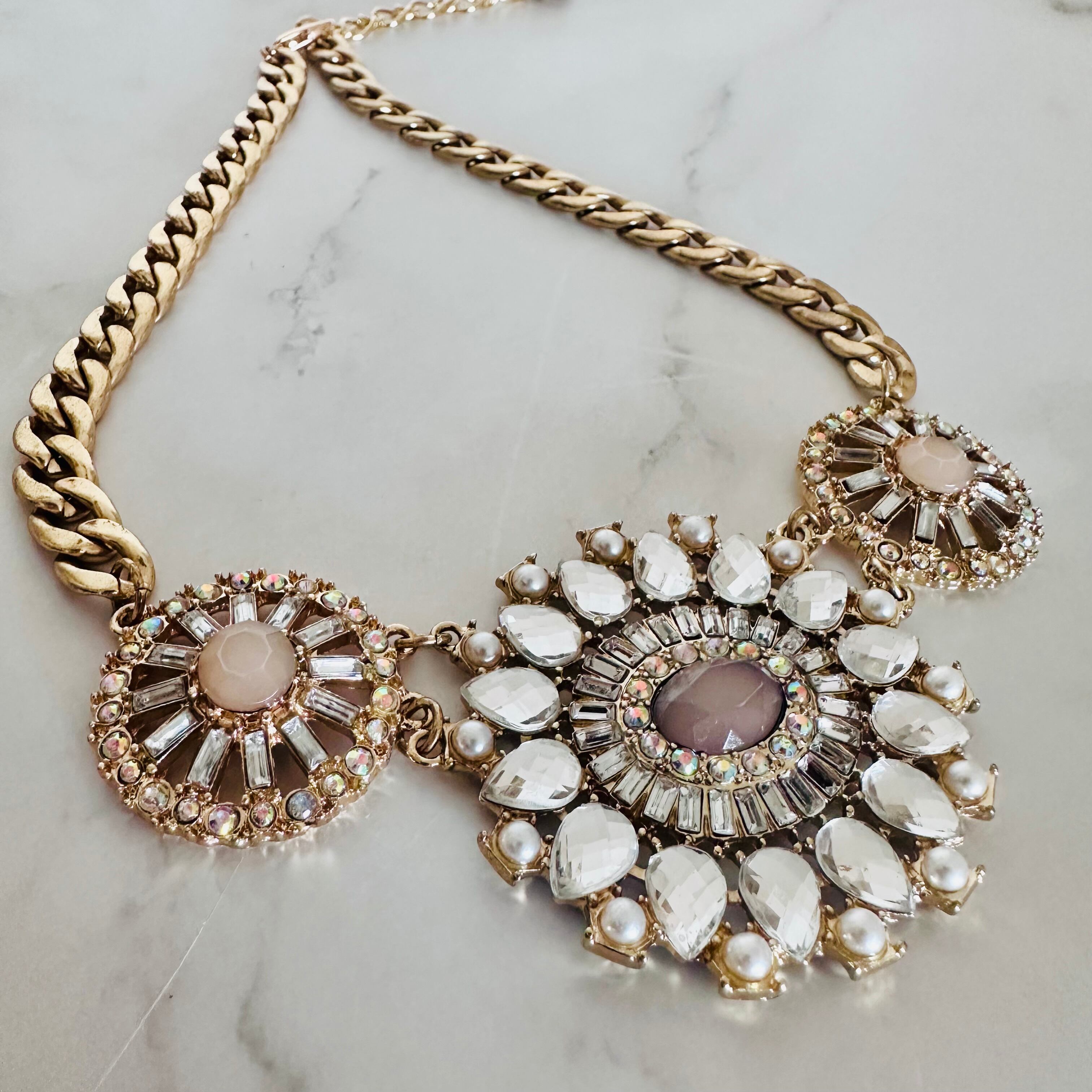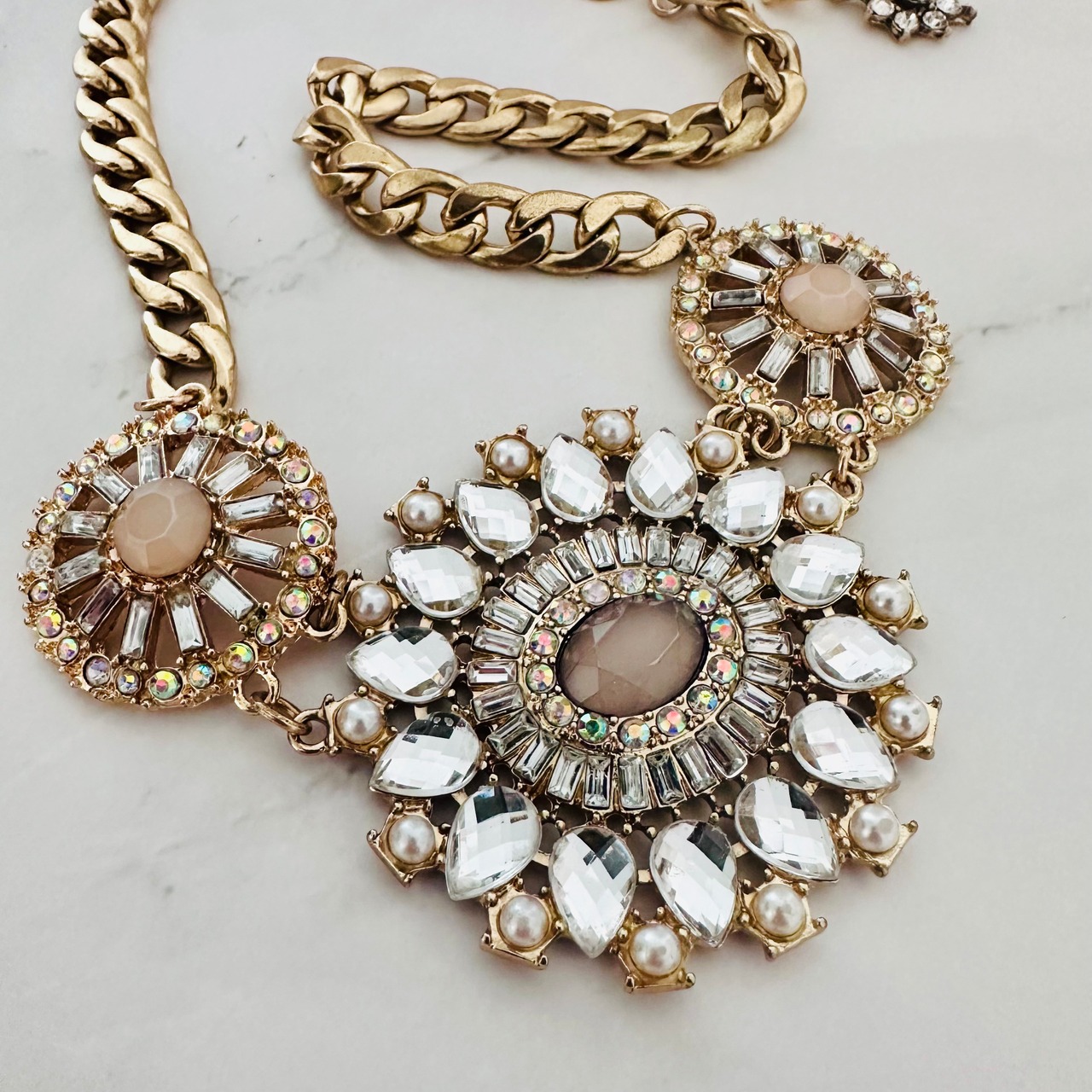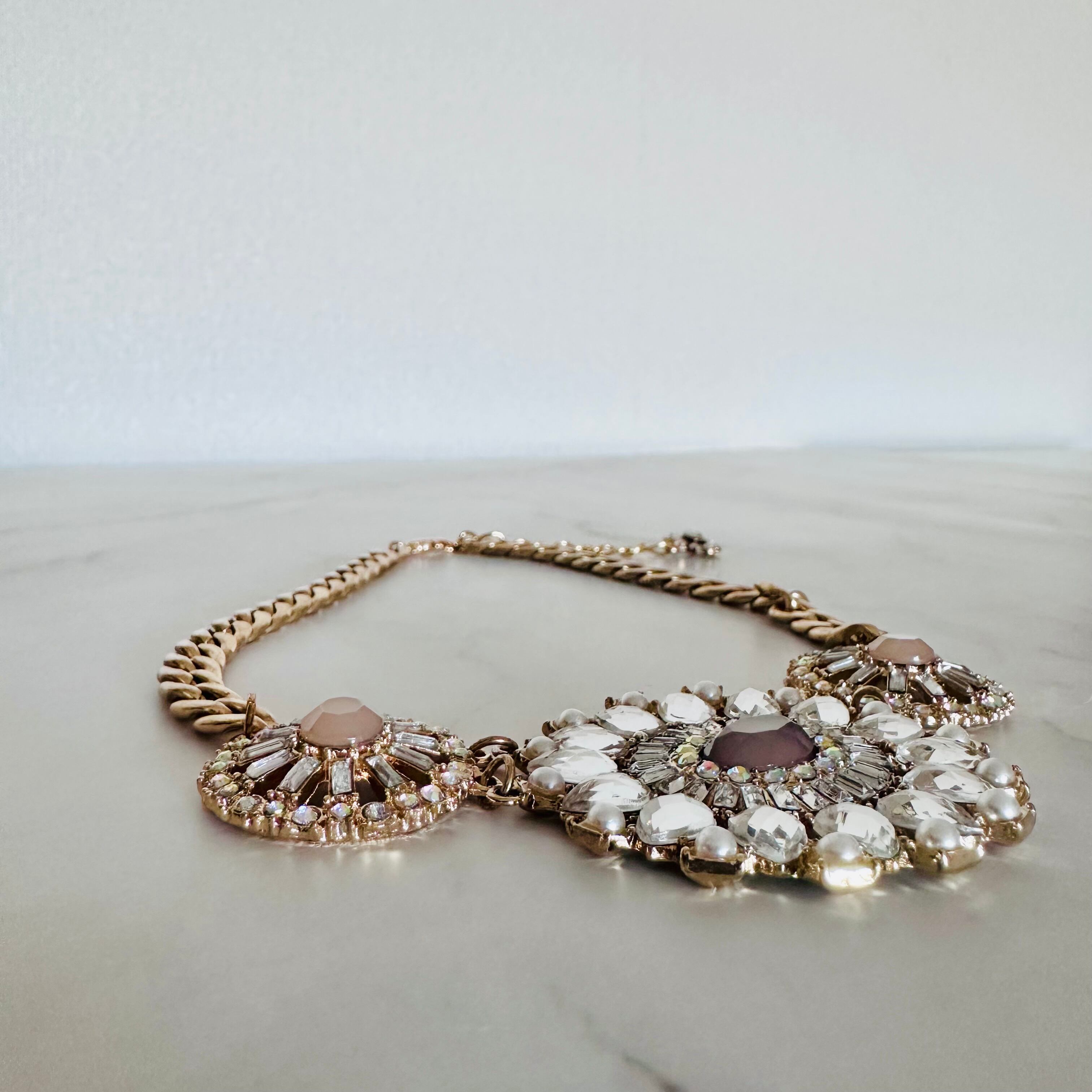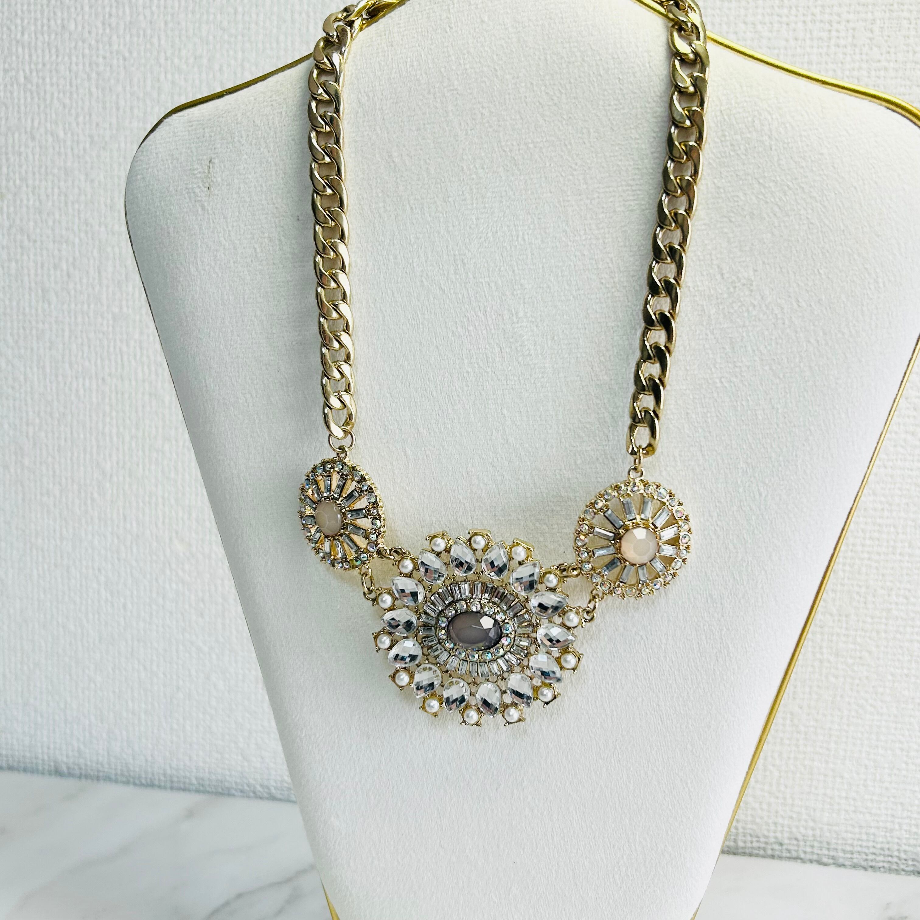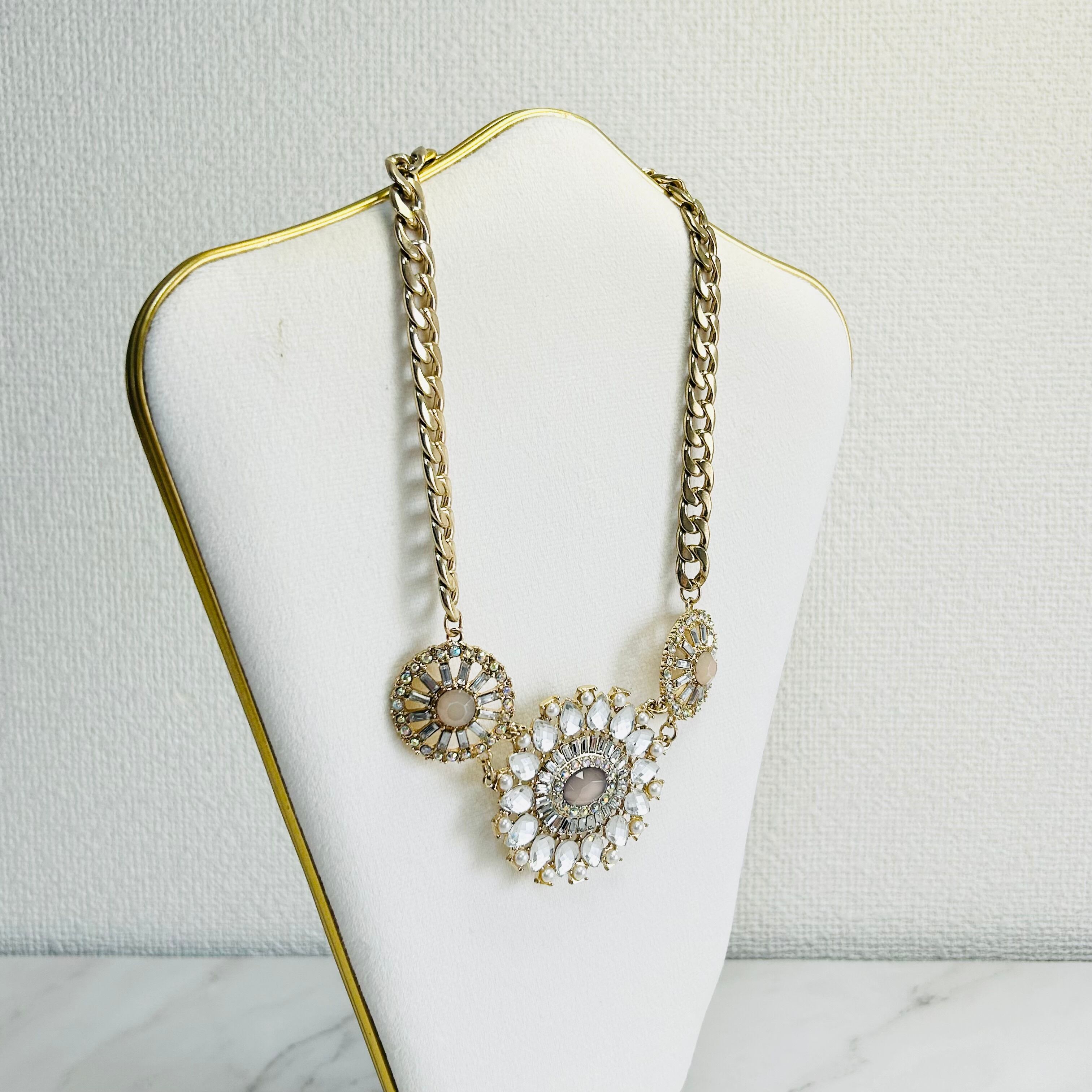 クリスタル、パールホワイト、ベージュ系✖️アンティークゴールドカラーのネックレスです。