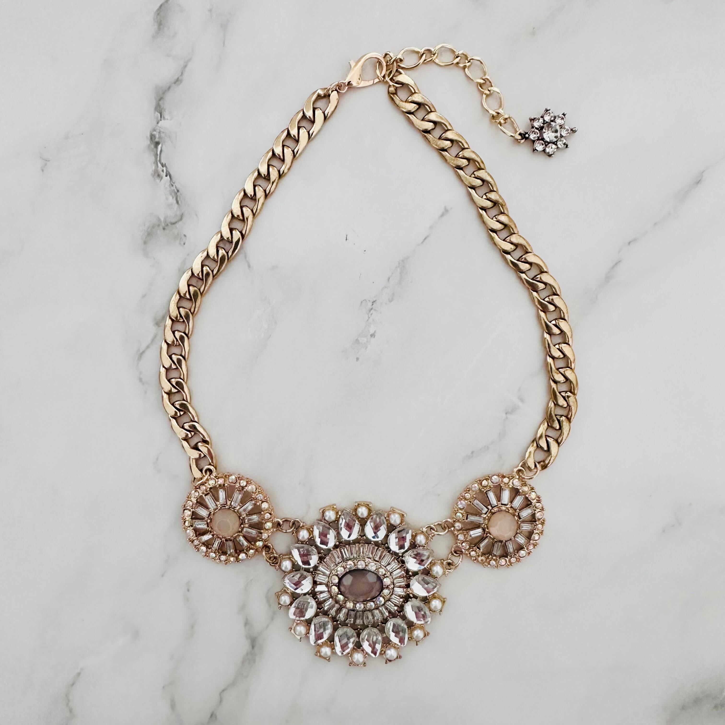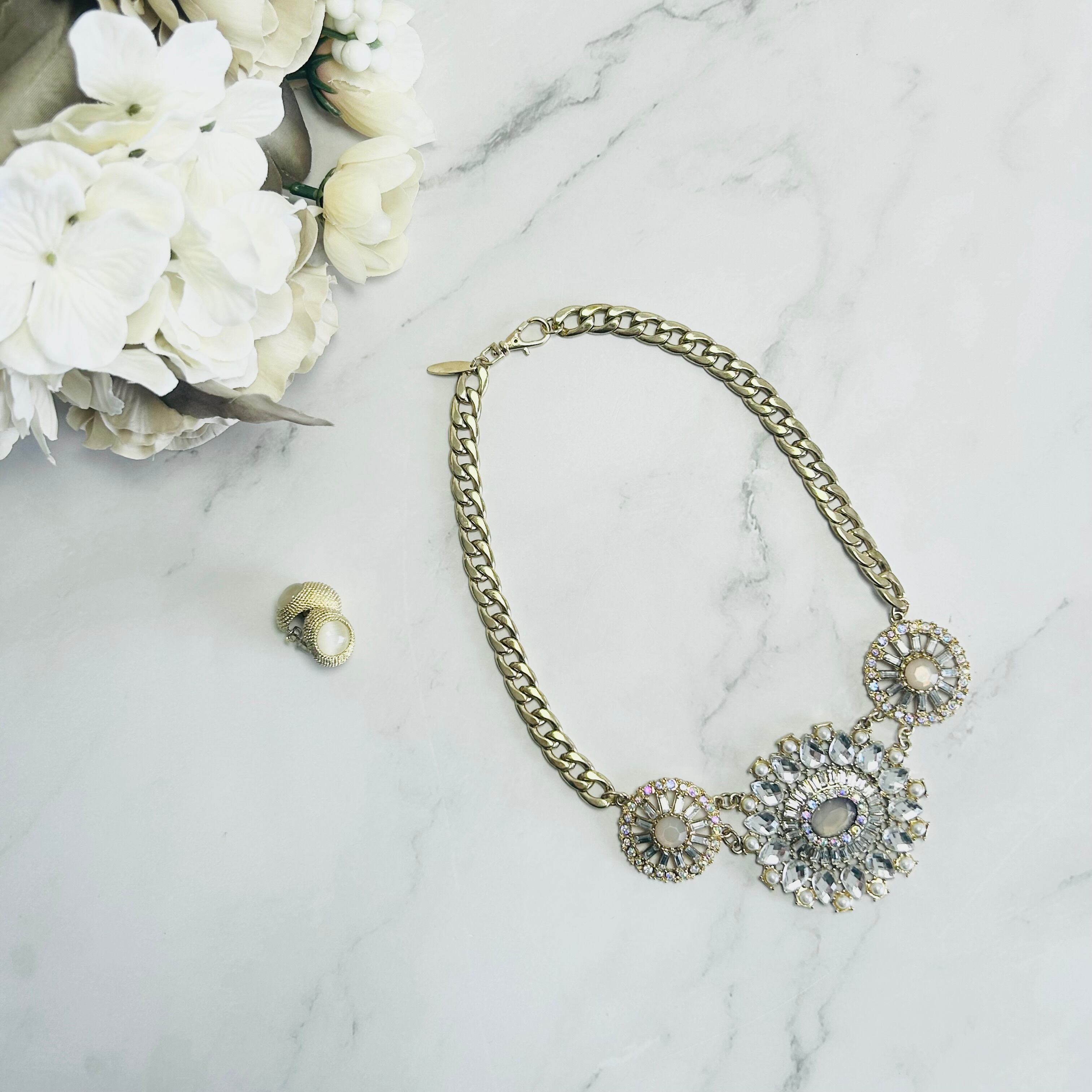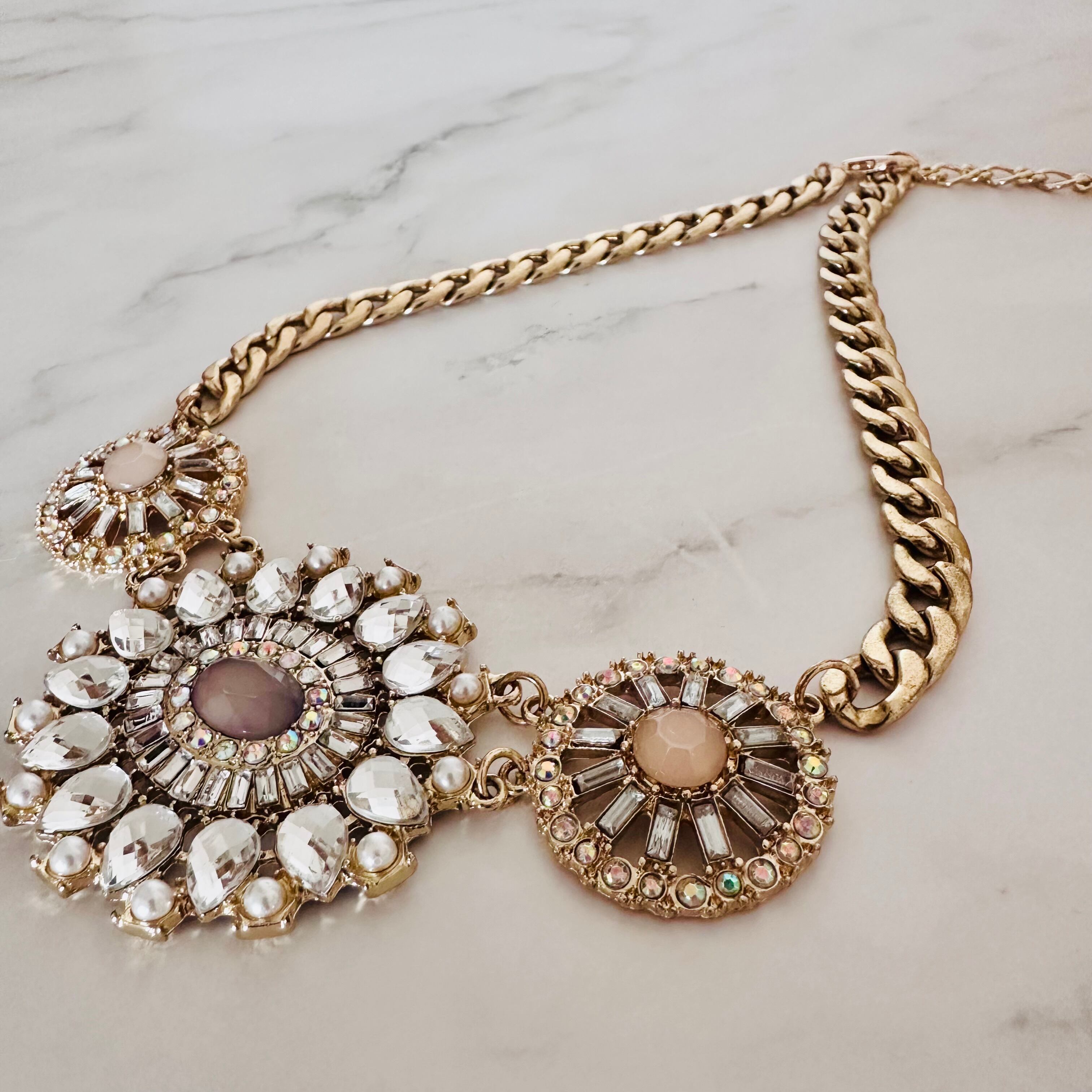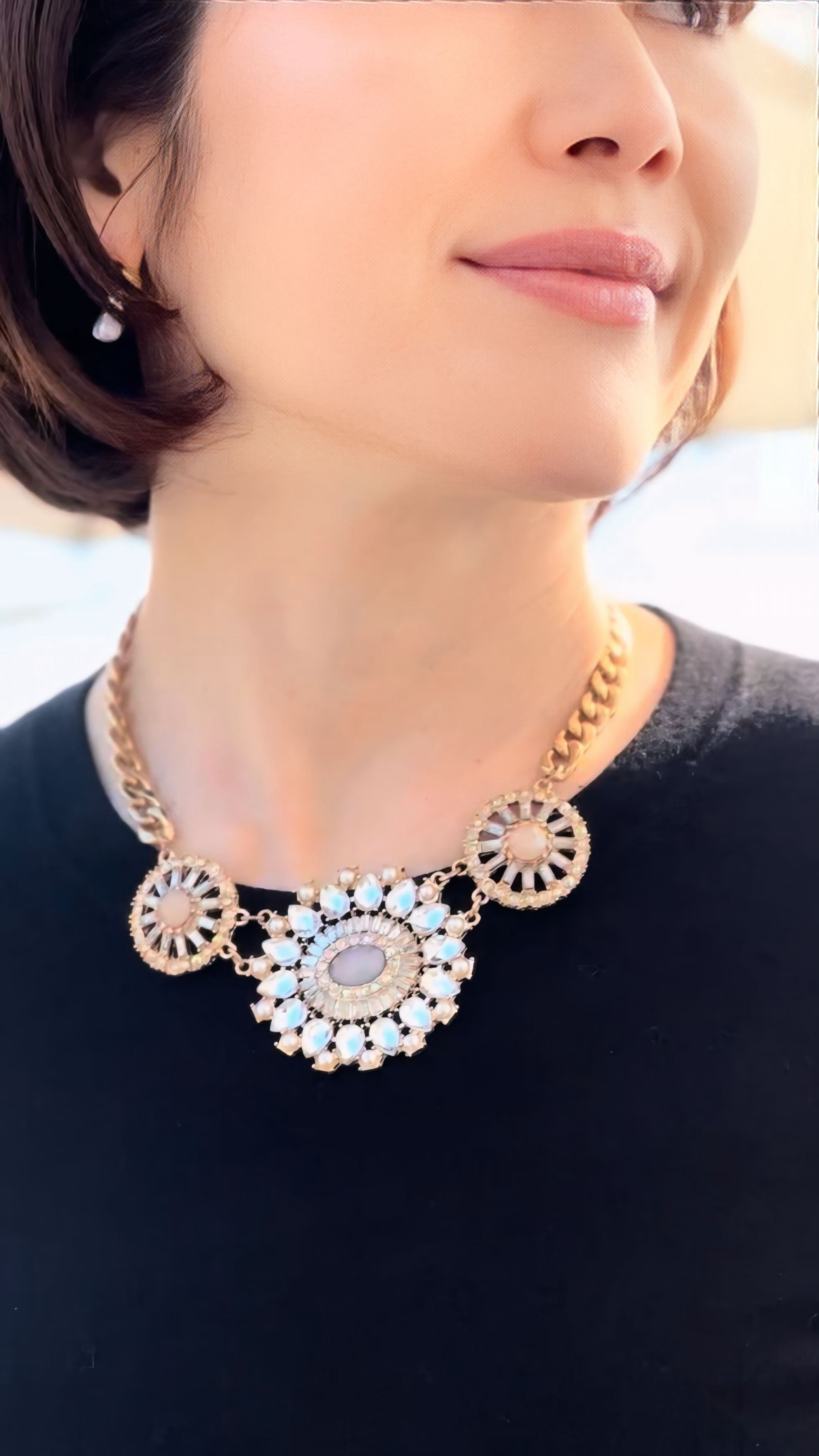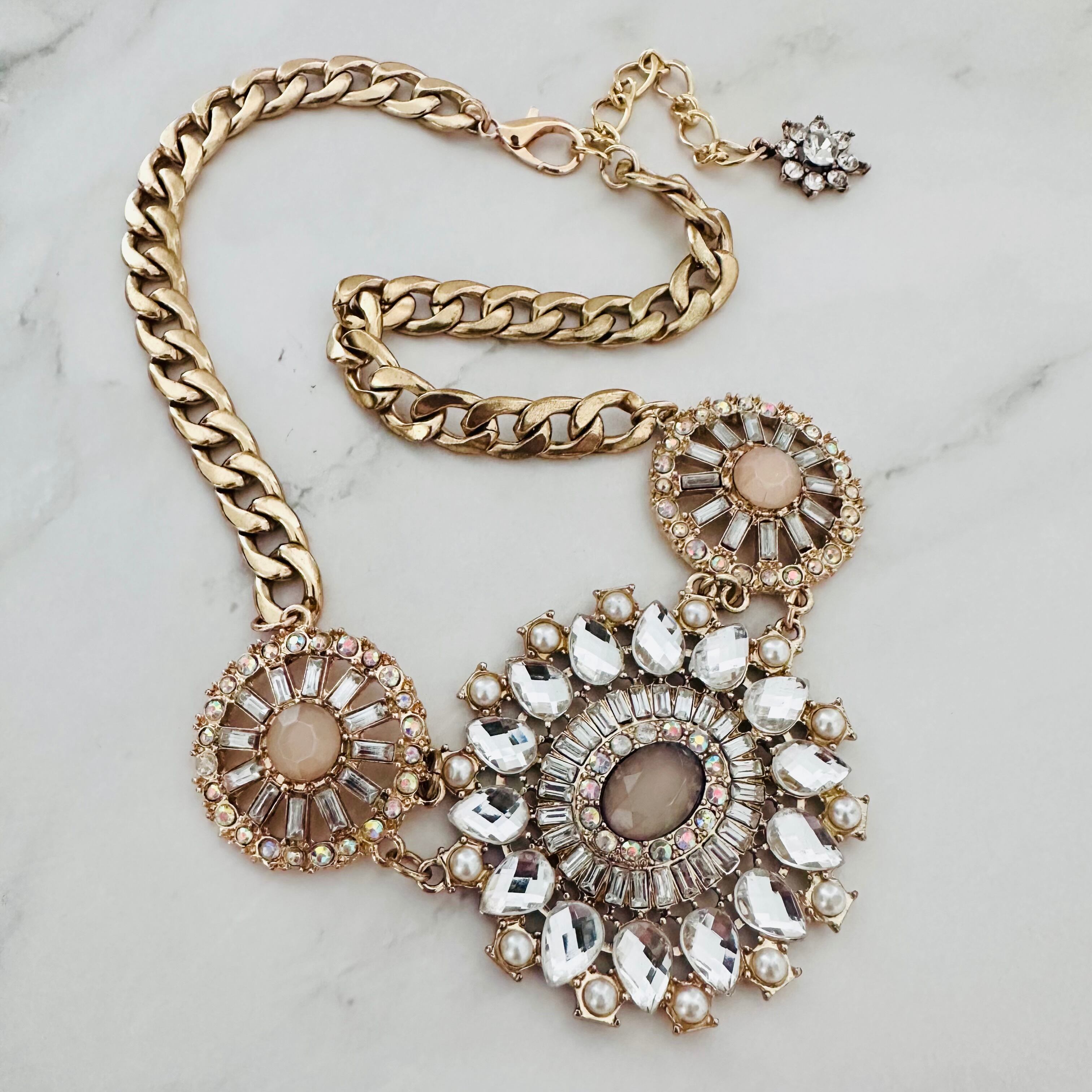 クリスタル、パールホワイト、ベージュ系✖️アンティークゴールドカラーのネックレスです。