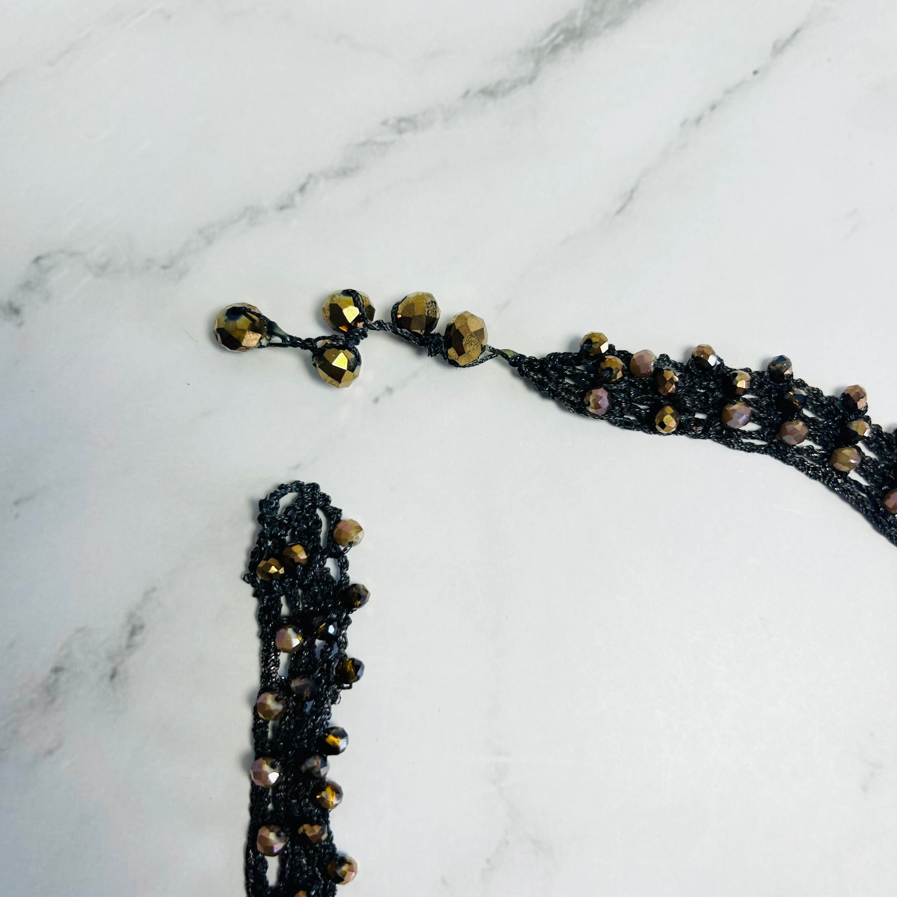 ラメの入ったブラウンの糸をレース編みにし、上品な輝きを放つクリスタルビーズをあしらったデザインです。