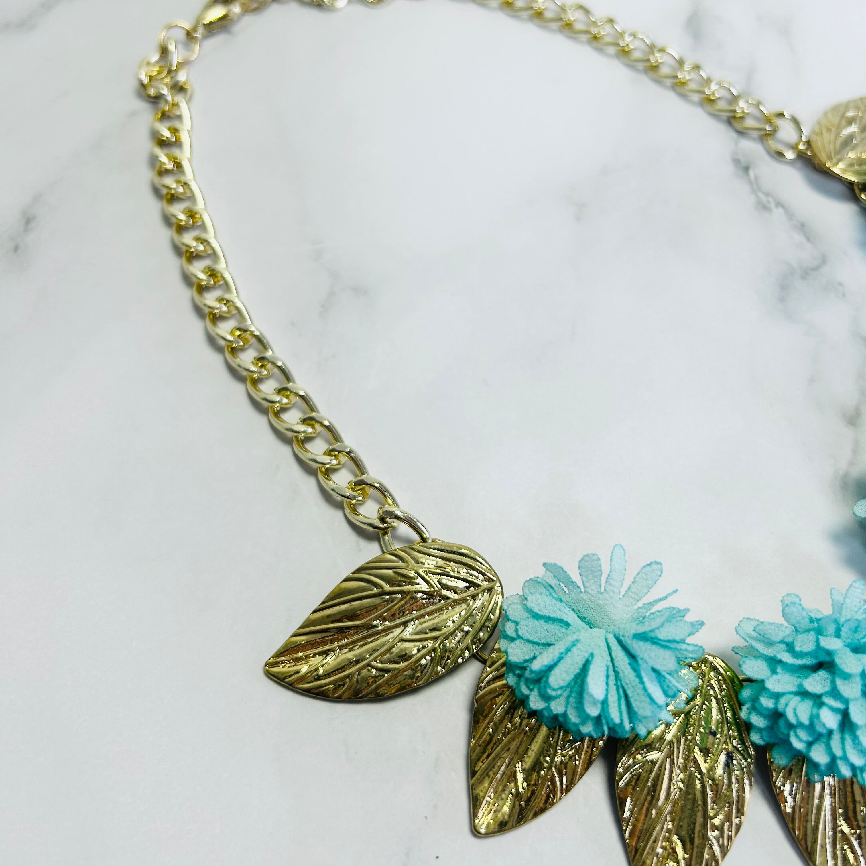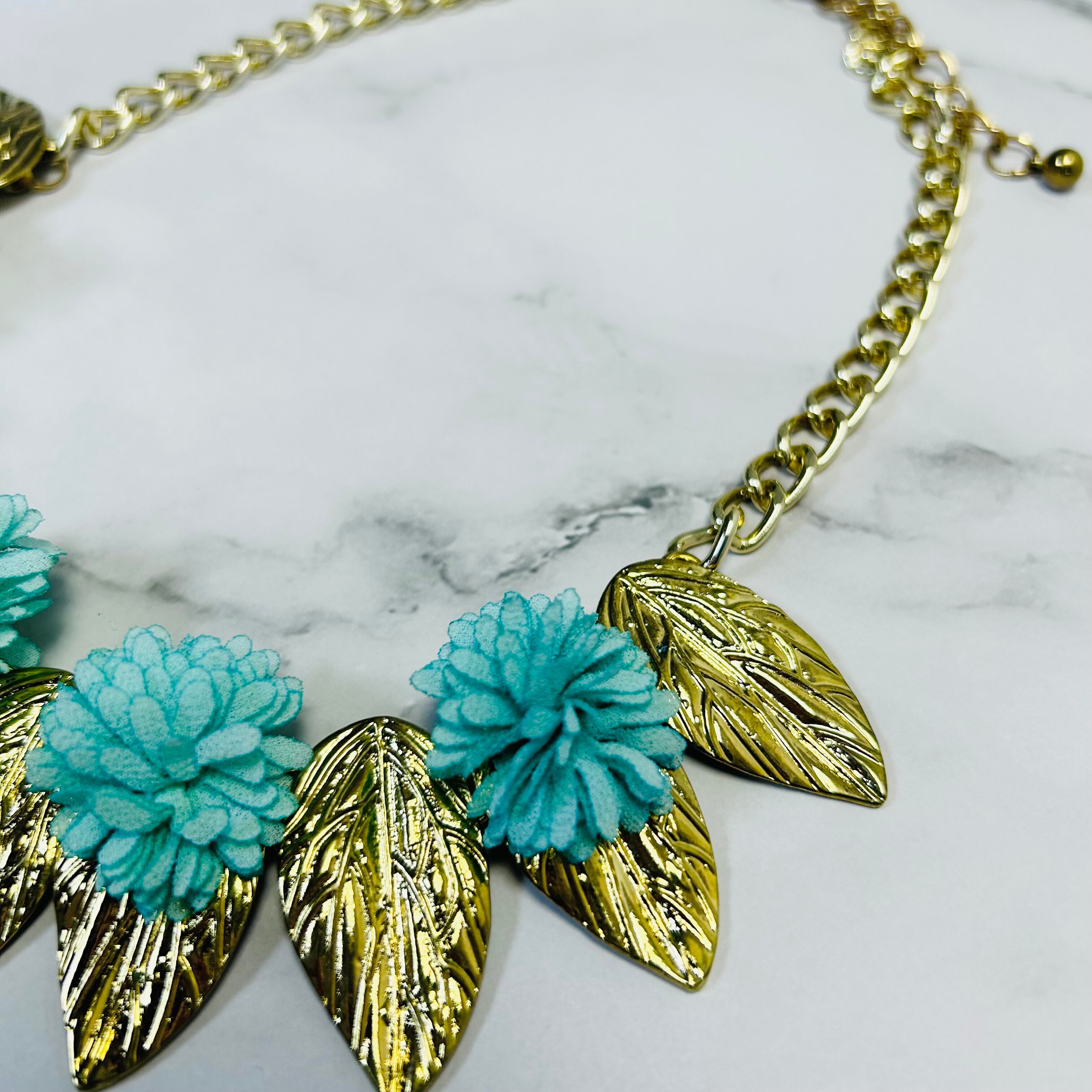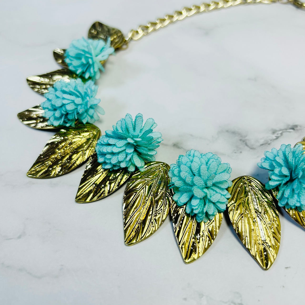 ゴールドのリーフパーツに爽やかな色味の生地をフラワーイメージで組み合わせたデザインです。