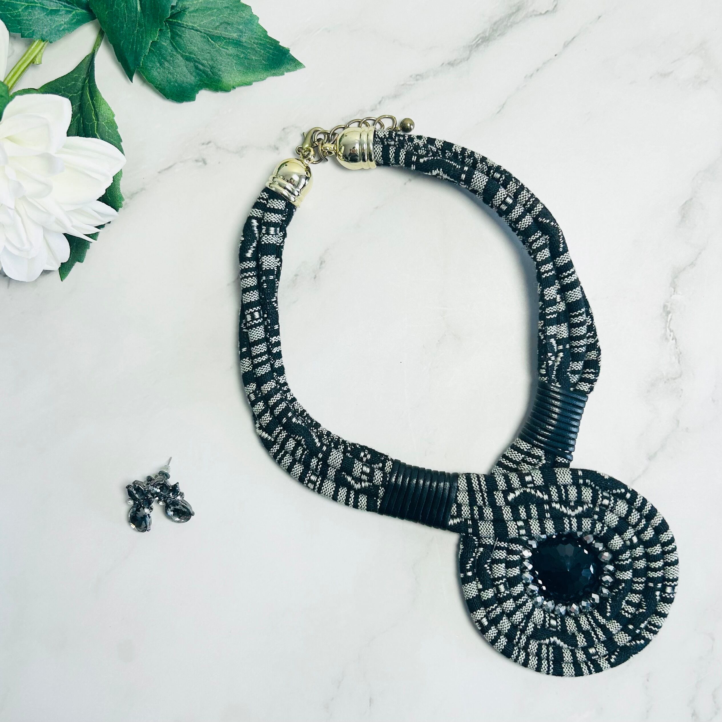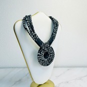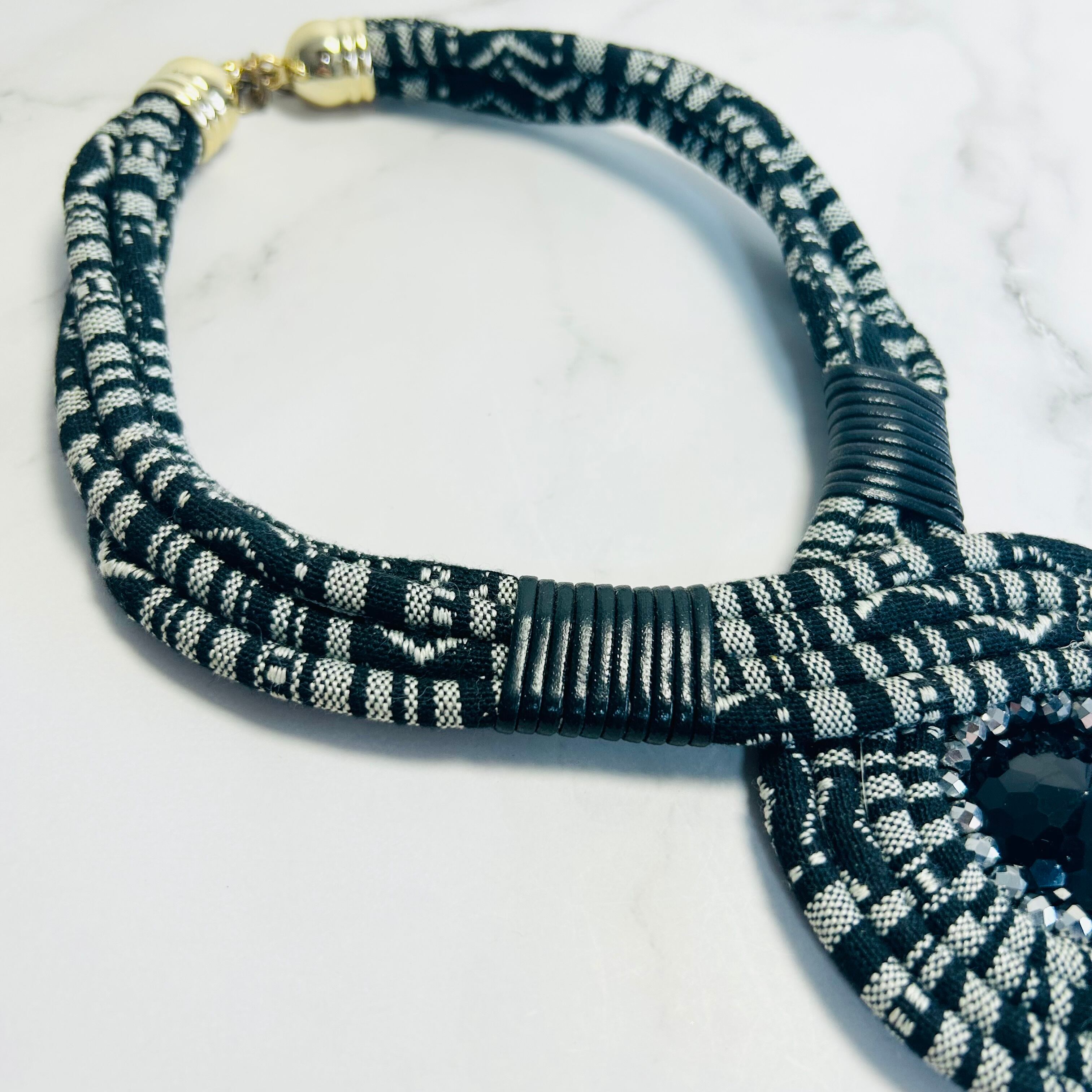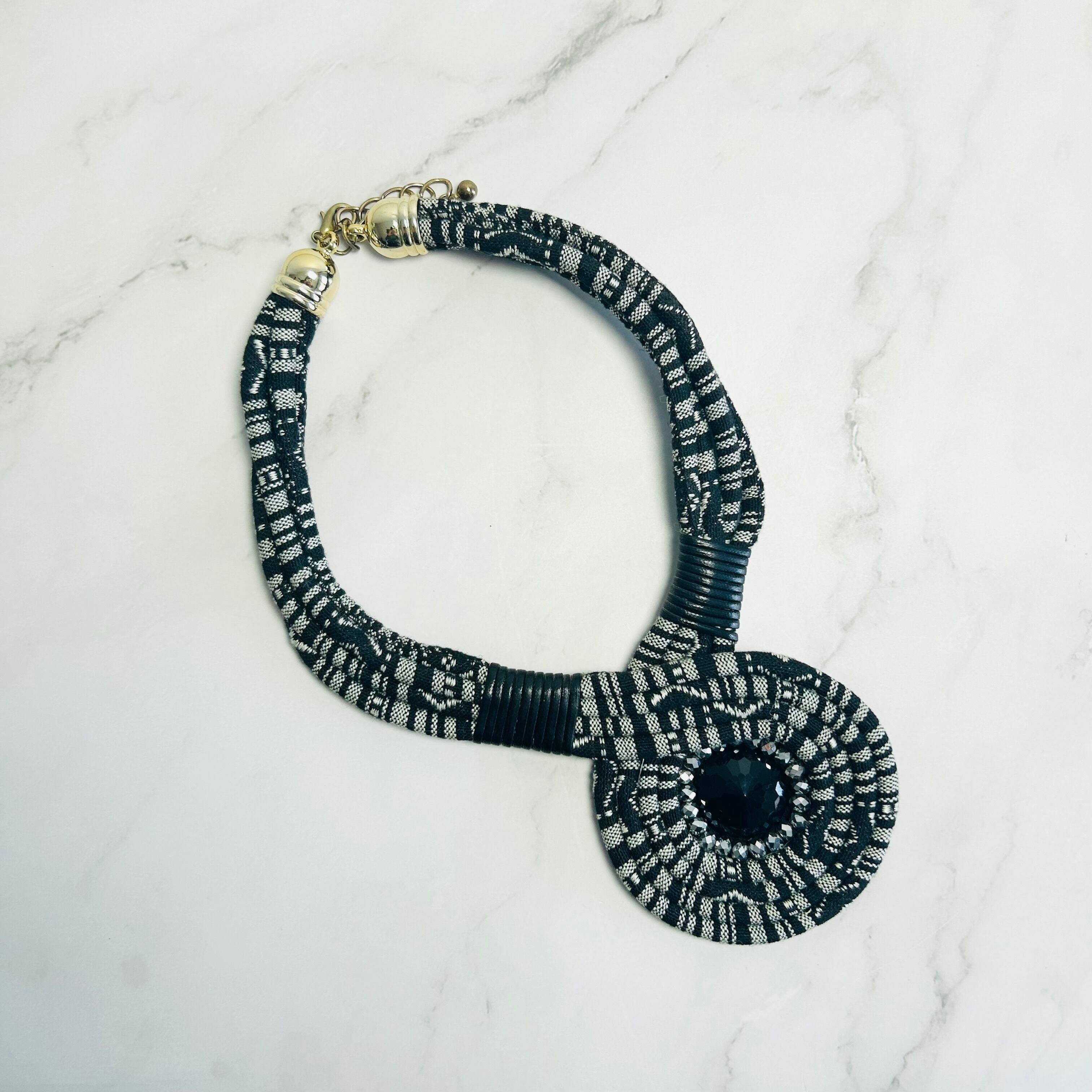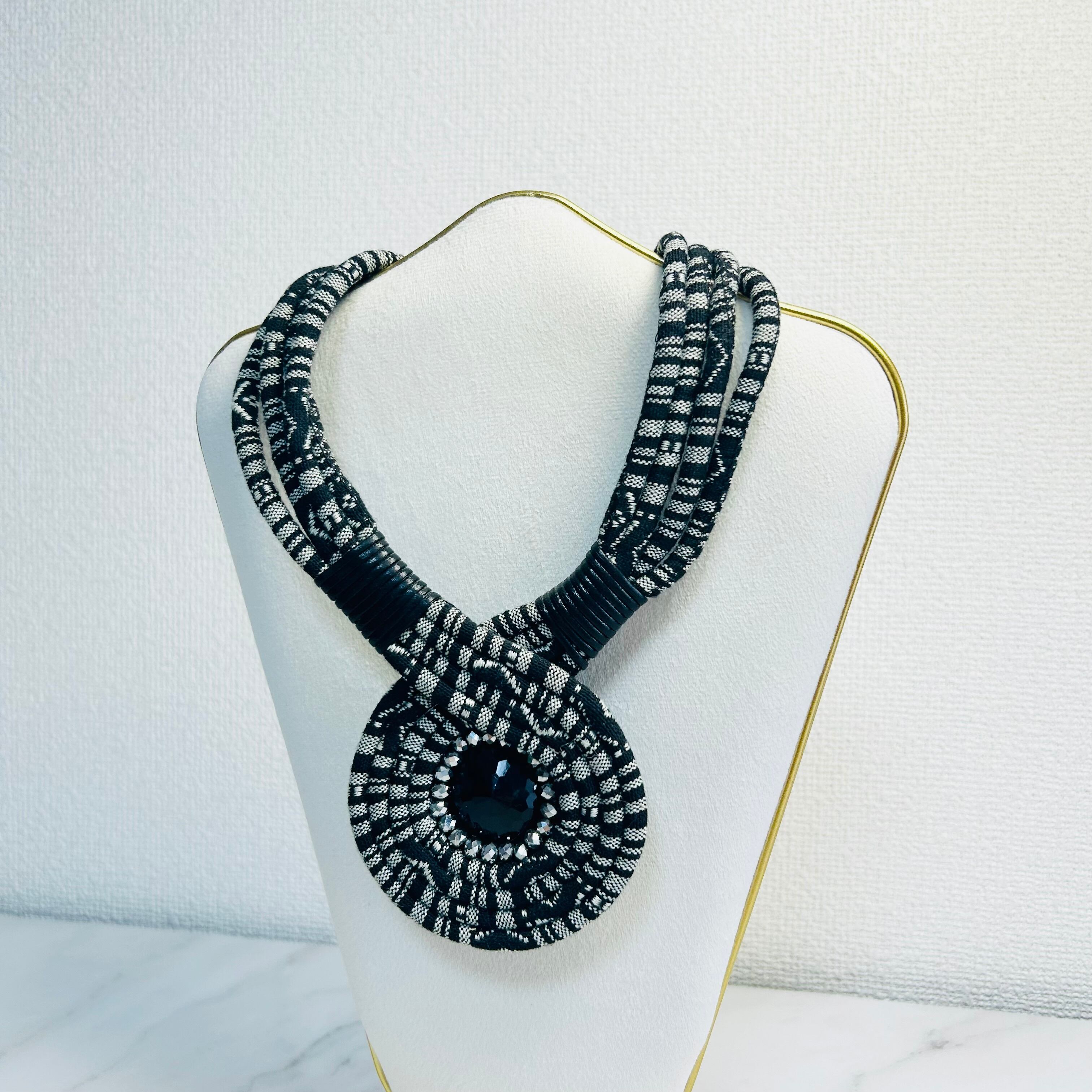 白黒のジャガード柄コードに艶やかなブラックのアクリルストーンとシルバービーズをあしらったデザインです。
