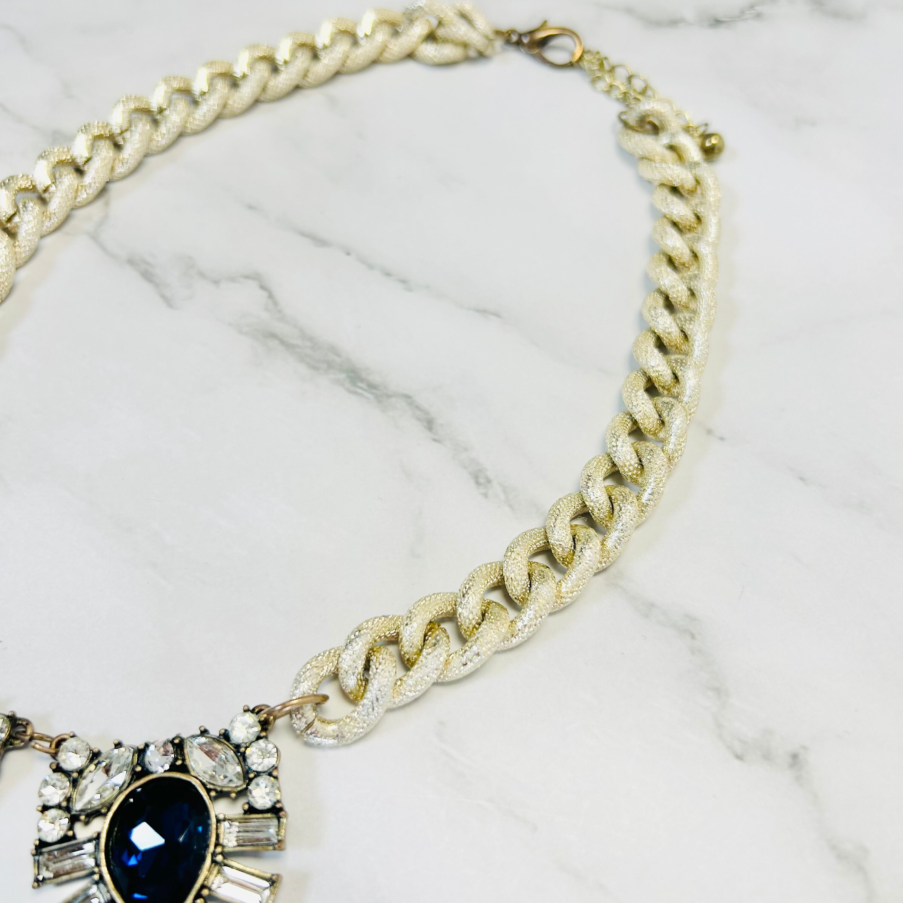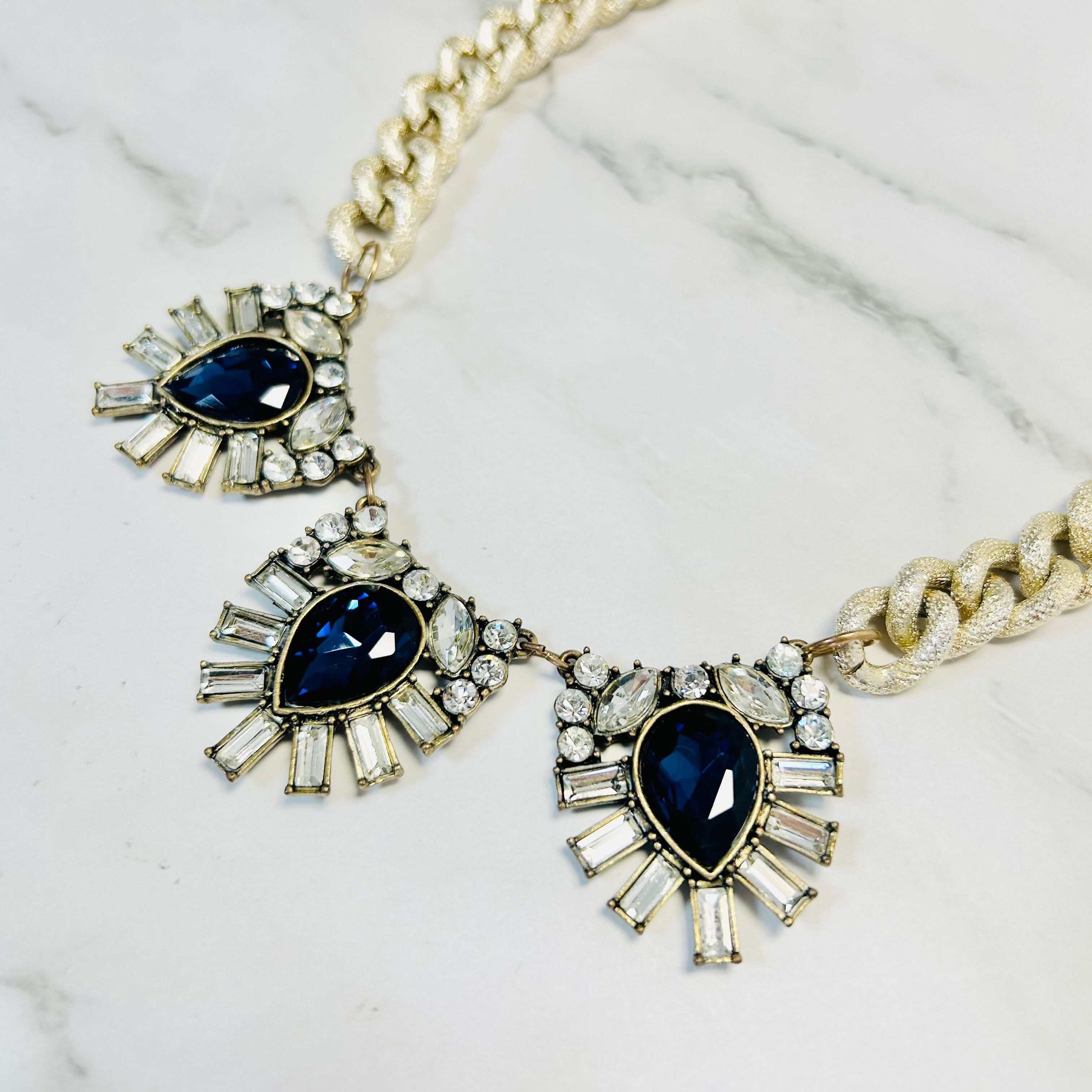深いネイビーのラインストーン透明感のある煌めきを放つクリスタルビジューを組み合わせ、スタイリッシュなチャンキーチェーンと組み合わせた華やかなでゴージャスなデザインです。