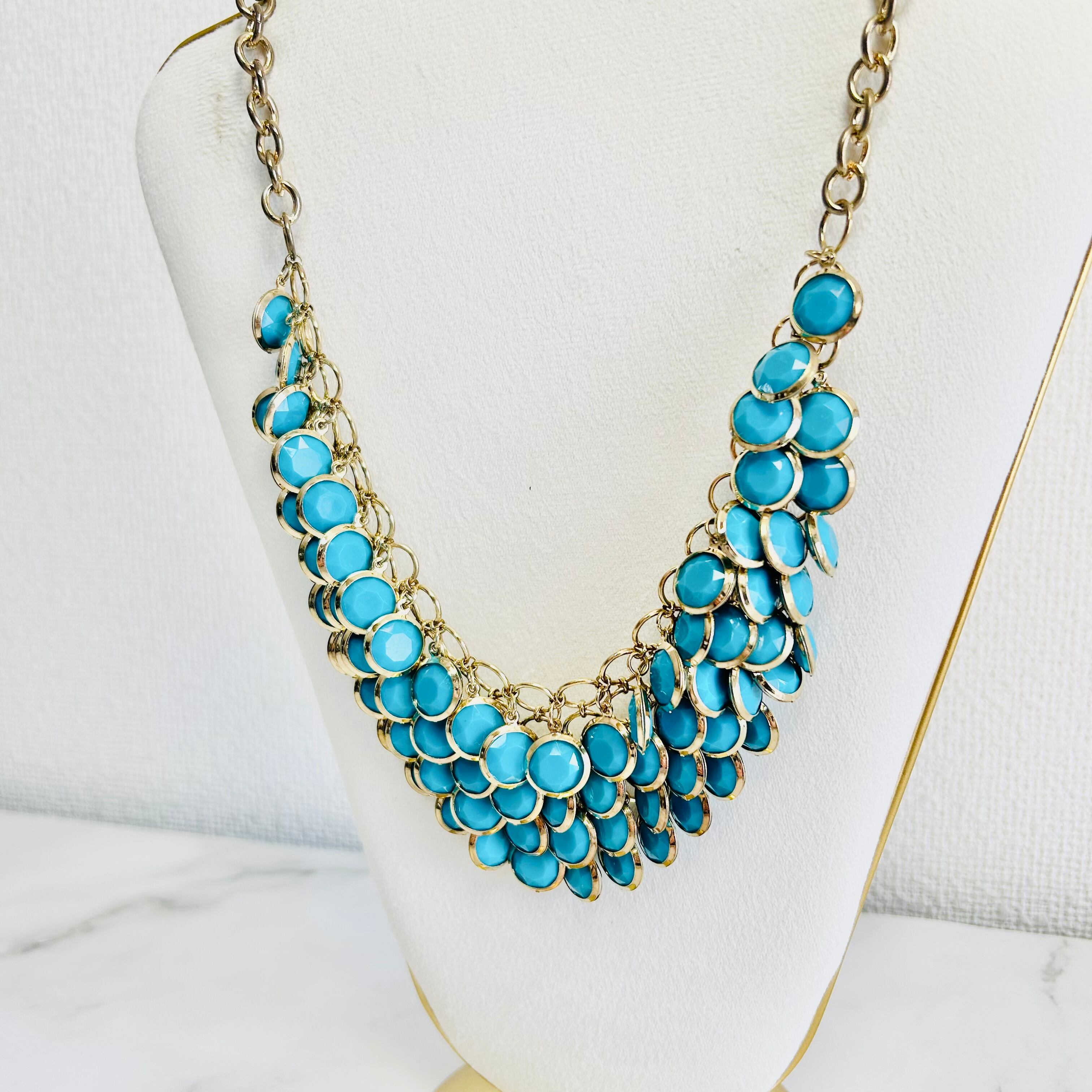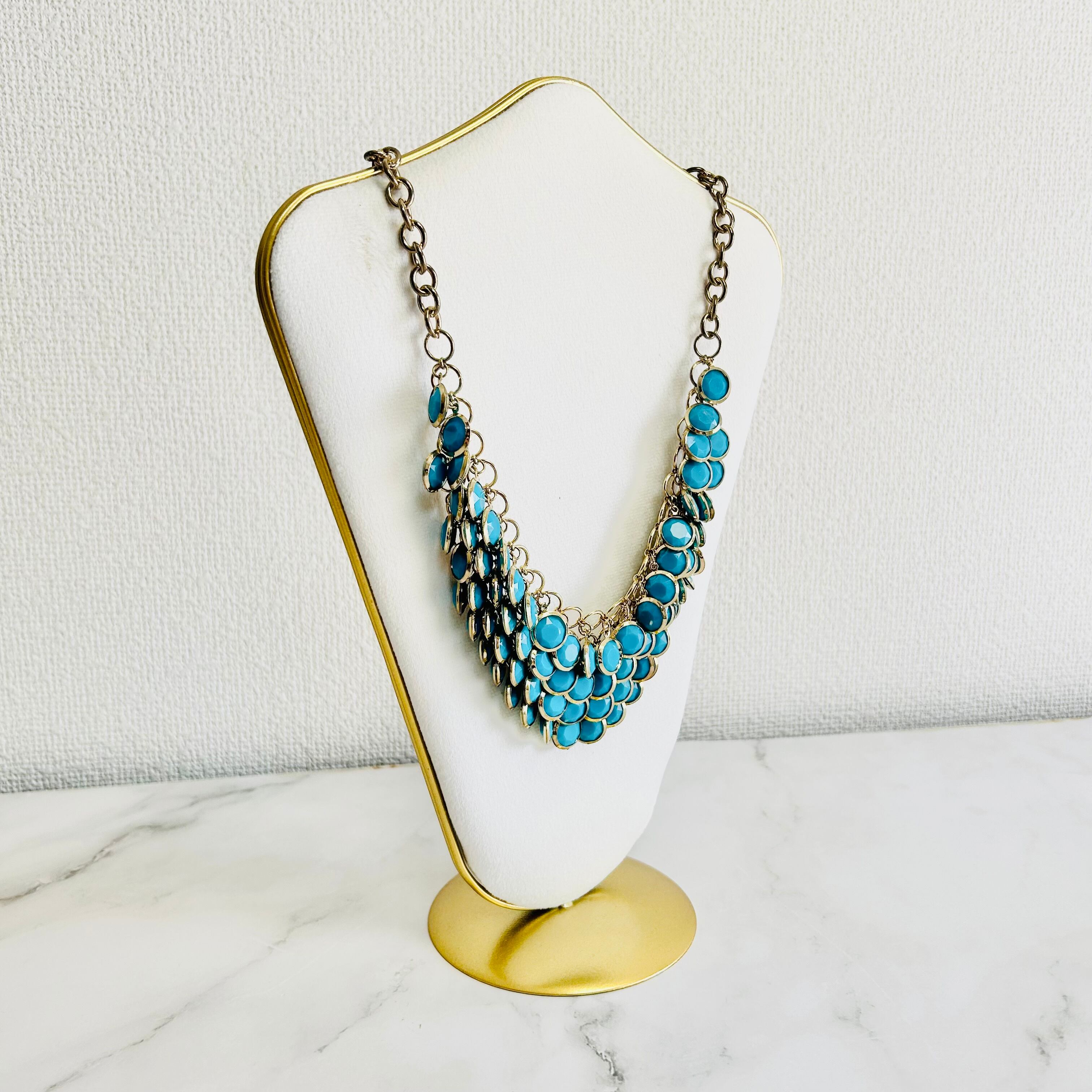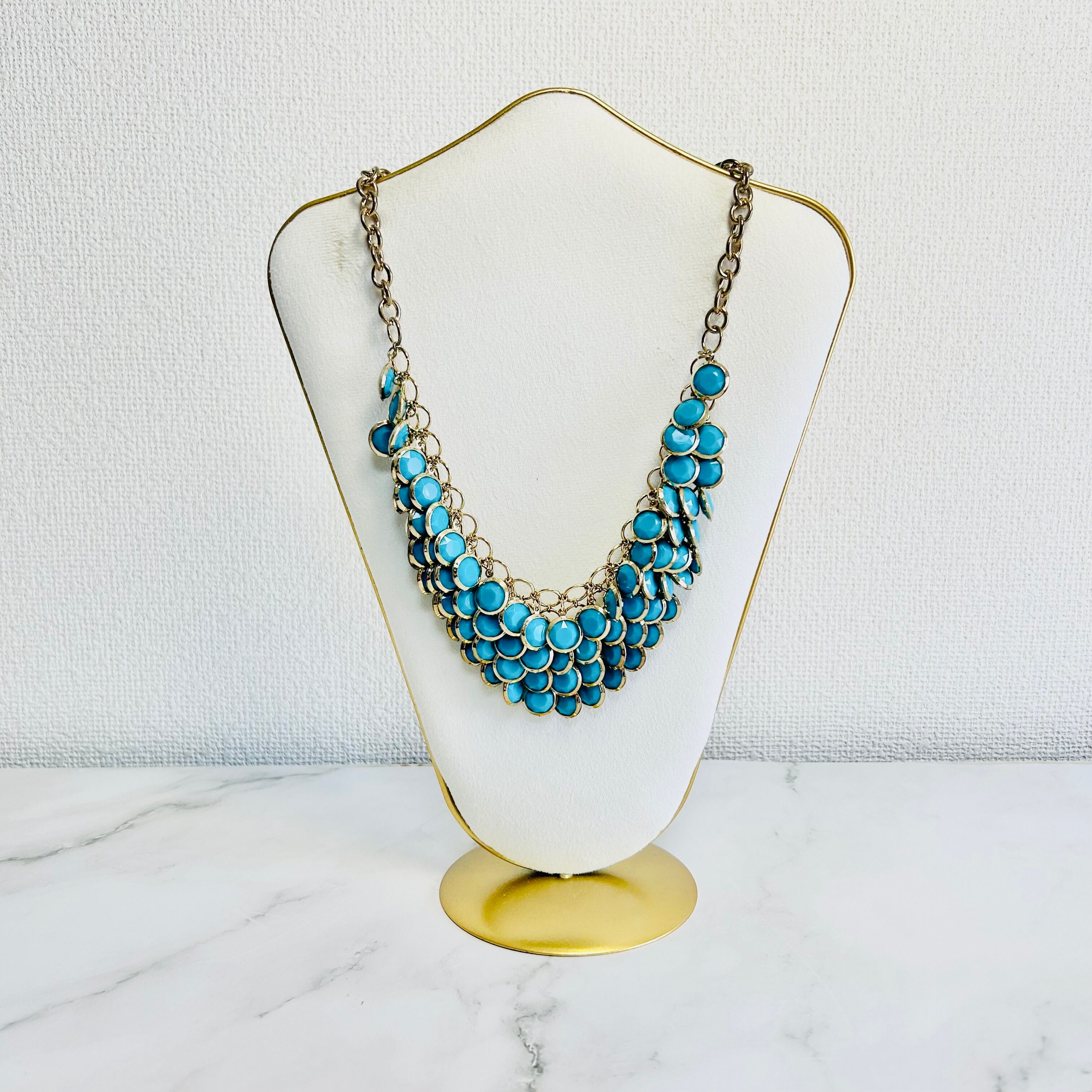 鮮やかなターコイズブルーのアクリル素材を使用し、一つ一つ手仕事でチェーンに組み合わせた手の凝ったデザインです。