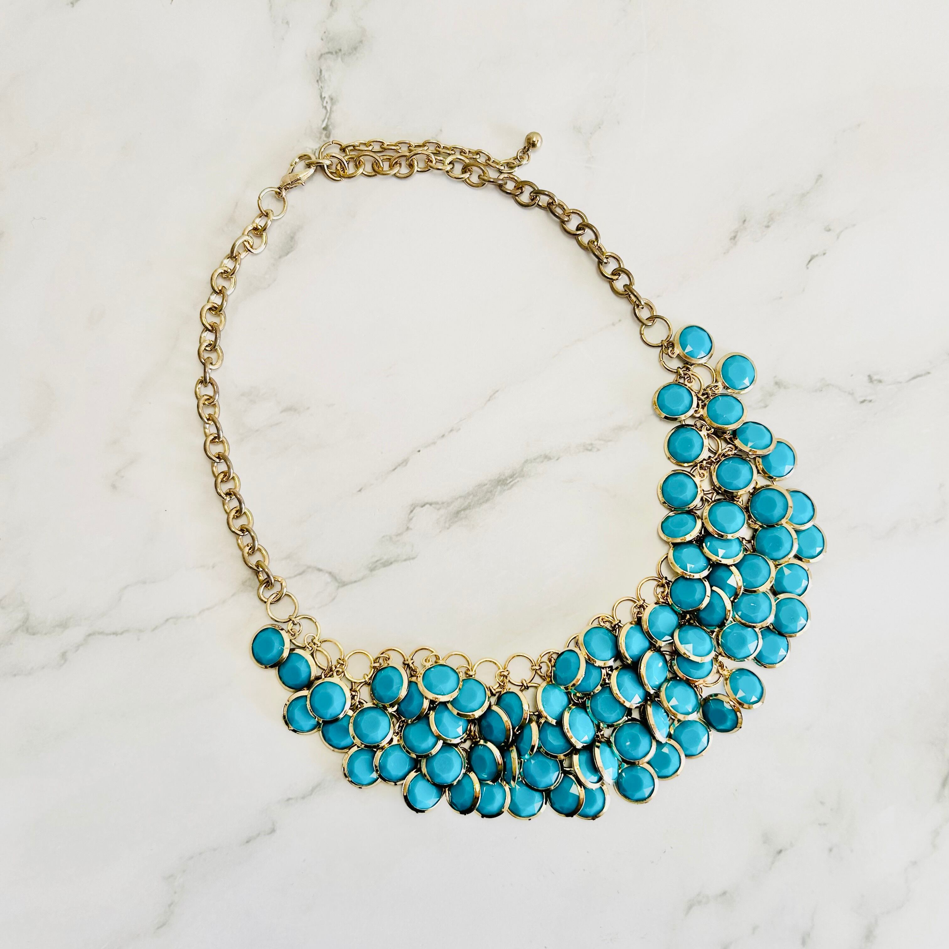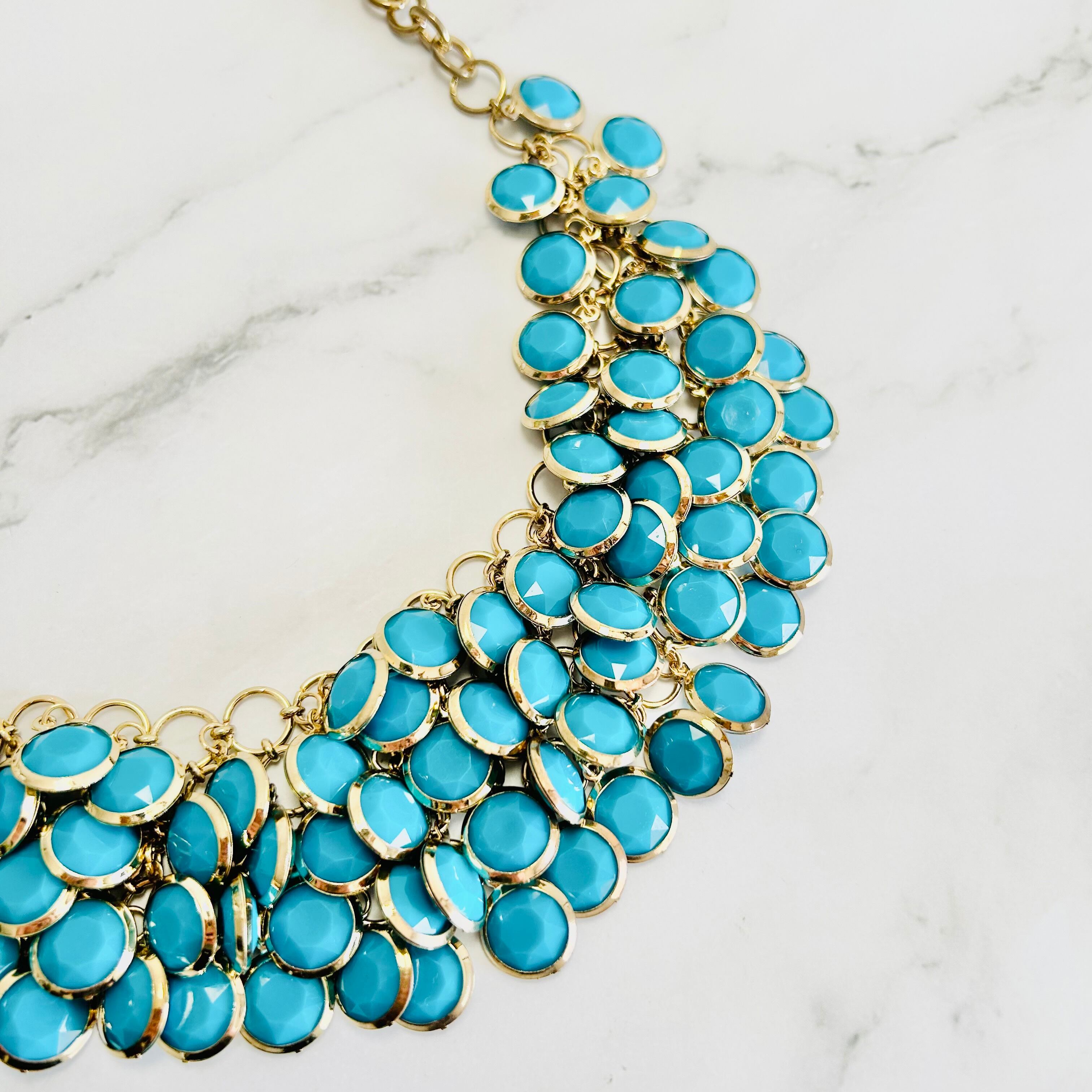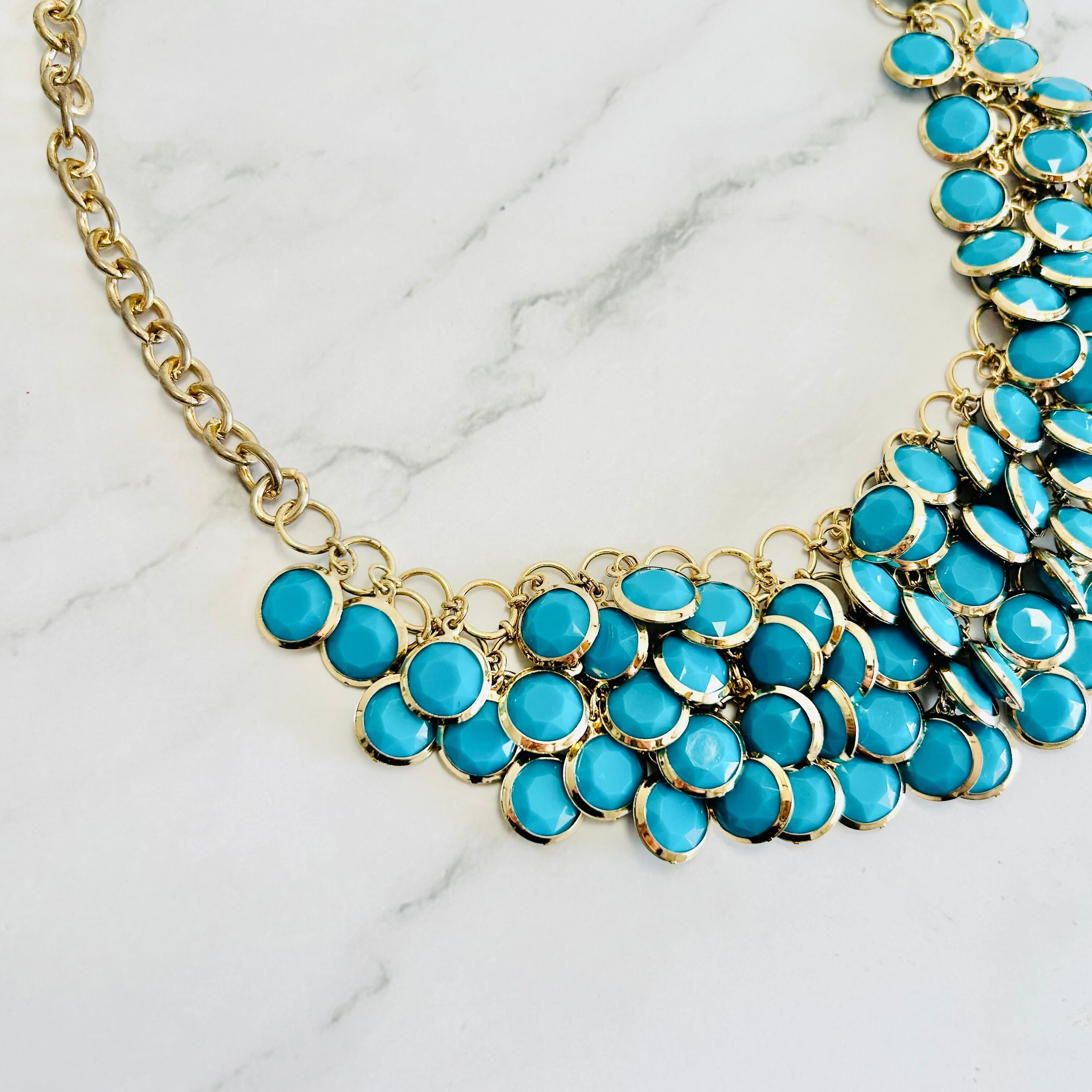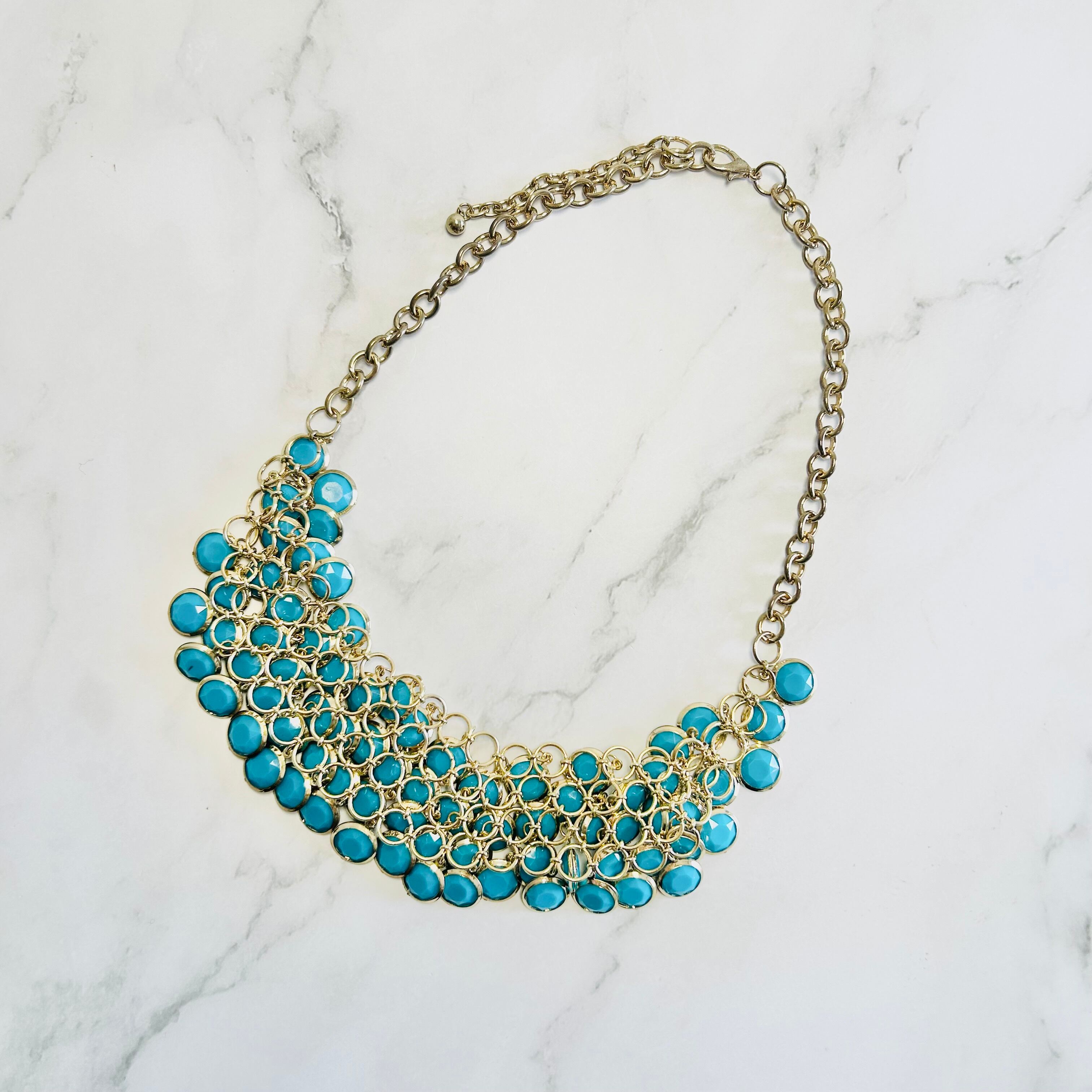 鮮やかなターコイズブルーのアクリル素材を使用し、一つ一つ手仕事でチェーンに組み合わせた手の凝ったデザインです。