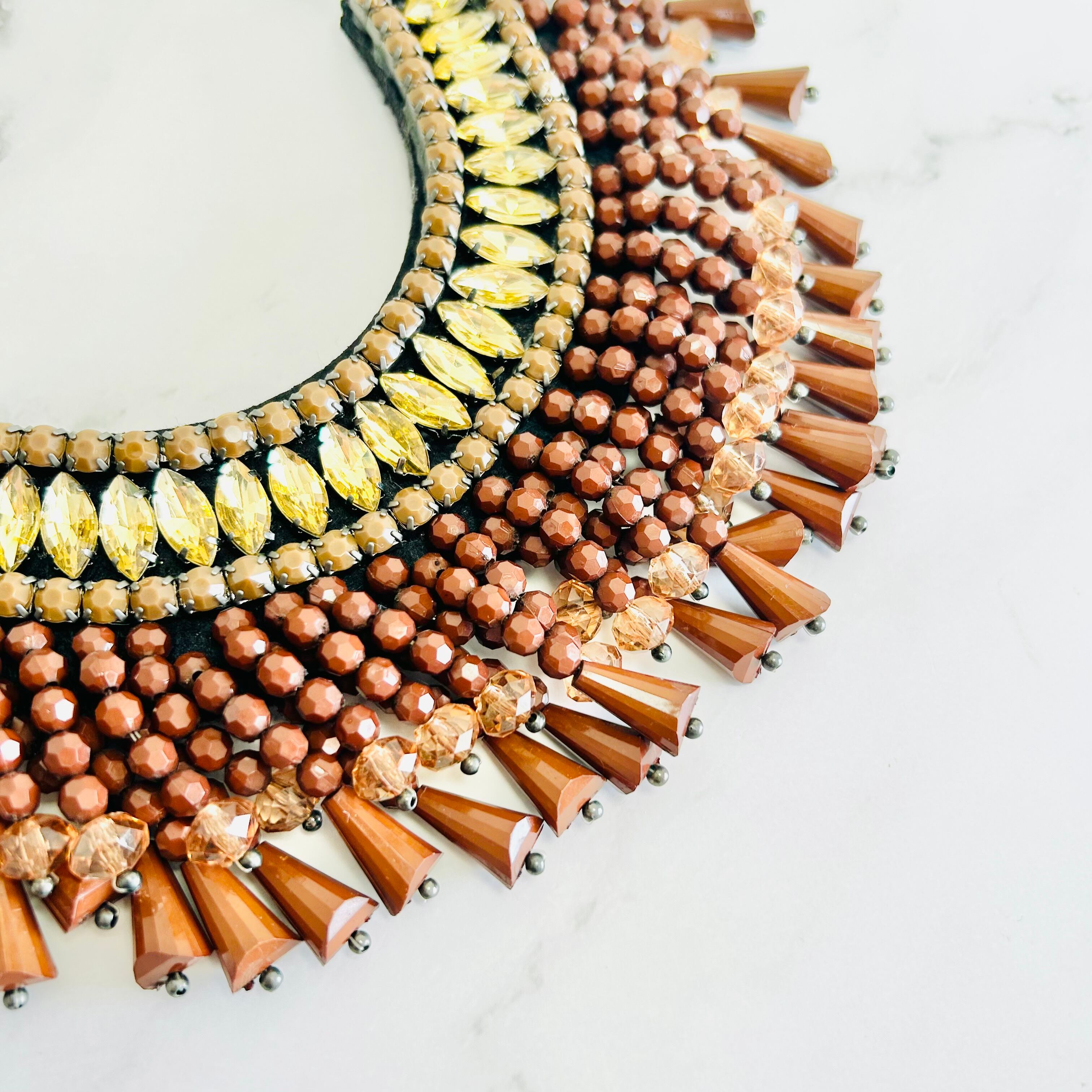 ゴールドビジューやブラウン系のビーズを布に組み合わせらフリンジ状にあしらったデコラティブなデザインです。