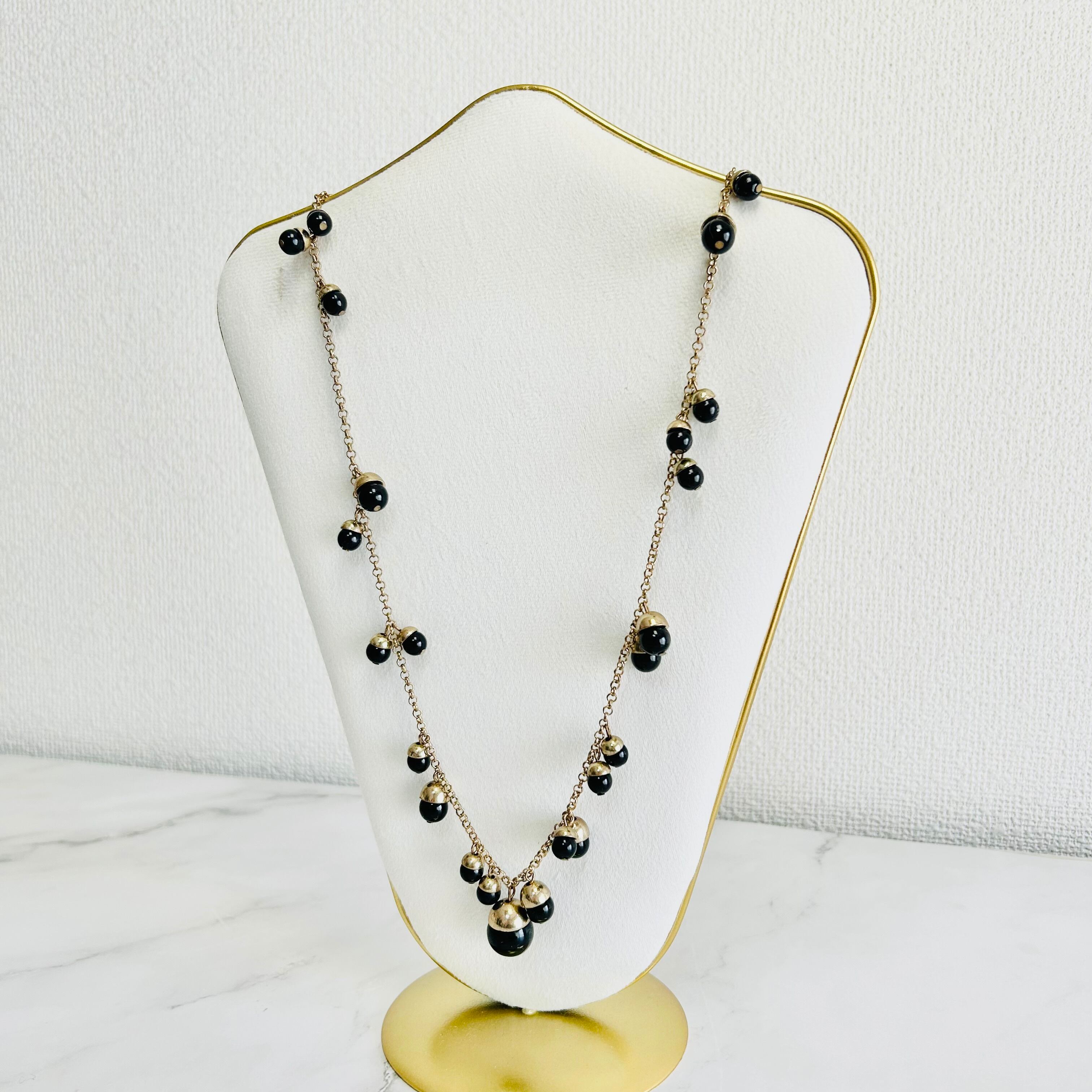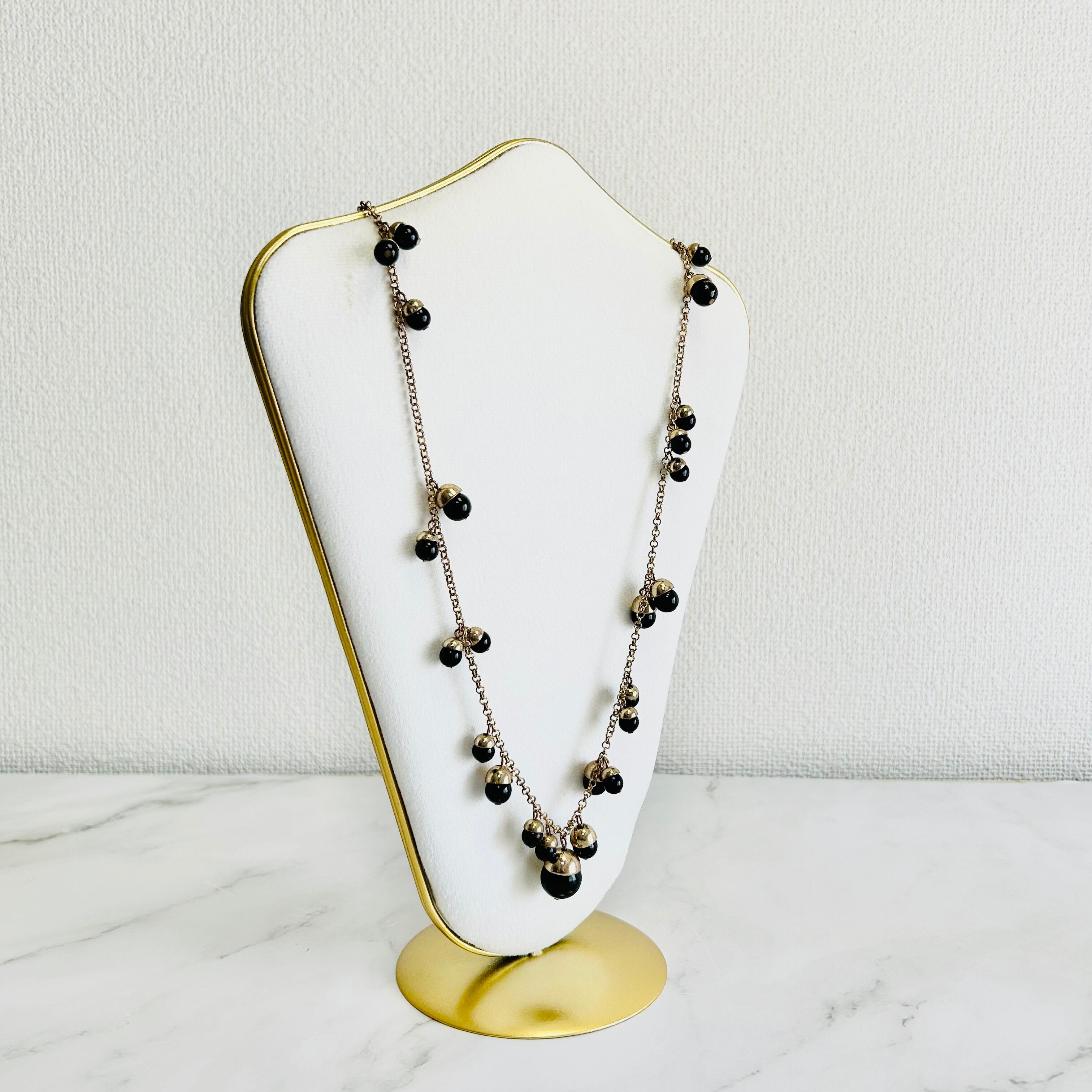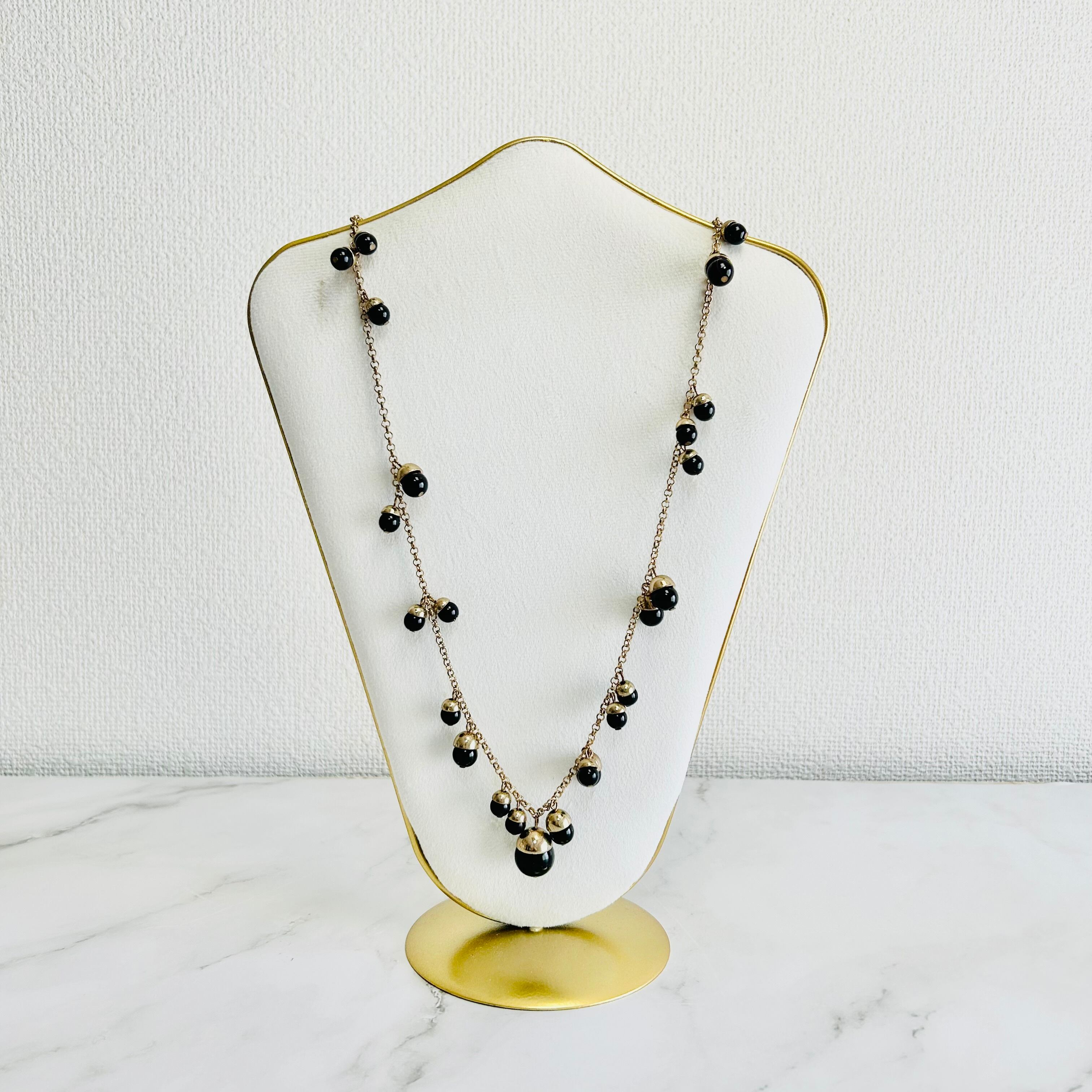 アクリル素材のブラックビーズをアンティークゴールドのパーツと組み合わせたキュートなモチーフを 華奢なチェーンに取り付けたロングタイプのデザインです。