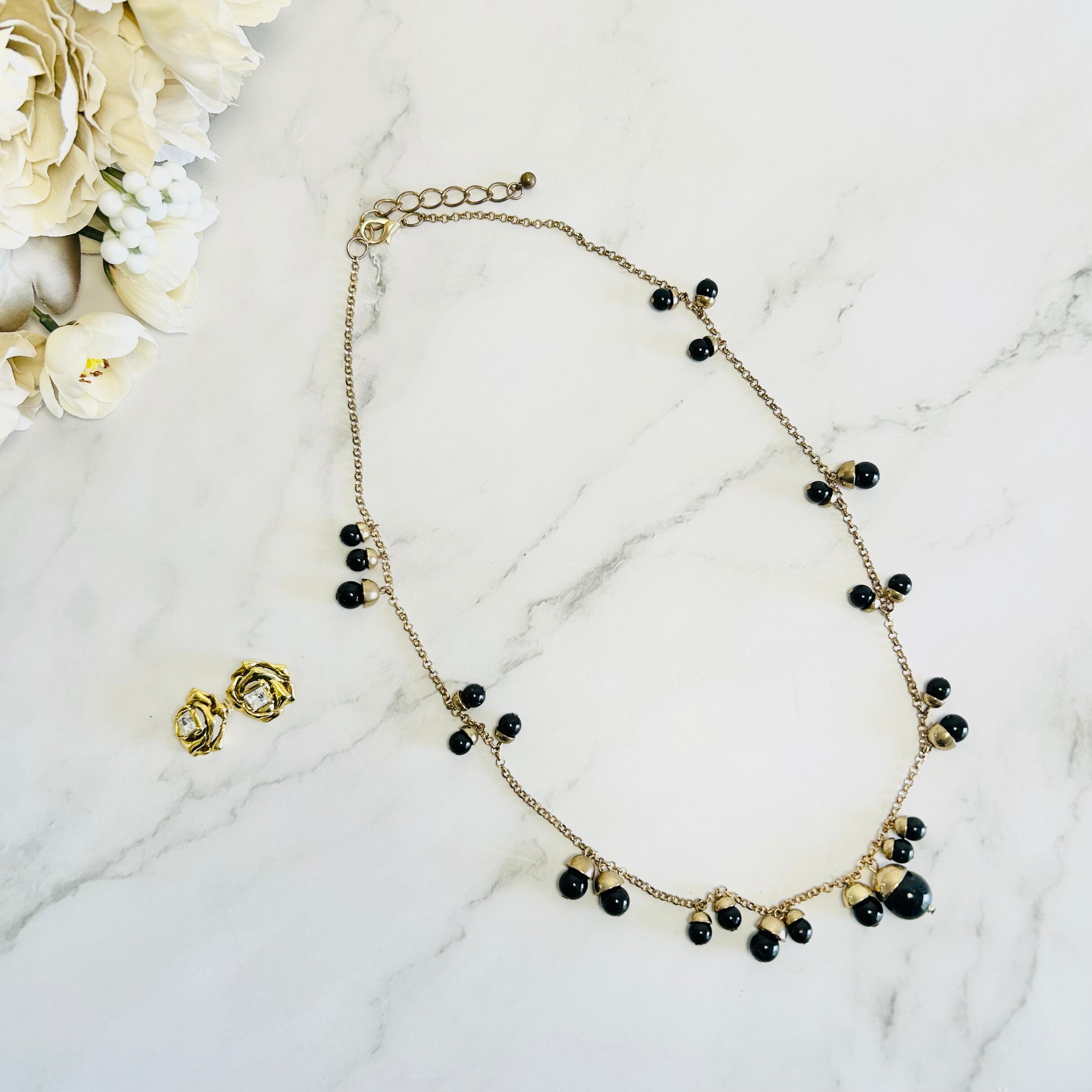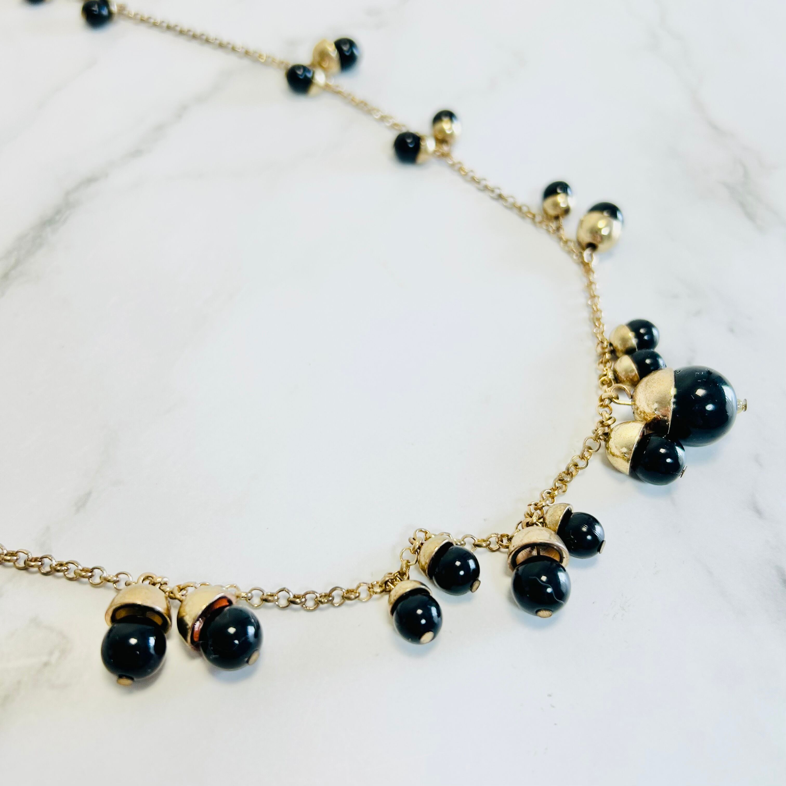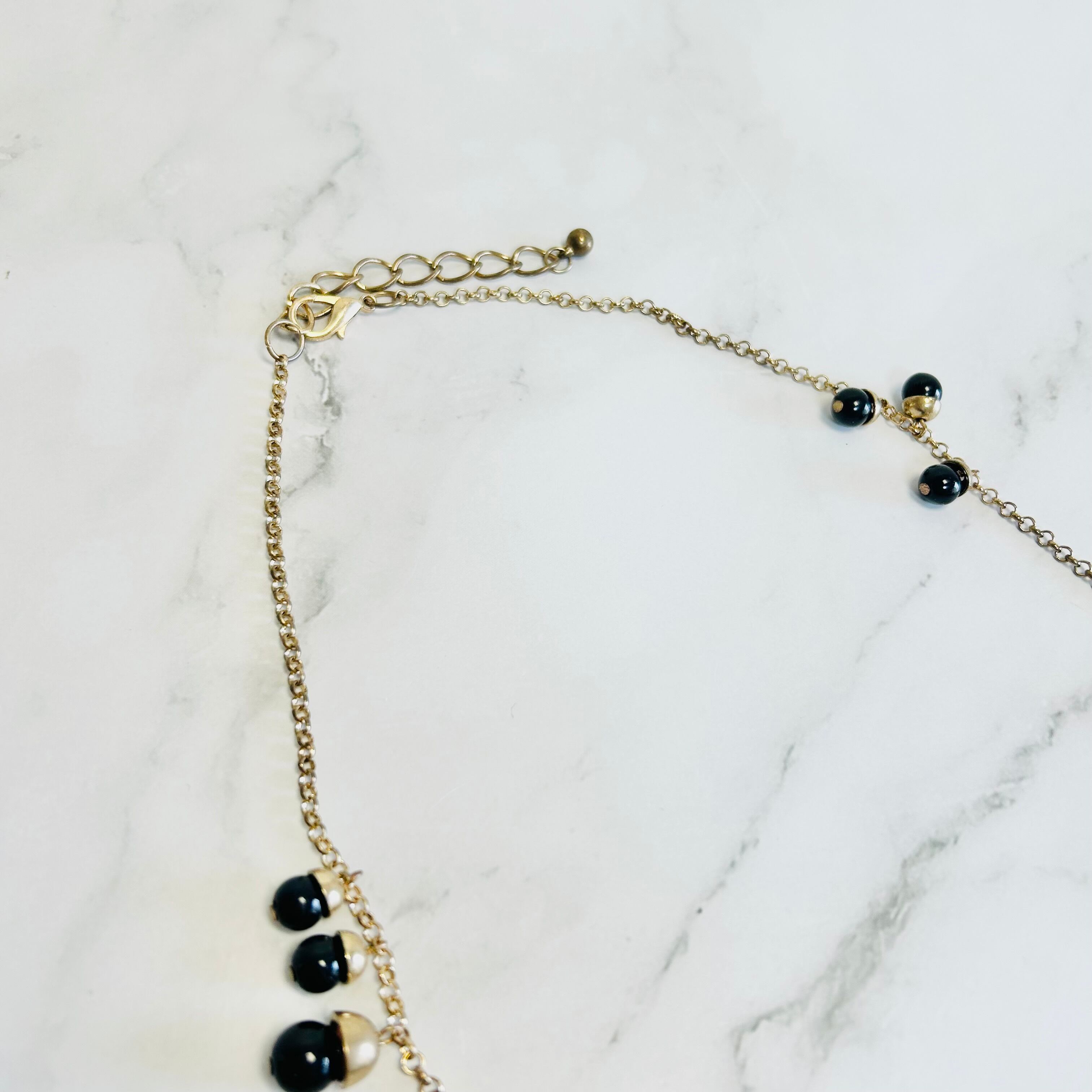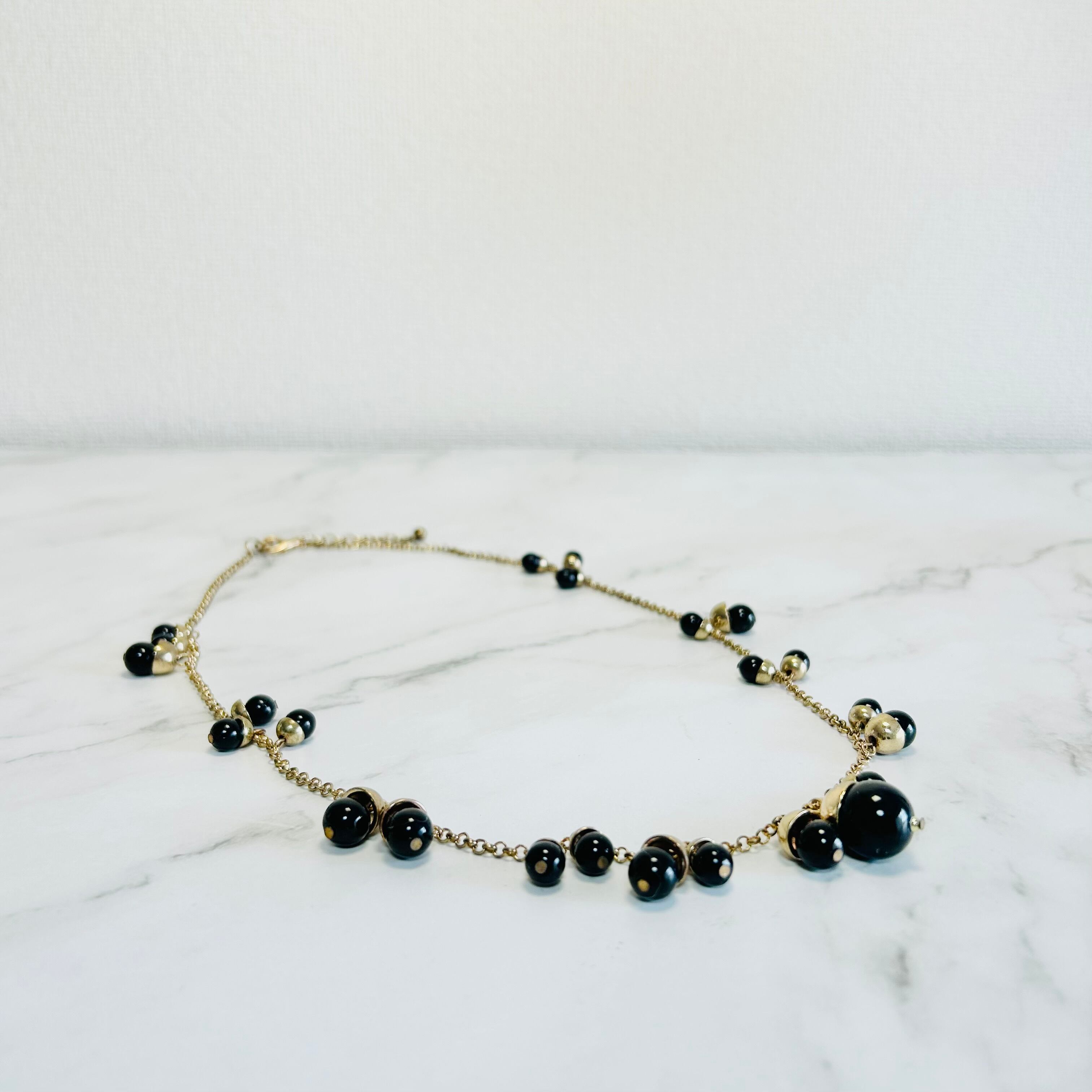 アクリル素材のブラックビーズをアンティークゴールドのパーツと組み合わせたキュートなモチーフを 華奢なチェーンに取り付けたロングタイプのデザインです。