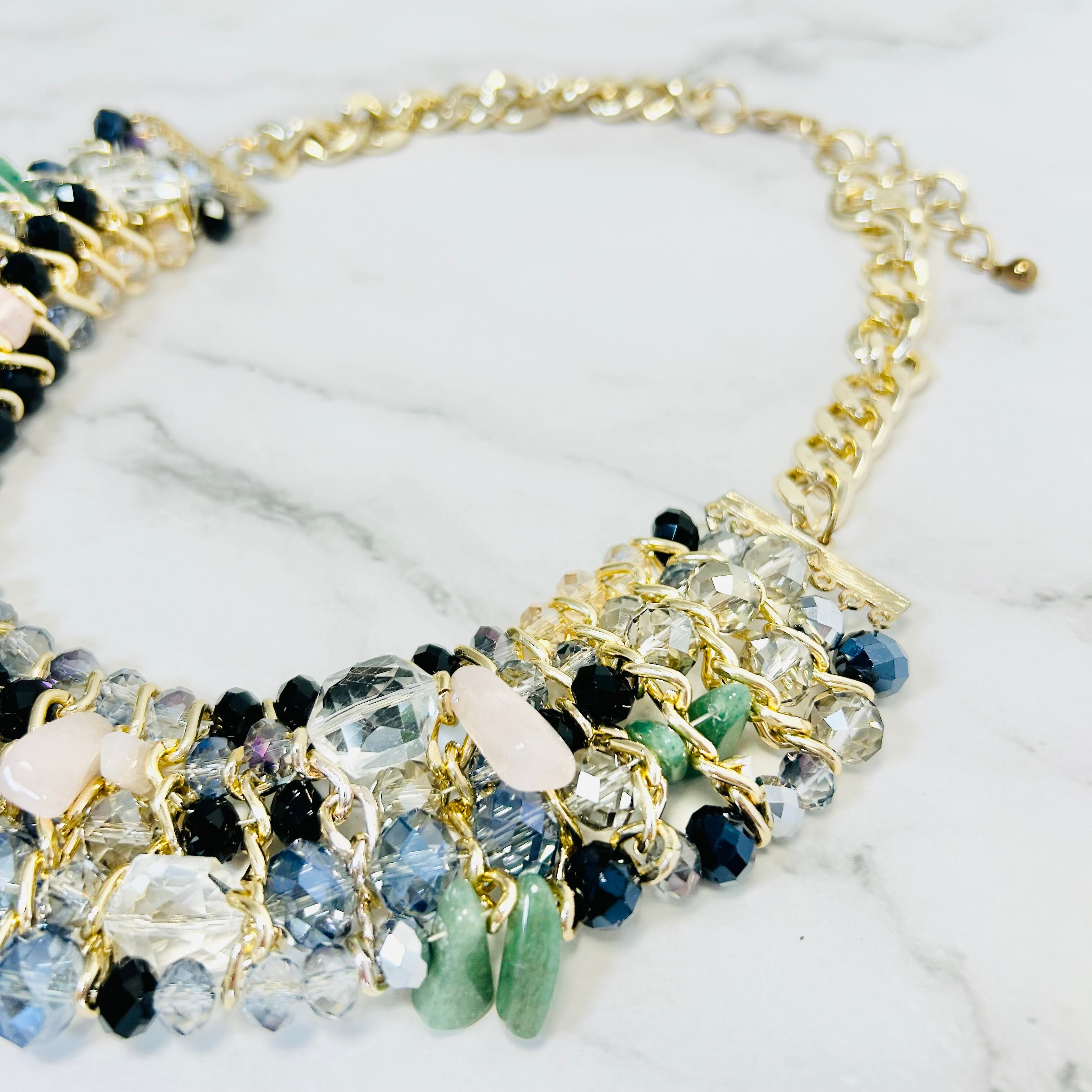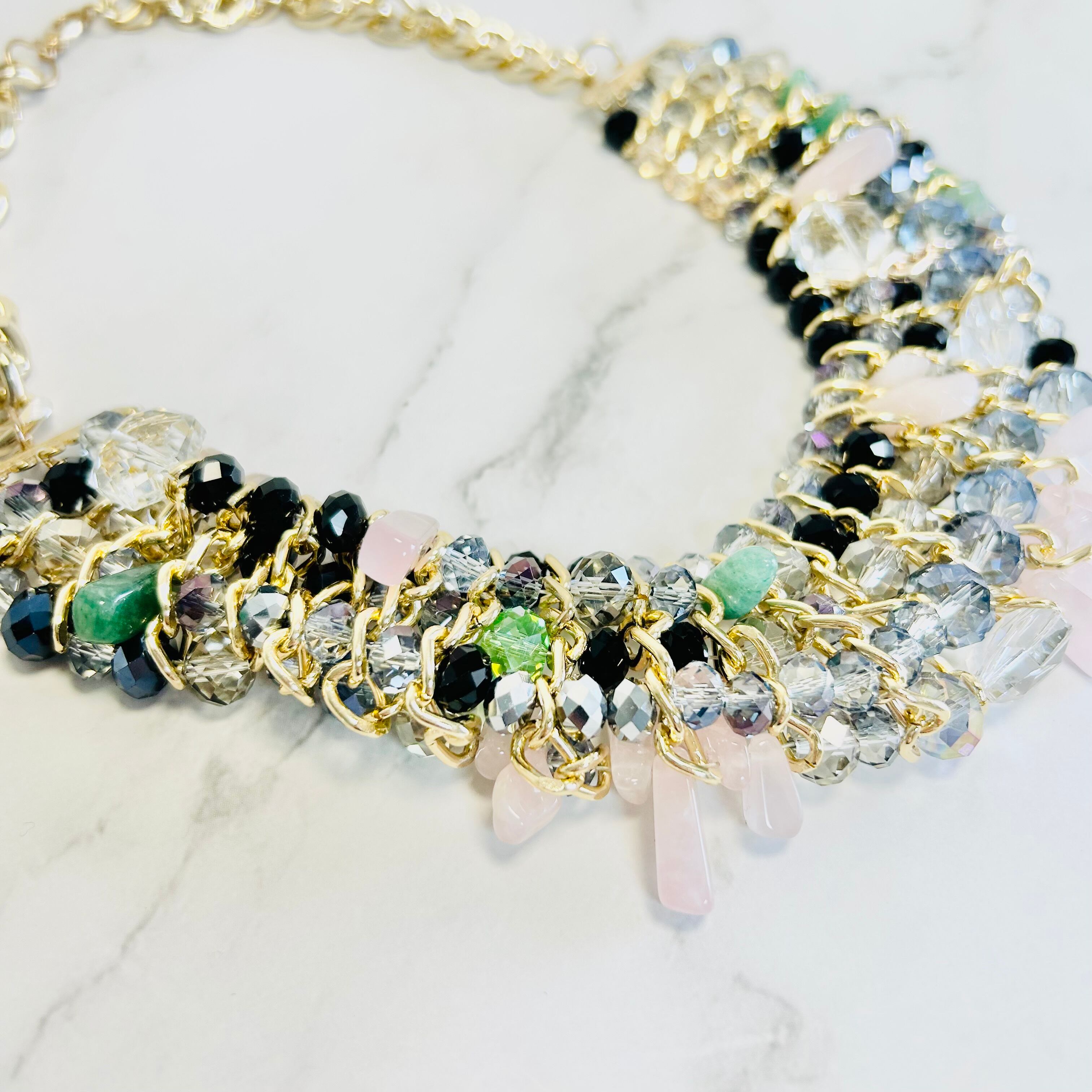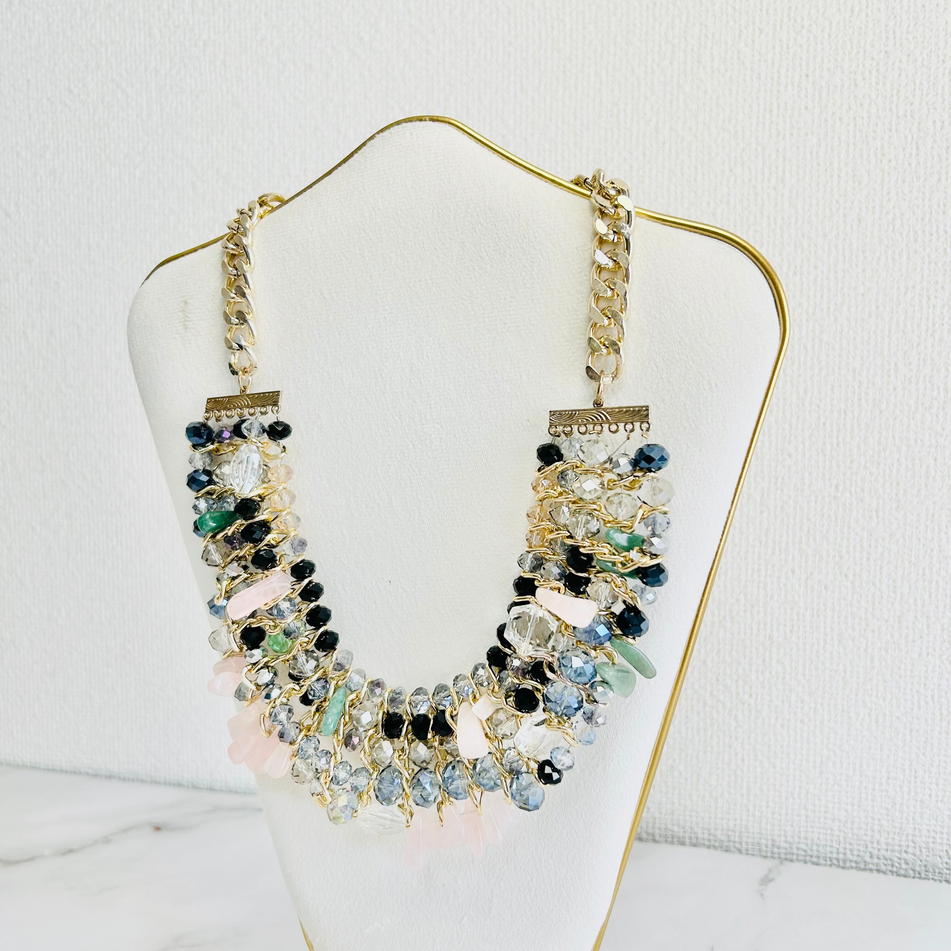 透明感のある天然石やさまざまなサイズとカラーのクリスタルパーツを華やかに飾ったエレガントなデザインです。