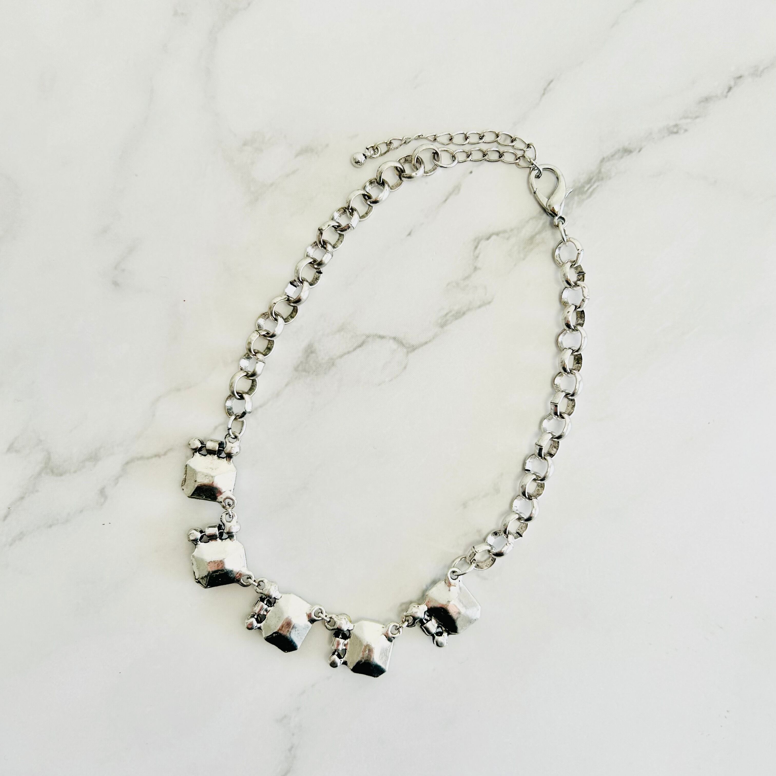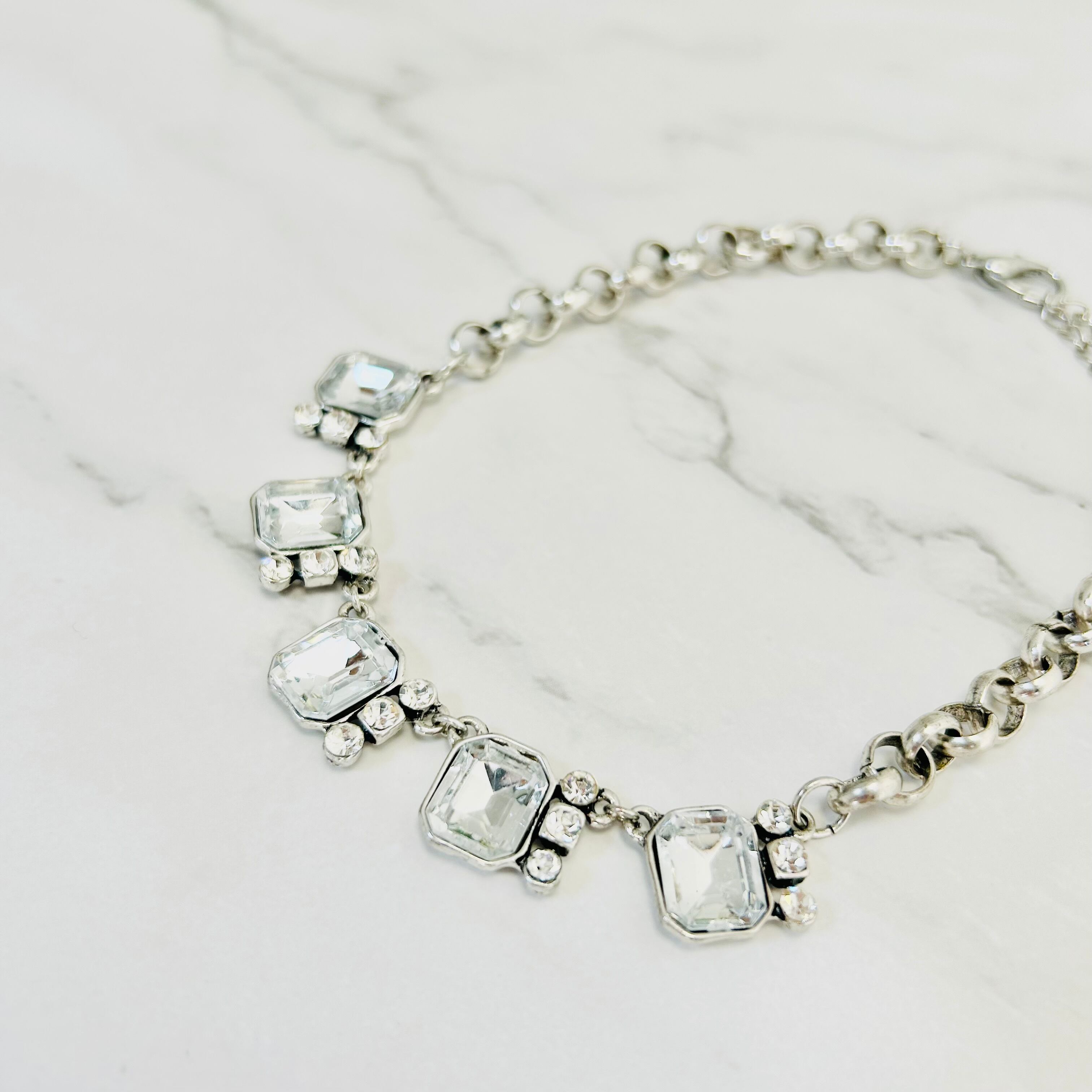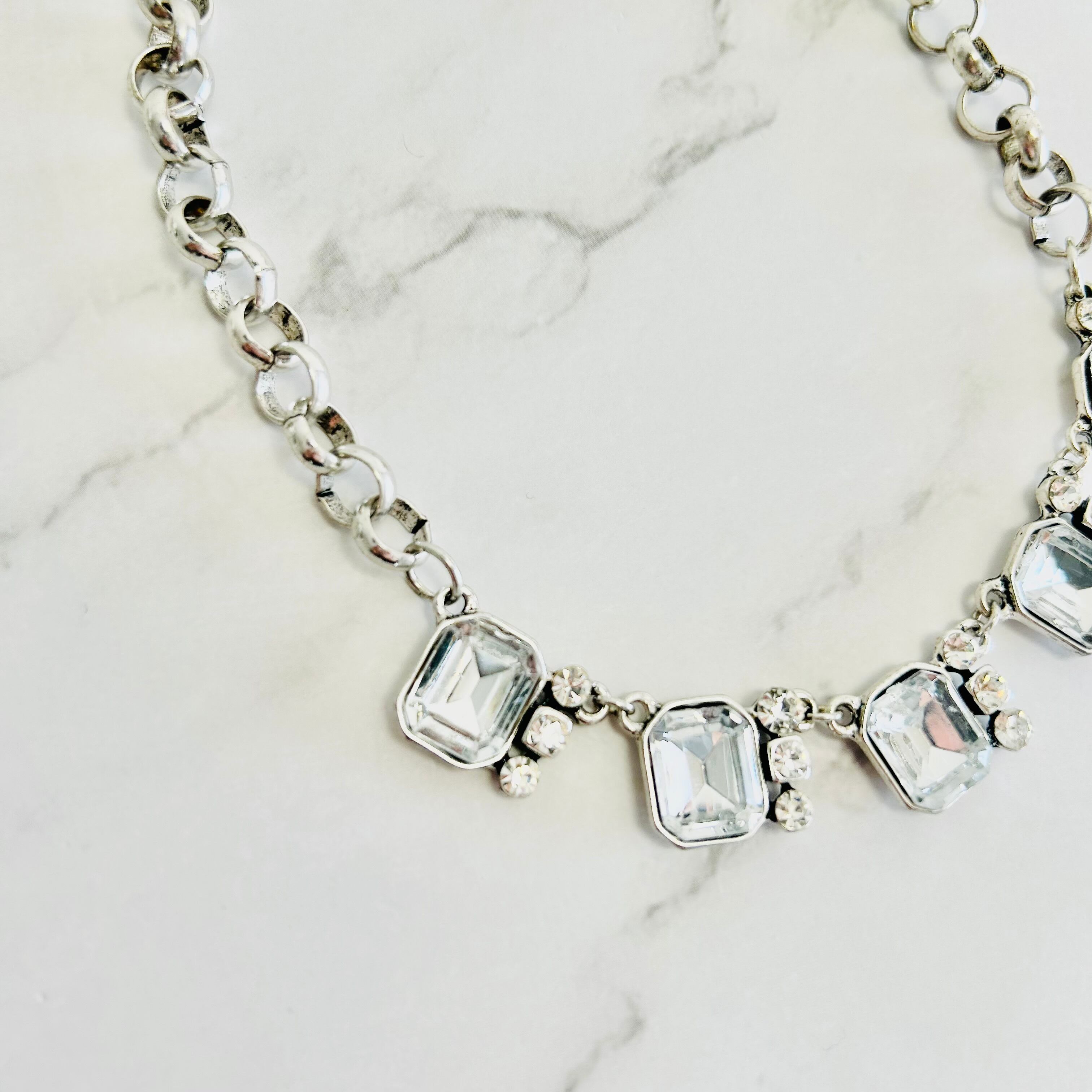 スクエア状のビジューとラインストーンをシルバーチャンキーチェーンに組み合わせし、気品あふれる輝きが印象的なチョーカーデザインです。