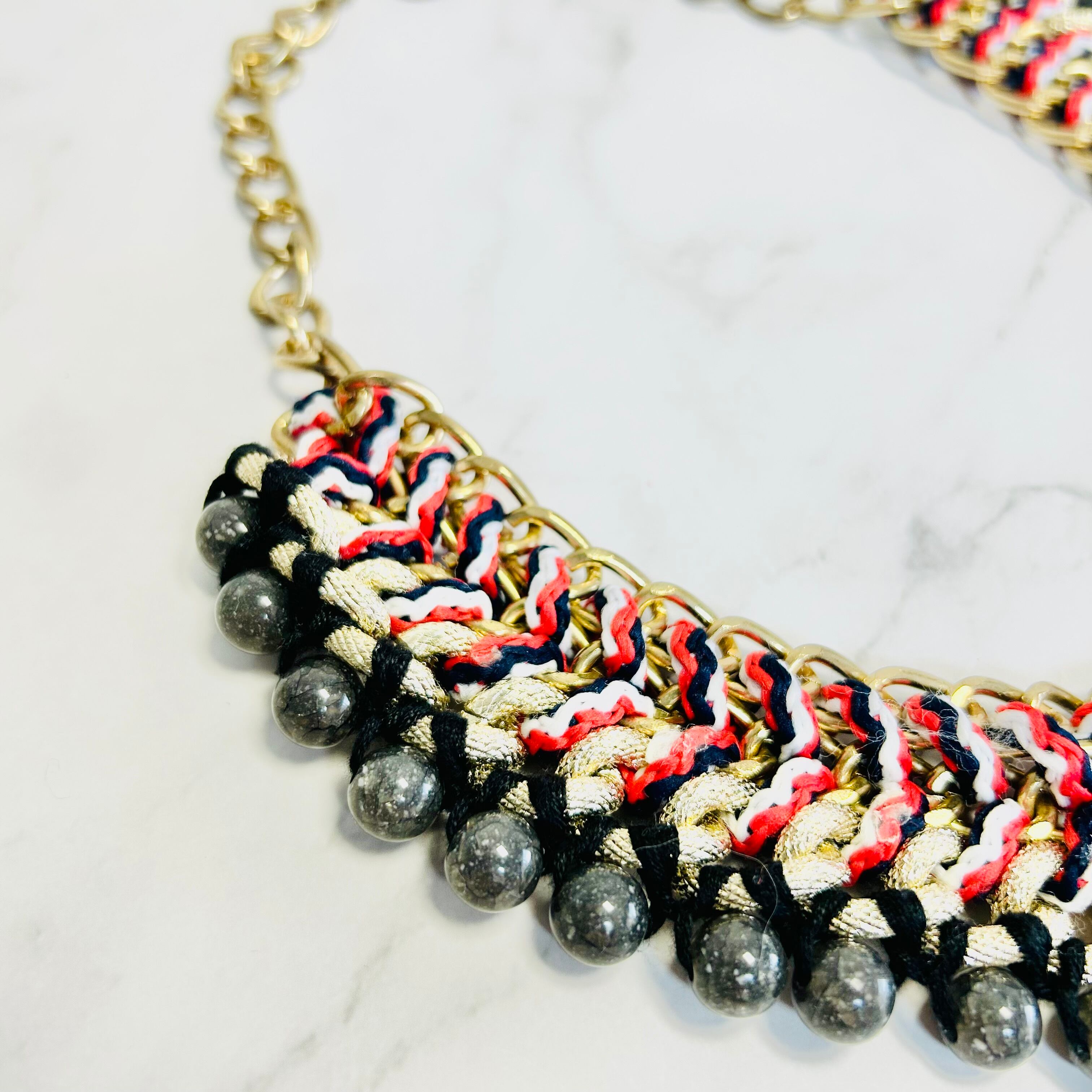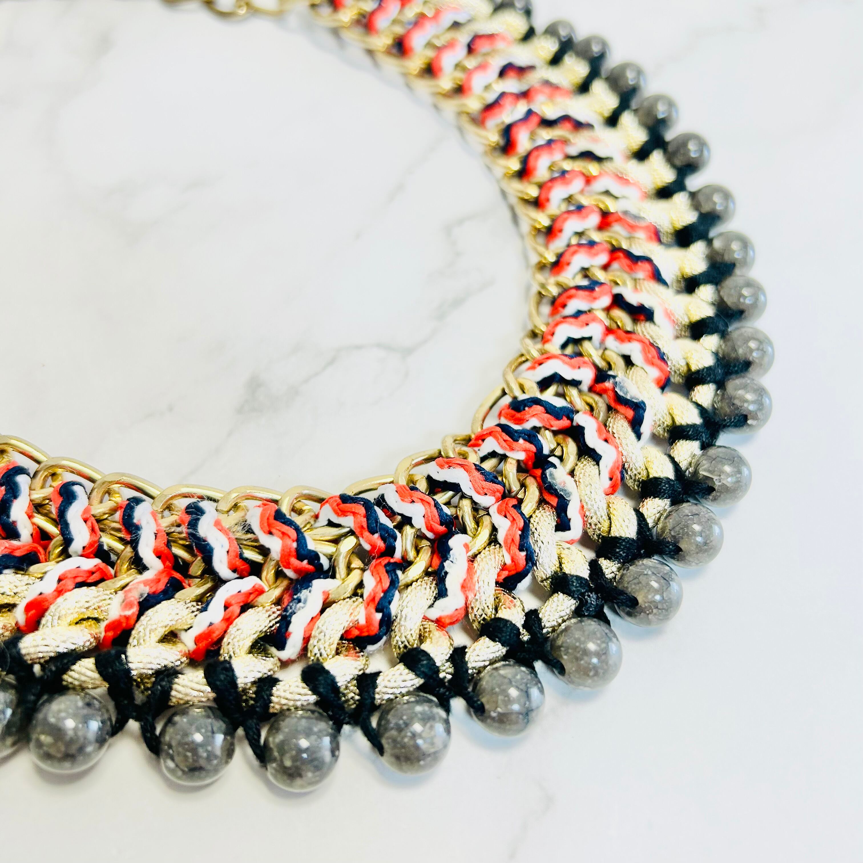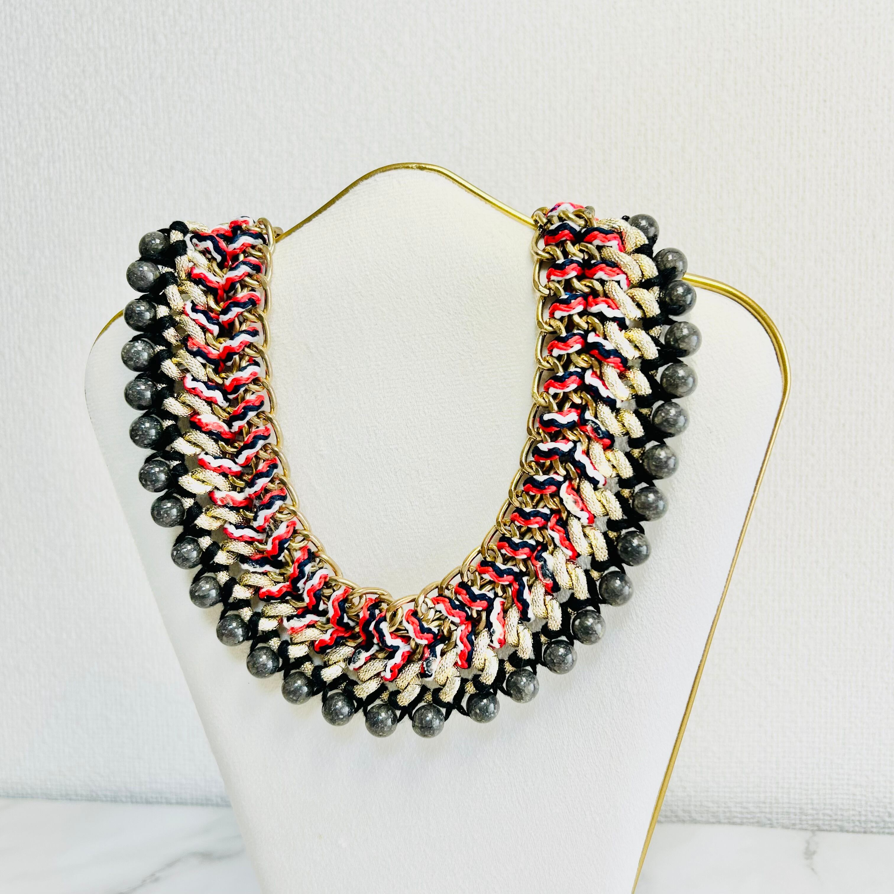 チャンキーチェーンにトリコロールカラーのコードを編みこみ、ストーン調のアクリルパーツでデコレートしたユニークなデザインです。