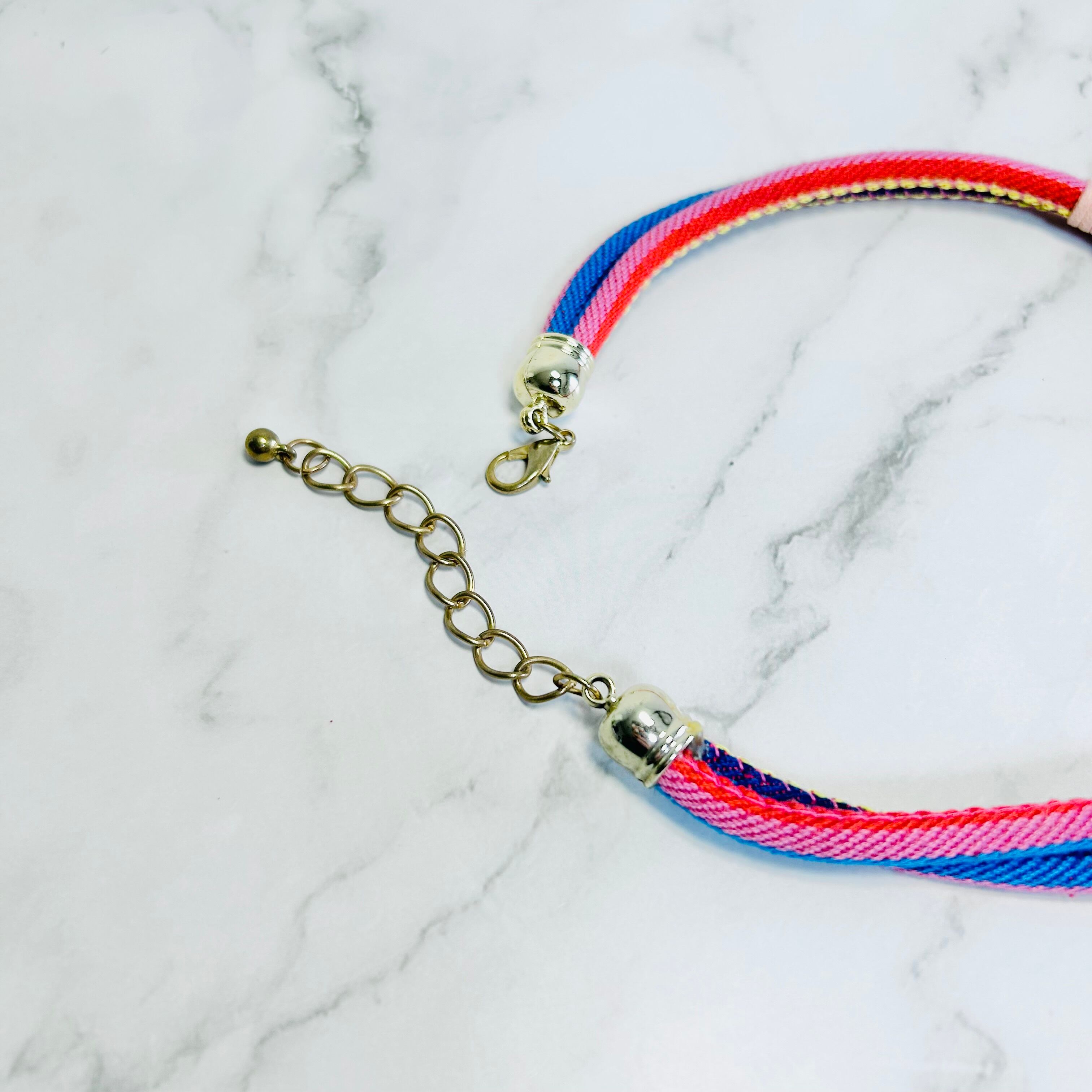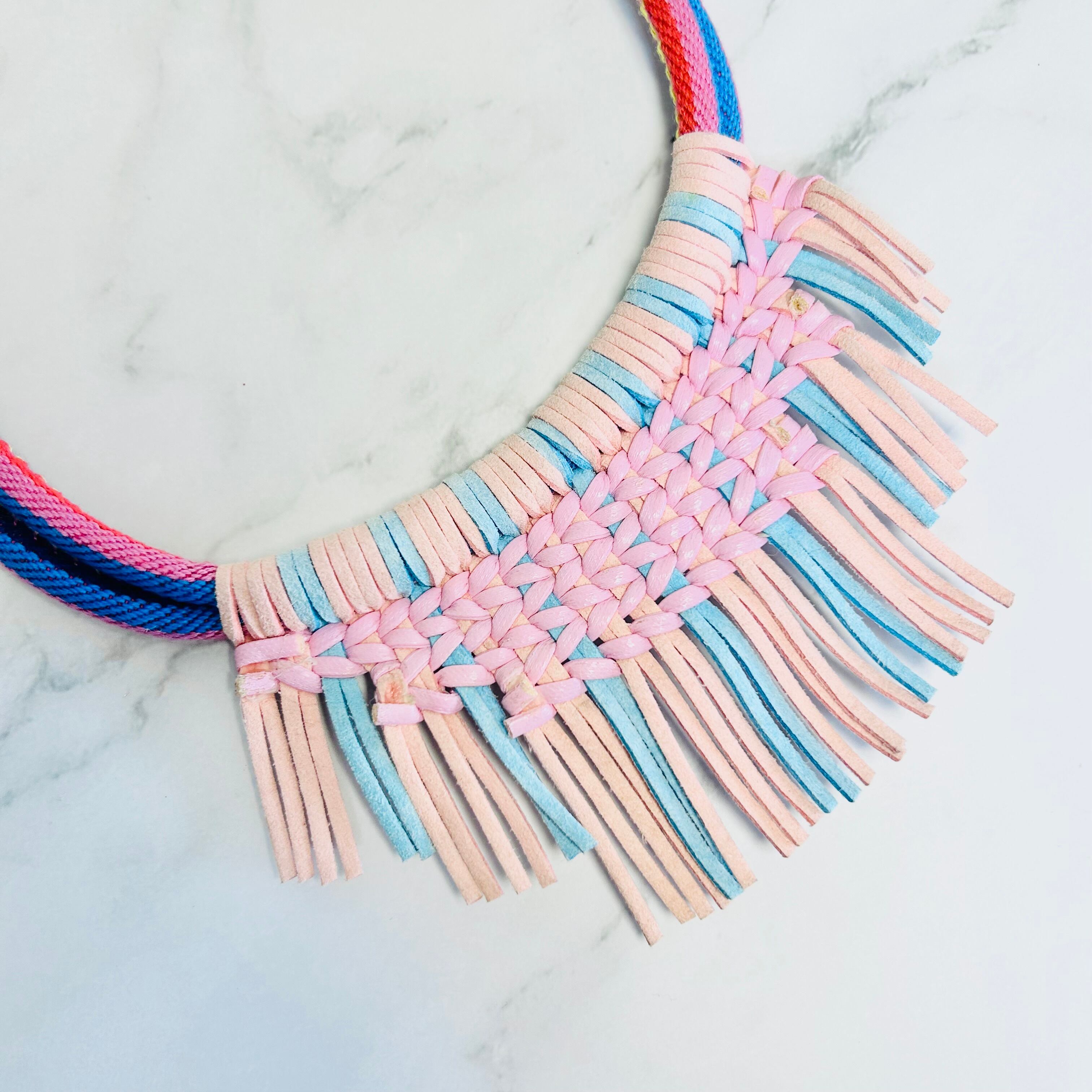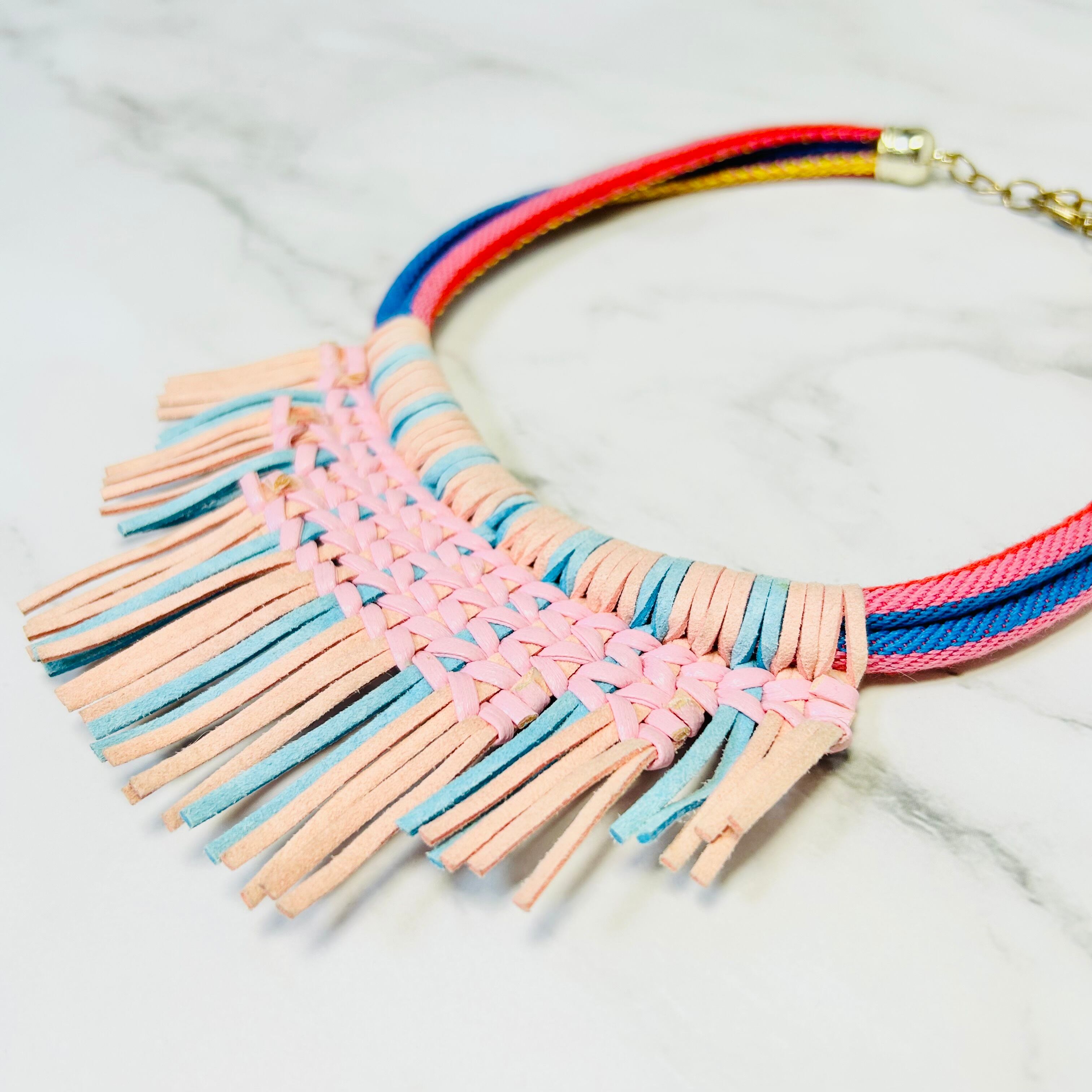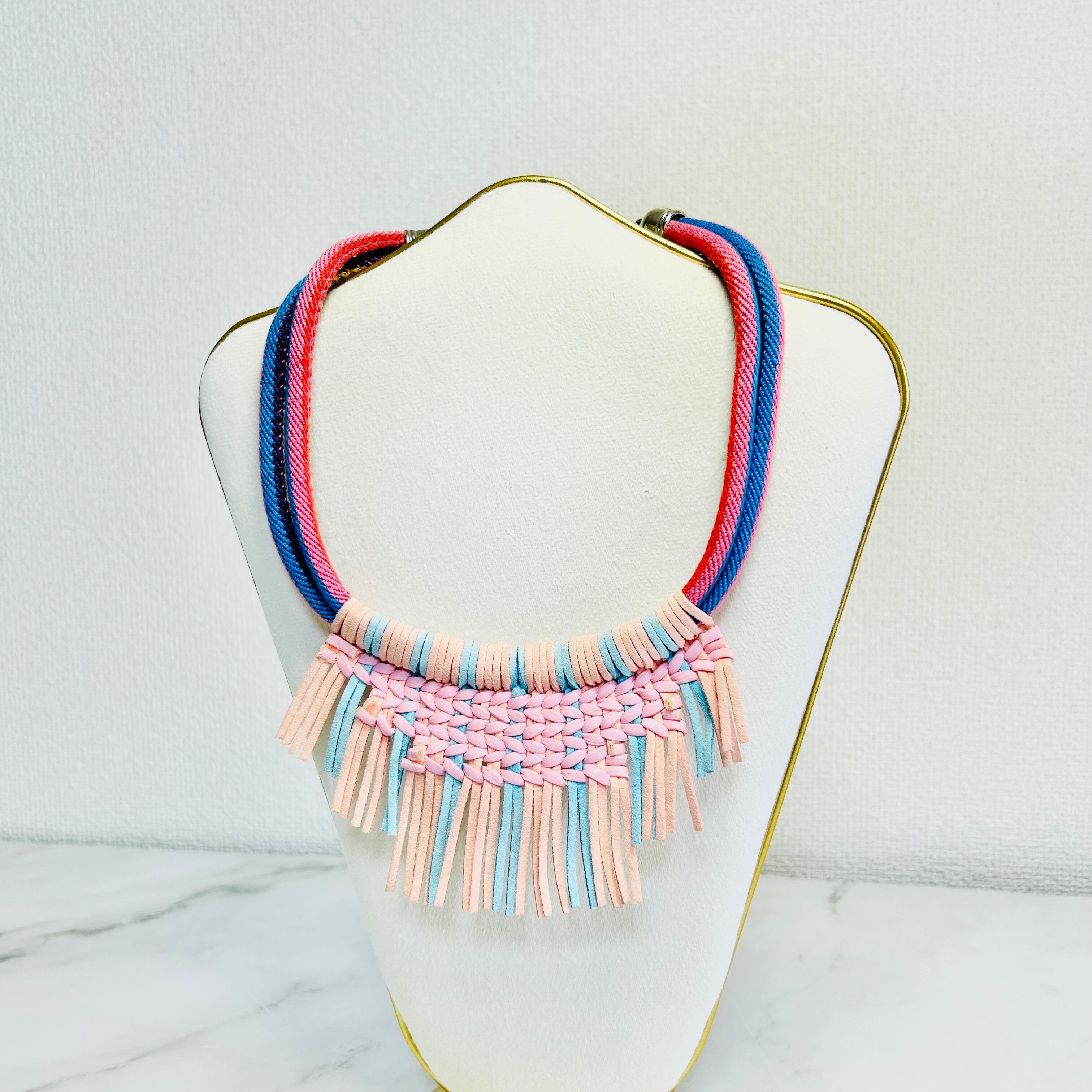 鮮やかなカラーのマルチカラーのコードに、ライトピンクとブルーのレザーコードを編み込み、フリンジのように取り付けたデザインです。