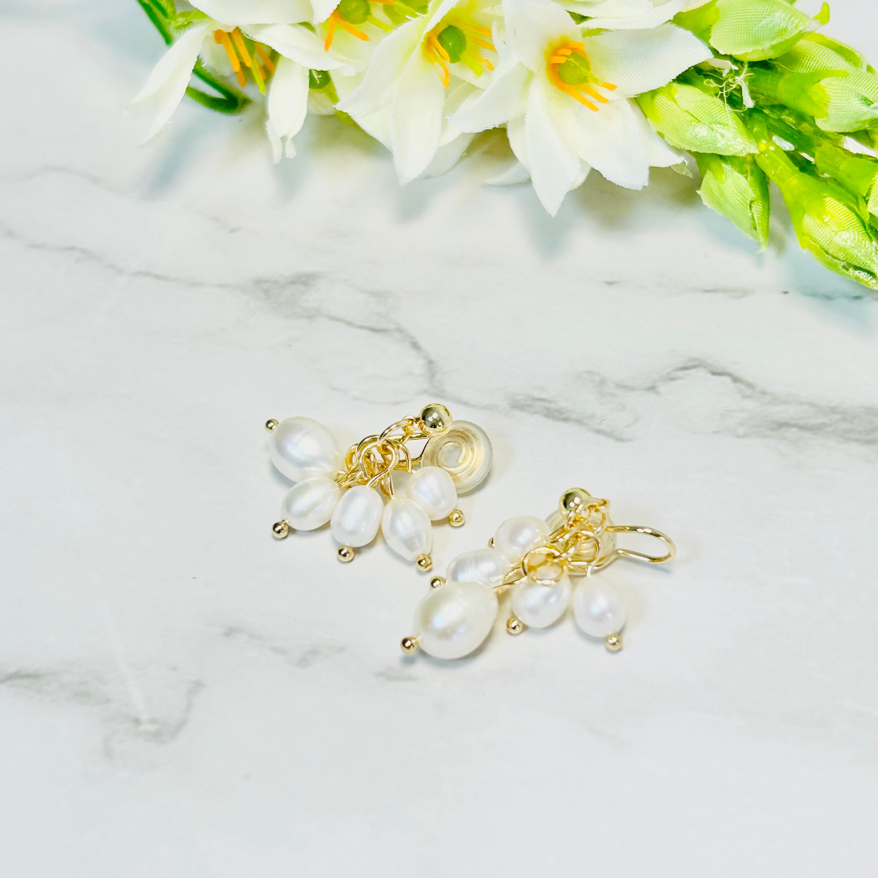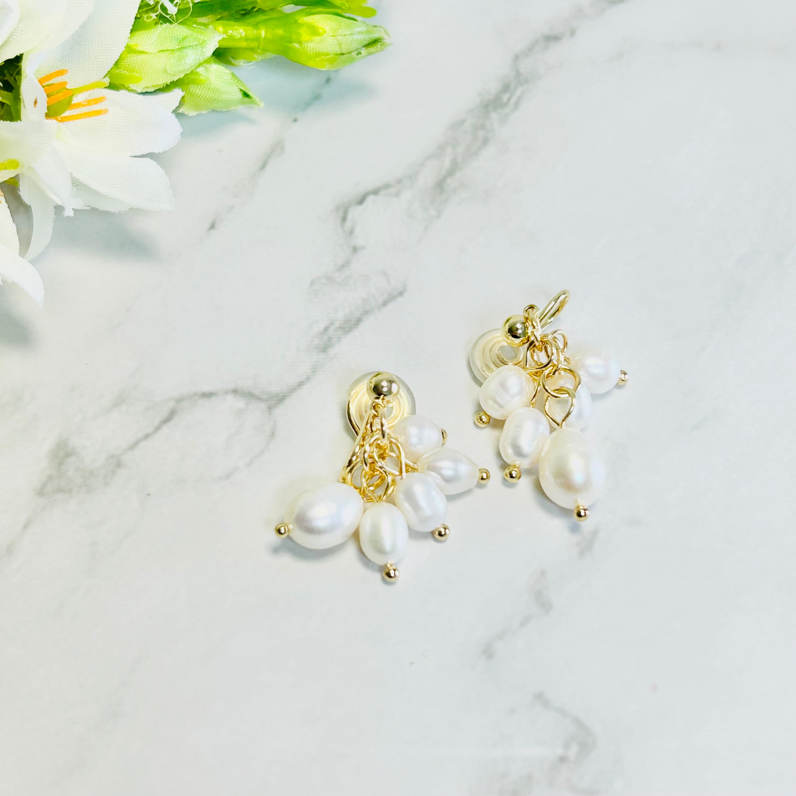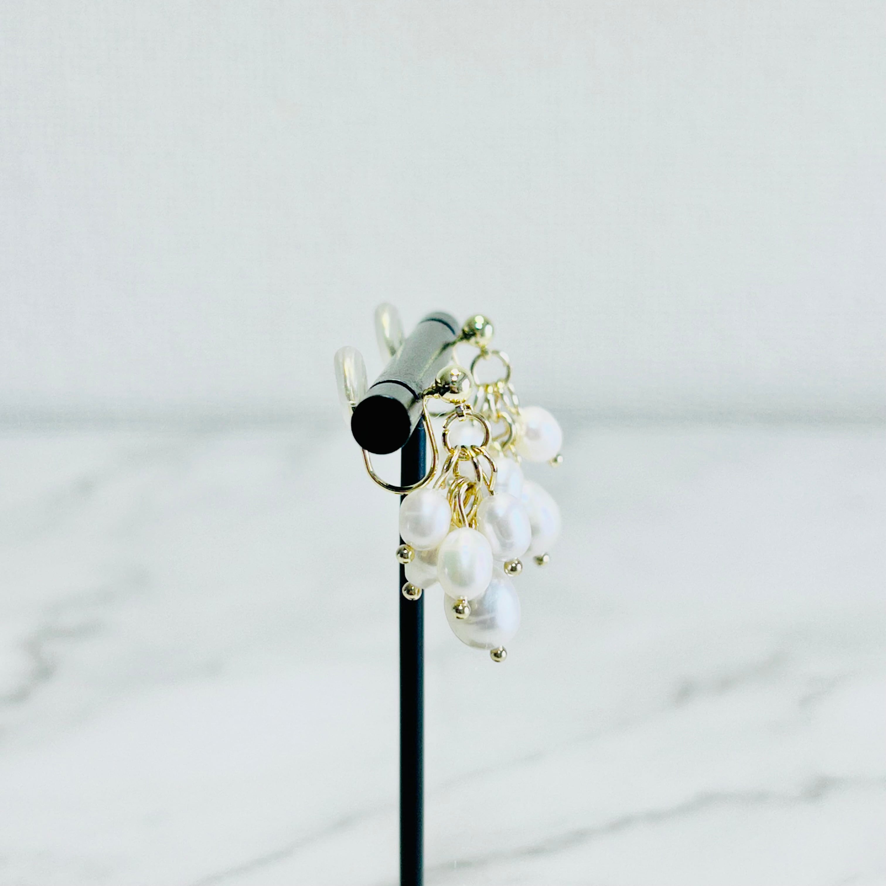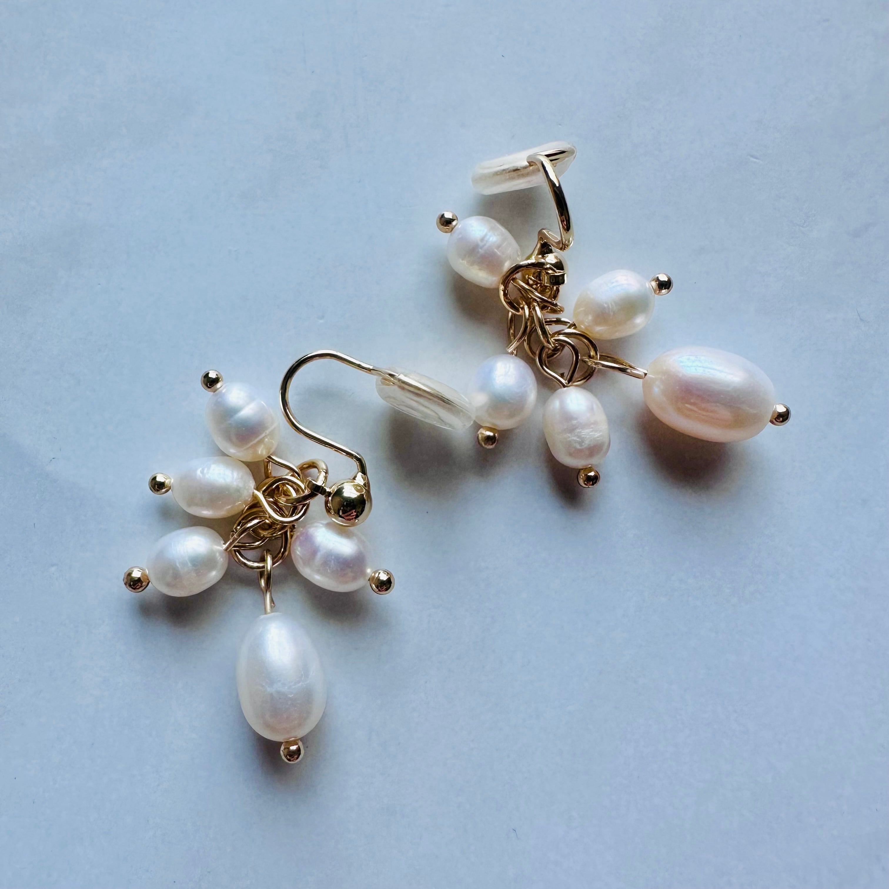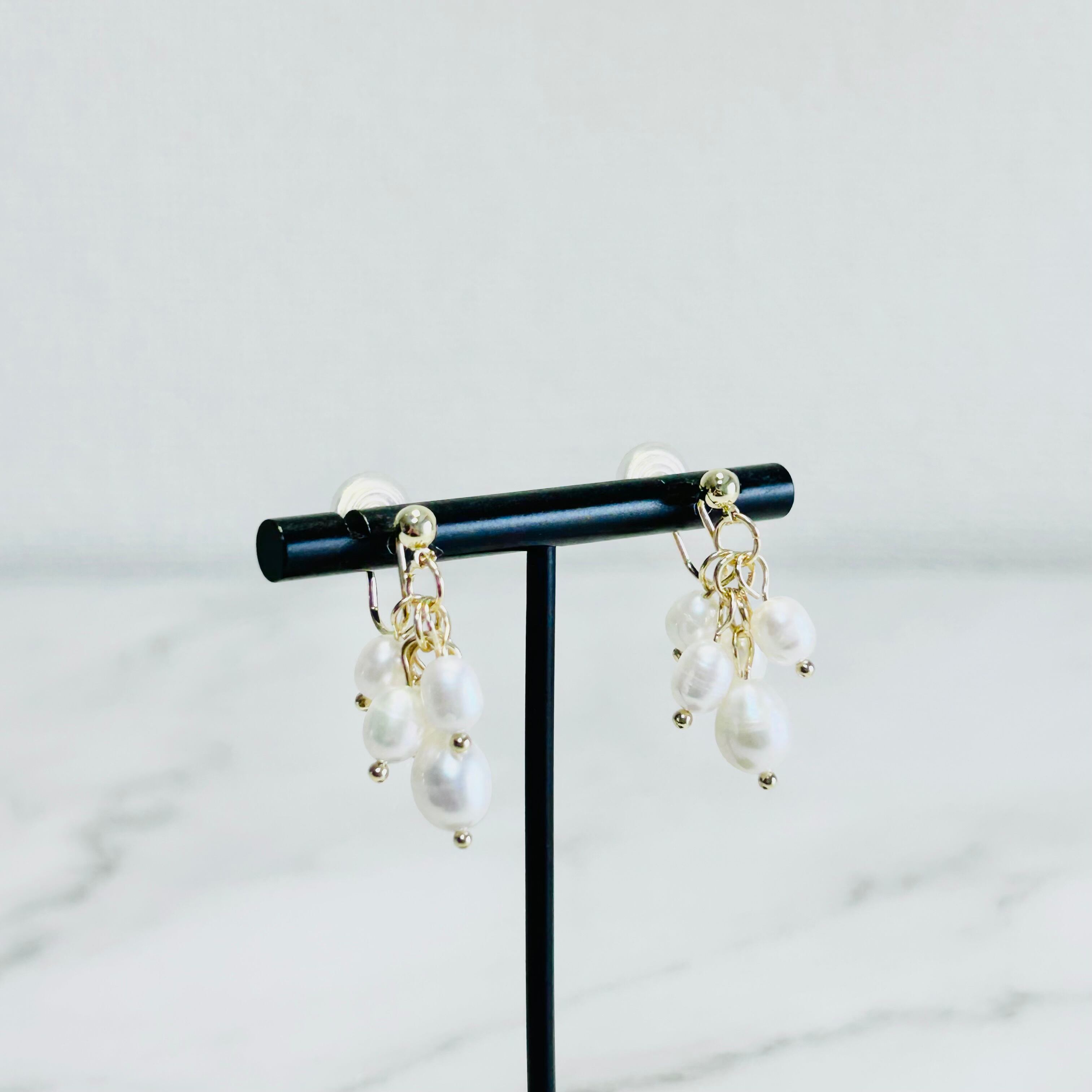 大小の5つの天然淡水パールを使用し、動きがあるように取り付けたデザインです。