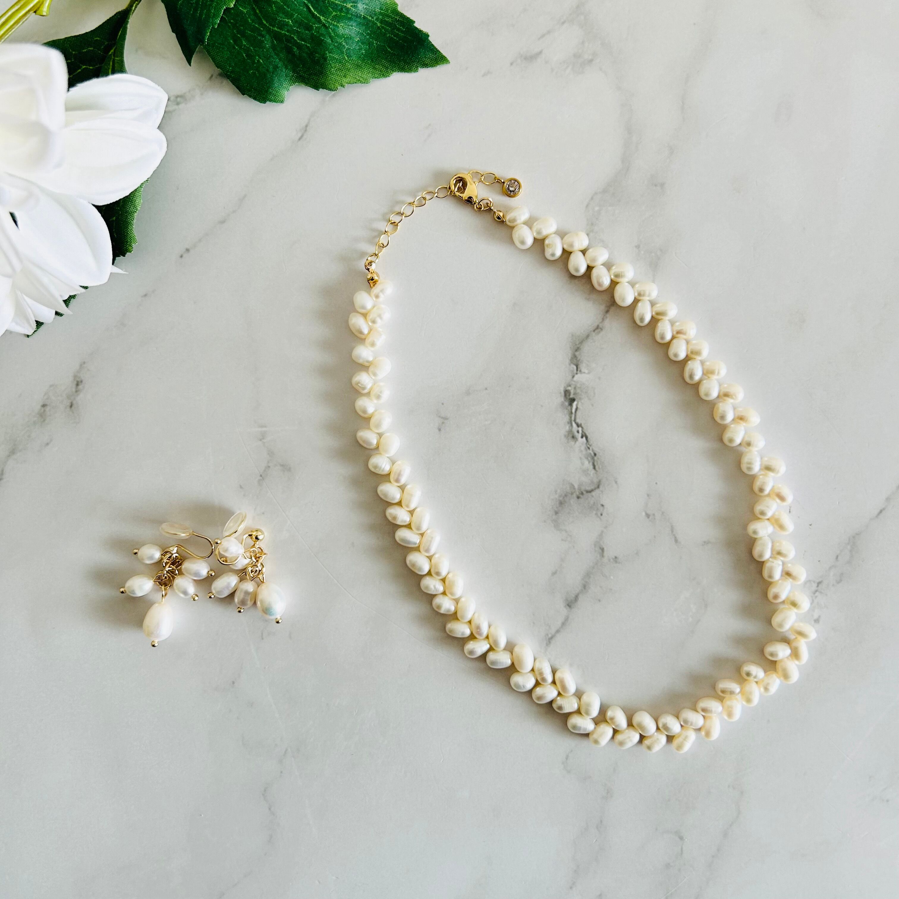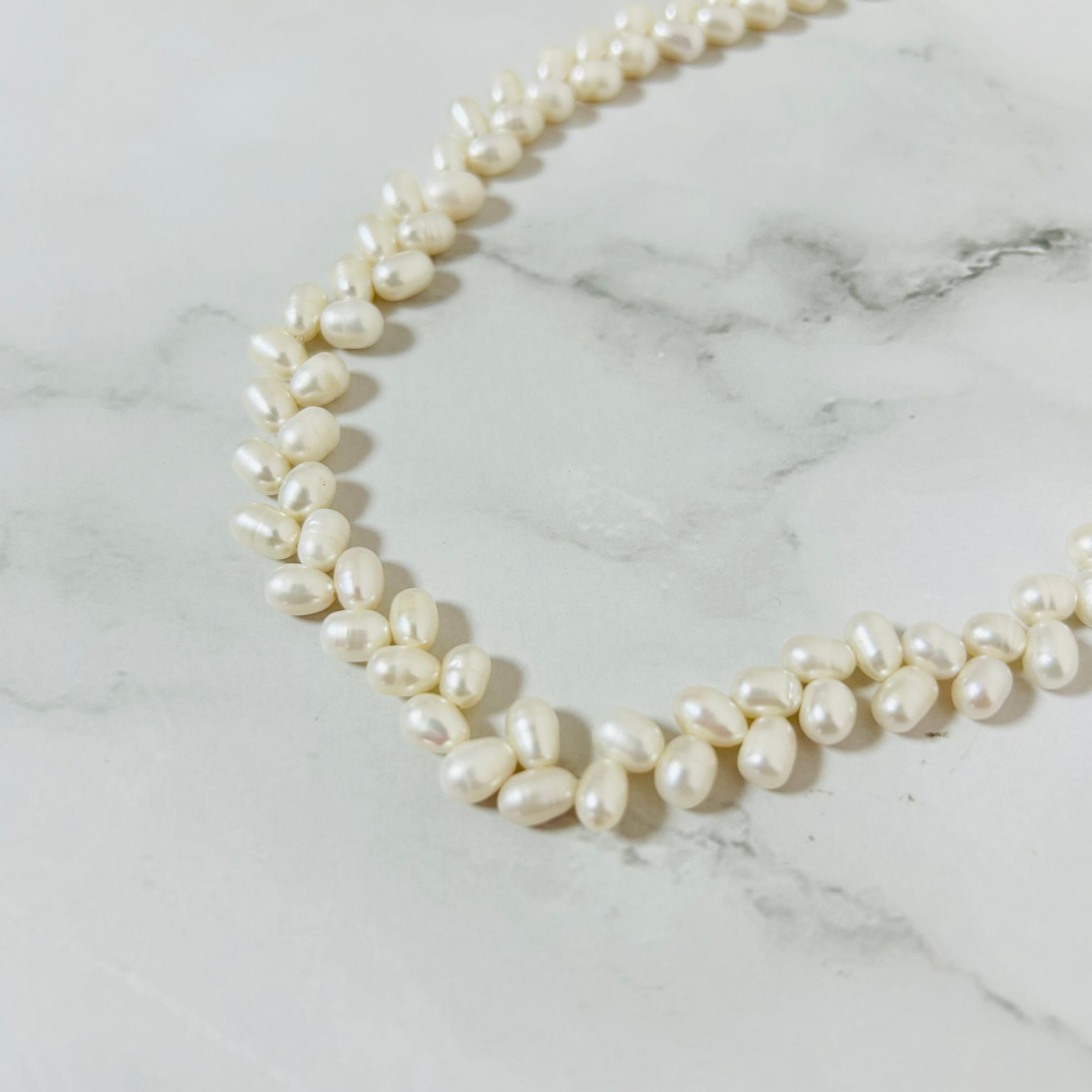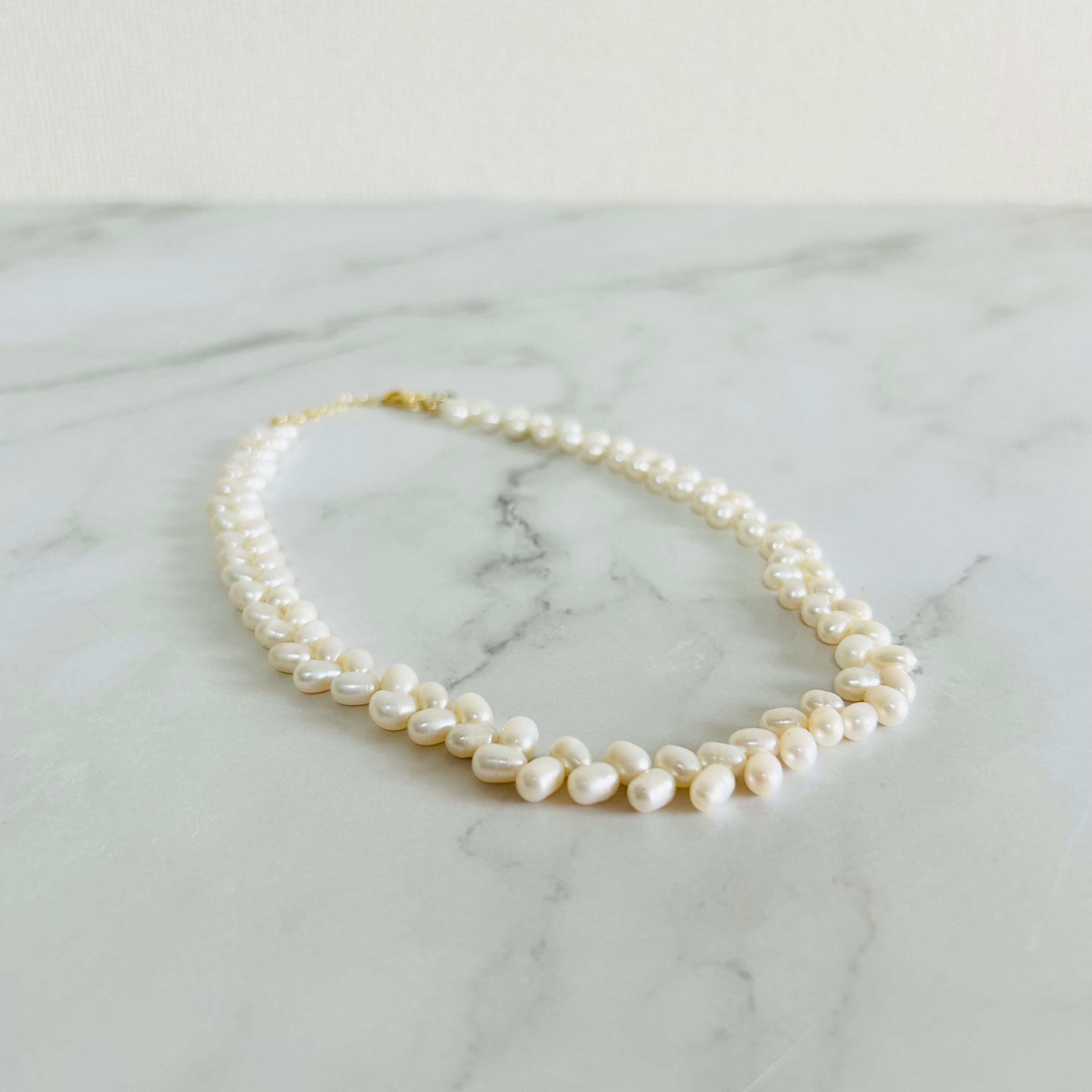 天然の淡水パールをリーフデザインに繋ぎ合わせた上品なデザインです。