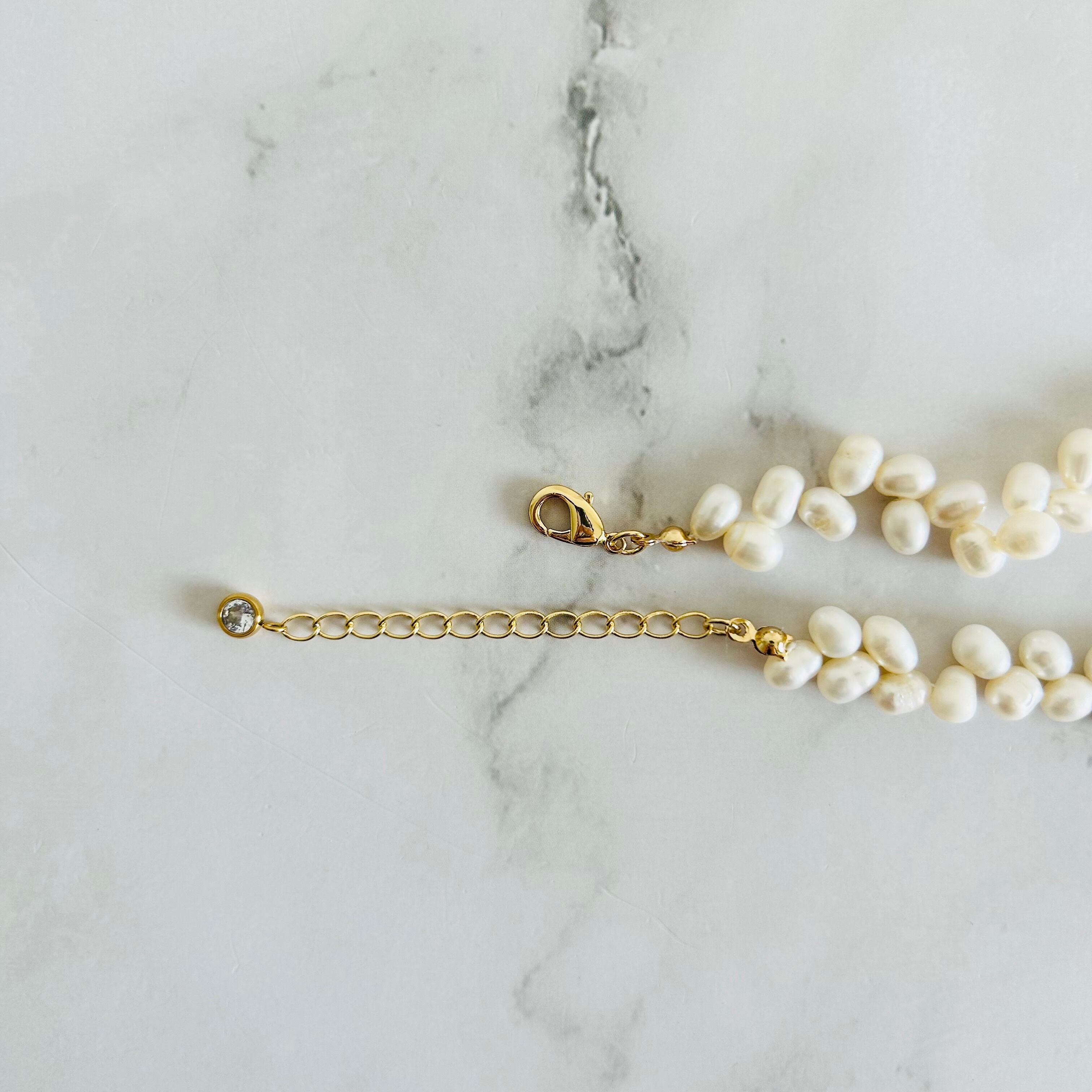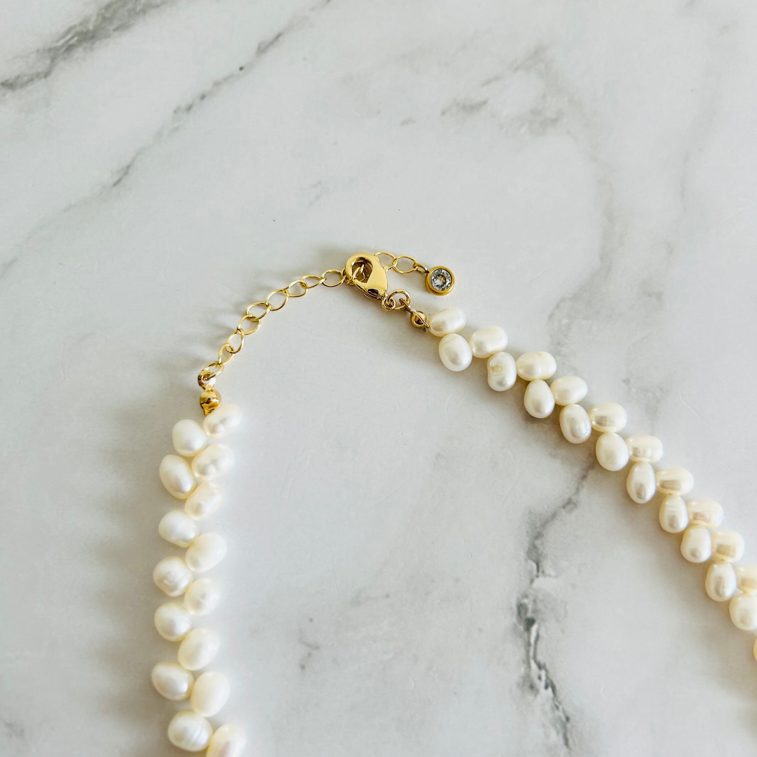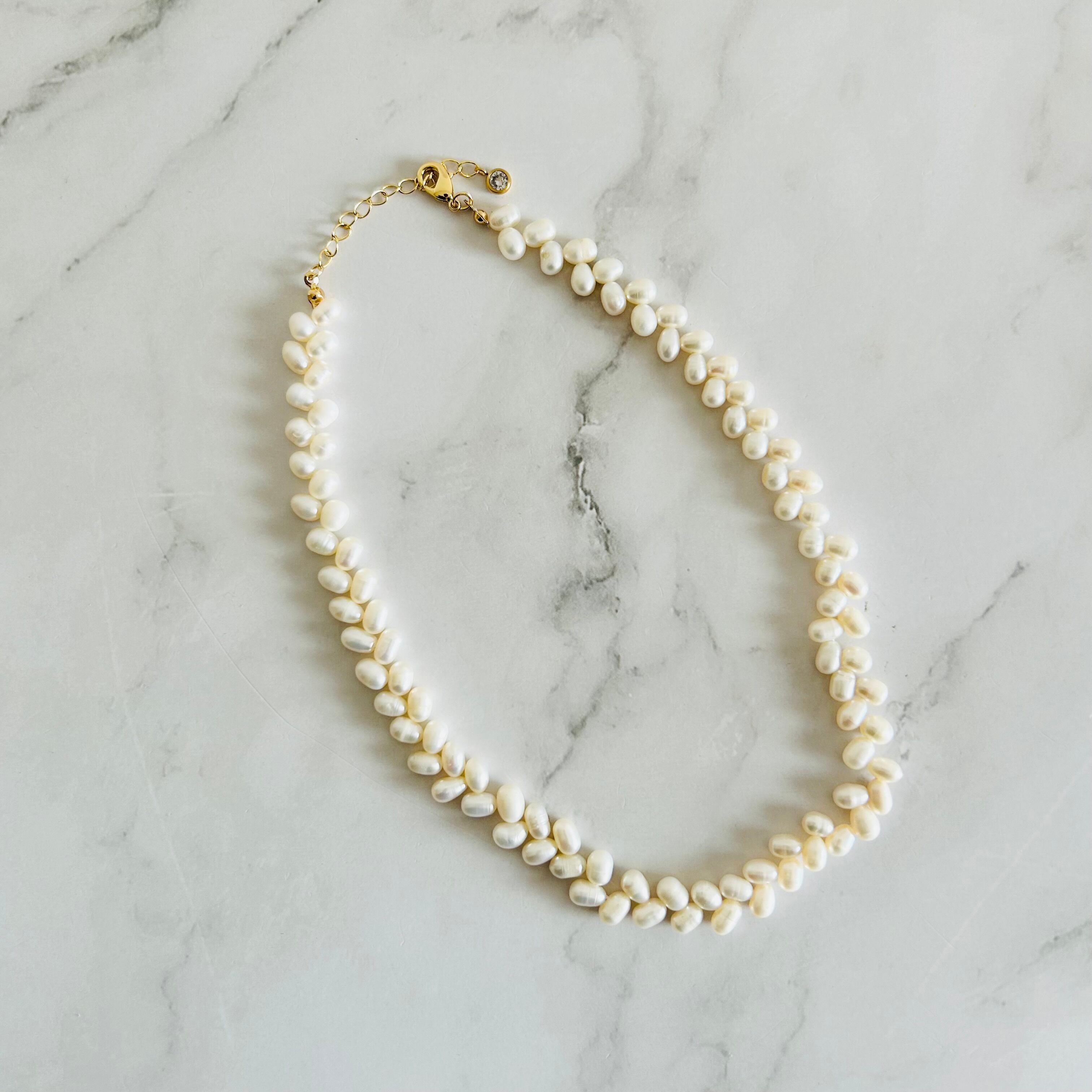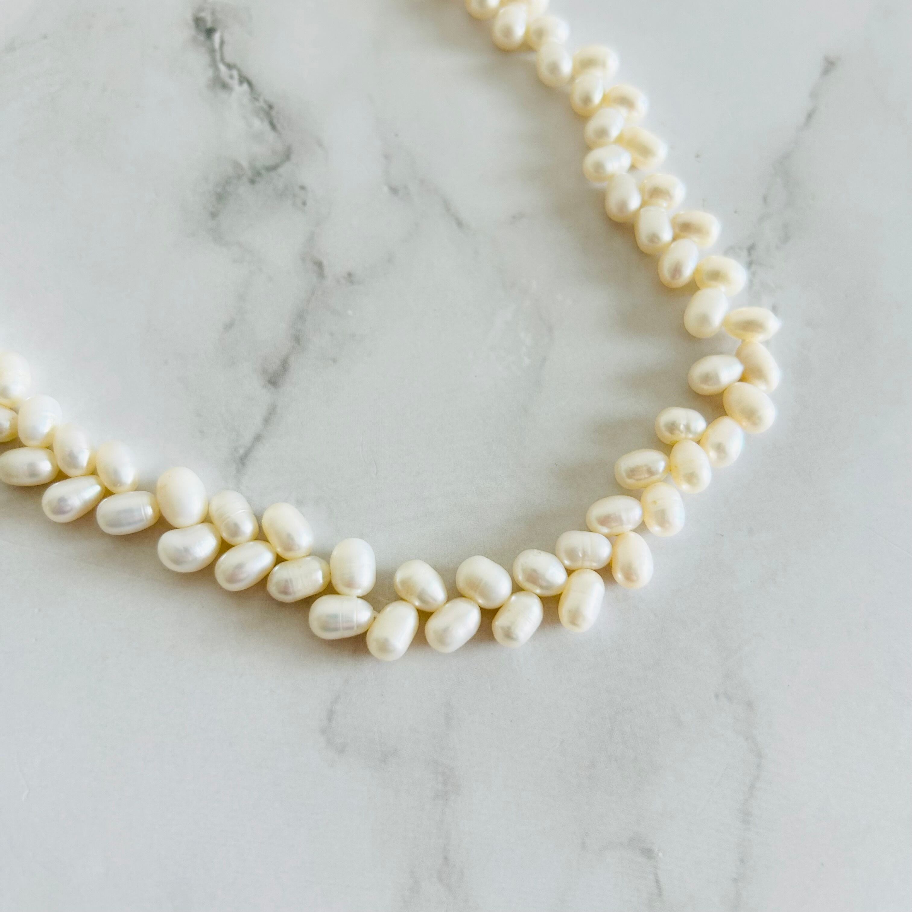 天然の淡水パールをリーフデザインに繋ぎ合わせた上品なデザインです。