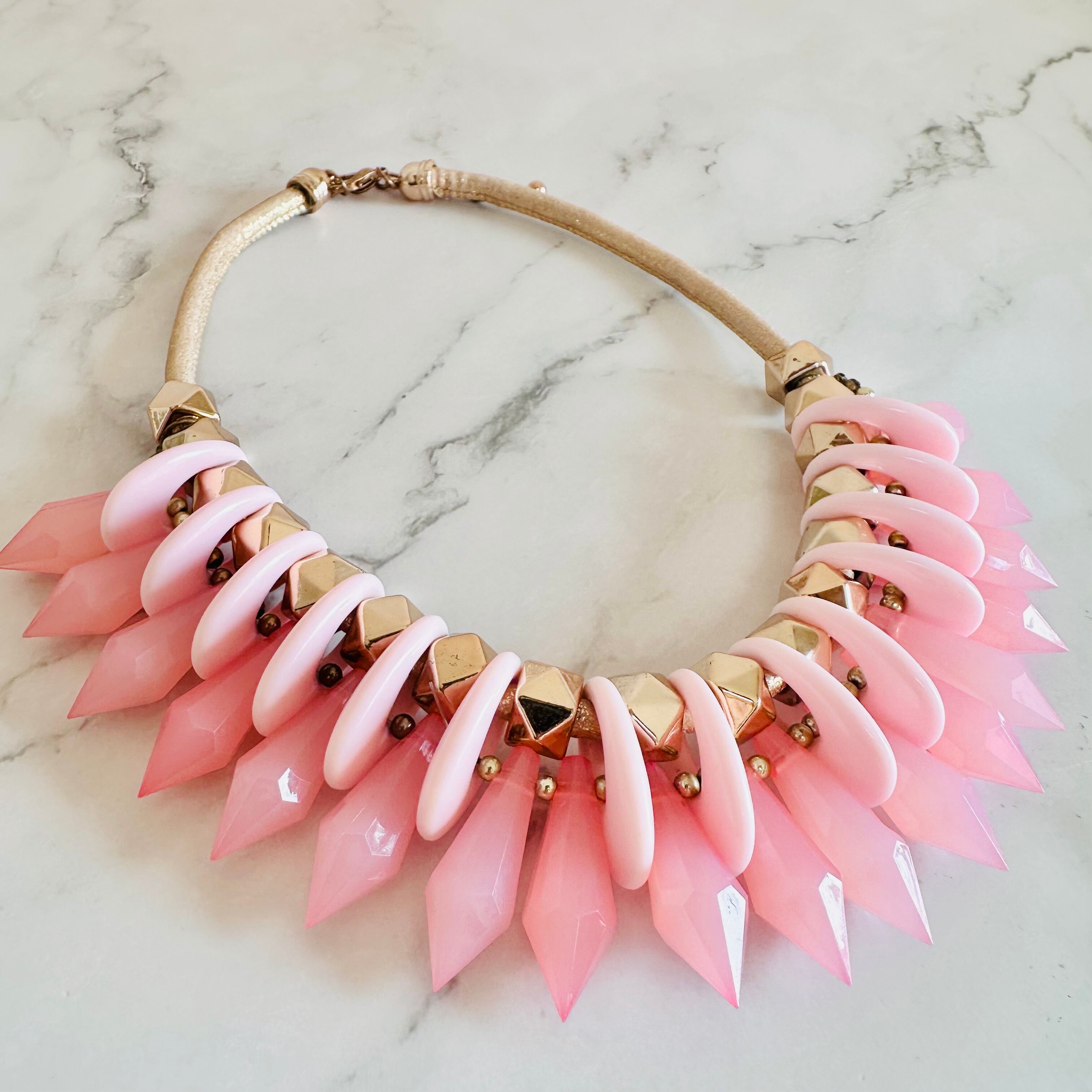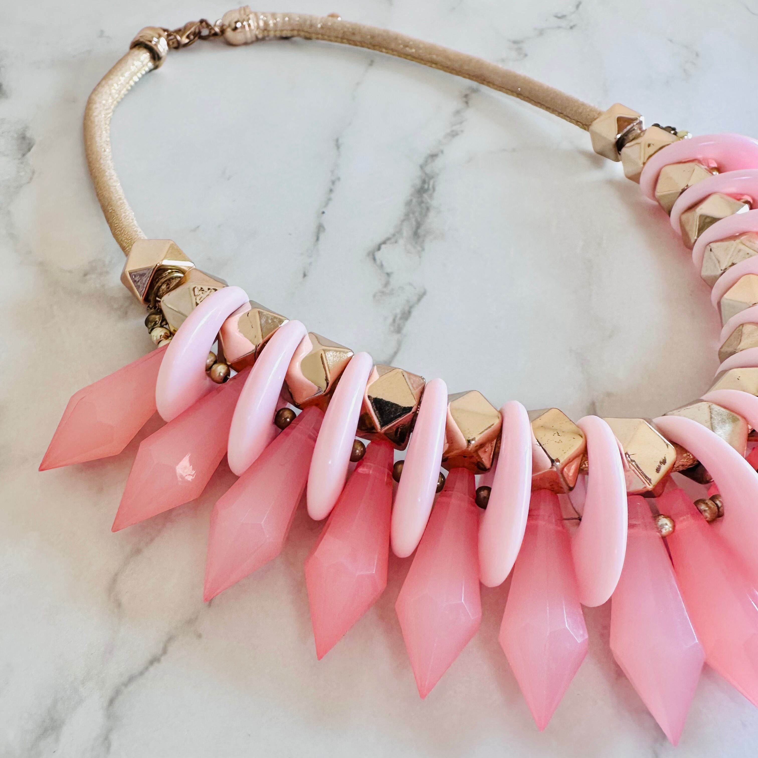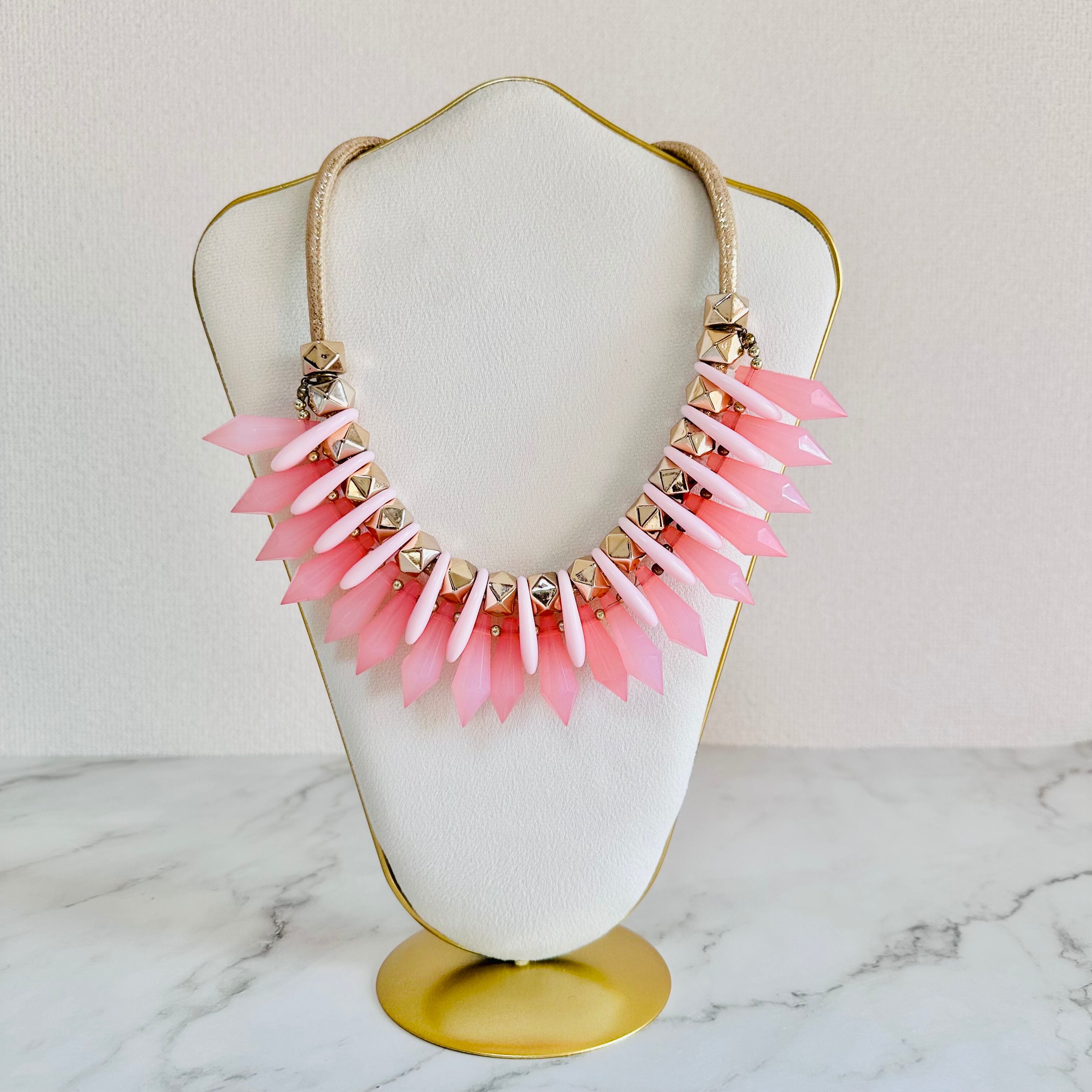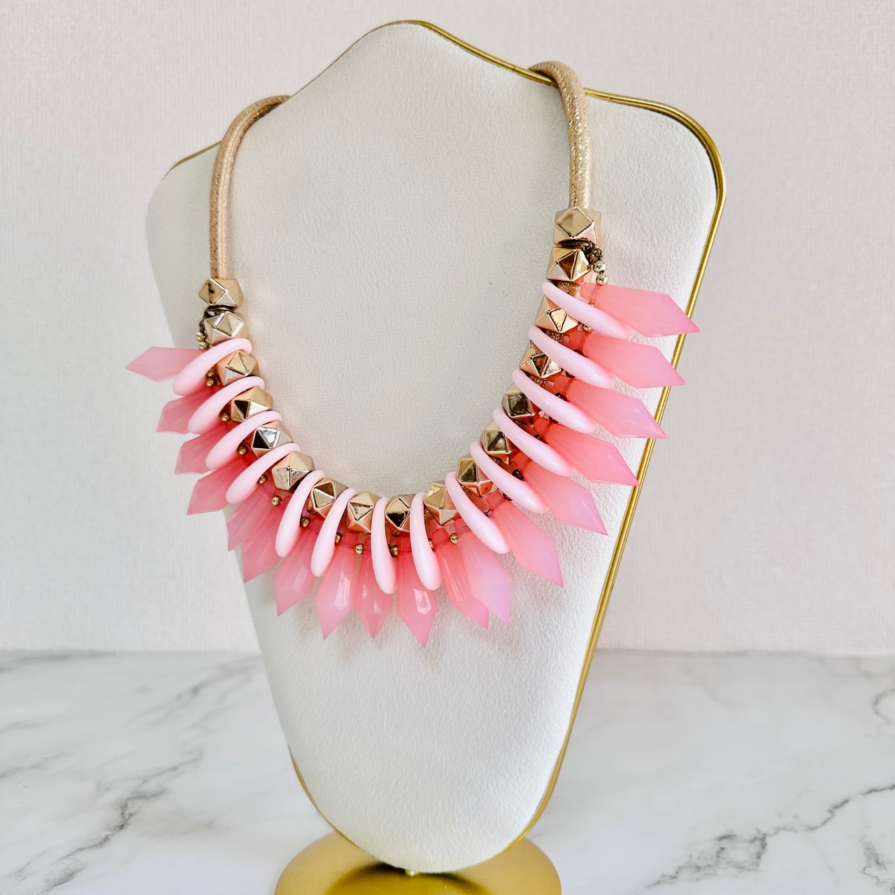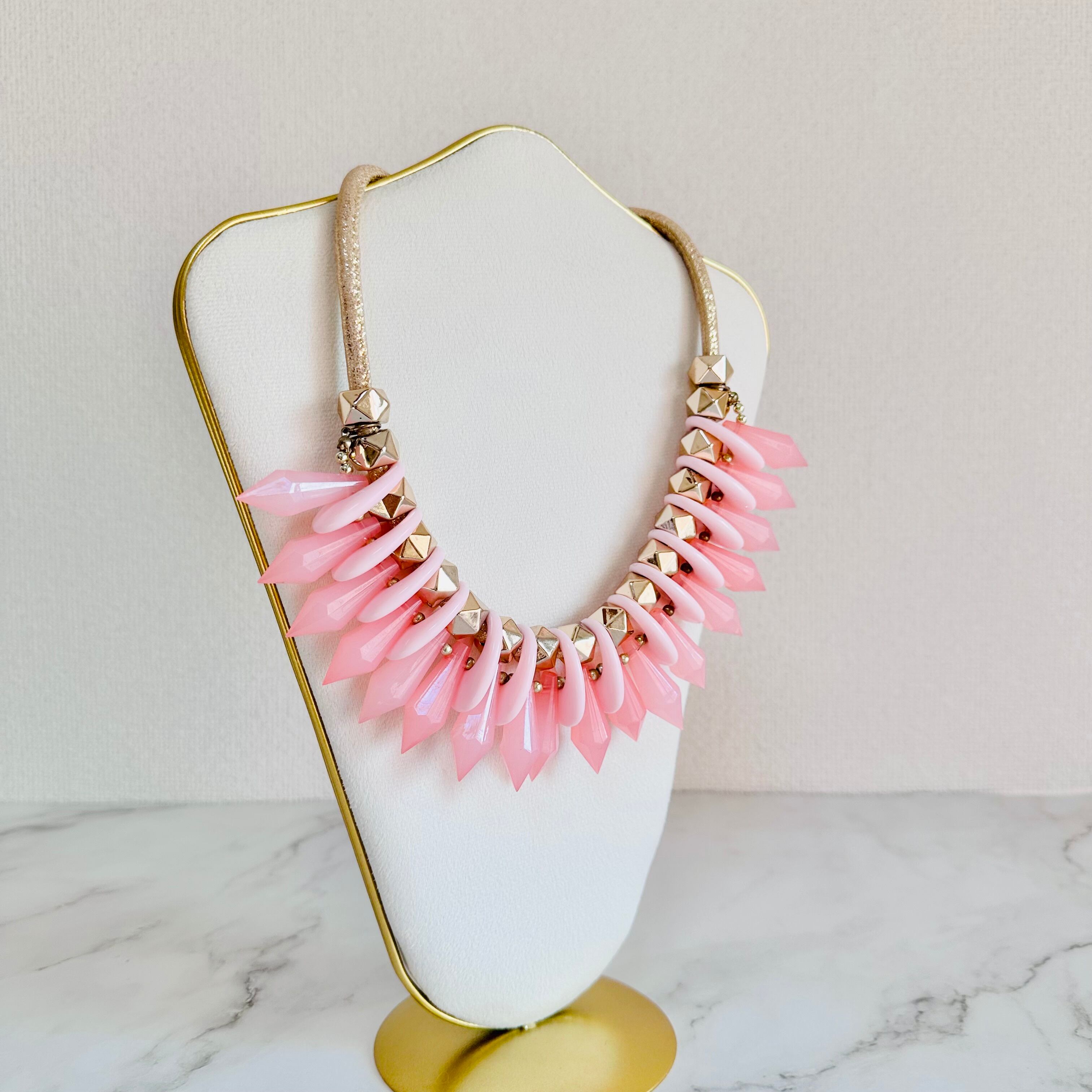 優しいピンクで統一したアクリル素材のパーツをゴールドのコードに組み合わせた目を惹くデザインです。