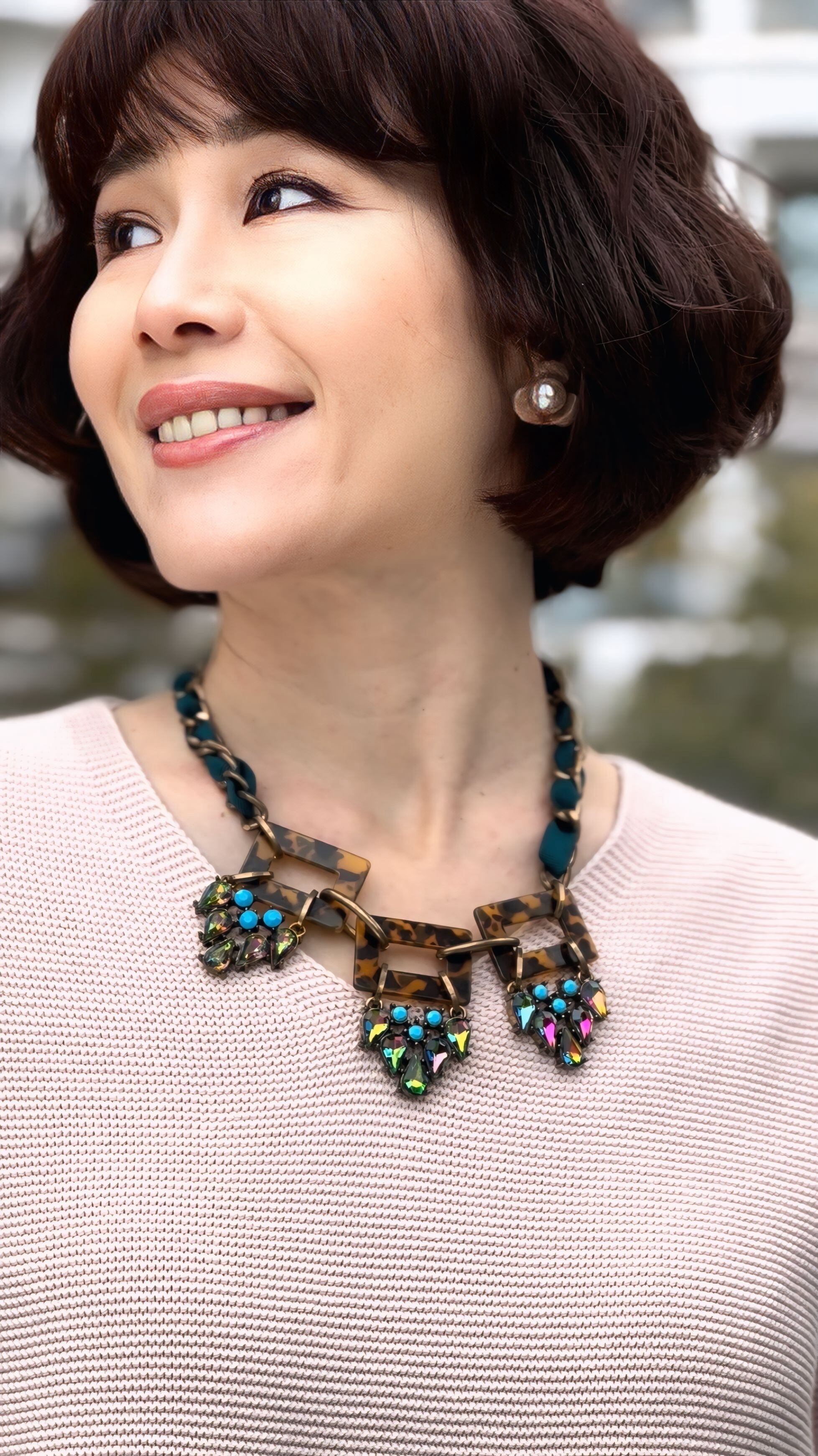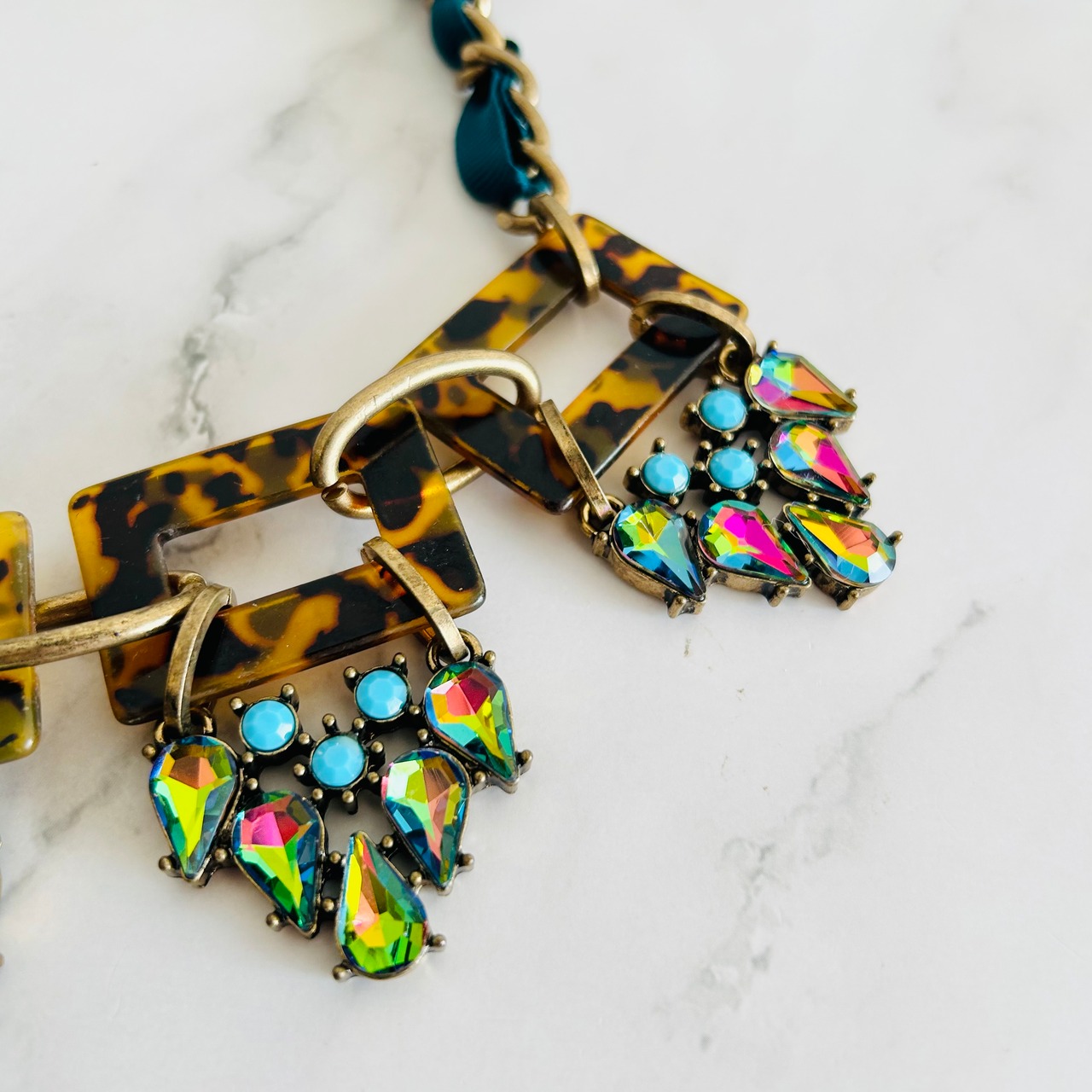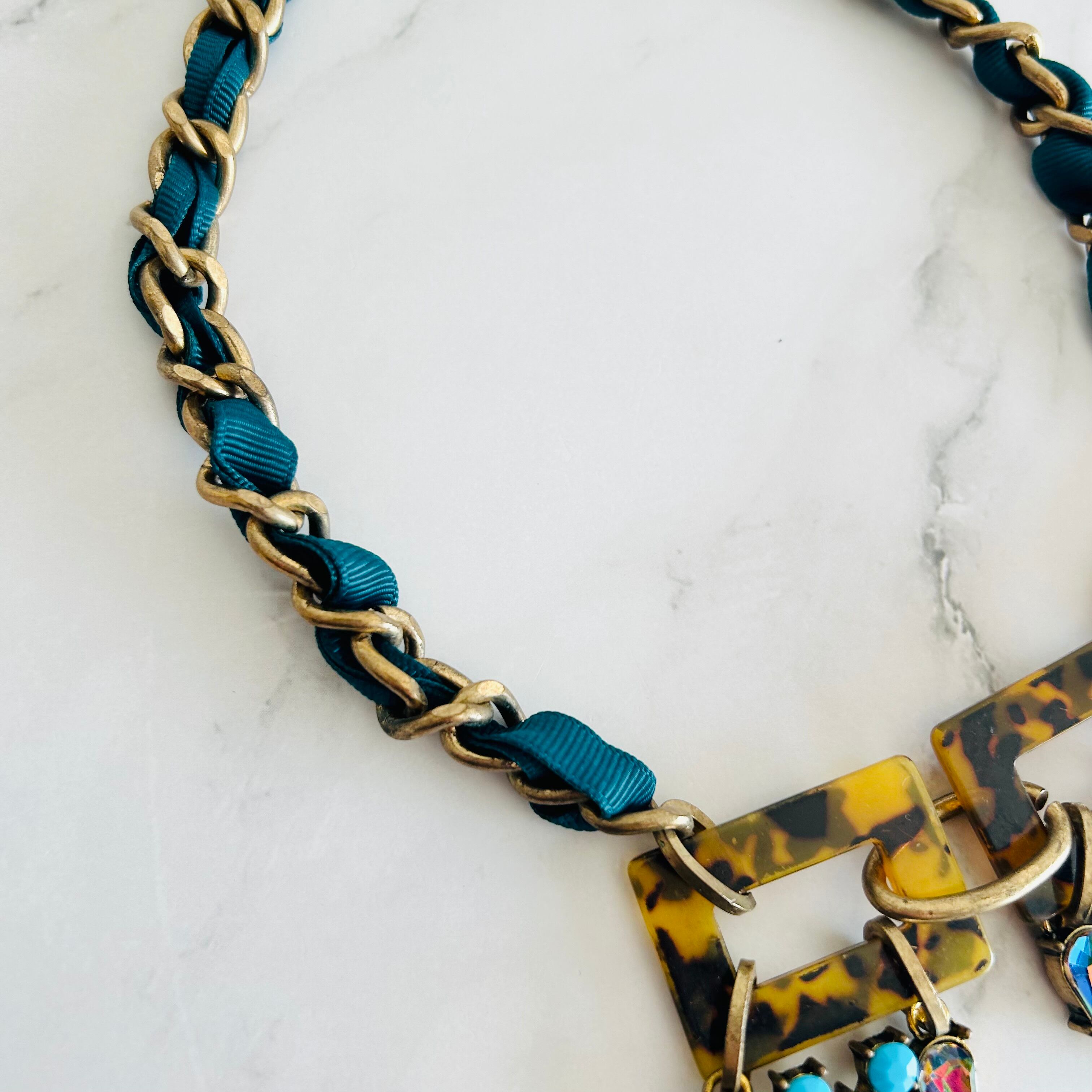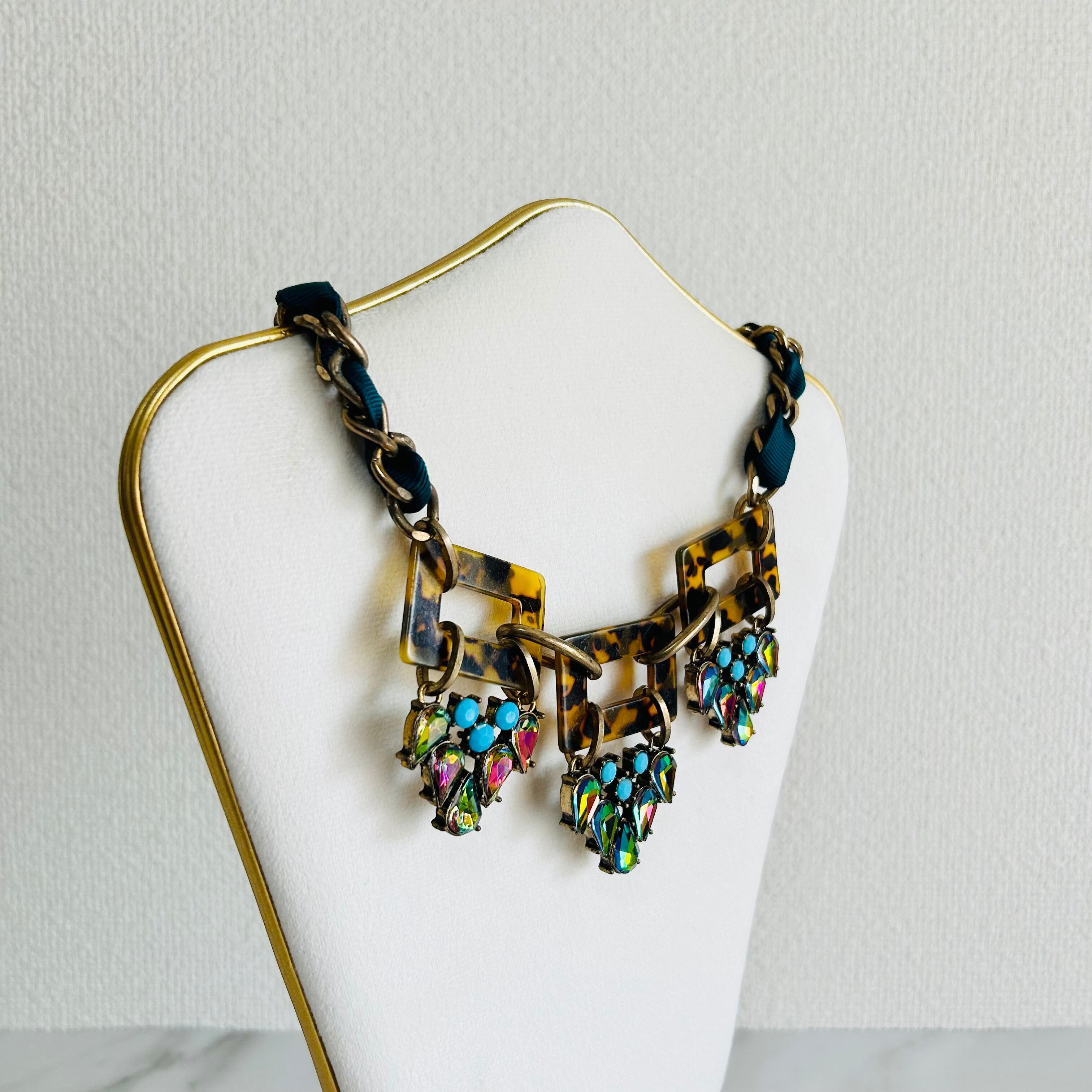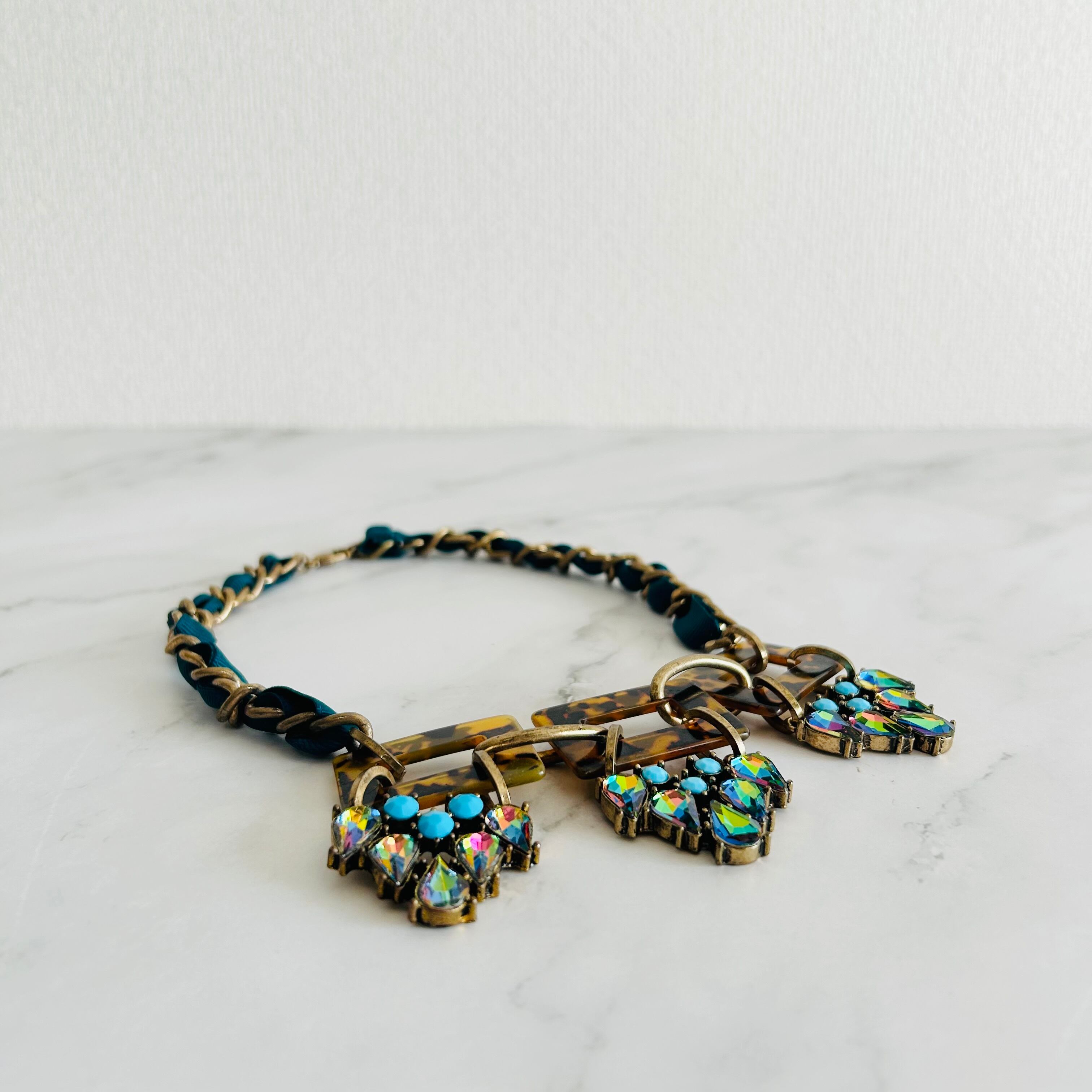 べっ甲パーツと鮮やかな虹色のクリスタルストーン、アクセントにブルーをプラスしたユニークなパーツを コードでデコレートされたチャンキーチェーンに組み合わせたゴージャス感溢れるデザインです。
