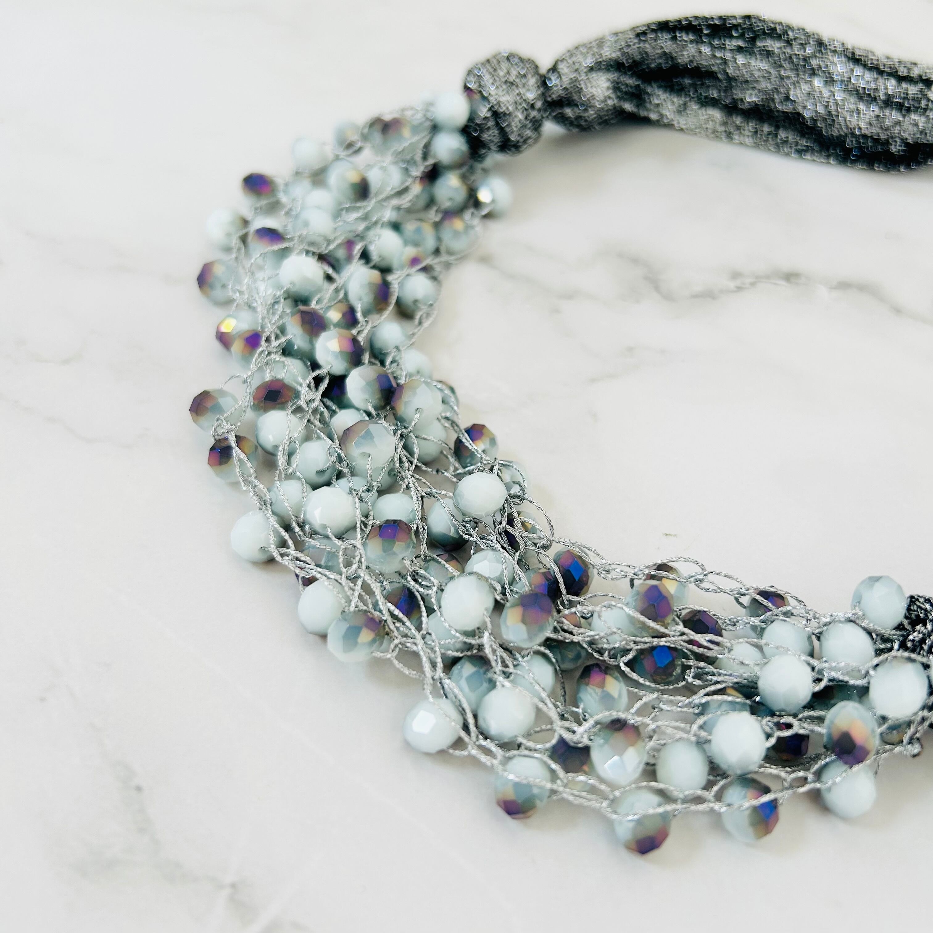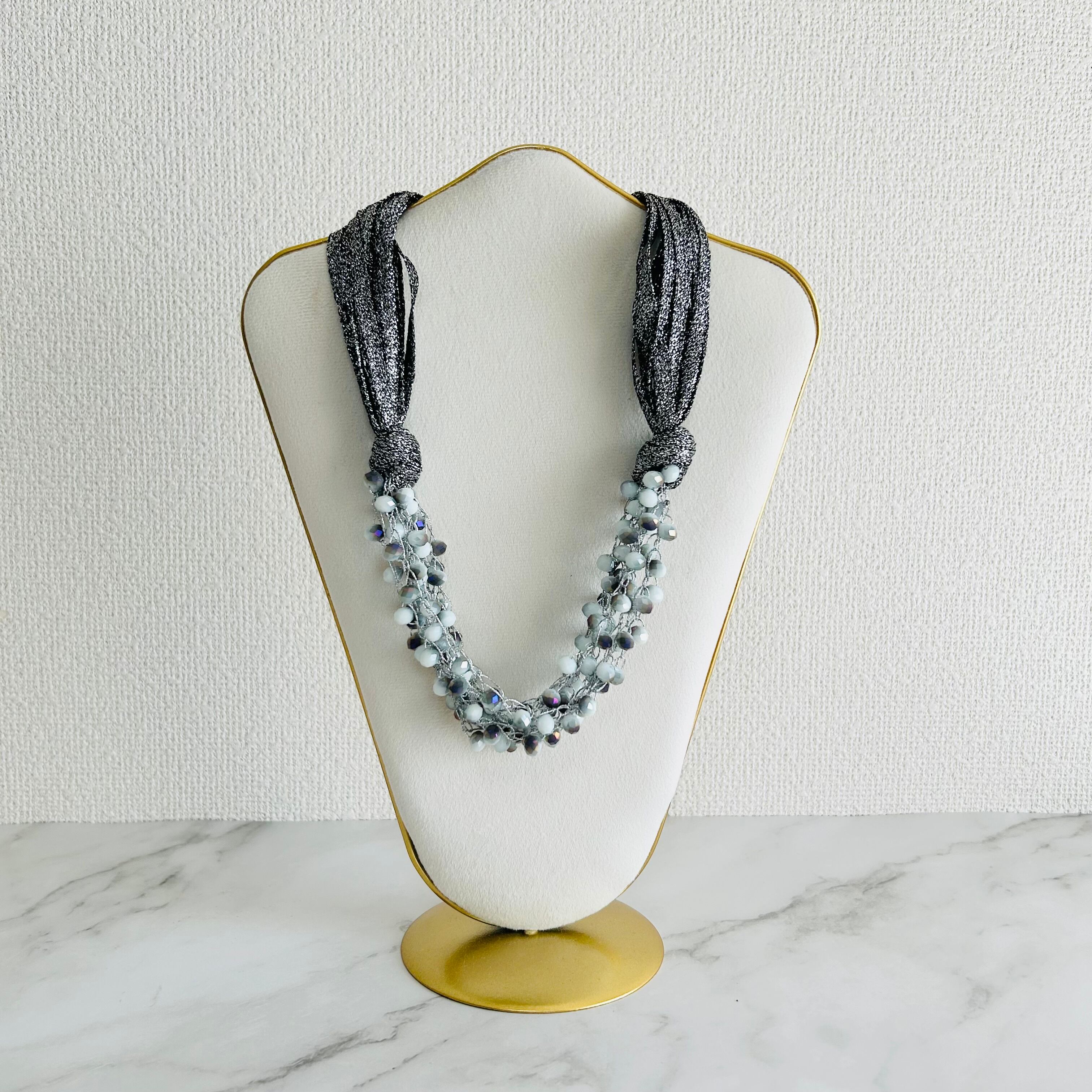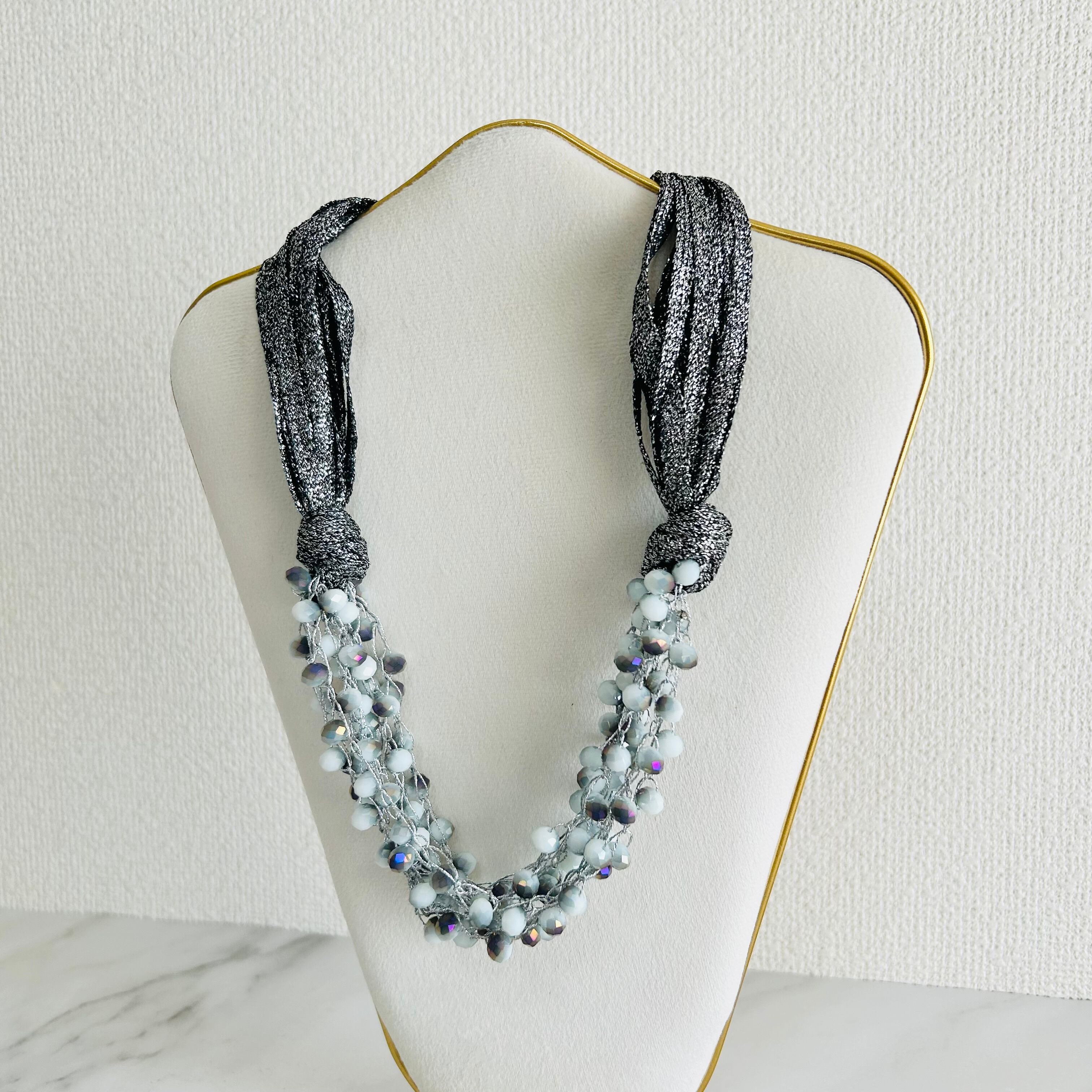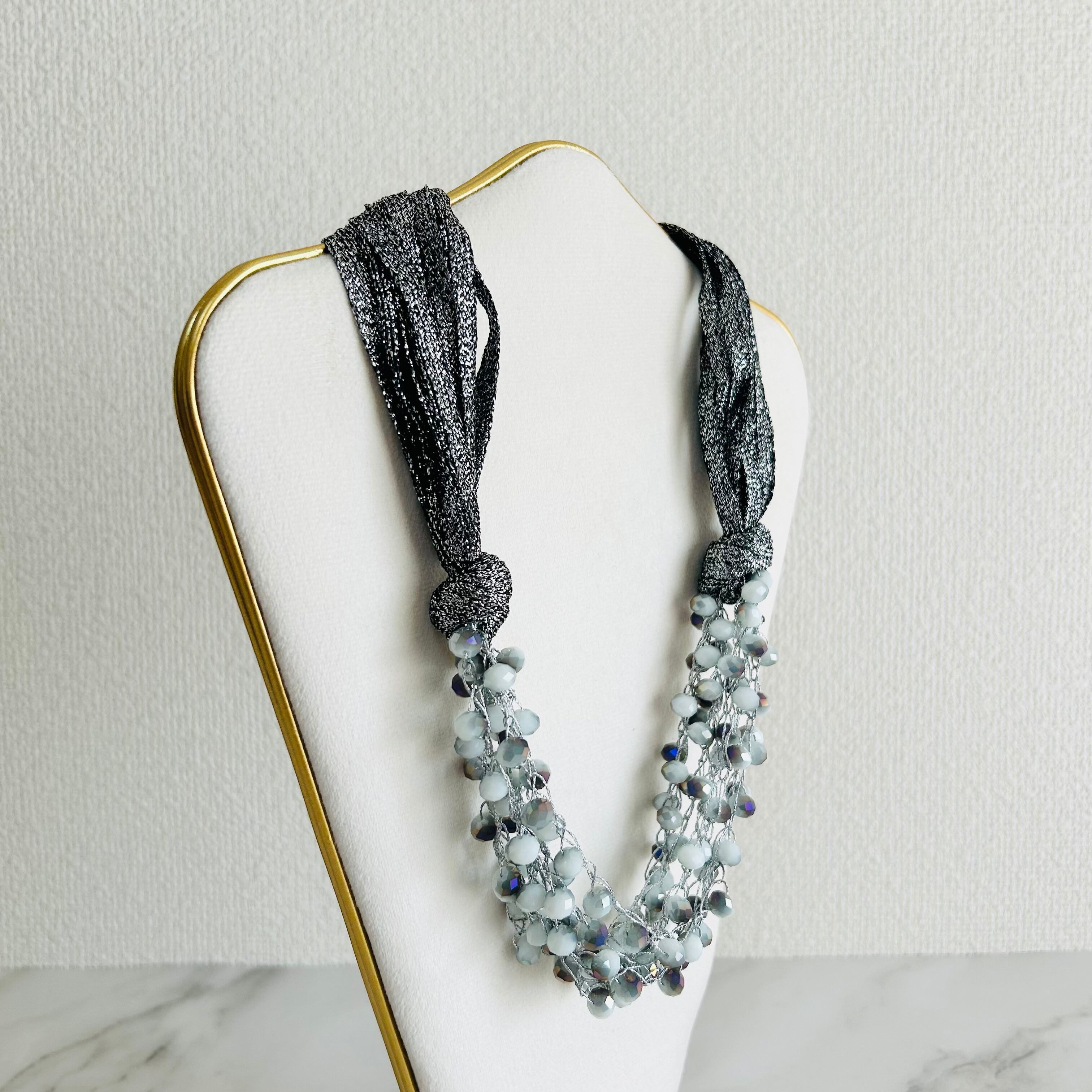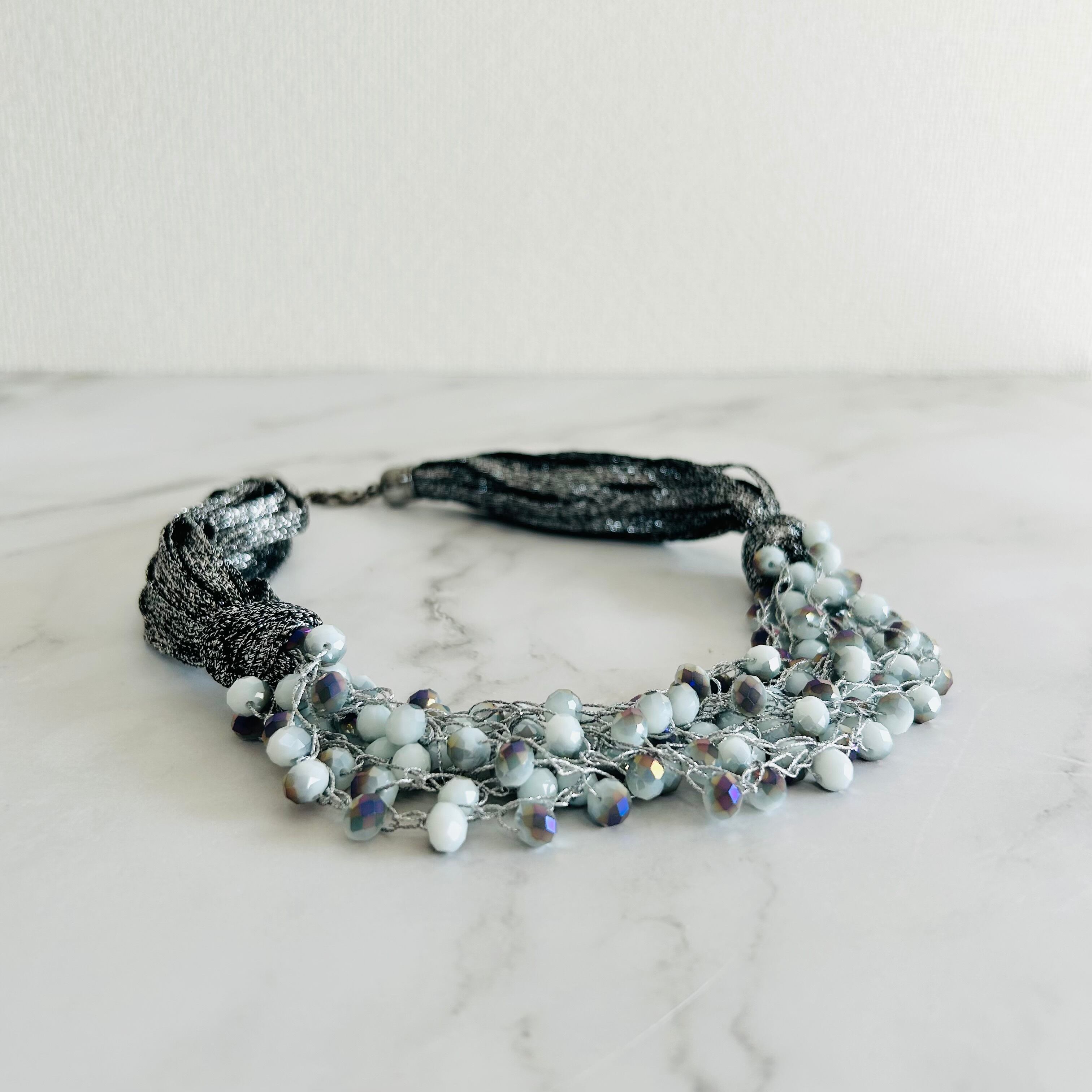 ブルーグレーのグラデーションになったクリスタルビーズをレース編みに取り付け、ラメ入りコードで束ねた手の凝ったデザインです。