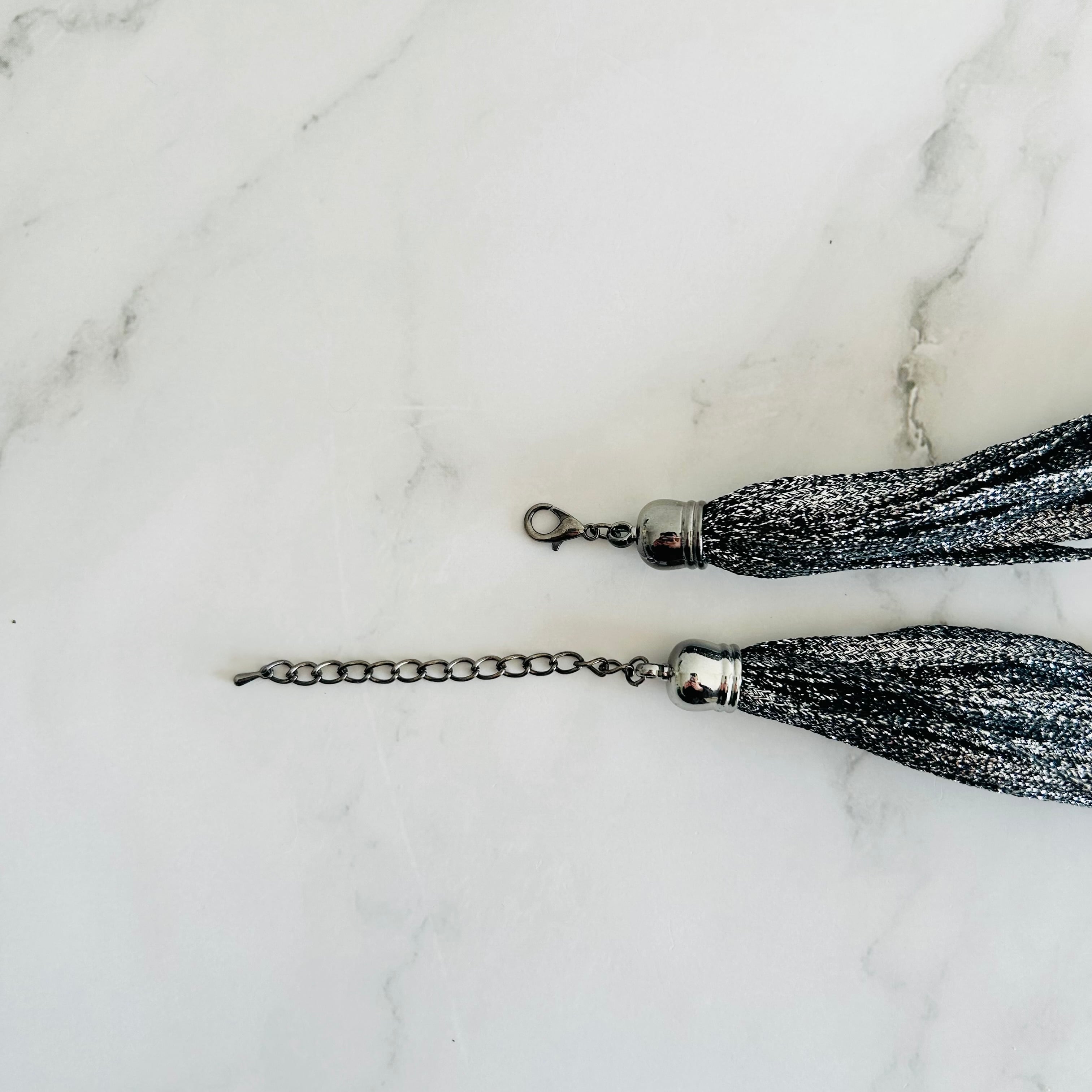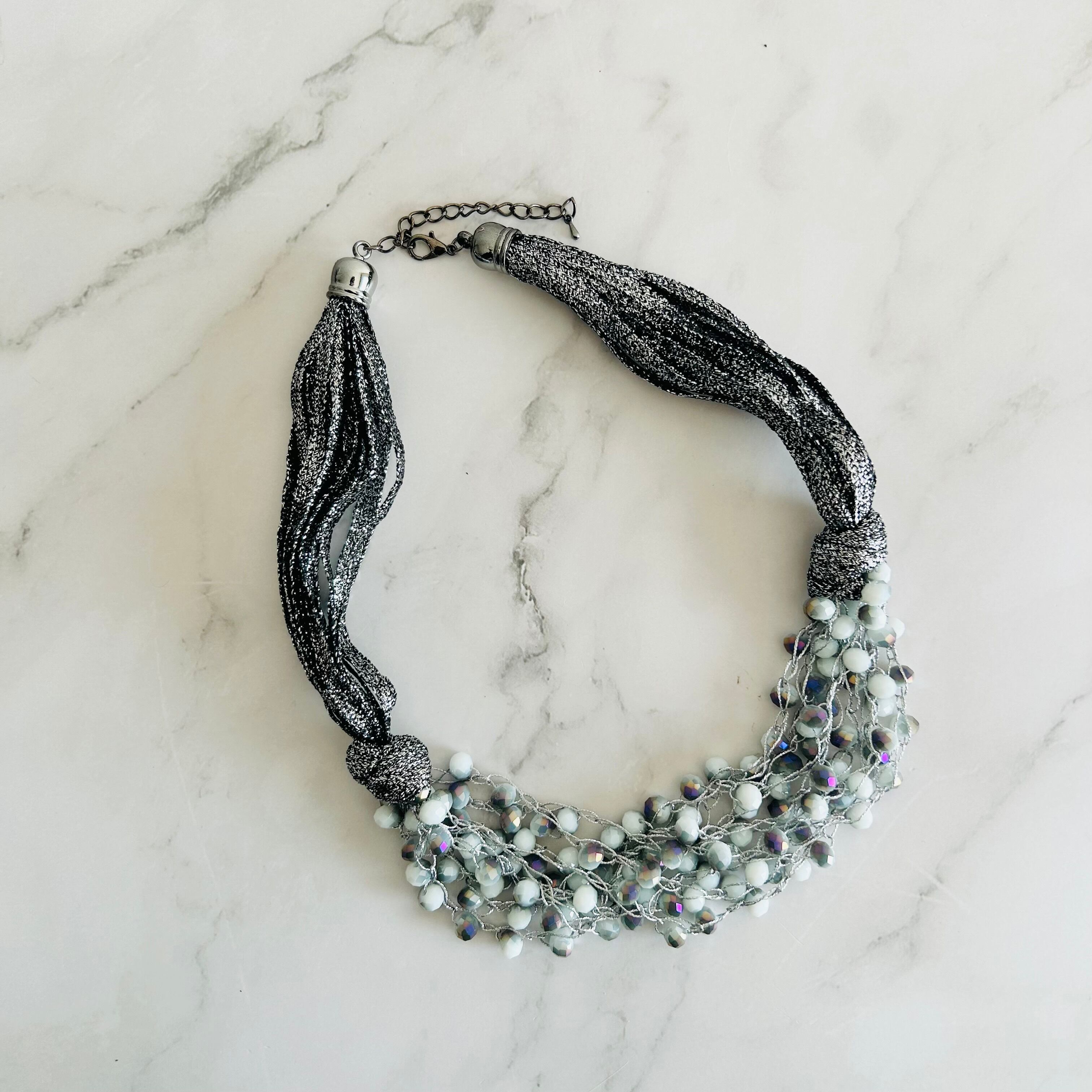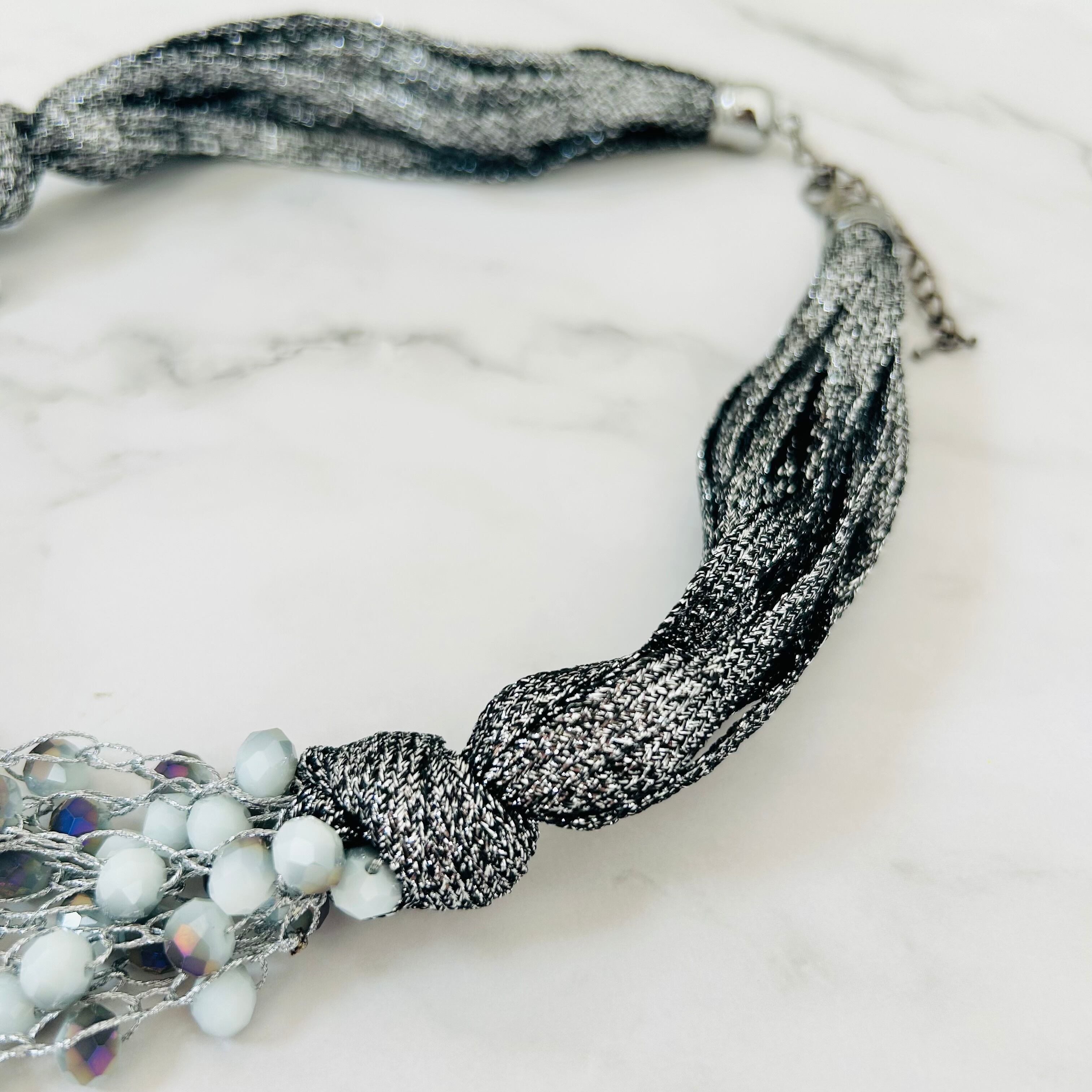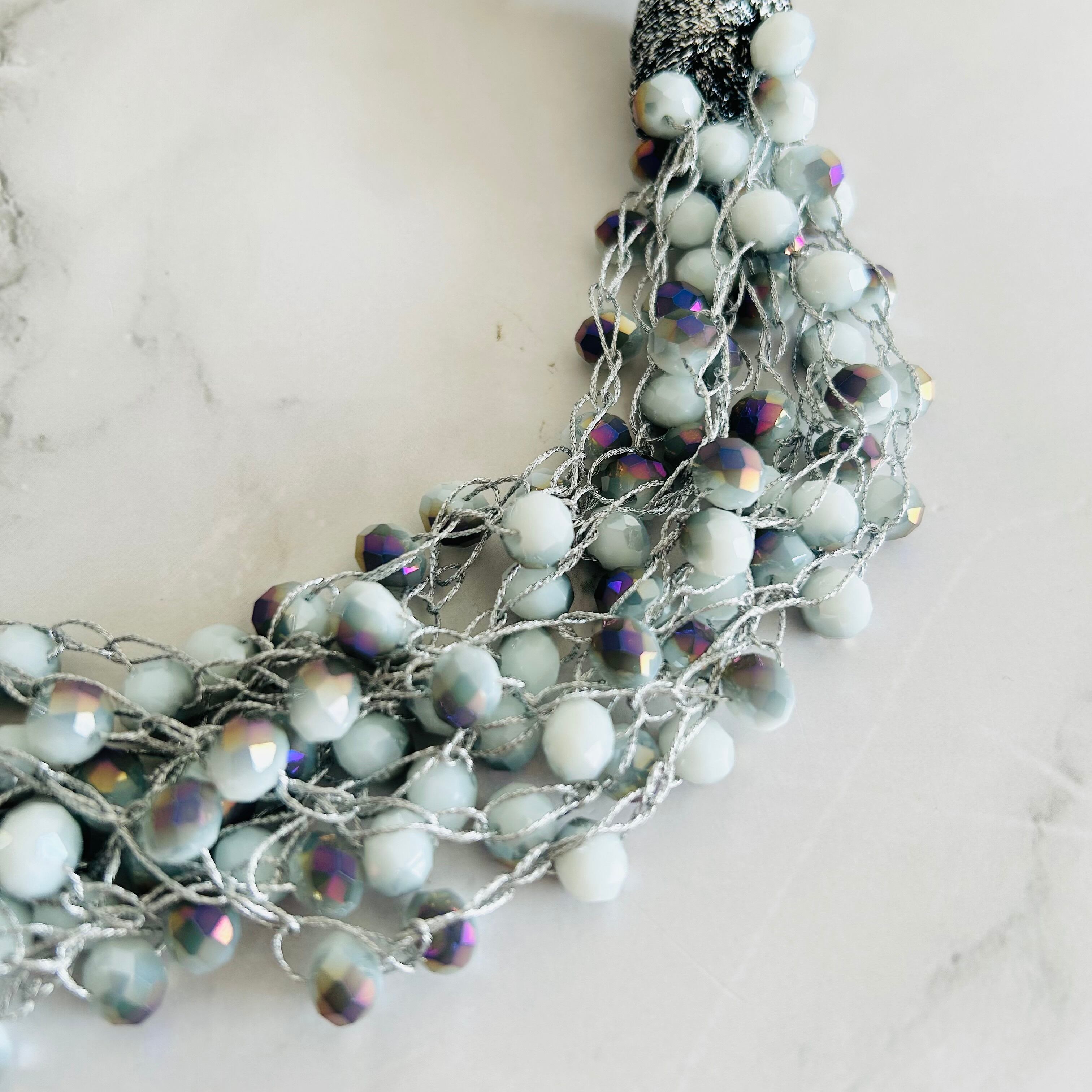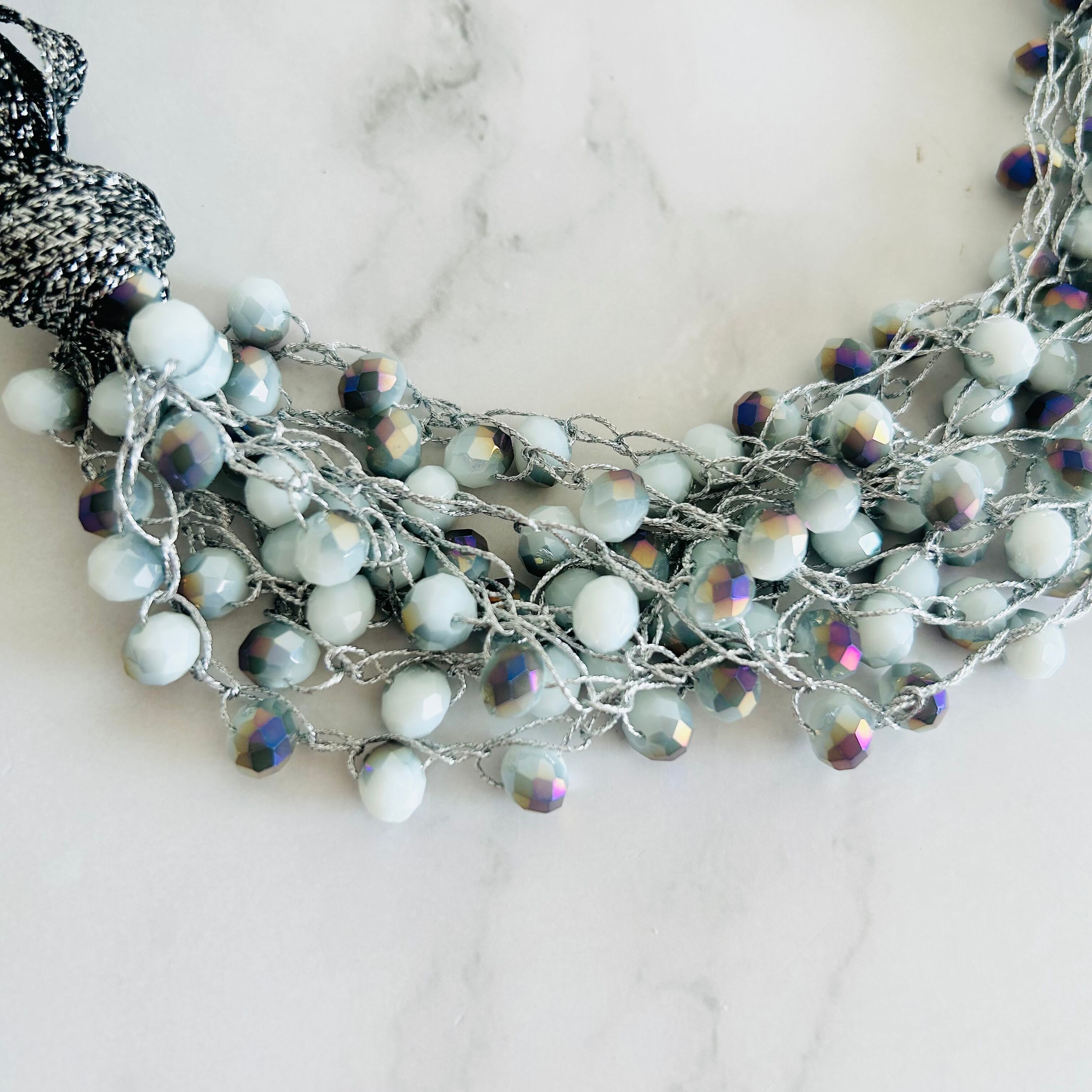 ブルーグレーのグラデーションになったクリスタルビーズをレース編みに取り付け、ラメ入りコードで束ねた手の凝ったデザインです。