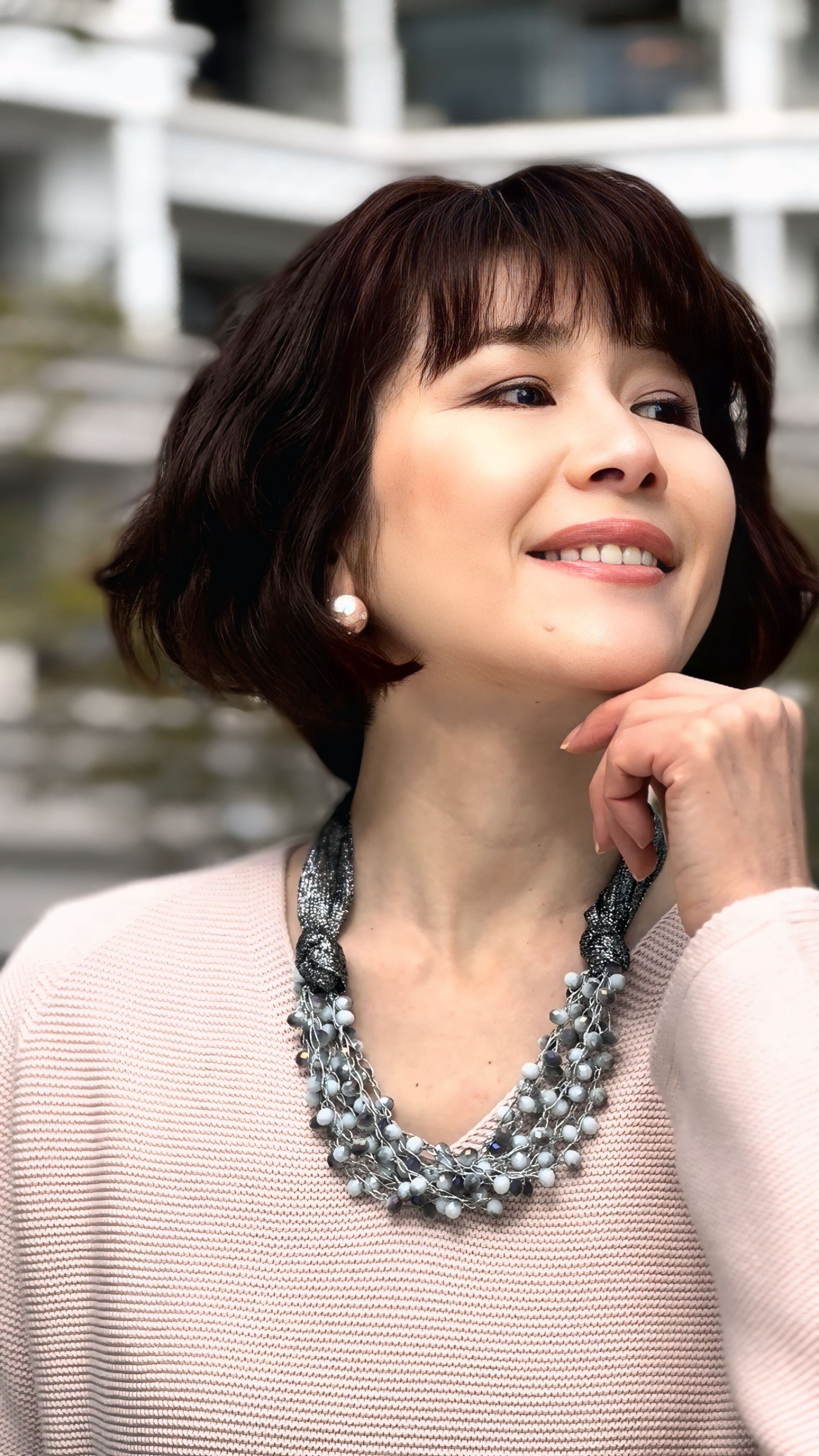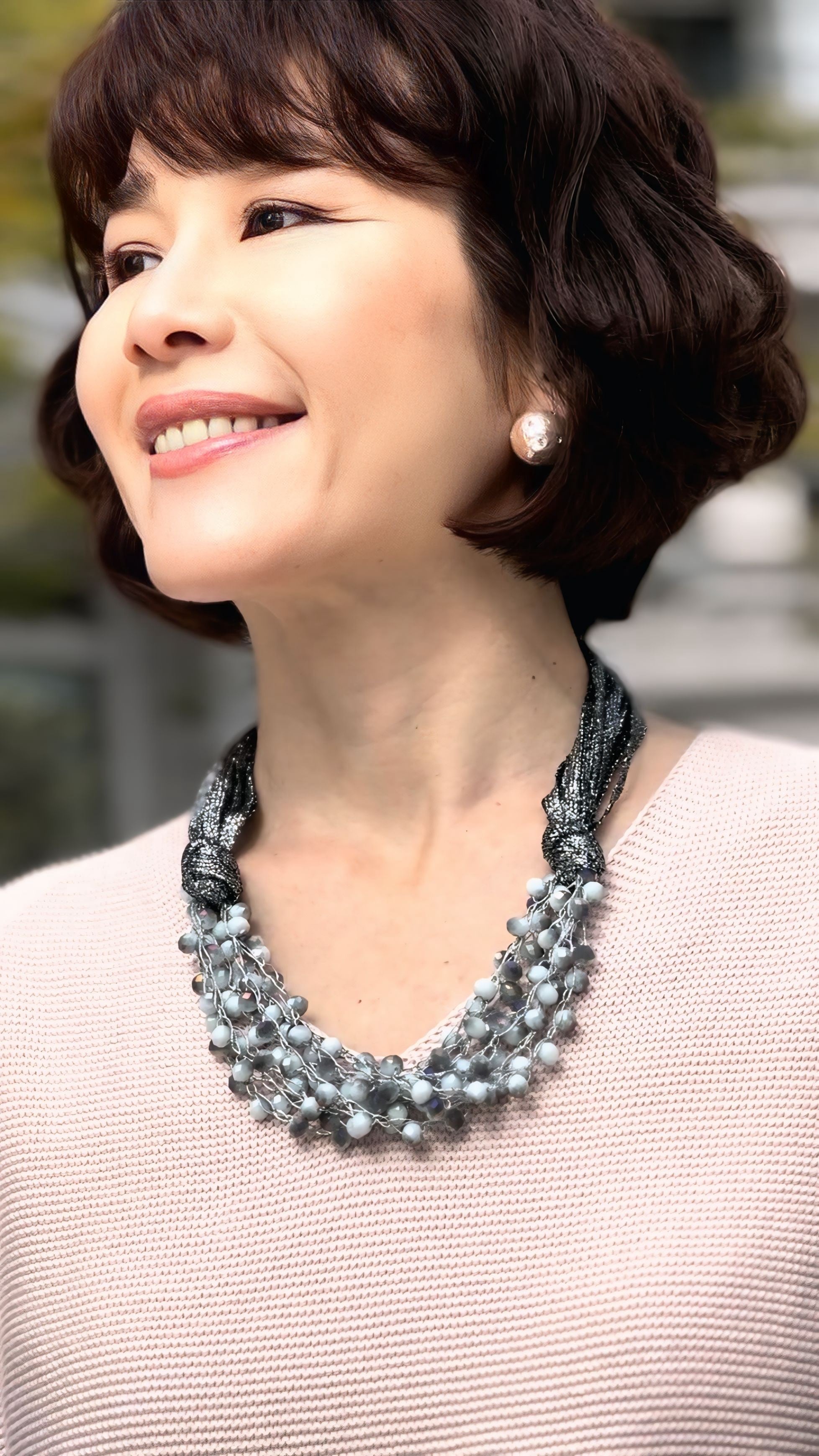 若々しい印象を与えるブラックラメのコードは、着け心地も軽く、お顔まわりを華やかに際立たせてくれます。